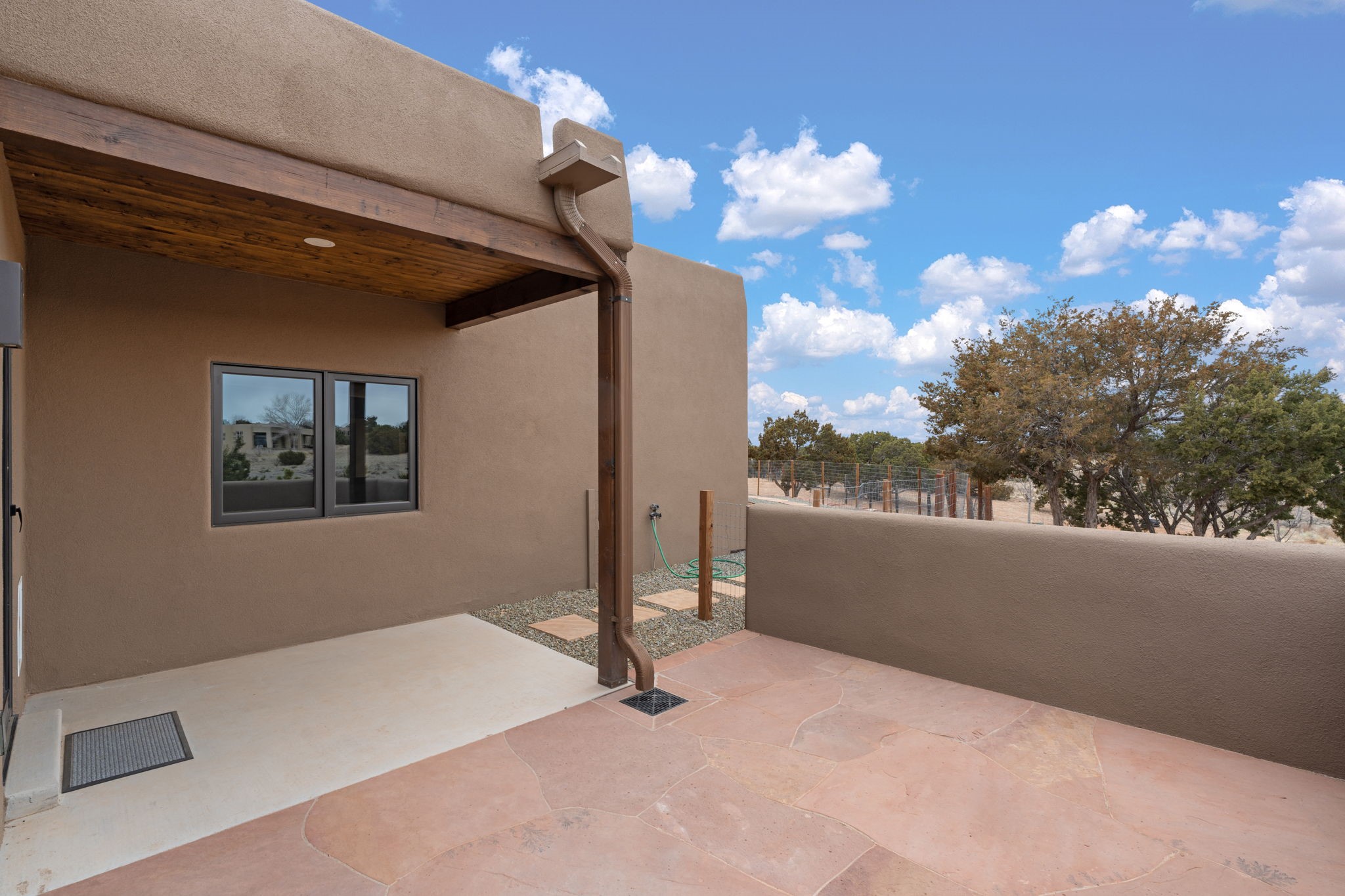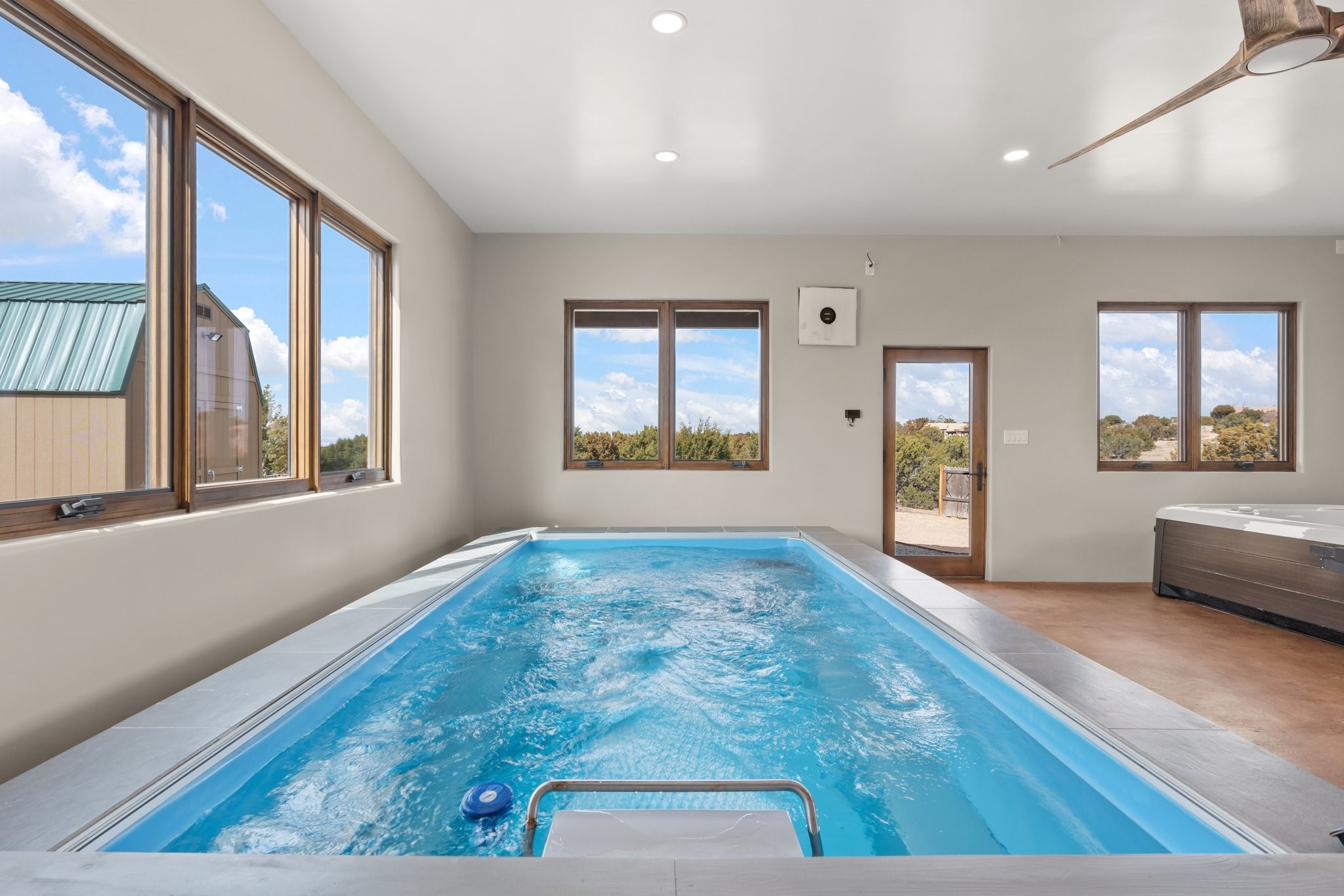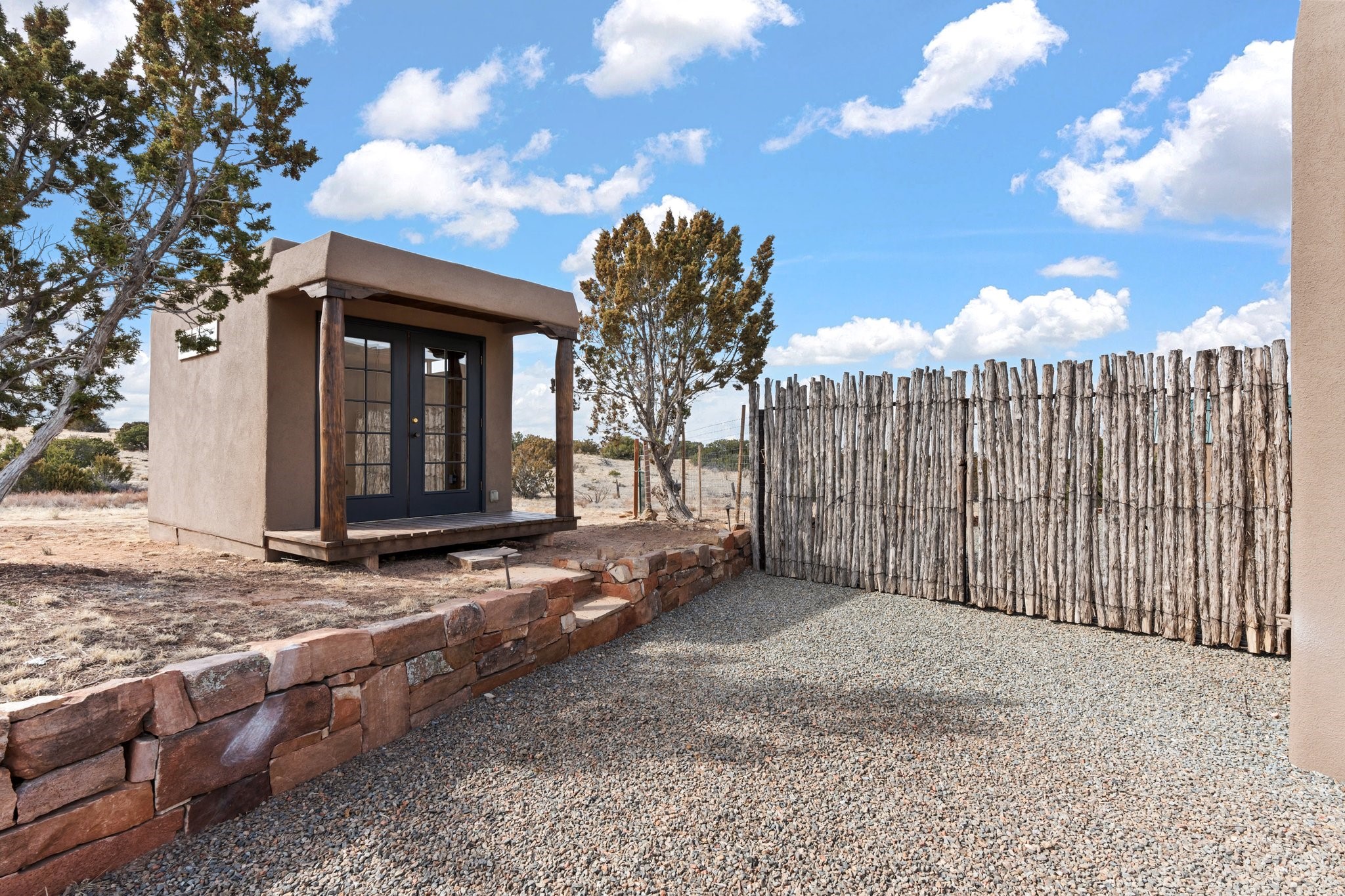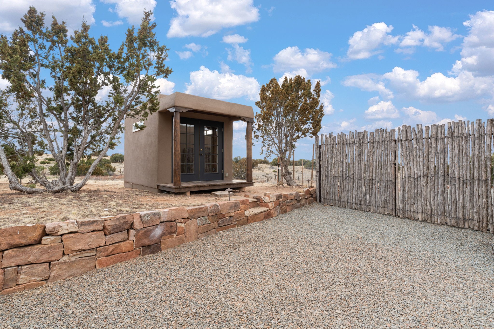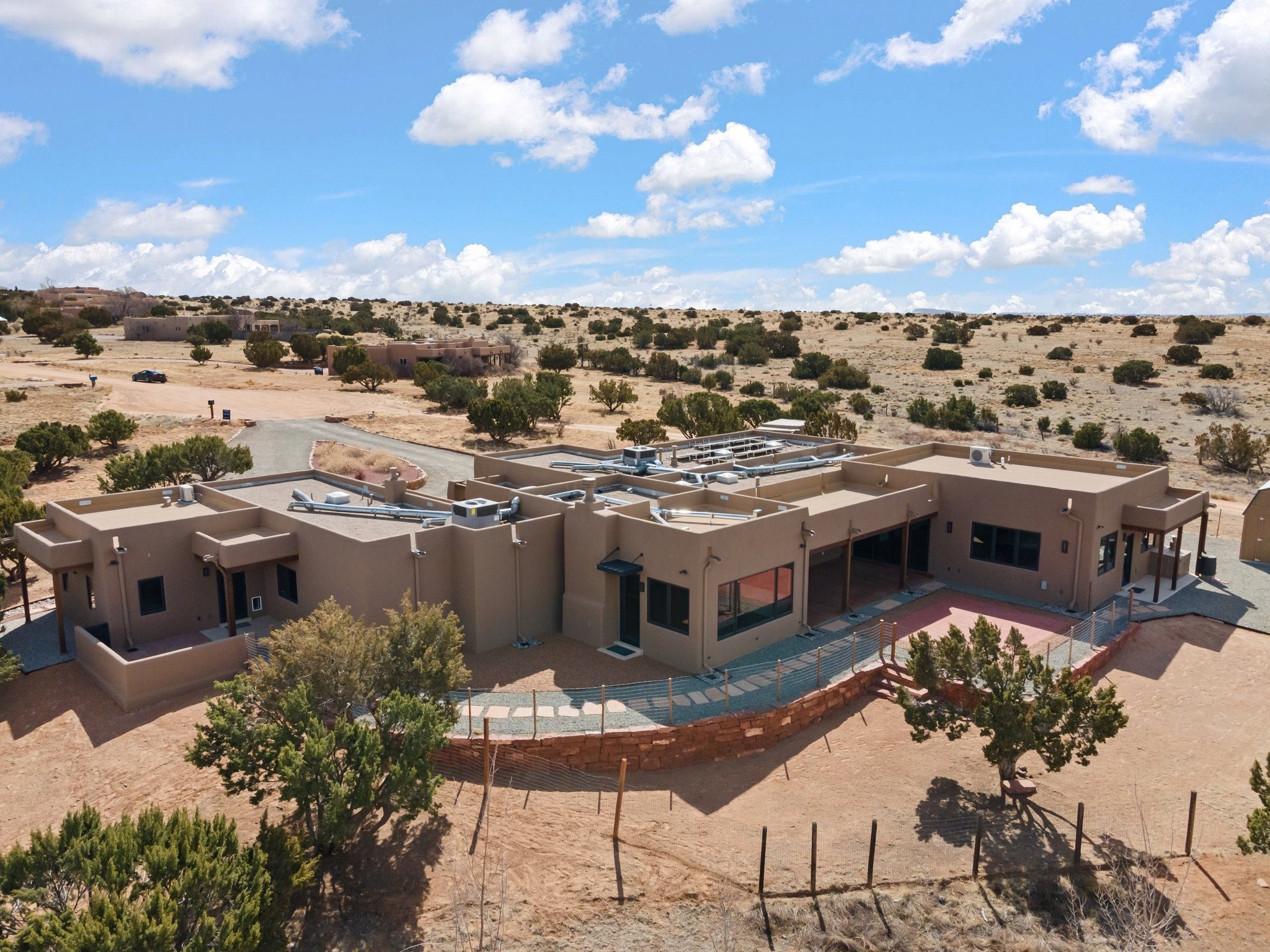 SPECTACULAR ELDORADO ESTATE! Spa living in this extraordinary property with end of the road privacy, mountain views sited on a greenbelt. An endless pool and hot tub have their own room with rain showerhead and room for exercise equipment. In-floor radiant heat with a new HVAC system for back up heating and air conditioning. Generous great room includes dining room and opens to kitchen with Dekton countertops, 2002 stainless appliances, large pantry and an island. Primary wing has library/office with viga ceilings and gas fireplace. Primary bedroom has a private portal and enormous walk-in closet. Primary bath has double sinks, soaking tub and separate shower. Separate guest wing has two bedrooms and a full bath. There is a den/media room off the spa area with a data room for the systems, CAT-6 wifi. Walled front courtyard with covered areas for seating. Fully fenced back yard with large covered portal. California closet systems throughout including kitchen pantry. Solar panels are owned and provide some back up power in the event of an outage.. Large 2.4 acre lot bordering open space with approved RV parking with two areas for hook ups. Proper laundry room with storage and new LG washer/dryer. Approximately 9,000 square feet of fencing. Two sheds, both with electricity. Whole house water filtration. New windows and doors throughout. Three-car finished garage. LIST OF UPGRAGES IN SUPPLEMENTS.