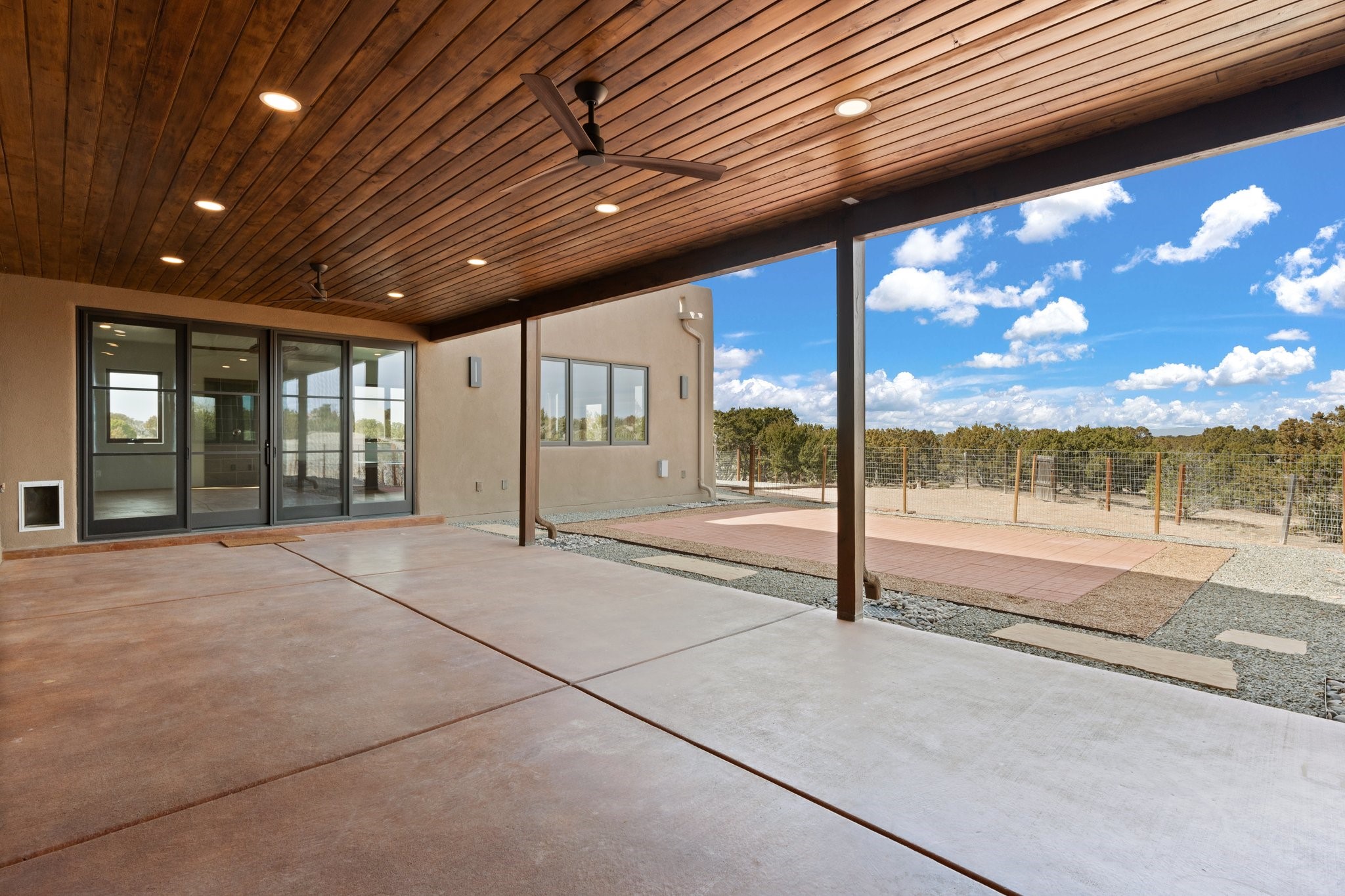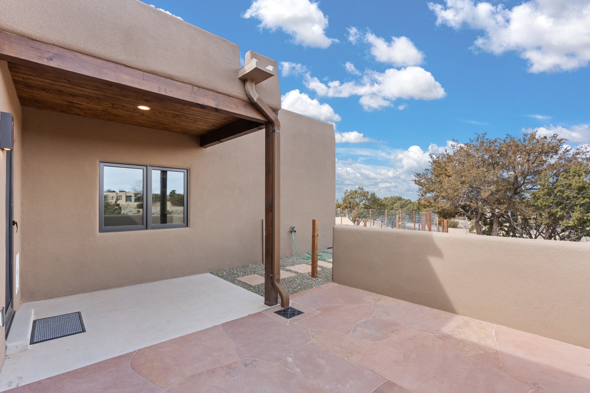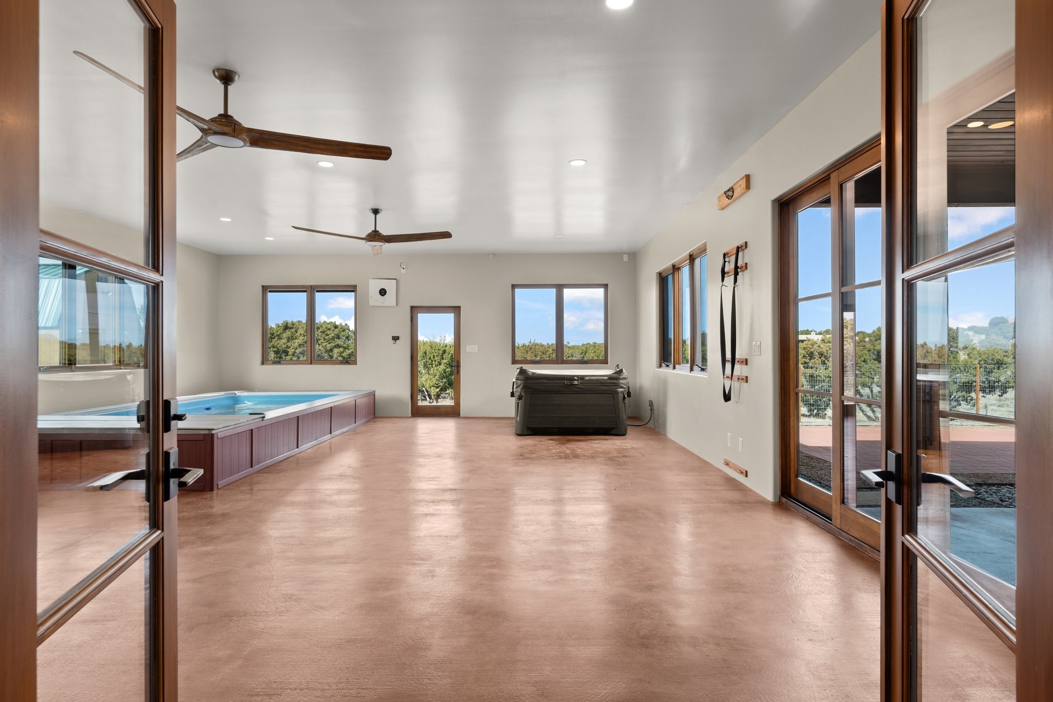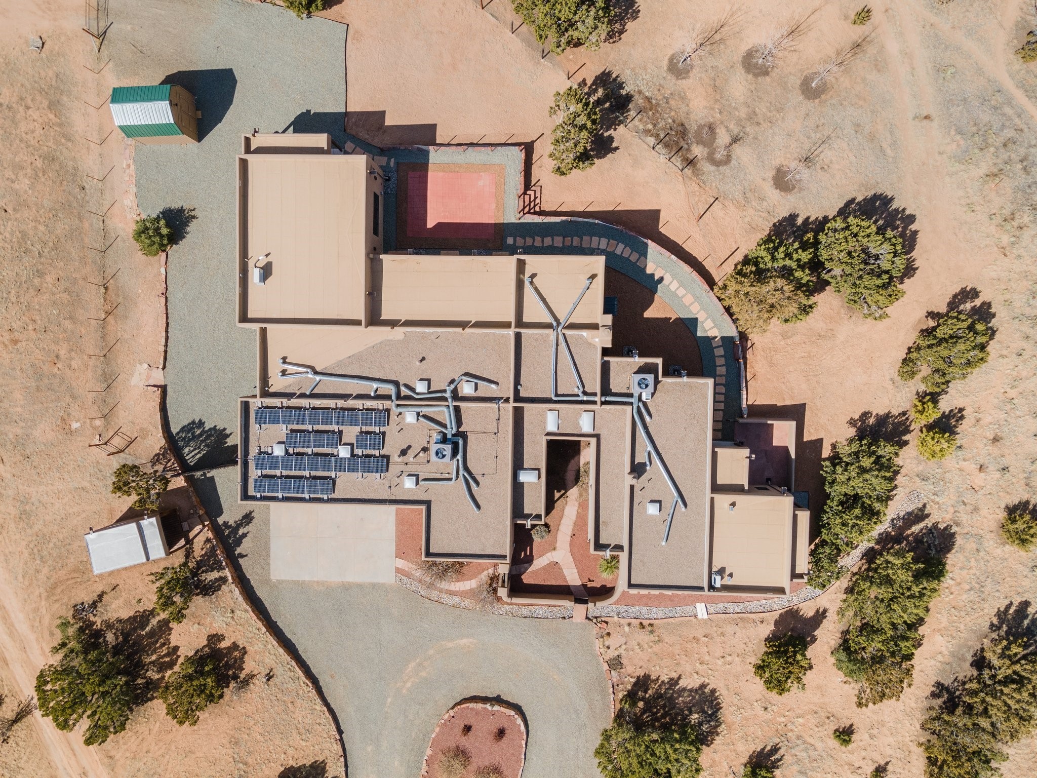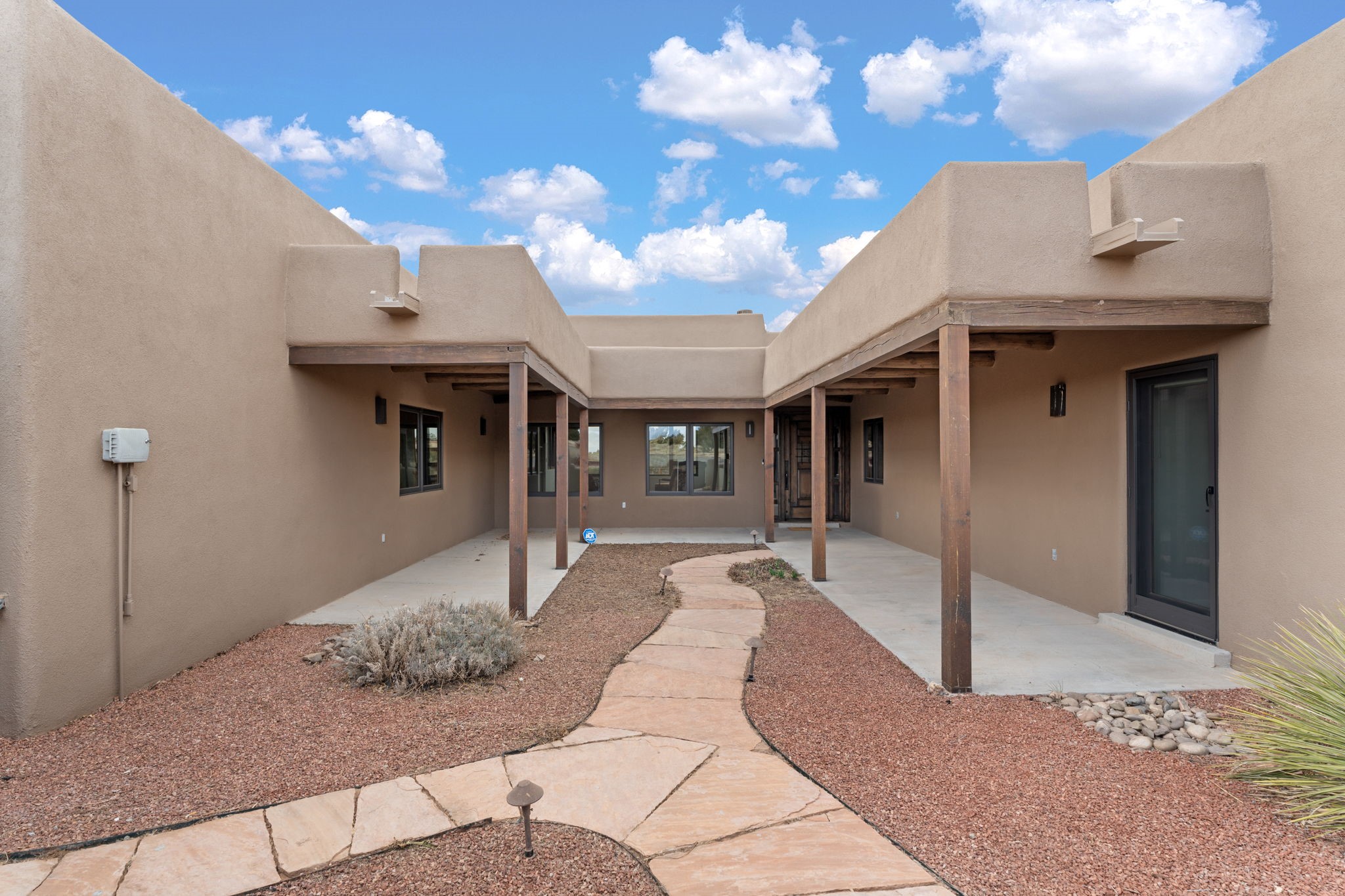 SPECTACULAR ELDORADO ESTATE! Spa living in this extraordinary property with end of the road privacy, mountain views sited on a greenbelt. An endless pool and hot tub have their own room with rain showerhead and room for exercise equipment. In-floor radiant heat with a new HVAC system for back up heating and air conditioning. Generous great room includes dining room and opens to kitchen with Dekton countertops, 2002 stainless appliances, large pantry and an island. Primary wing has library/office with viga ceilings and gas fireplace. Primary bedroom has a private portal and enormous walk-in closet. Primary bath has double sinks, soaking tub and separate shower. Separate guest wing has two bedrooms and a full bath. There is a den/media room off the spa area with a data room for the systems, CAT-6 wifi. Walled front courtyard with covered areas for seating. Fully fenced back yard with large covered portal. California closet systems throughout including kitchen pantry. Solar panels are owned and provide some back up power in the event of an outage.. Large 2.4 acre lot bordering open space with approved RV parking with two areas for hook ups. Proper laundry room with storage and new LG washer/dryer. Approximately 9,000 square feet of fencing. Two sheds, both with electricity. Whole house water filtration. New windows and doors throughout. Three-car finished garage. LIST OF UPGRAGES IN SUPPLEMENTS.