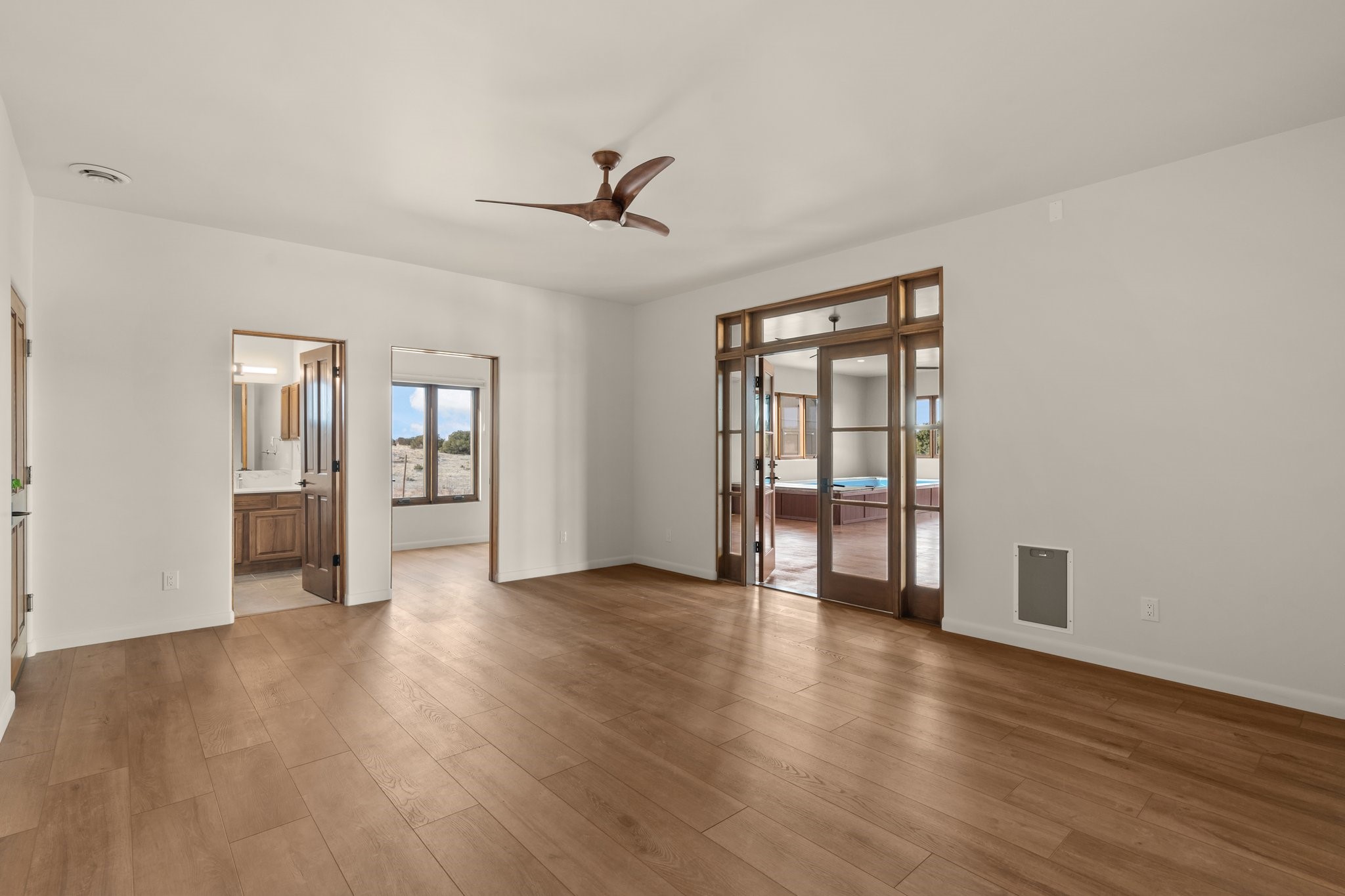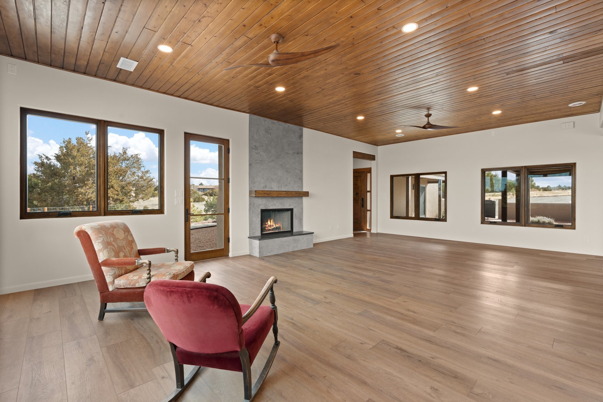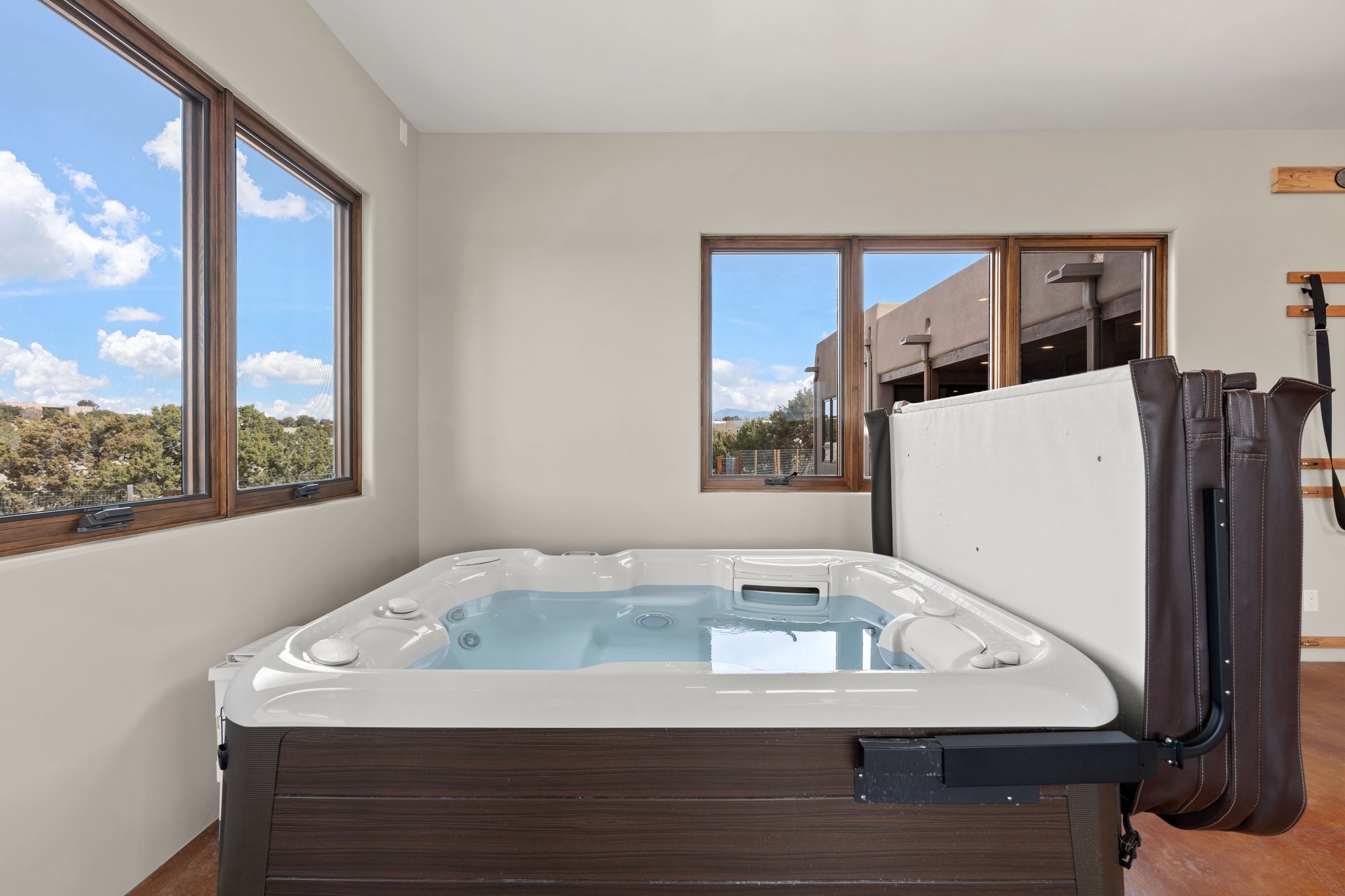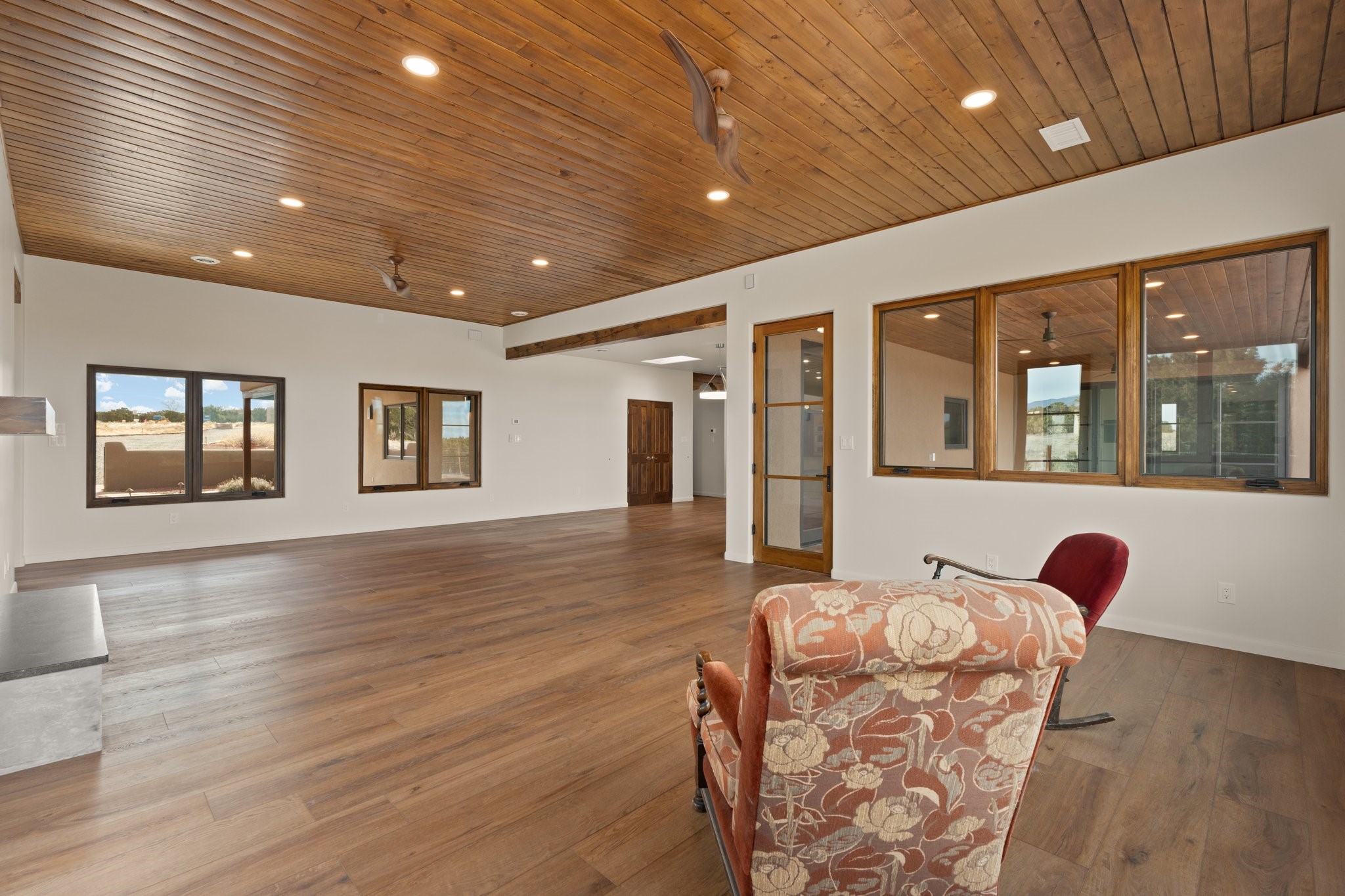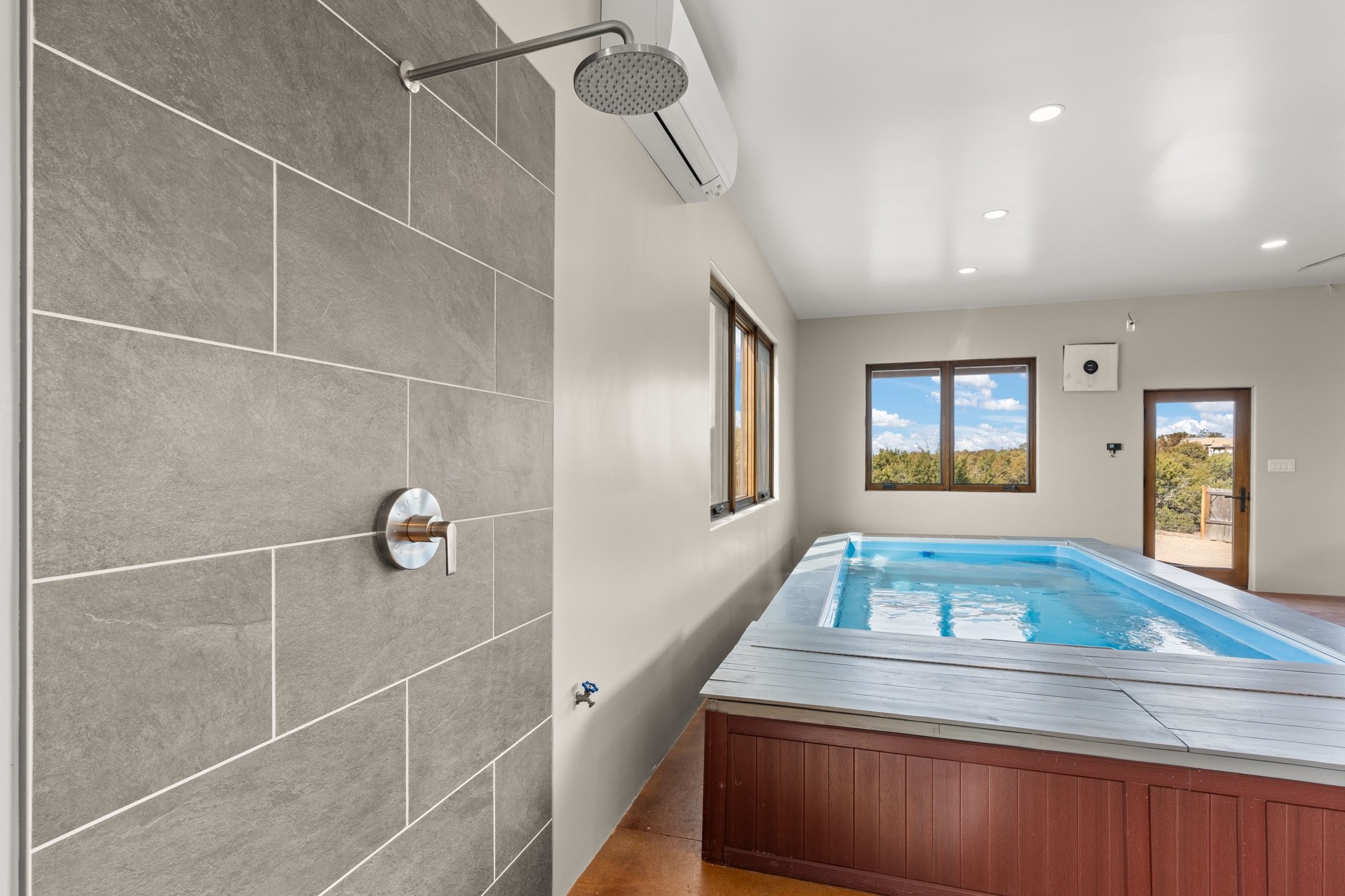 SPECTACULAR ELDORADO ESTATE! Spa living in this extraordinary property with end of the road privacy, mountain views sited on a greenbelt. An endless pool and hot tub have their own room with rain showerhead and room for exercise equipment. In-floor radiant heat with a new HVAC system for back up heating and air conditioning. Generous great room includes dining room and opens to kitchen with Dekton countertops, 2002 stainless appliances, large pantry and an island. Primary wing has library/office with viga ceilings and gas fireplace. Primary bedroom has a private portal and enormous walk-in closet. Primary bath has double sinks, soaking tub and separate shower. Separate guest wing has two bedrooms and a full bath. There is a den/media room off the spa area with a data room for the systems, CAT-6 wifi. Walled front courtyard with covered areas for seating. Fully fenced back yard with large covered portal. California closet systems throughout including kitchen pantry. Solar panels are owned and provide some back up power in the event of an outage.. Large 2.4 acre lot bordering open space with approved RV parking with two areas for hook ups. Proper laundry room with storage and new LG washer/dryer. Approximately 9,000 square feet of fencing. Two sheds, both with electricity. Whole house water filtration. New windows and doors throughout. Three-car finished garage. LIST OF UPGRAGES IN SUPPLEMENTS.