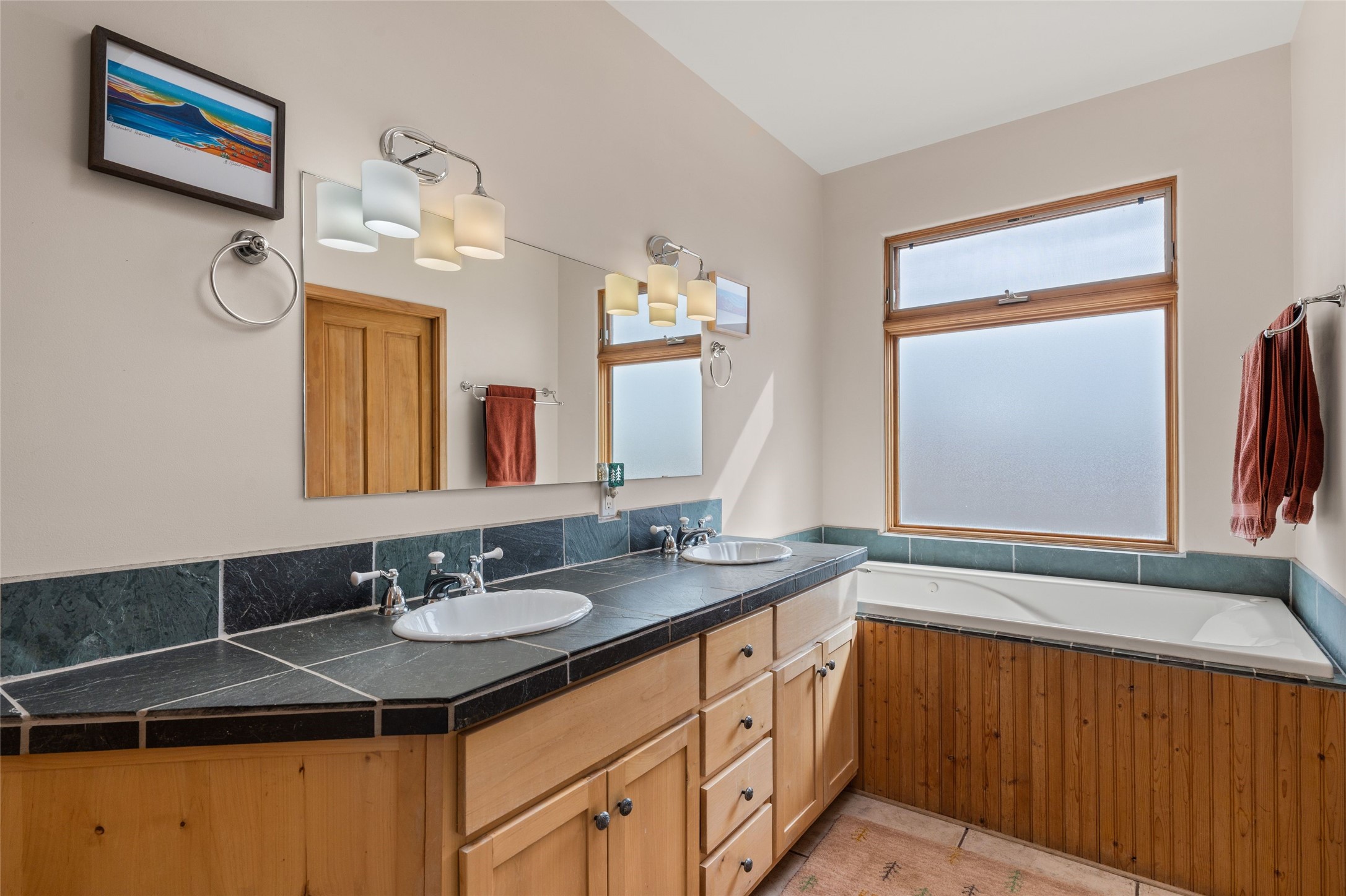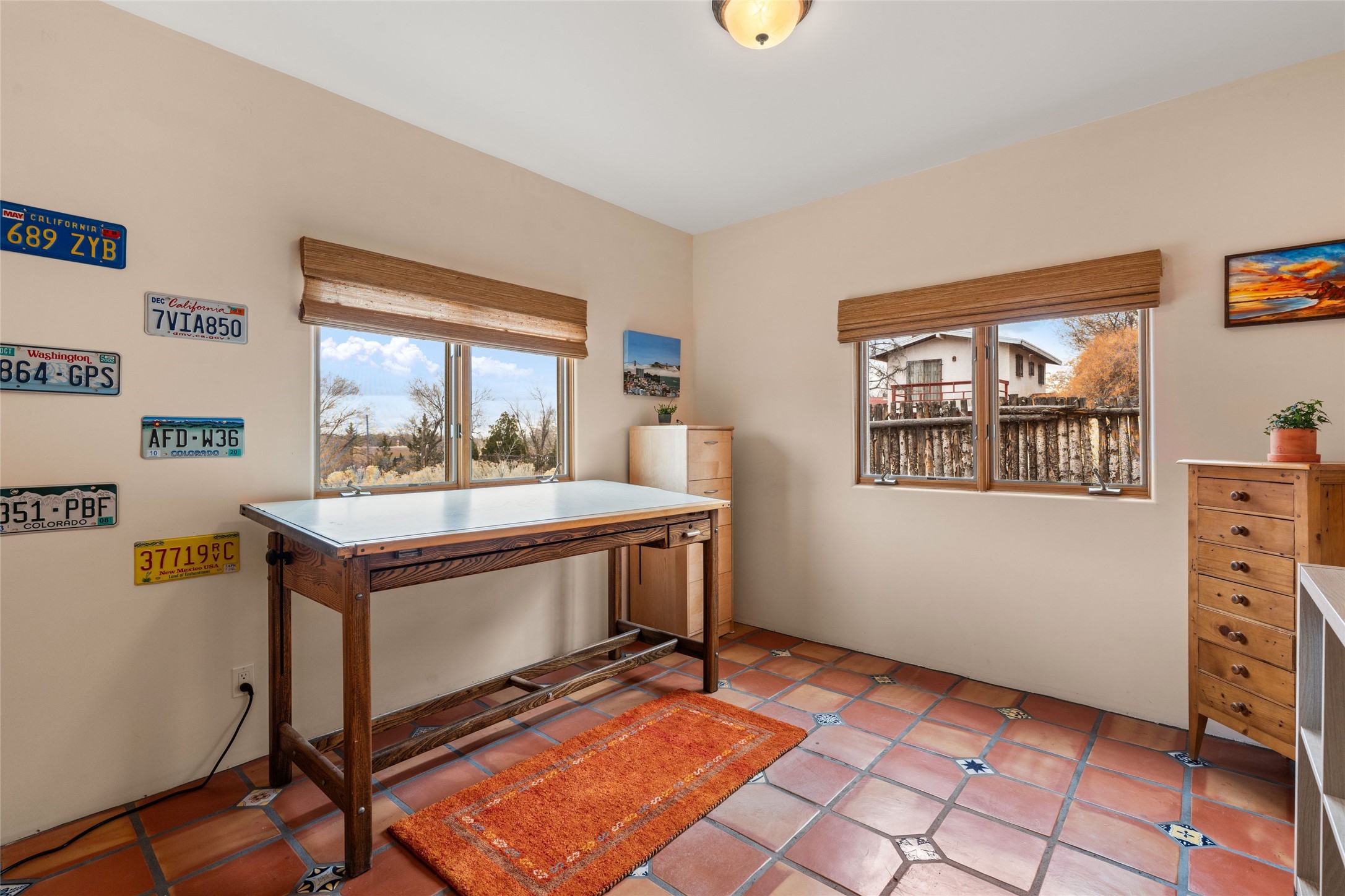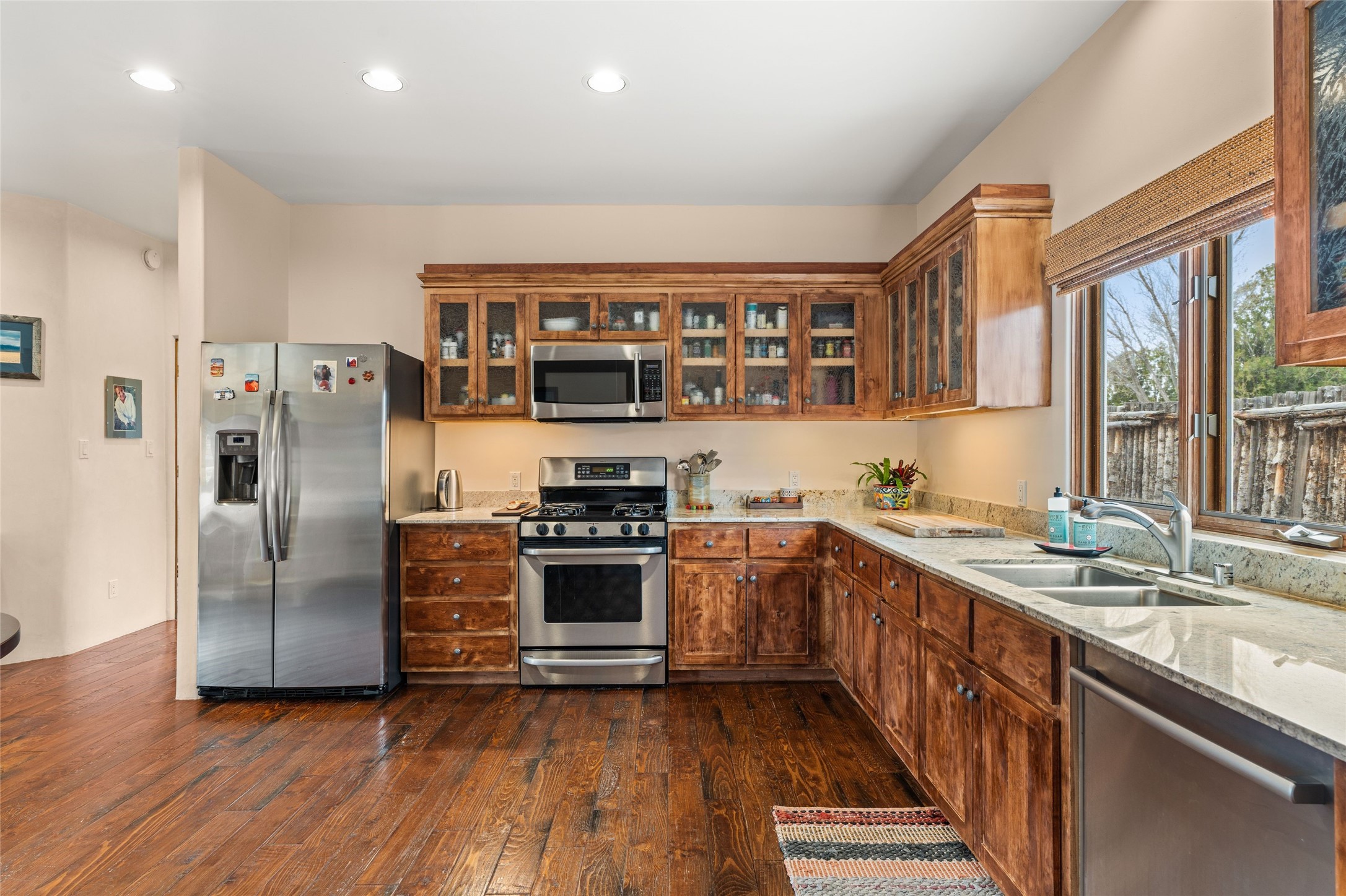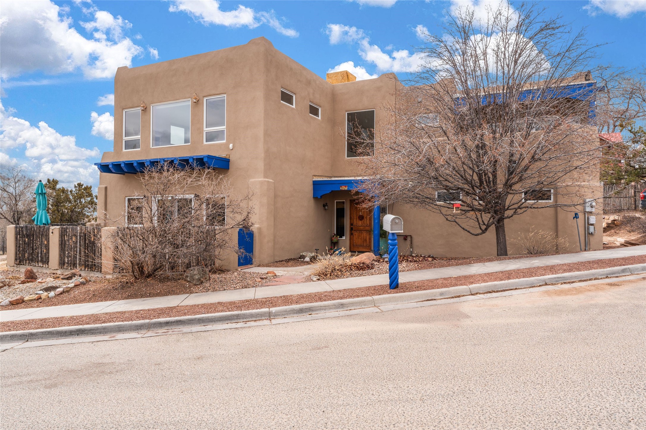 Move-in ready, located in a prime in-town neighborhood, as sited with mountain views: 218 Calle Roble is a gem and an incredible value. This 2,423 square foot, 4-bedroom, 3-bathroom home in the Casa Solana neighborhood is warm, inviting, and in excellent condition. With two levels, the first floor welcomes one into an open-concept kitchen and living area with high-beamed ceilings, wood floors, and a cozy gas fireplace. Off the open entertaining space is a flexible bedroom or office space and a three-quarter bath. Upstairs, hosts a generous primary bedroom with large windows framing the Sangre de Cristo Mountains. One can see the lights of the snow groomers at Ski Santa Fe as they settle down for the night. Two additional guest bedrooms and a shared bath complete the upper level. The outdoor spaces are low maintenance and incredibly functional comprising an elevated balcony, a cozy dining courtyard off the living room, and a fenced in dog run or garden area in the back. The location is unbeatable: just minutes from Santa Fe Plaza; walking distance to the restaurants, cafe, grocery store, yoga center, and brewery at the Solana Center; nearby to the Frank Ortiz dog park and the La Tierra trail system; not to mention access to the Casa Solana community pool. This is true urban living with a Santa Fe flair. With a six year old roof still under warranty (with Santa Fe Stucco and Roofing) and a combi-boiler and stucco that are only three years old, this home asks nothing of the new owner except to move in and enjoy.