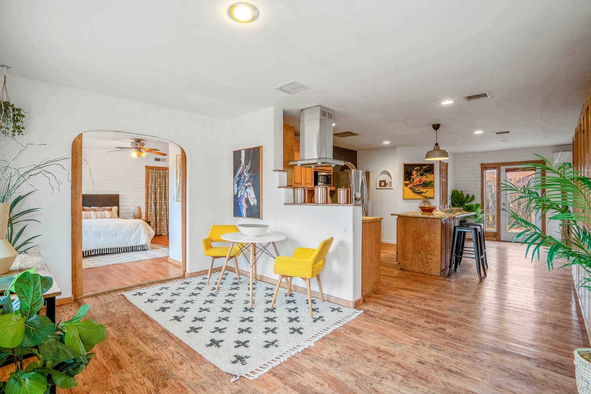 Just minutes from the Plaza, this charming 1,385 sq. ft. home offers the perfect blend of Southwestern character, modern updates, and exceptional flexibility. Set on a spacious lot with views of the Sangre de Cristo Mountains, the property provides easy access to the Ortiz Dog Park, River Trail, and the Co-op. The 1089 sq. ft. main house features an inviting open-concept design with a renovated kitchen, complete with granite countertops, an island, and a cozy living room with an artistic wood-burning fireplace. The primary suite enjoys mountain views, a bathroom, and a generous walk-in shower. An attached one-car garage adds convenience. Currently configured as a home with an attached 305 sq. ft. studio casita--rented on a monthly basis--the property offers great investment potential. The casita includes a full bathroom, kitchenette, and private entrance, making it ideal as a guest space or rental. With a simple modification, the home can easily be converted back to a two-bedroom, three-bathroom residence. This unique property offers a great downtown location, mountain views, and flexible living options--a rare opportunity in the heart of Santa Fe