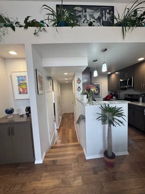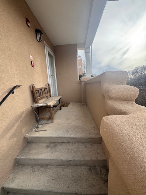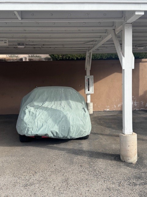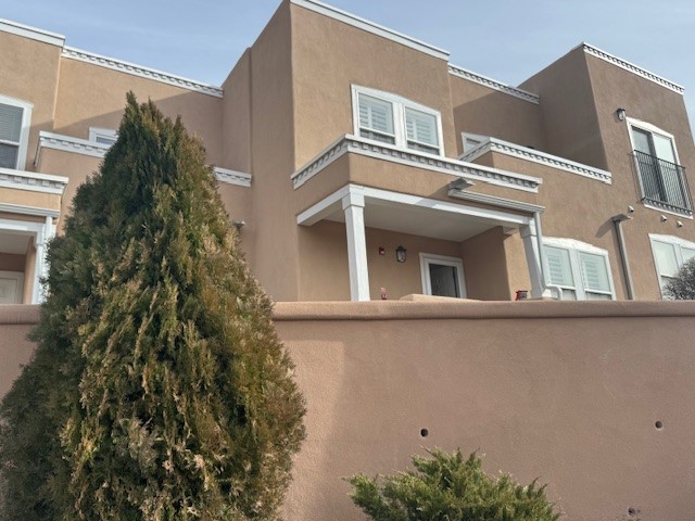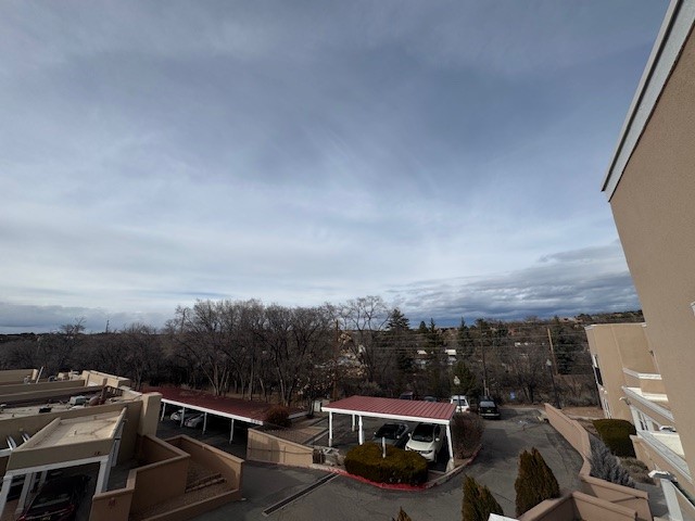 This 2 Bed/2Bath condo is walking distance to the Plaza with full access to restaurants, events, galleries and trails. The home also includes high ceilings with tons of natural light, an open concept living, dining, & kitchen area, with custom cabinetry, high-end appliances, and granite countertops. Walk out patio for entertaining, enjoying the spacious patio with privacy hill behind. There is central air conditioning, fireplace, shuttered windows, bamboo floors. The upstairs, conveniently separated from secondary bedroom has fantastic views and includes an outside balcony with unobstructed views of Zozobra at Ft. Marcy, and stunning Santa Fe skies. There is one reserved carport space plus an extra parking place, all behind a gated entry.