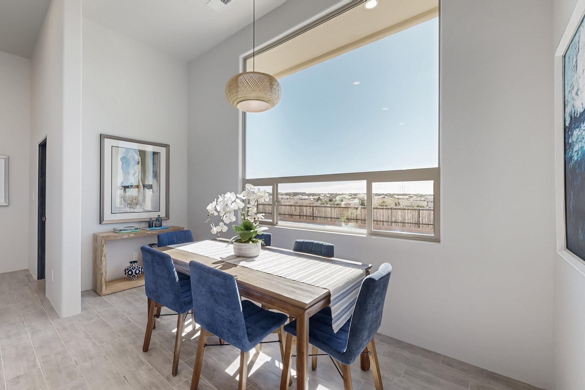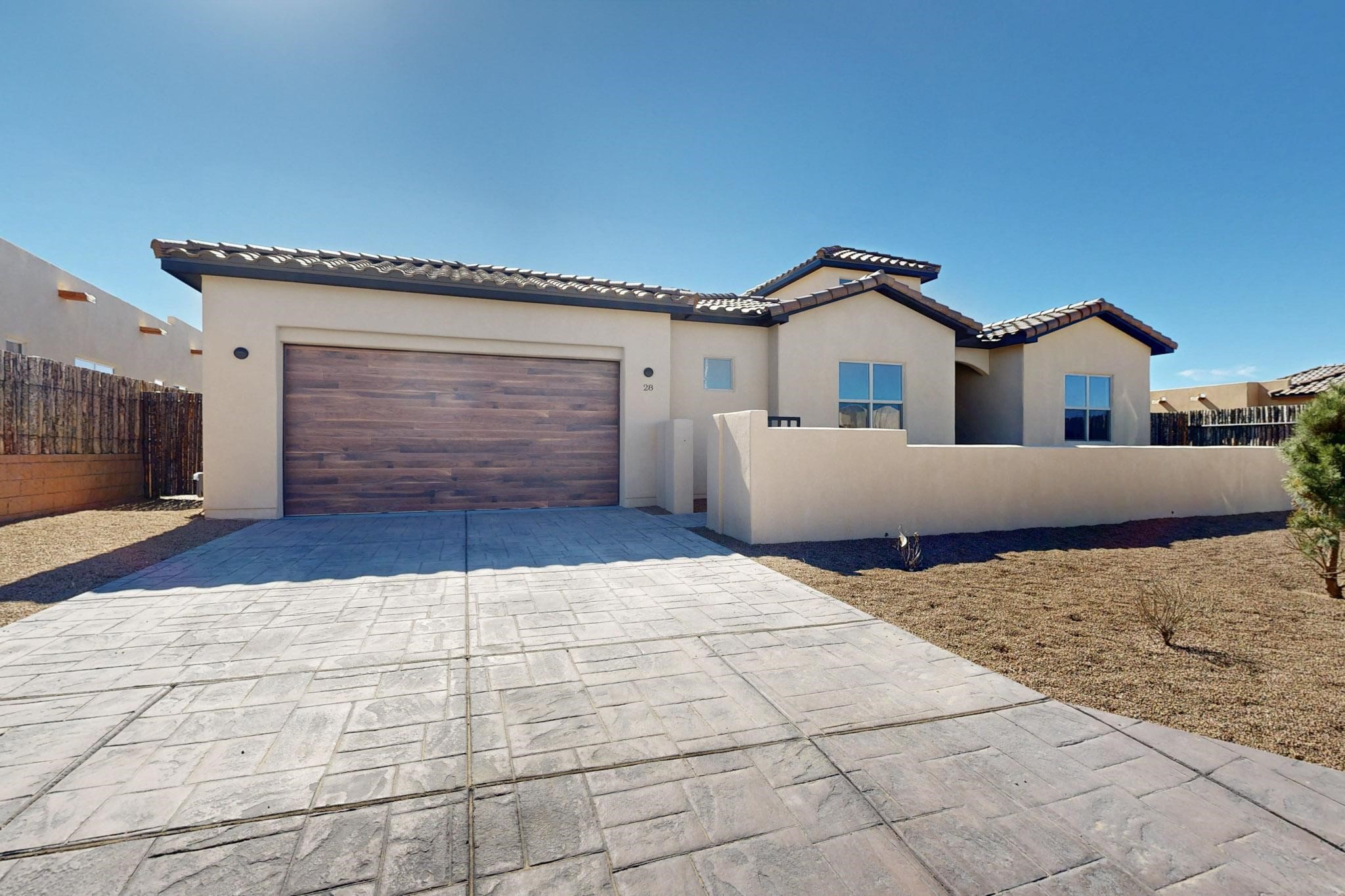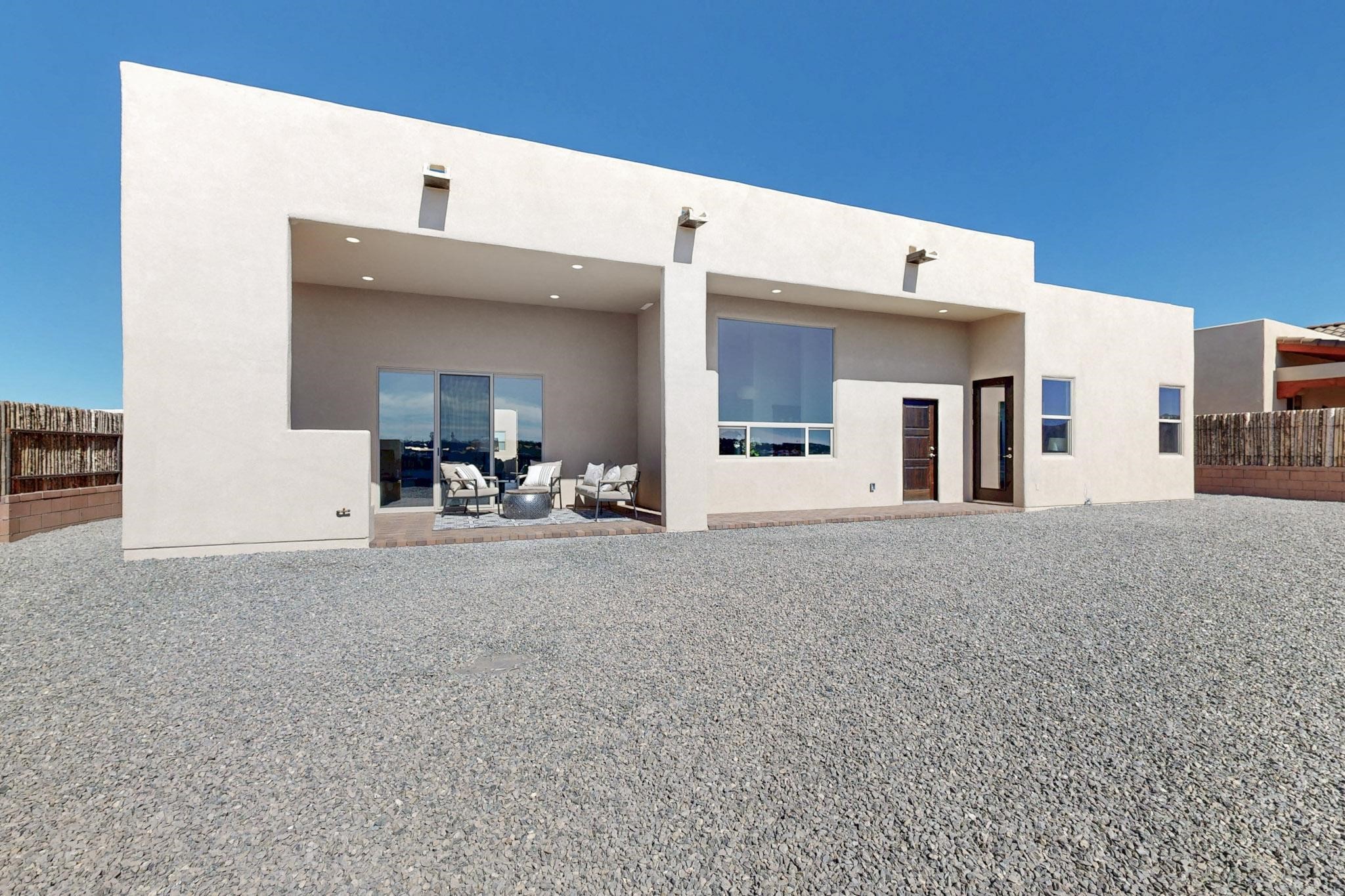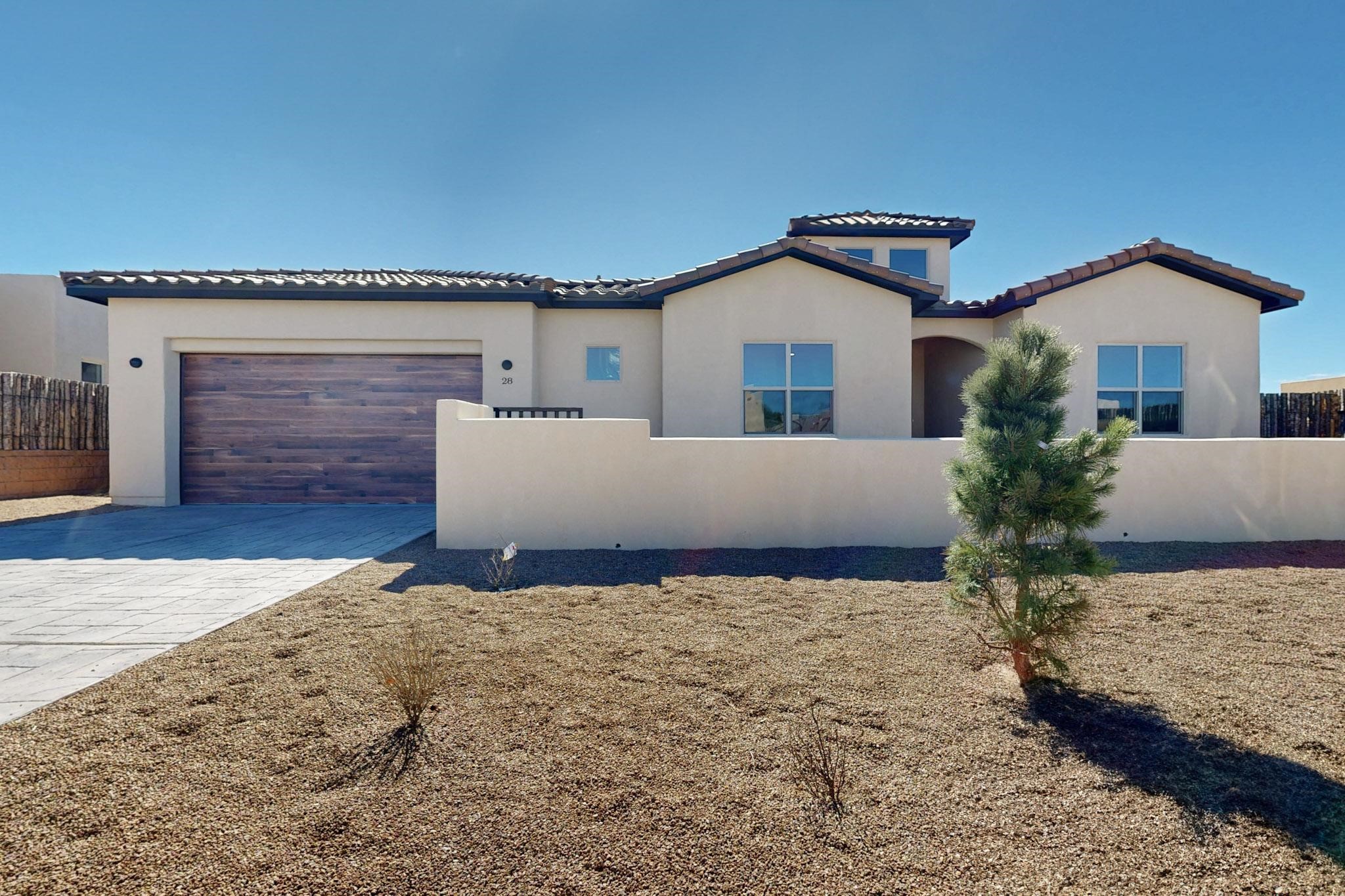 Step into luxury at 28 La Pradera, a 2350 square foot contemporary home designed for comfort, entertaining and breathtaking 180-degree territorial views. A brick-paved covered entry leads to an eight-foot high solid wood door opening into a soaring atrium with clerestory windows. To the right of the entry is a bedroom with a full bath that would be perfect for a home office. To the left is a second bedroom with a walk-in closet. A hall closet provides extra storage. Across is a sliding barn door accessing a large butler's pantry that connects to the kitchen with a swinging door. Open kitchen design with quartz countertops, 17-foot-tall skylight with clerestory windows on all four sides and wired for a chandelier. A powder room has direct access to the rear portal. Also, a secure room for a safe and storage of valuables. The generous owner's suite has wonderful views and double counters and sinks, a free-standing tub, a separate shower with marble and rainfall tile, linen closet, and a 72 sq. ft. walk-in closet. The two-car garage has an epoxied floor and a large room for holiday storage or gift wrapping.