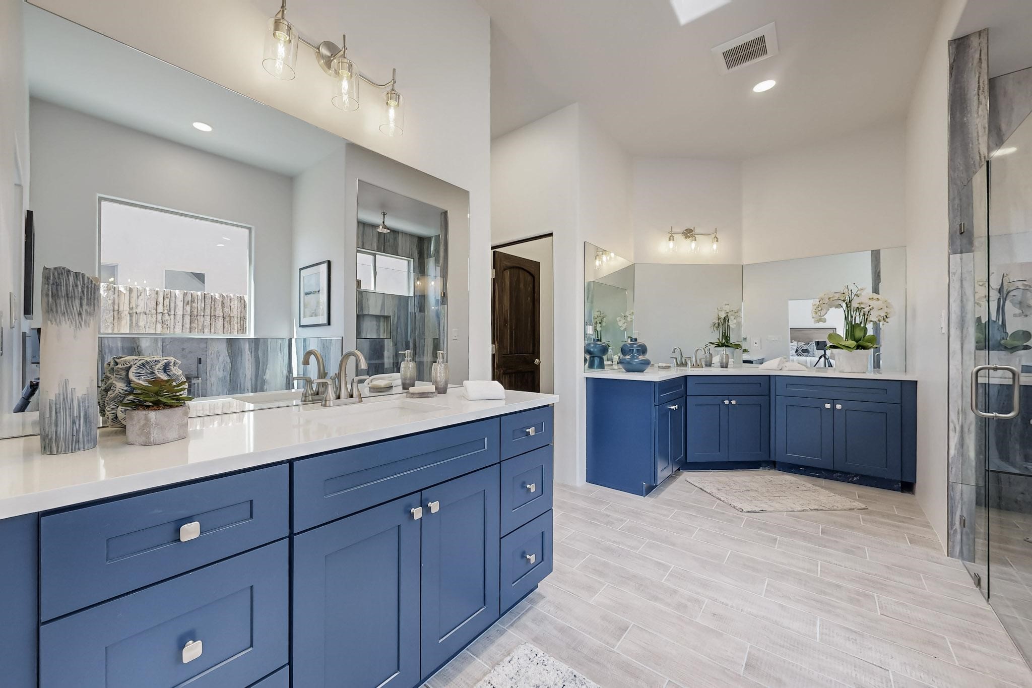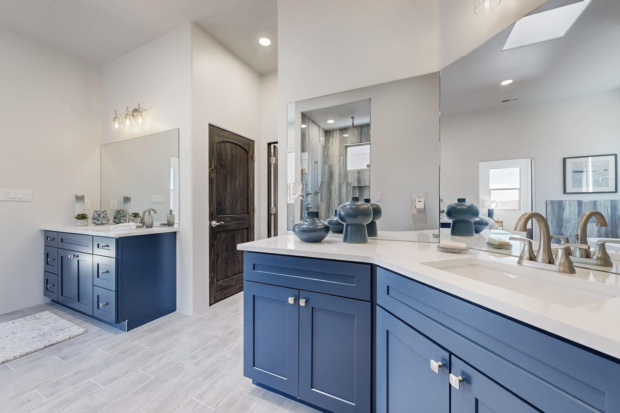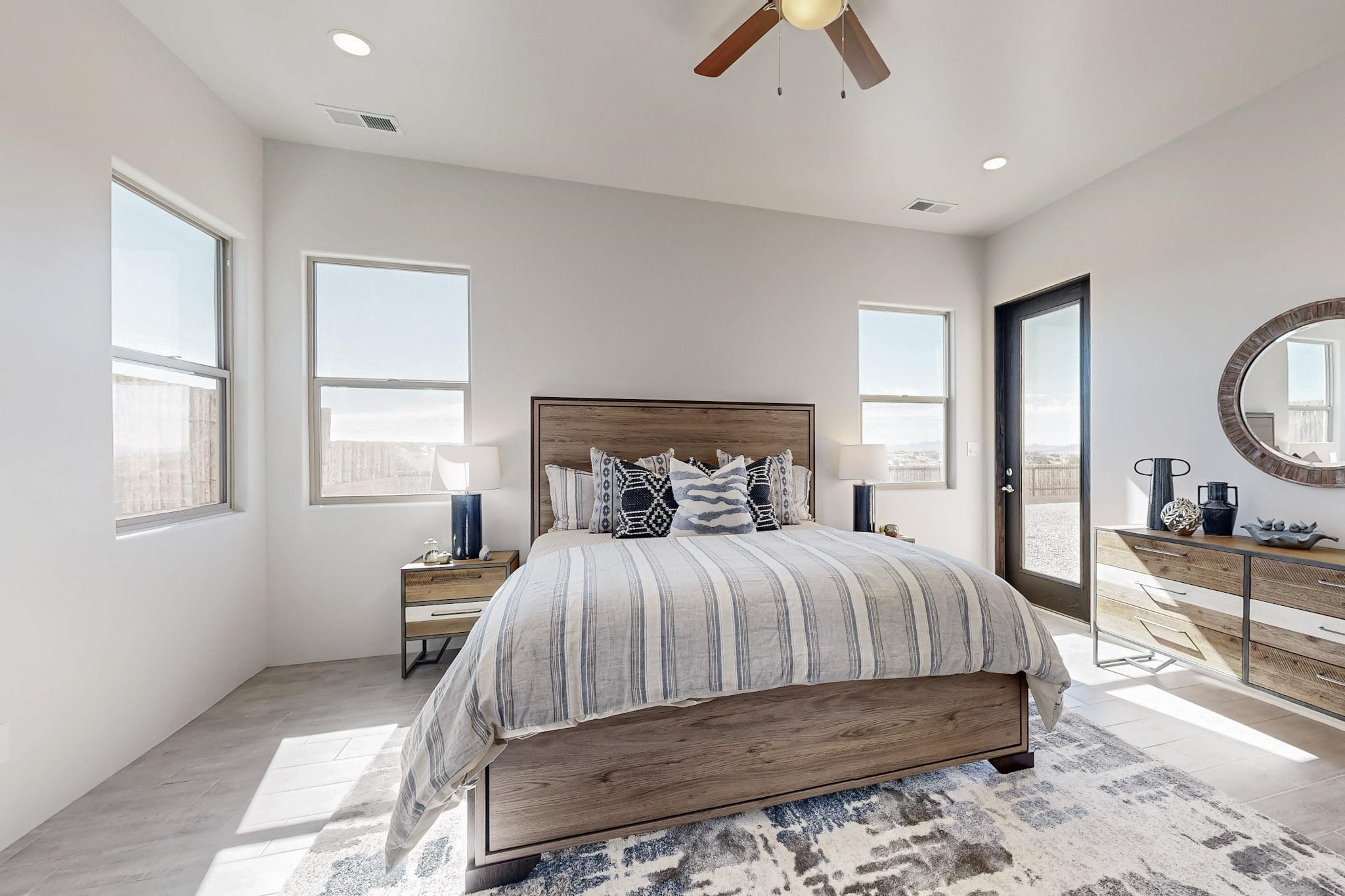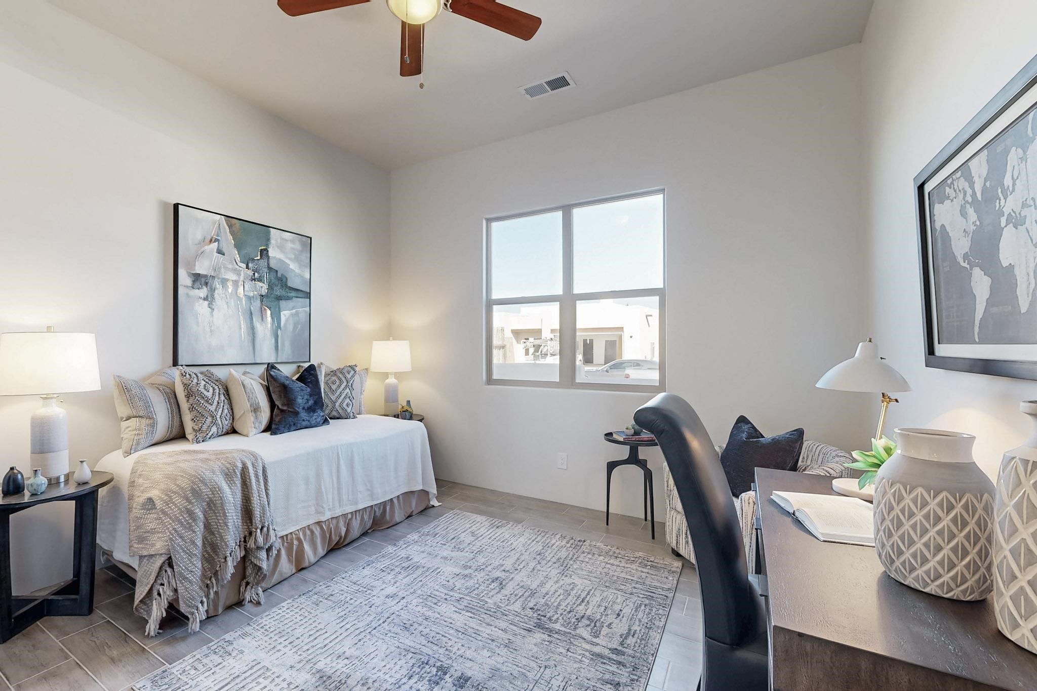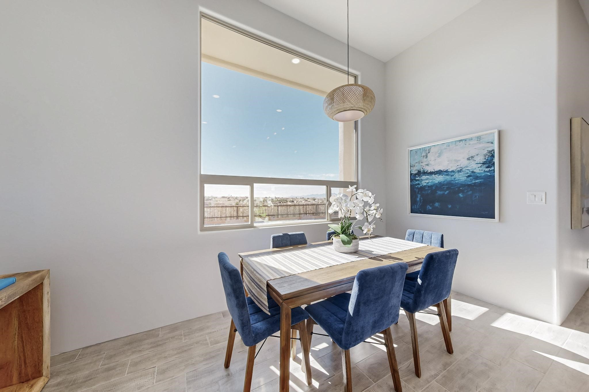 Step into luxury at 28 La Pradera, a 2350 square foot contemporary home designed for comfort, entertaining and breathtaking 180-degree territorial views. A brick-paved covered entry leads to an eight-foot high solid wood door opening into a soaring atrium with clerestory windows. To the right of the entry is a bedroom with a full bath that would be perfect for a home office. To the left is a second bedroom with a walk-in closet. A hall closet provides extra storage. Across is a sliding barn door accessing a large butler's pantry that connects to the kitchen with a swinging door. Open kitchen design with quartz countertops, 17-foot-tall skylight with clerestory windows on all four sides and wired for a chandelier. A powder room has direct access to the rear portal. Also, a secure room for a safe and storage of valuables. The generous owner's suite has wonderful views and double counters and sinks, a free-standing tub, a separate shower with marble and rainfall tile, linen closet, and a 72 sq. ft. walk-in closet. The two-car garage has an epoxied floor and a large room for holiday storage or gift wrapping.