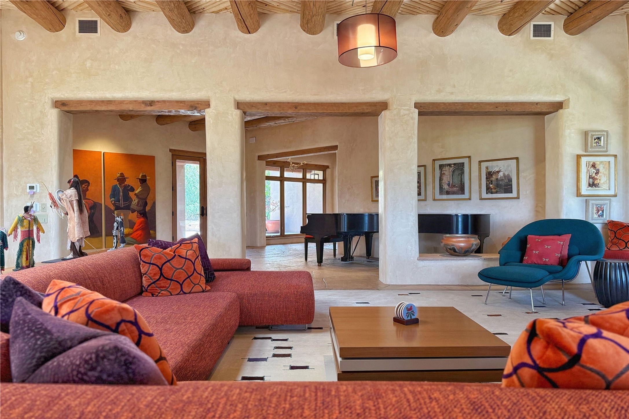 Welcome to a stunning Southwest-style home offering the perfect blend of elegance, warmth, and artistic expression. Built on an elevated lot to capture breathtaking Jemez Mountain views, this property is ideal for showcasing your art collection and entertaining in Santa Fe style.Warm earth tones complement the vigas and stone floors, creating a soft contemporary Southwest ambiance with timeless charm. A pond welcomes you and leads you to the wrap-around portal, complete with wood-burning fireplace, perfect for large gatherings. Enter through double Spanish doors that create a dramatic entry, setting the tone for the home. The foyer offers direct views to the back garden. Flow easily into the grand living room, featuring mountain views, wood-burning kiva fireplace, and cozy Banco seating. Made for entertaining, this home includes an elegant dining room with built-in cabinetry and portal access. The massive kitchen has an equally massive island, sitting room, and gas fireplace. The built in storage is impressive. The kitchen leads into the back garden with waterfall feature. 45 Violet Circle features an office, large media room and separate family room, for extra work, entertainment and relaxation spaces. A gas fireplace and large windows in the spacious primary suite highlight the back garden. The primary bath has his/hers showers and toilets. The primary closet is home to a walk in safe. Adjacent to the suite is a bonus/rec room with access to an underground space, perfect to turn into a dedicated wine cellar. The separate casita boasts high ceilings, decorative tiles, and a gas fireplace. Exquisite landscaping showcases 3 water features, adding elegance and peacefulness. This residence is designed around multiple outdoor spaces for true indoor/outdoor living.With the water feature sounds, art displays spaces, and large rooms, this home is peaceful, impressive and substantial.Please note, fires in fireplaces may be digitally added