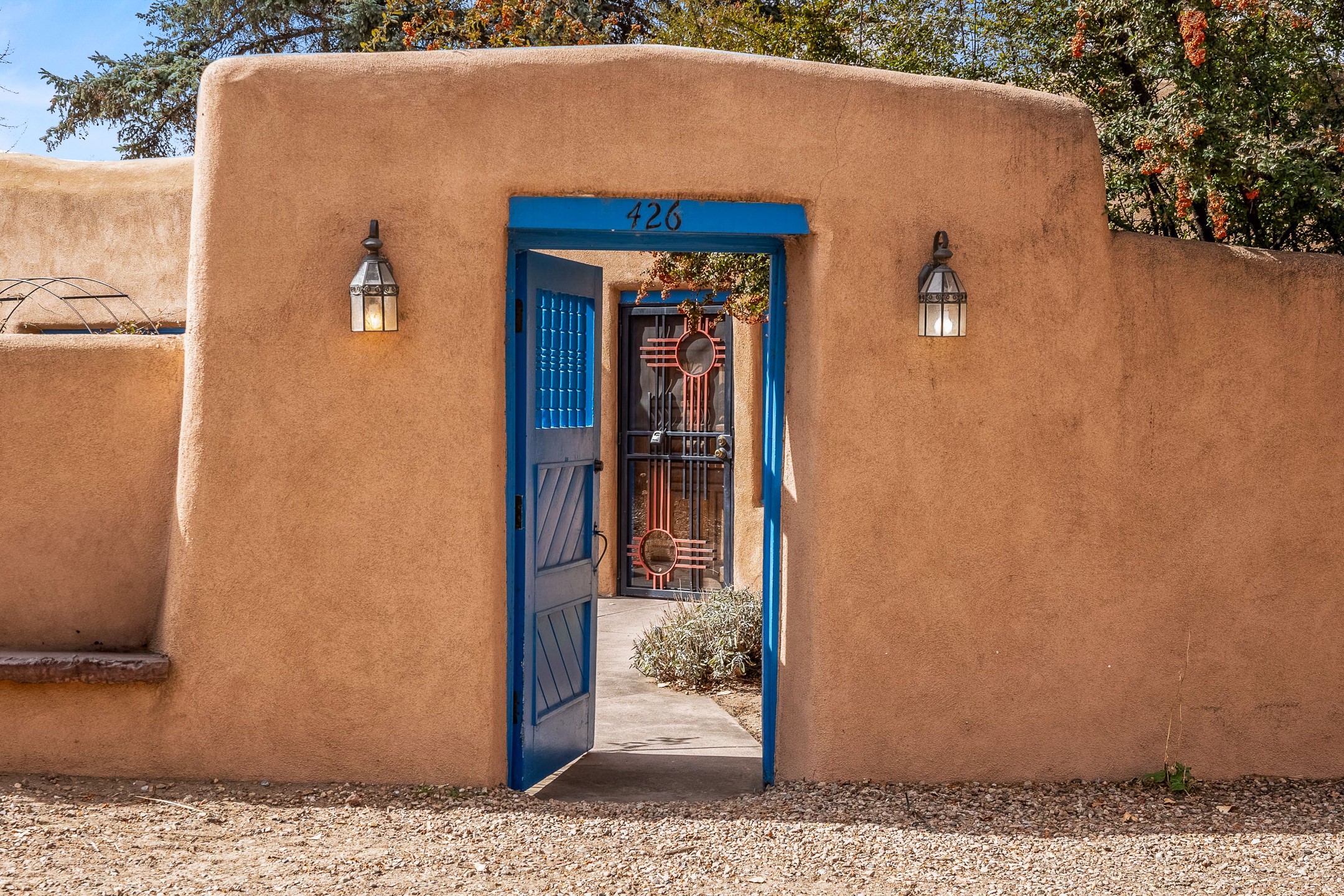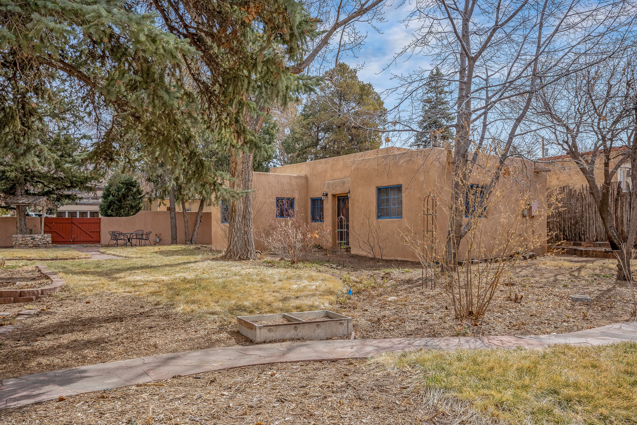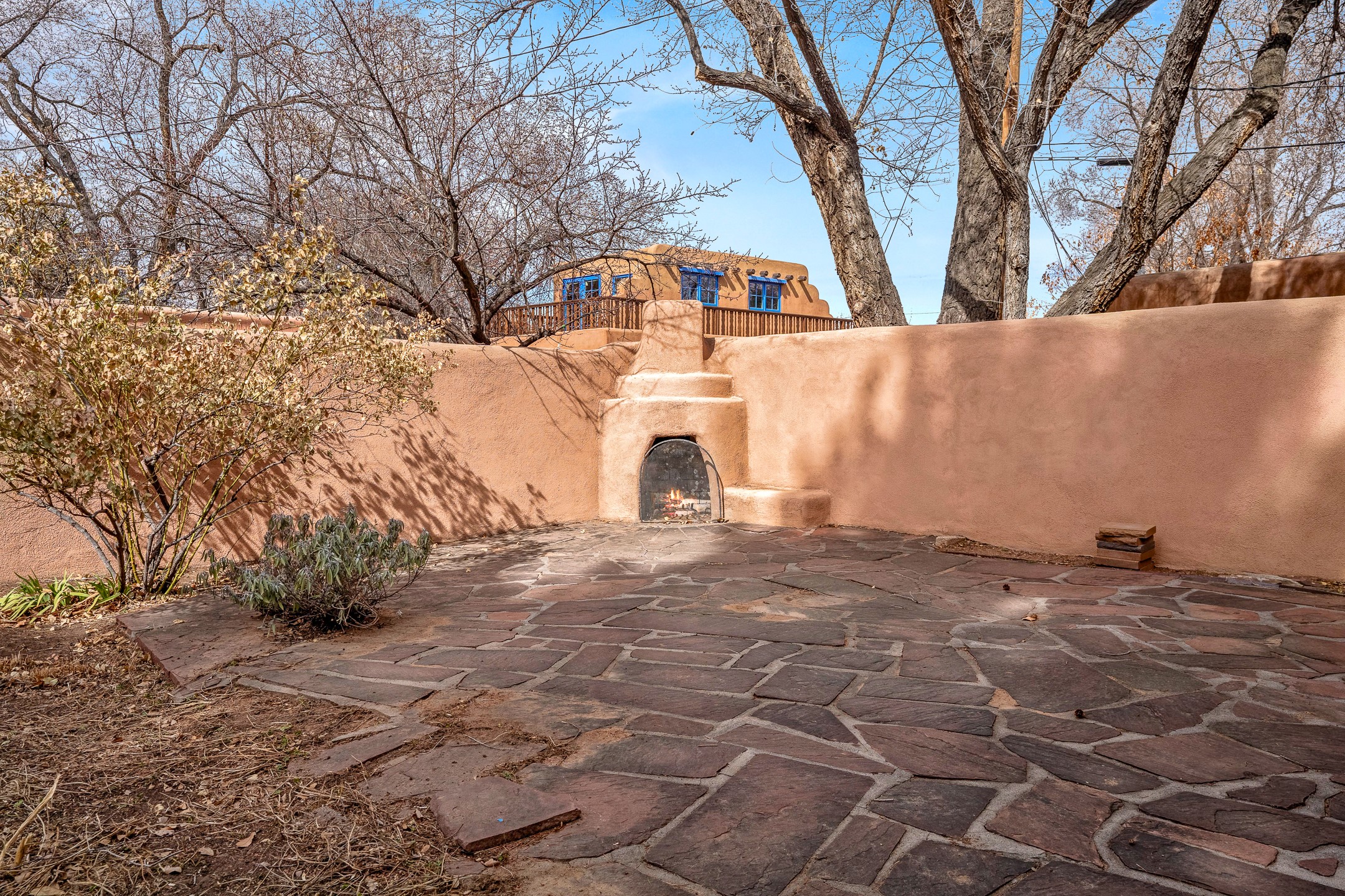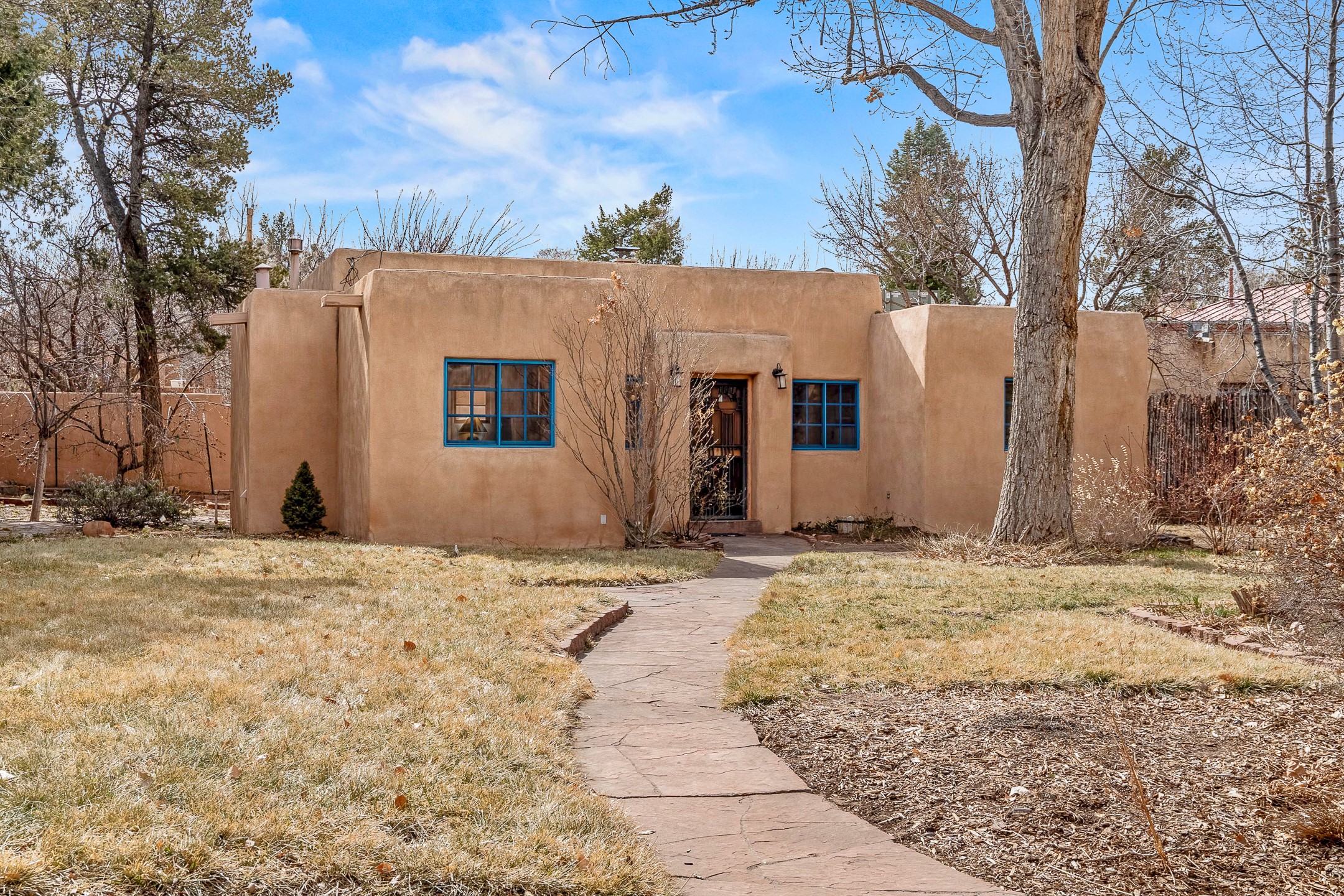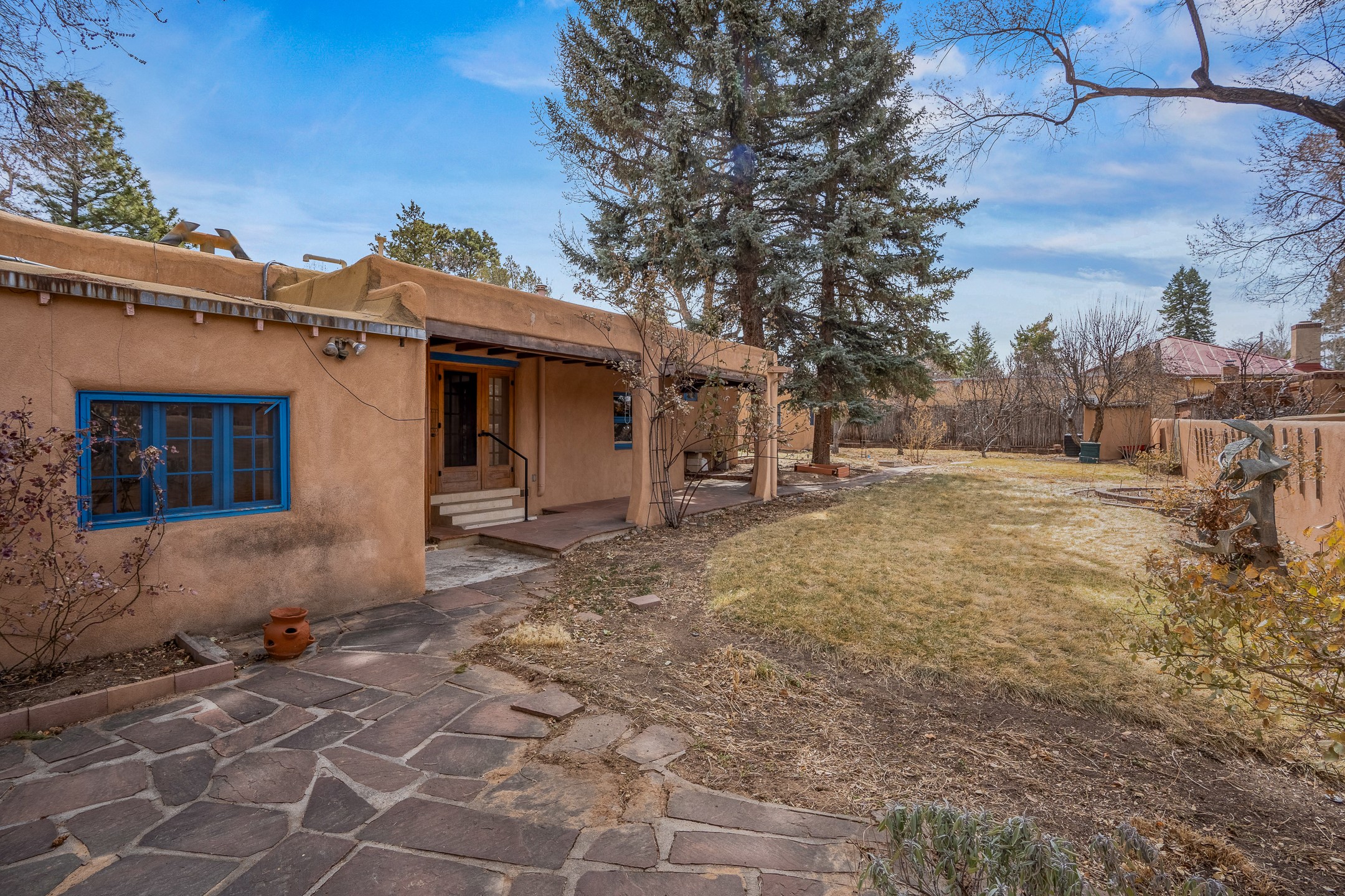 Located at the end of Santa Fe's covetable and quiet Delgado Lane, yet in the "center of it all", lies this incredibly rare find -hitting the market for the first time since its construction in the 1920s. Poised on an expansive .4-acre lot, this opportunity offers the perfect combination of Santa Fe charm and tranquility paired with the best of Santa Fe at your fingertips. The adobe 3BD-2.5BA main house exudes classic pueblo style architecture, viga ceilings, wood floors, and charming wood burning fireplaces. The 1BD-1BA detached guest house, added in the 1990s, offers a well equipped kitchen, its own laundry, and is privately sited offering a comfortable space for visitors and friends, or presents an interesting income generating opportunity. The property's captivating grounds are equally impressive. A true gardener's paradise, the lot is adorned with apple, apricot, pear, nectarine, and cherry trees, as well as mature cottonwood and pine trees. Colorful rose bushes (some of which are circa 80 years old) and peonies also decorate the gardens. The grounds benefit from water drawn from the property's private well (irrigation only), sprinkler system and drip irrigation are already in-place. Located steps away from Acequia Madre and Canyon Road, known for its world-class galleries and dining options, this is an exceptional opportunity to own and reimagine a slice of Santa Fe's rich history. A remarkable melding of privacy, outdoor beauty, space to entertain, and easy access to the heart of the city, this is a canvas that rarely becomes available.