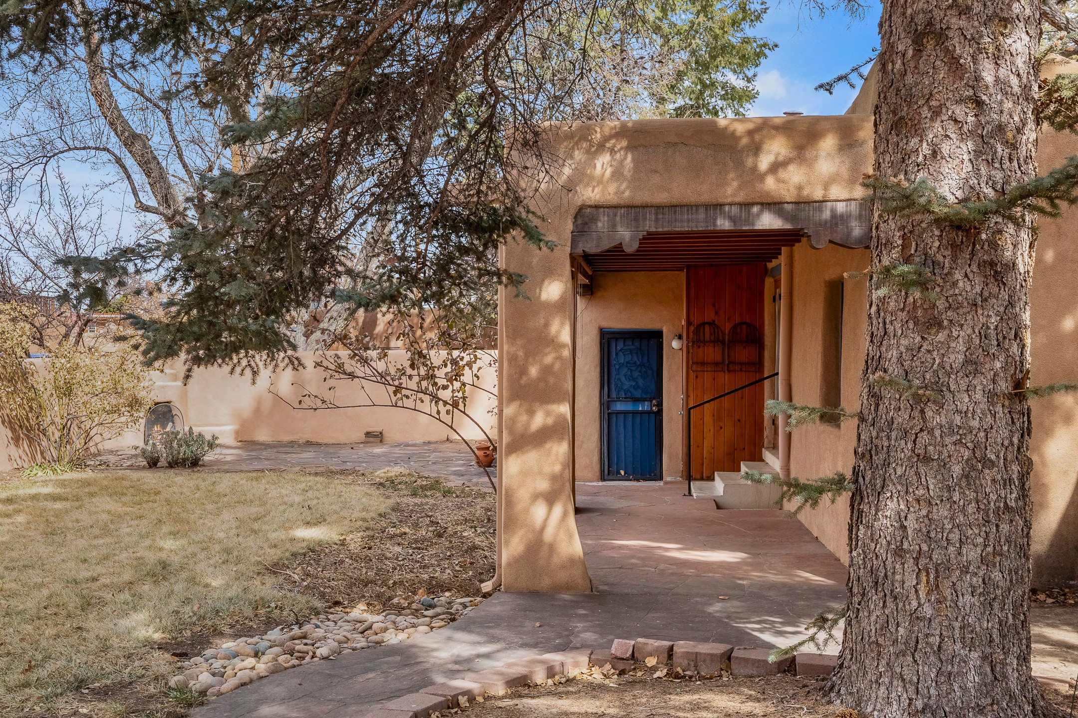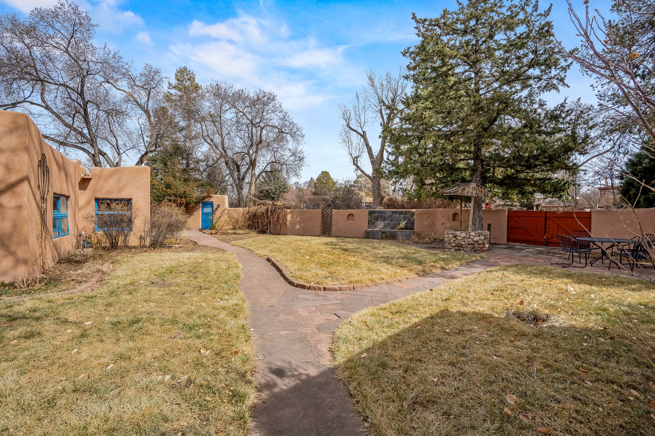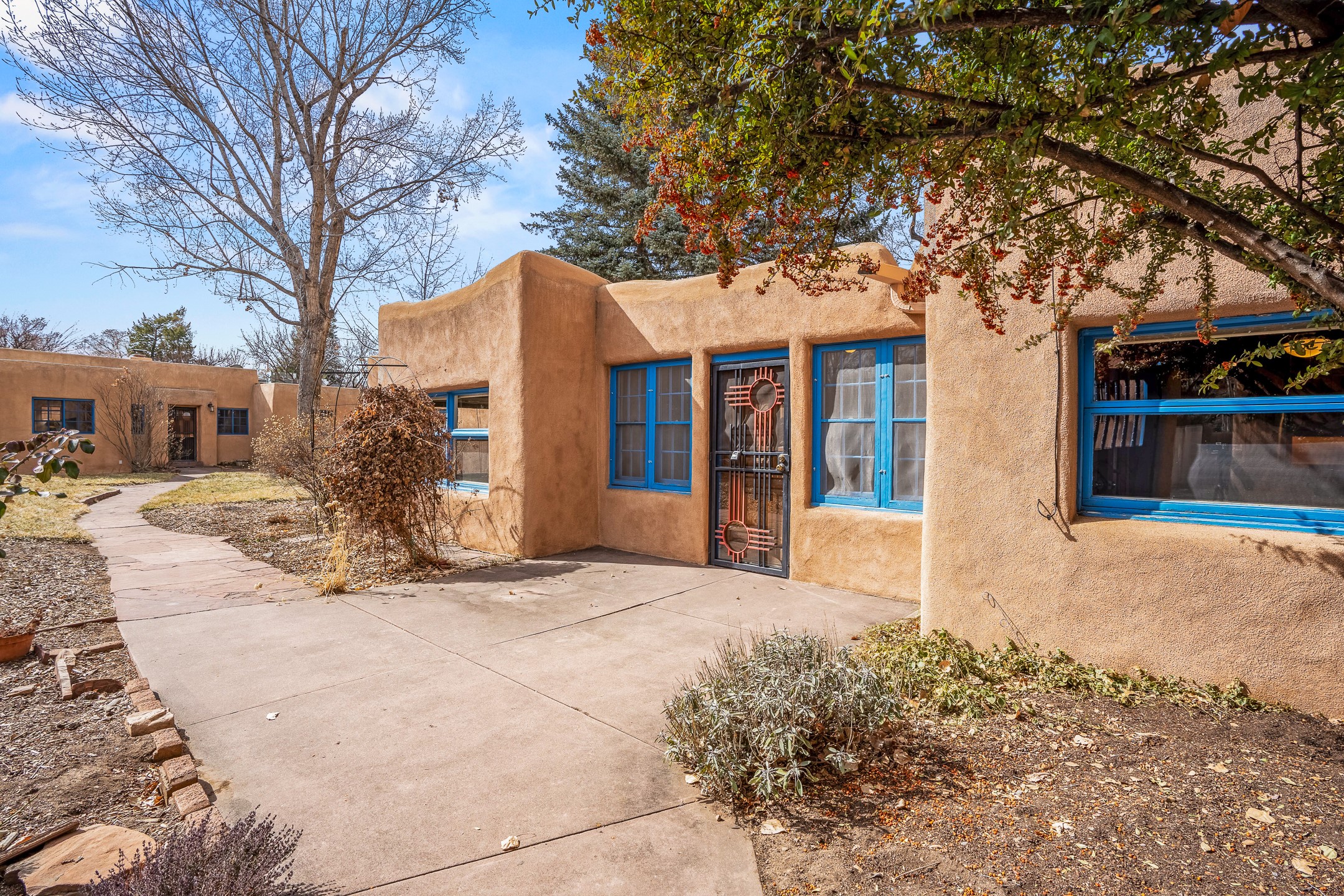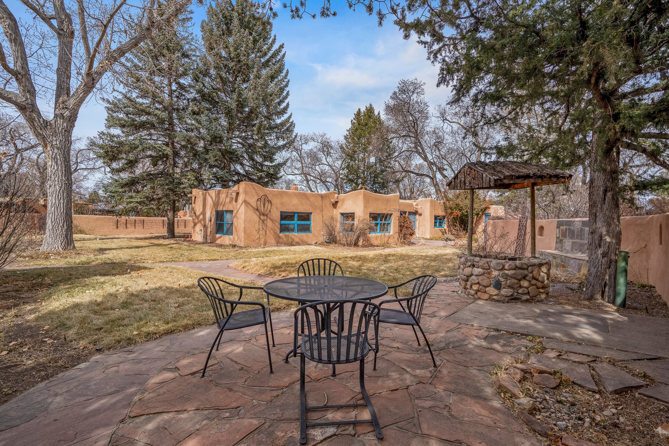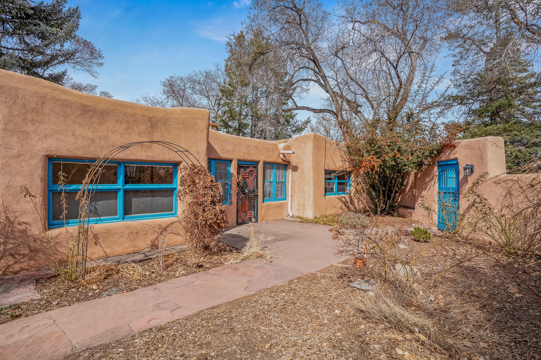 Located at the end of Santa Fe's covetable and quiet Delgado Lane, yet in the "center of it all", lies this incredibly rare find -hitting the market for the first time since its construction in the 1920s. Poised on an expansive .4-acre lot, this opportunity offers the perfect combination of Santa Fe charm and tranquility paired with the best of Santa Fe at your fingertips. The adobe 3BD-2.5BA main house exudes classic pueblo style architecture, viga ceilings, wood floors, and charming wood burning fireplaces. The 1BD-1BA detached guest house, added in the 1990s, offers a well equipped kitchen, its own laundry, and is privately sited offering a comfortable space for visitors and friends, or presents an interesting income generating opportunity. The property's captivating grounds are equally impressive. A true gardener's paradise, the lot is adorned with apple, apricot, pear, nectarine, and cherry trees, as well as mature cottonwood and pine trees. Colorful rose bushes (some of which are circa 80 years old) and peonies also decorate the gardens. The grounds benefit from water drawn from the property's private well (irrigation only), sprinkler system and drip irrigation are already in-place. Located steps away from Acequia Madre and Canyon Road, known for its world-class galleries and dining options, this is an exceptional opportunity to own and reimagine a slice of Santa Fe's rich history. A remarkable melding of privacy, outdoor beauty, space to entertain, and easy access to the heart of the city, this is a canvas that rarely becomes available.