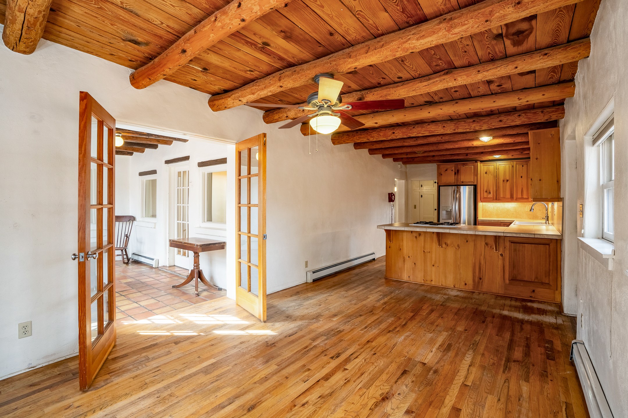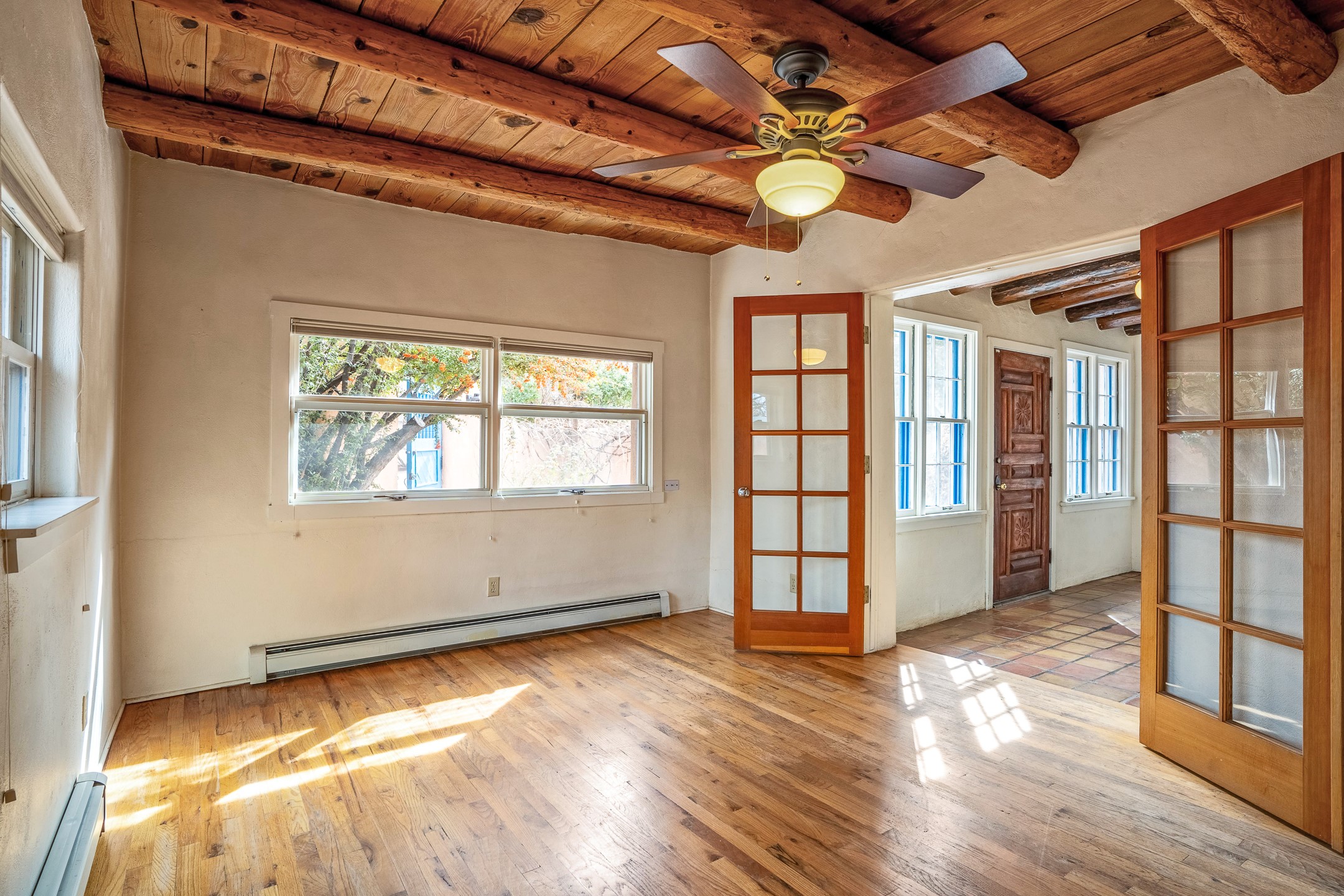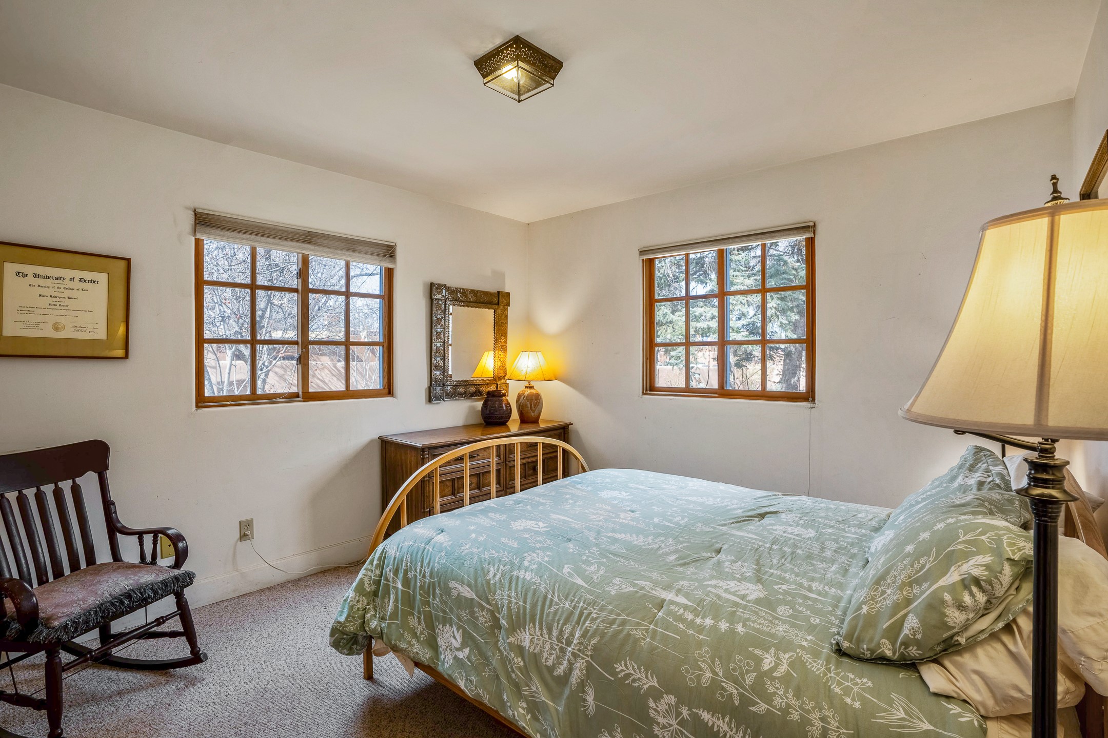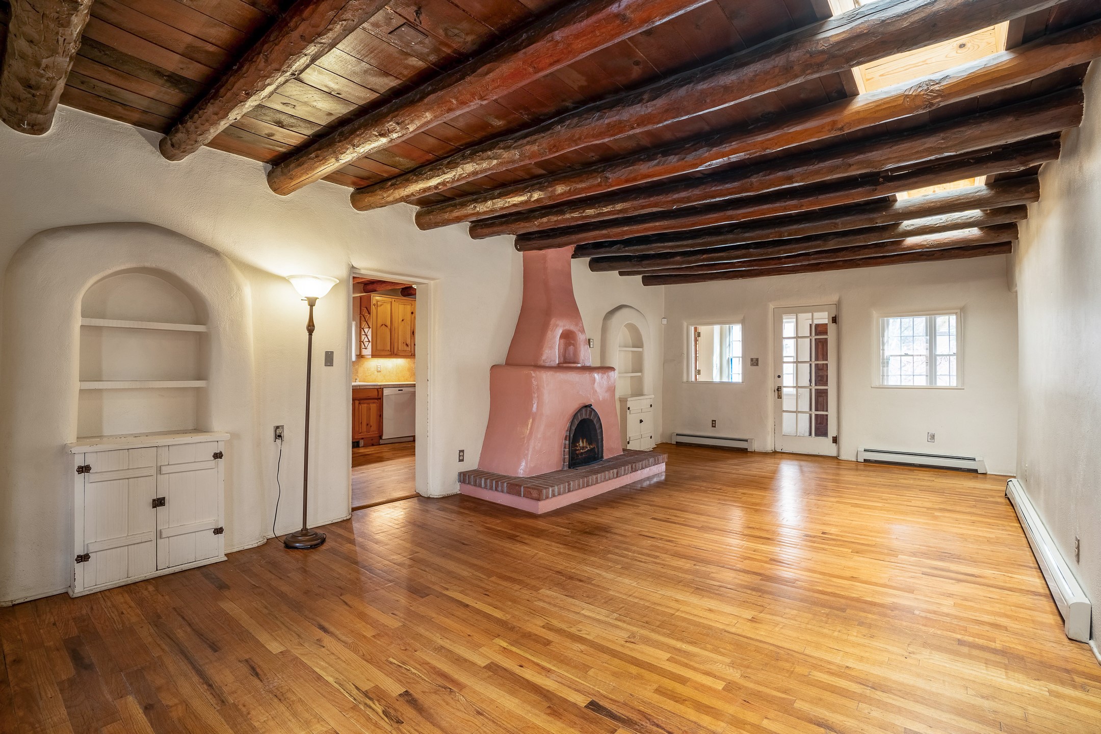 Located at the end of Santa Fe's covetable and quiet Delgado Lane, yet in the "center of it all", lies this incredibly rare find -hitting the market for the first time since its construction in the 1920s. Poised on an expansive .4-acre lot, this opportunity offers the perfect combination of Santa Fe charm and tranquility paired with the best of Santa Fe at your fingertips. The adobe 3BD-2.5BA main house exudes classic pueblo style architecture, viga ceilings, wood floors, and charming wood burning fireplaces. The 1BD-1BA detached guest house, added in the 1990s, offers a well equipped kitchen, its own laundry, and is privately sited offering a comfortable space for visitors and friends, or presents an interesting income generating opportunity. The property's captivating grounds are equally impressive. A true gardener's paradise, the lot is adorned with apple, apricot, pear, nectarine, and cherry trees, as well as mature cottonwood and pine trees. Colorful rose bushes (some of which are circa 80 years old) and peonies also decorate the gardens. The grounds benefit from water drawn from the property's private well (irrigation only), sprinkler system and drip irrigation are already in-place. Located steps away from Acequia Madre and Canyon Road, known for its world-class galleries and dining options, this is an exceptional opportunity to own and reimagine a slice of Santa Fe's rich history. A remarkable melding of privacy, outdoor beauty, space to entertain, and easy access to the heart of the city, this is a canvas that rarely becomes available.