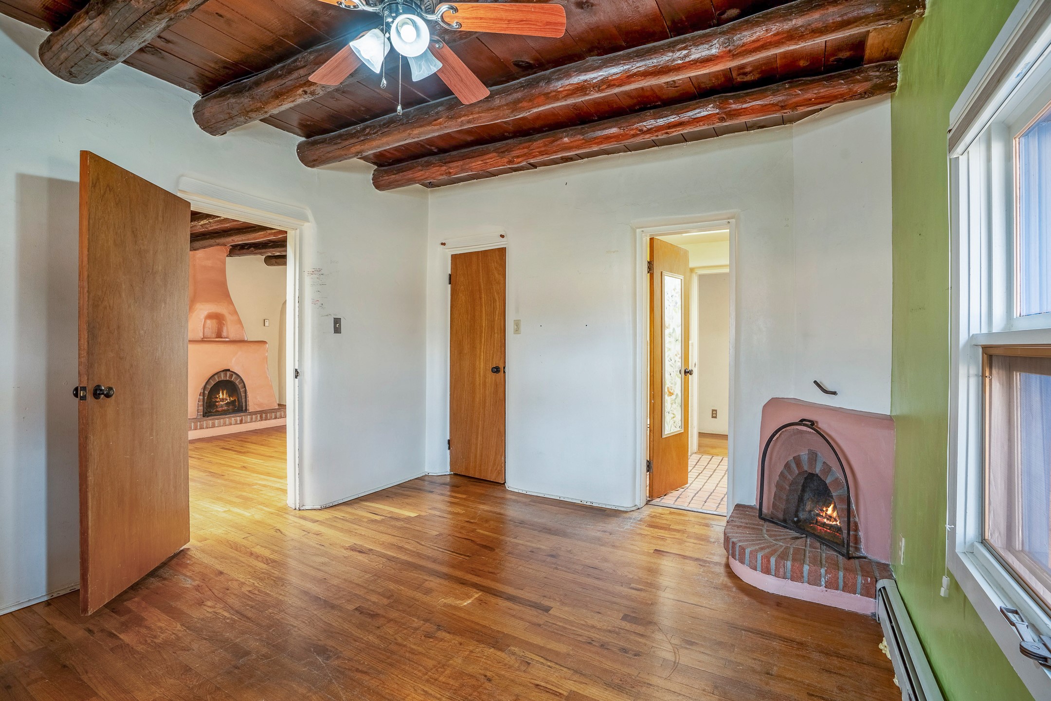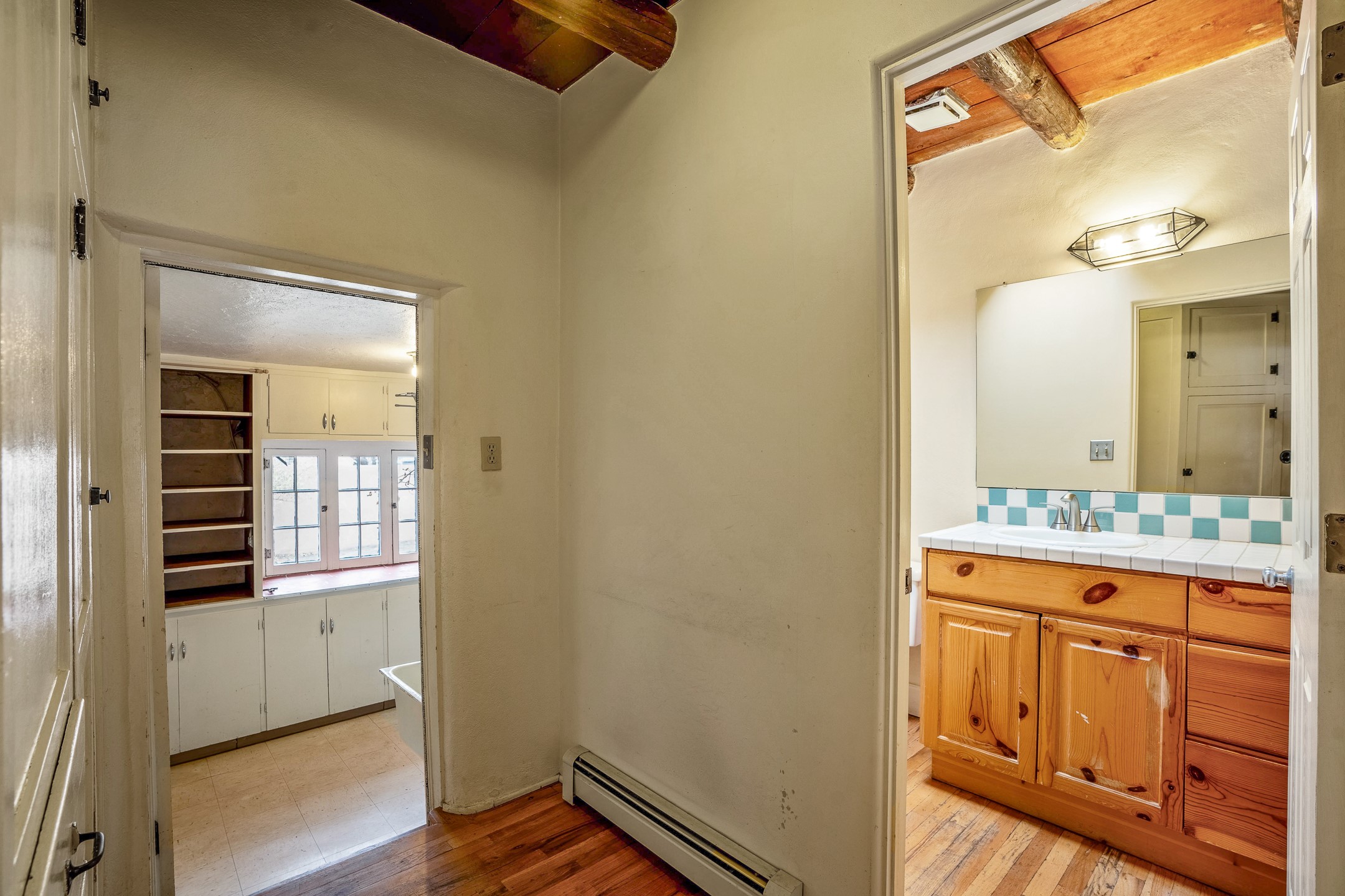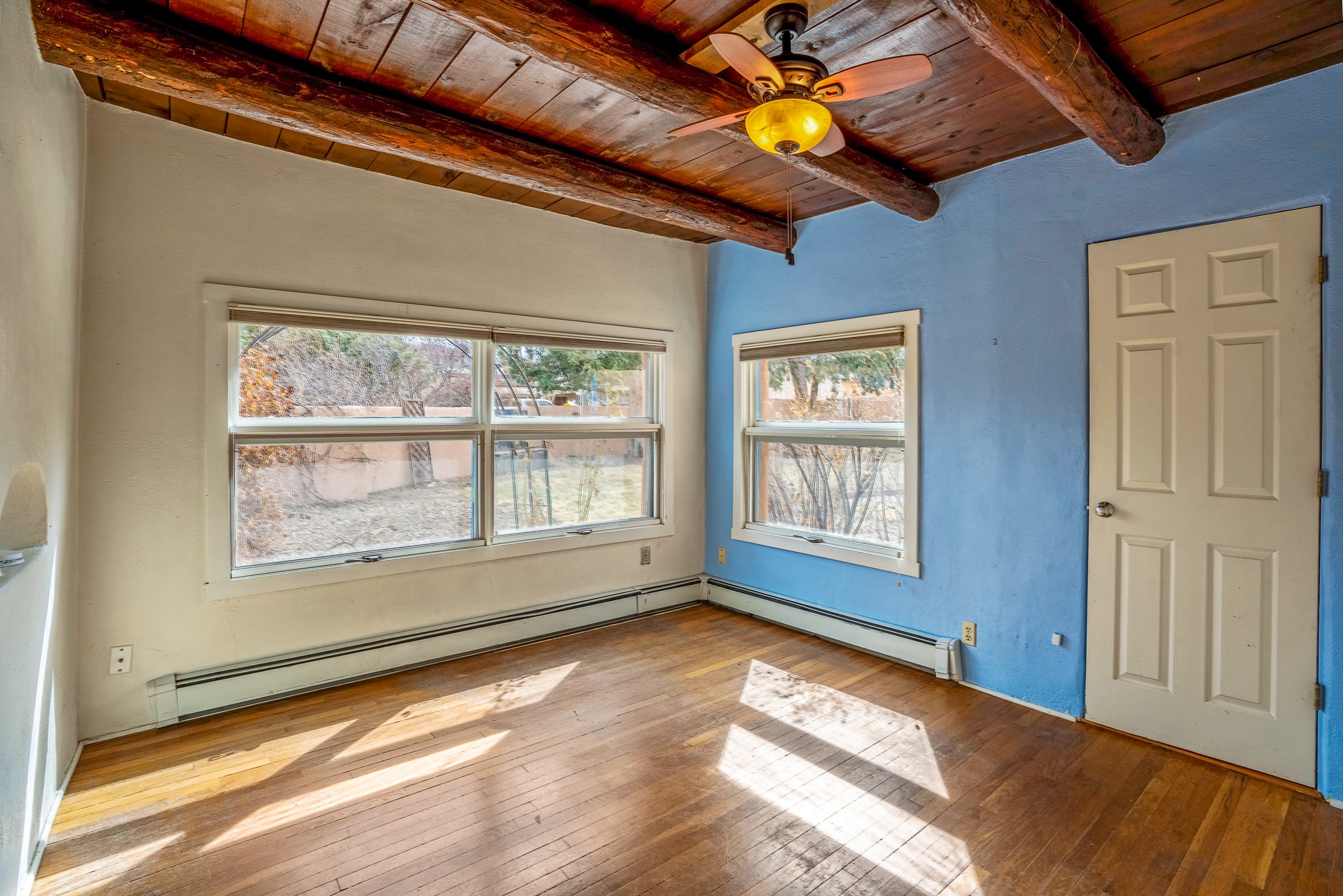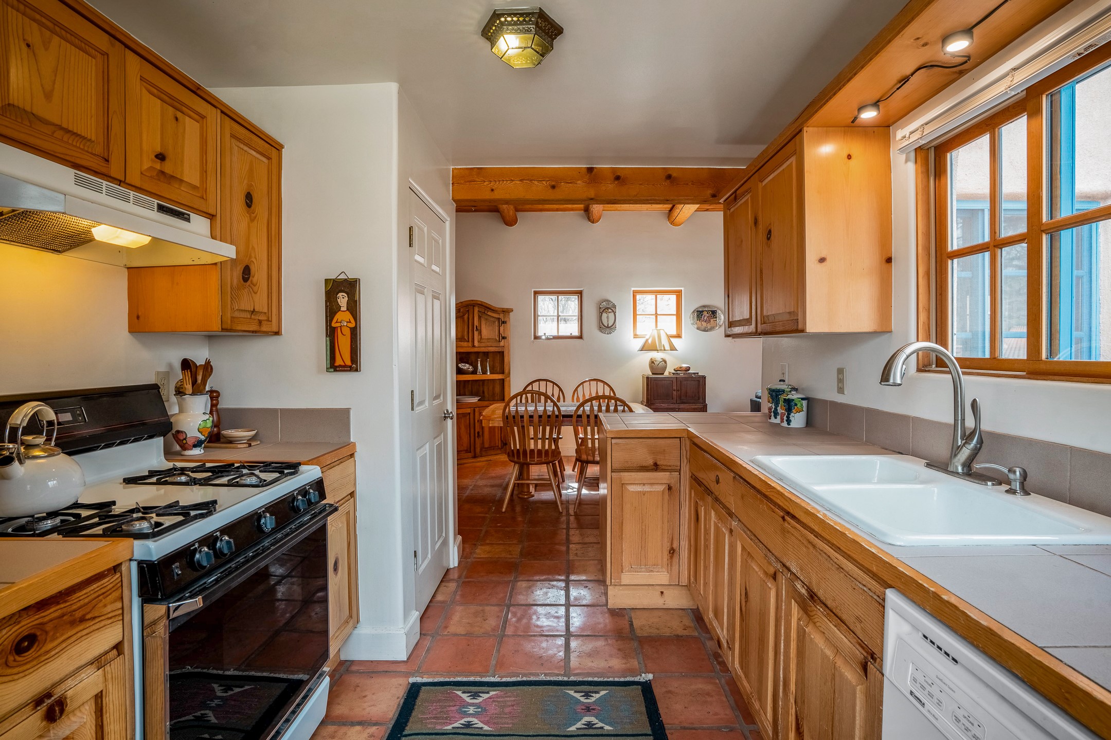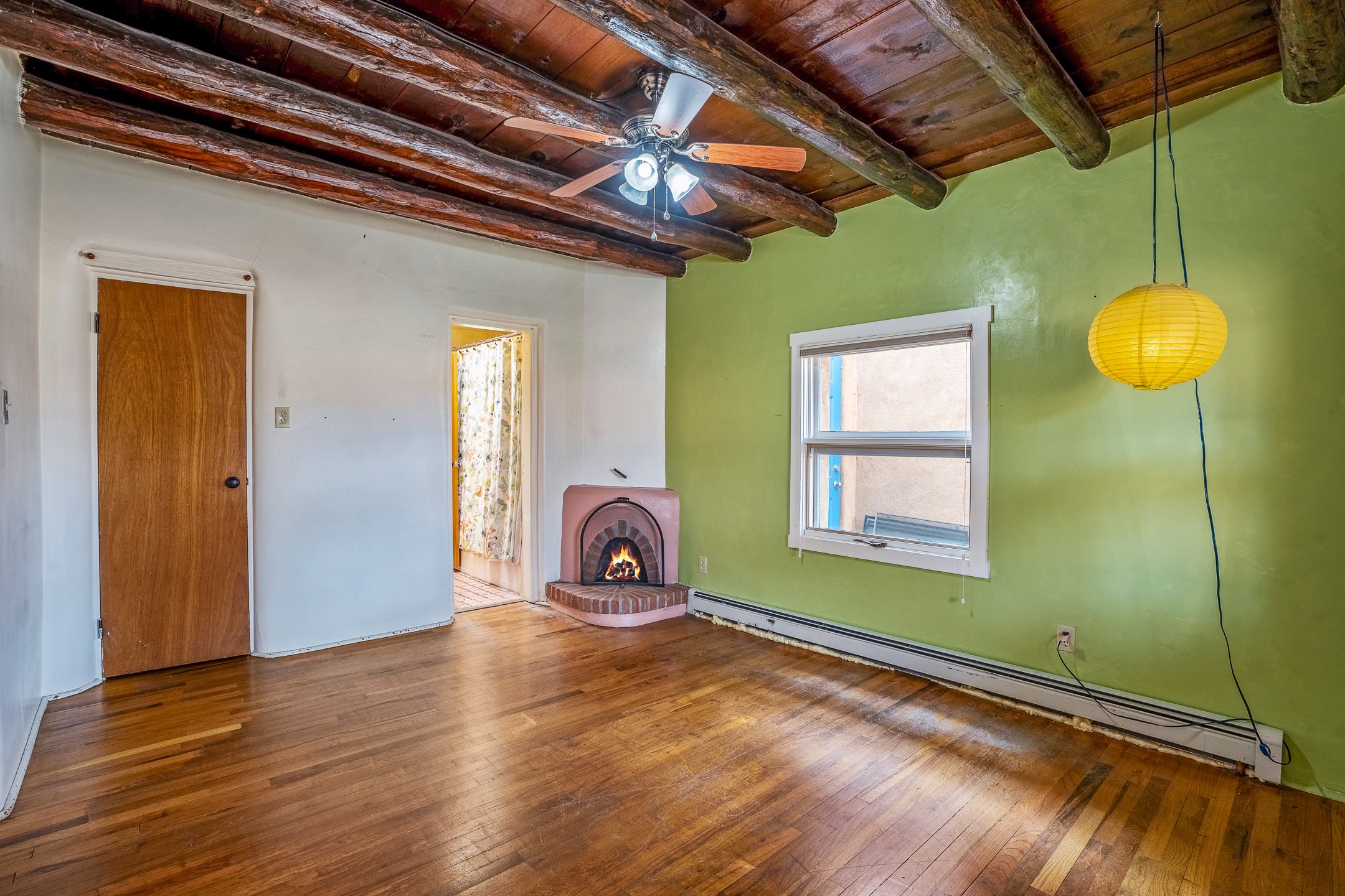 Located at the end of Santa Fe's covetable and quiet Delgado Lane, yet in the "center of it all", lies this incredibly rare find -hitting the market for the first time since its construction in the 1920s. Poised on an expansive .4-acre lot, this opportunity offers the perfect combination of Santa Fe charm and tranquility paired with the best of Santa Fe at your fingertips. The adobe 3BD-2.5BA main house exudes classic pueblo style architecture, viga ceilings, wood floors, and charming wood burning fireplaces. The 1BD-1BA detached guest house, added in the 1990s, offers a well equipped kitchen, its own laundry, and is privately sited offering a comfortable space for visitors and friends, or presents an interesting income generating opportunity. The property's captivating grounds are equally impressive. A true gardener's paradise, the lot is adorned with apple, apricot, pear, nectarine, and cherry trees, as well as mature cottonwood and pine trees. Colorful rose bushes (some of which are circa 80 years old) and peonies also decorate the gardens. The grounds benefit from water drawn from the property's private well (irrigation only), sprinkler system and drip irrigation are already in-place. Located steps away from Acequia Madre and Canyon Road, known for its world-class galleries and dining options, this is an exceptional opportunity to own and reimagine a slice of Santa Fe's rich history. A remarkable melding of privacy, outdoor beauty, space to entertain, and easy access to the heart of the city, this is a canvas that rarely becomes available.