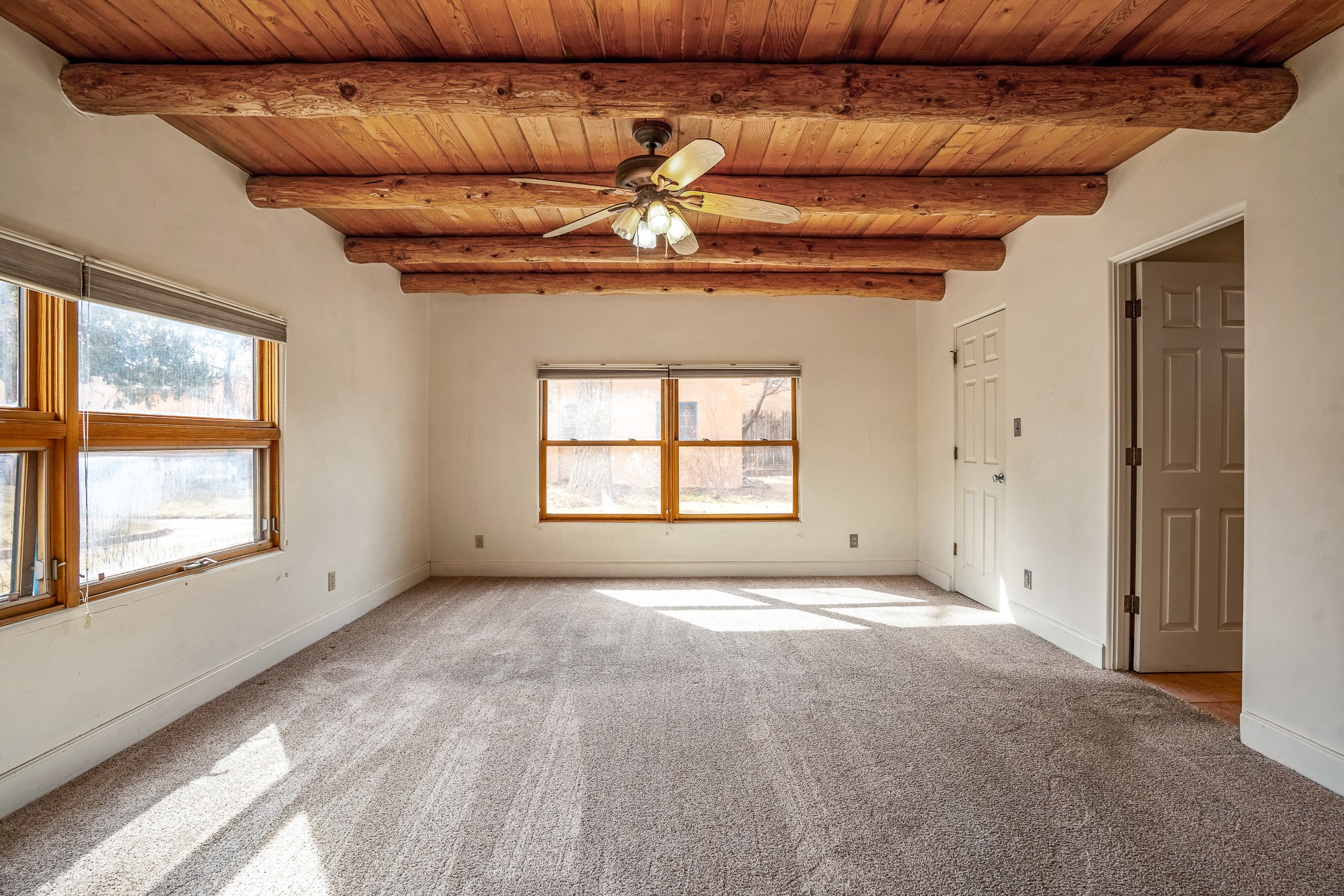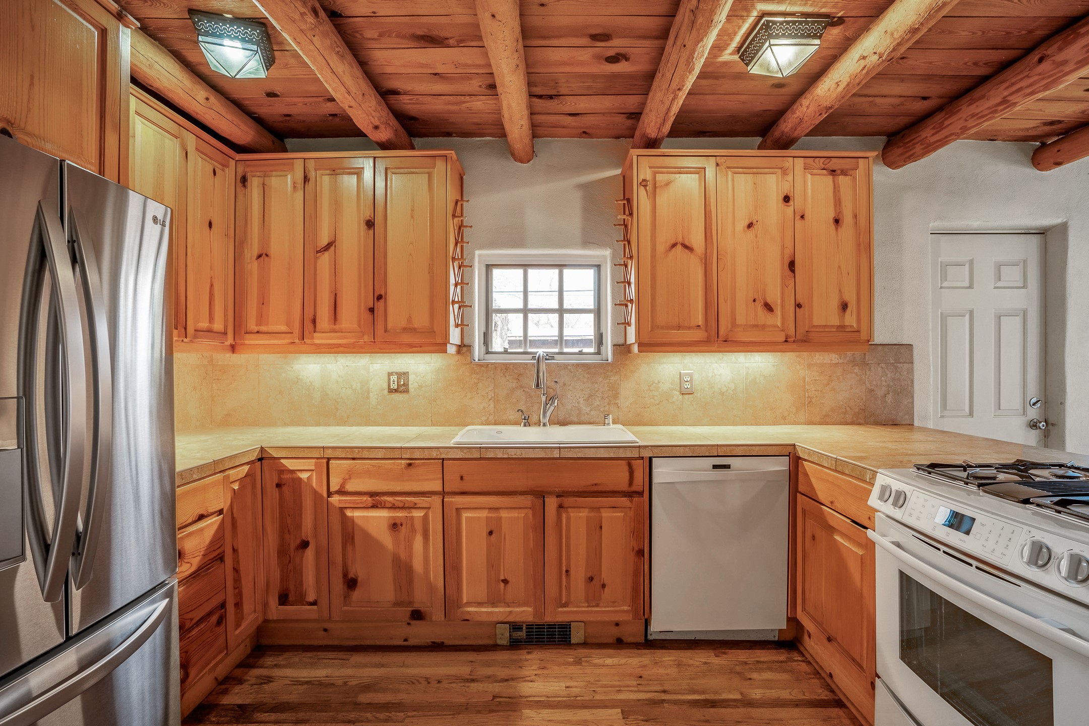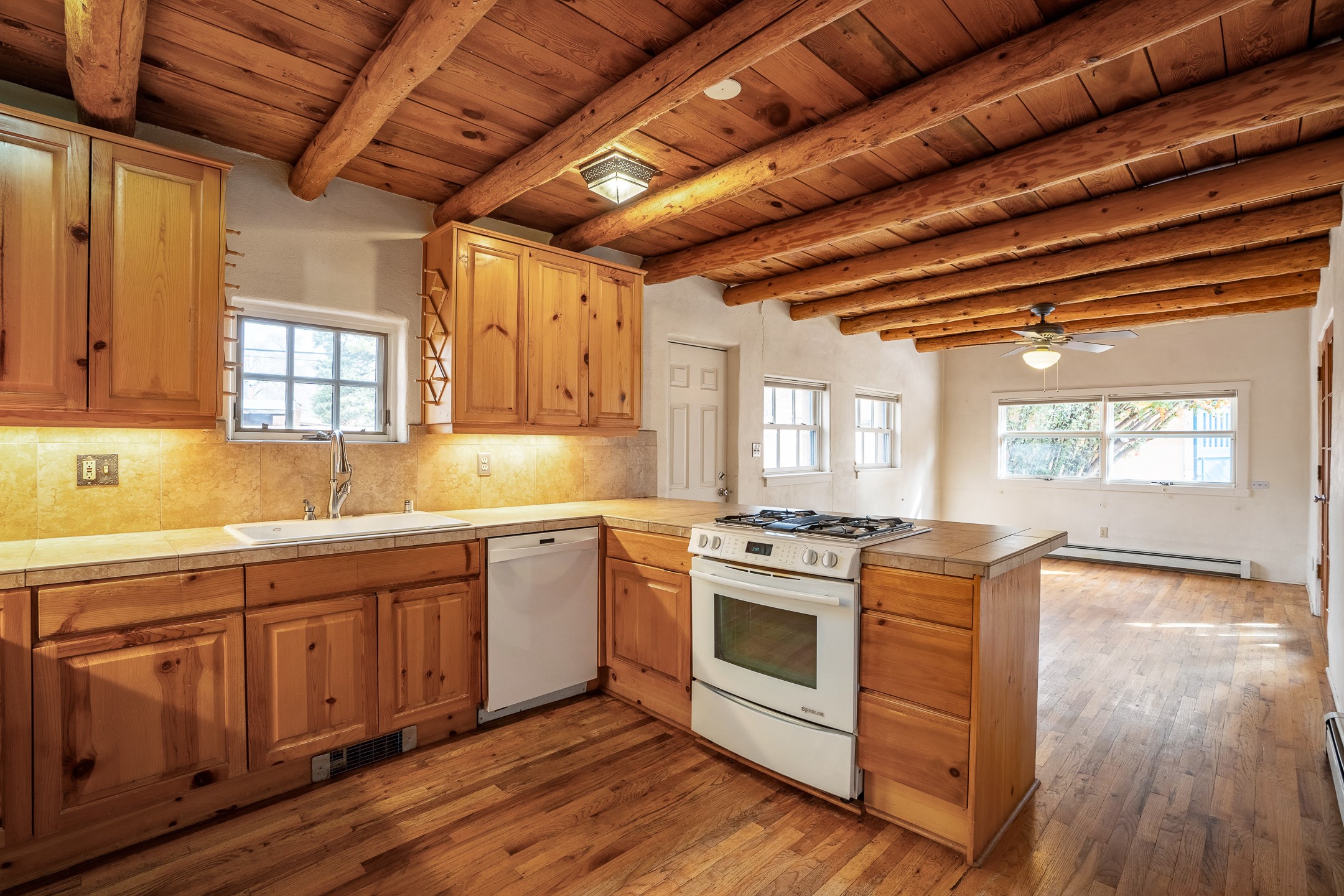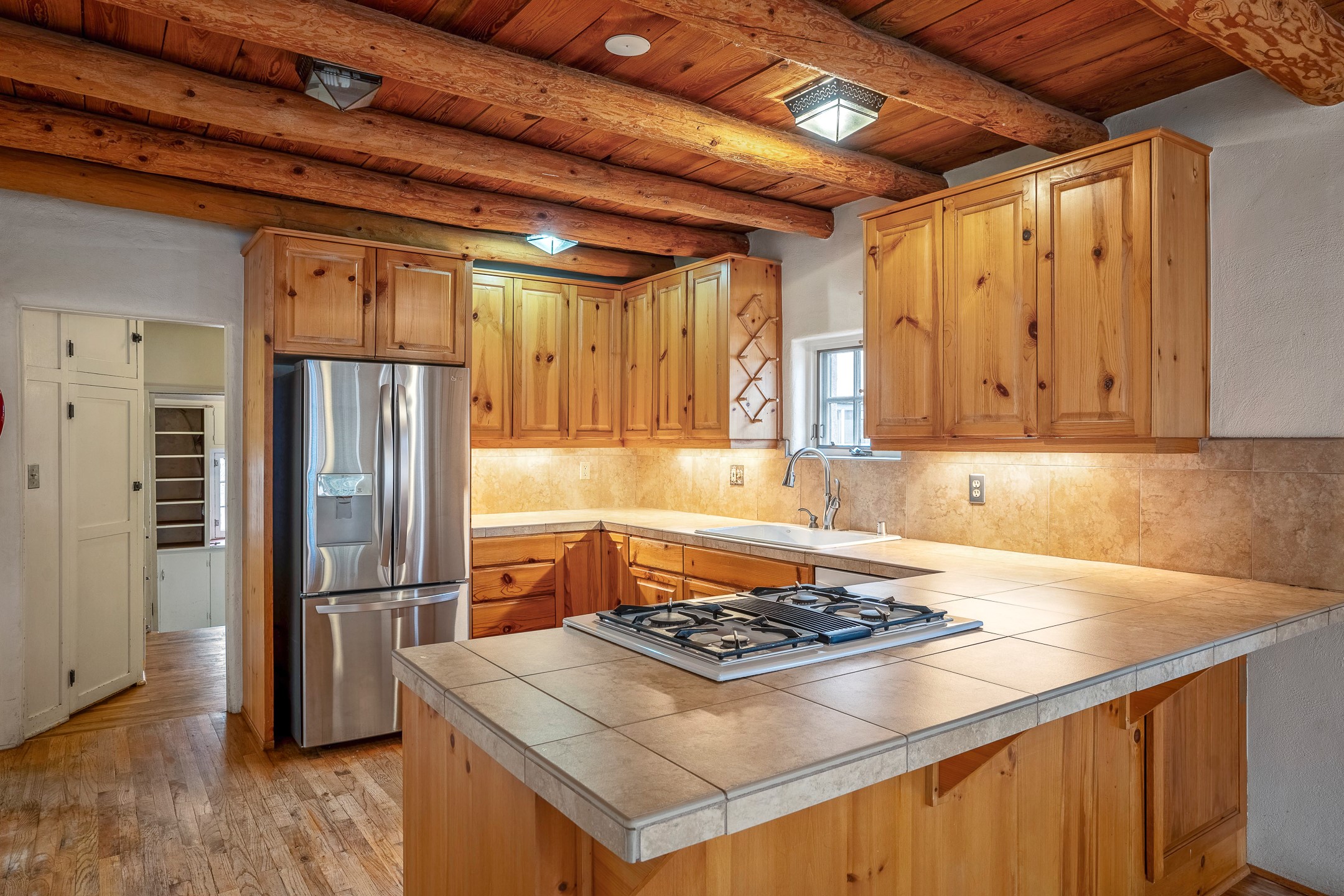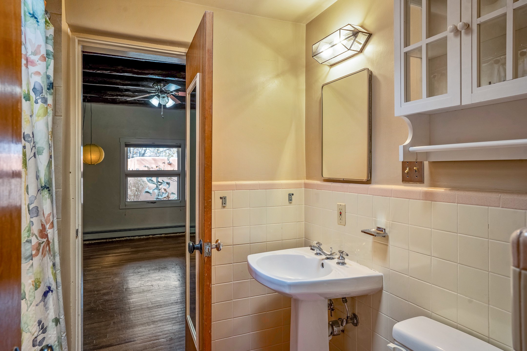 Located at the end of Santa Fe's covetable and quiet Delgado Lane, yet in the "center of it all", lies this incredibly rare find -hitting the market for the first time since its construction in the 1920s. Poised on an expansive .4-acre lot, this opportunity offers the perfect combination of Santa Fe charm and tranquility paired with the best of Santa Fe at your fingertips. The adobe 3BD-2.5BA main house exudes classic pueblo style architecture, viga ceilings, wood floors, and charming wood burning fireplaces. The 1BD-1BA detached guest house, added in the 1990s, offers a well equipped kitchen, its own laundry, and is privately sited offering a comfortable space for visitors and friends, or presents an interesting income generating opportunity. The property's captivating grounds are equally impressive. A true gardener's paradise, the lot is adorned with apple, apricot, pear, nectarine, and cherry trees, as well as mature cottonwood and pine trees. Colorful rose bushes (some of which are circa 80 years old) and peonies also decorate the gardens. The grounds benefit from water drawn from the property's private well (irrigation only), sprinkler system and drip irrigation are already in-place. Located steps away from Acequia Madre and Canyon Road, known for its world-class galleries and dining options, this is an exceptional opportunity to own and reimagine a slice of Santa Fe's rich history. A remarkable melding of privacy, outdoor beauty, space to entertain, and easy access to the heart of the city, this is a canvas that rarely becomes available.