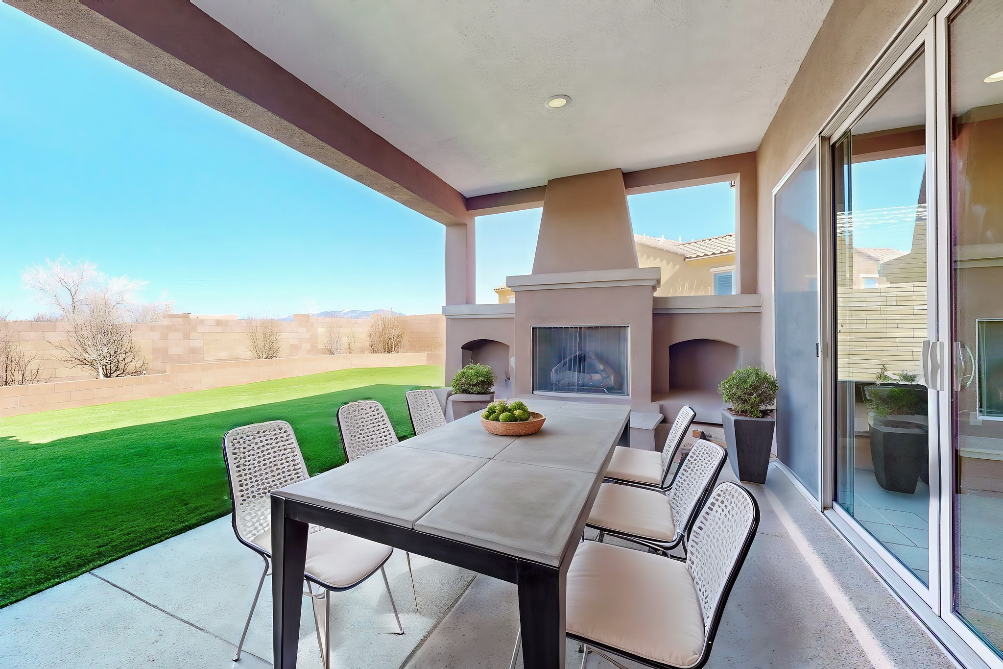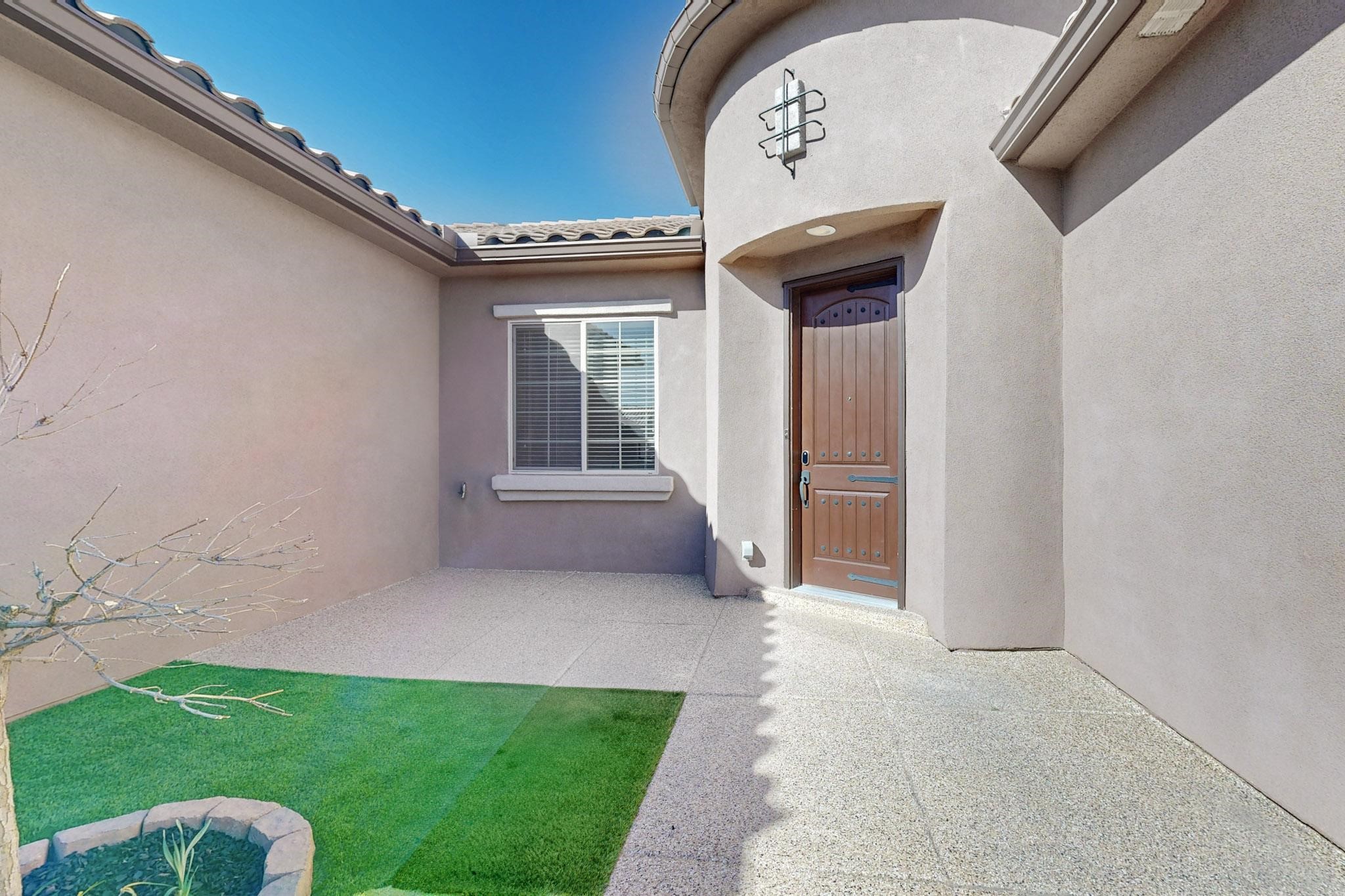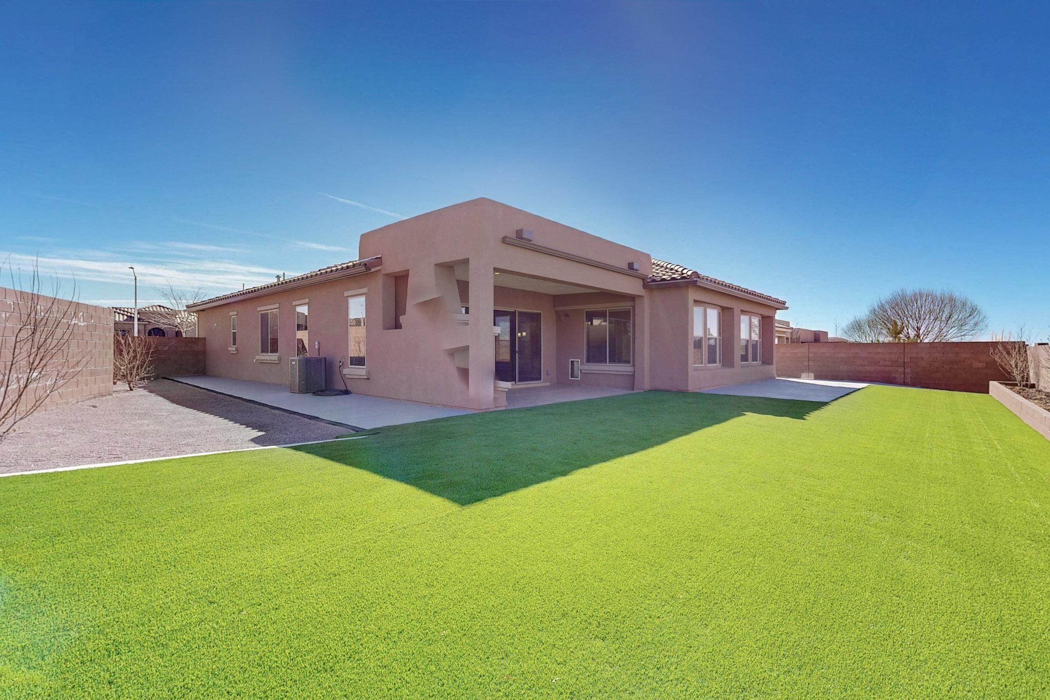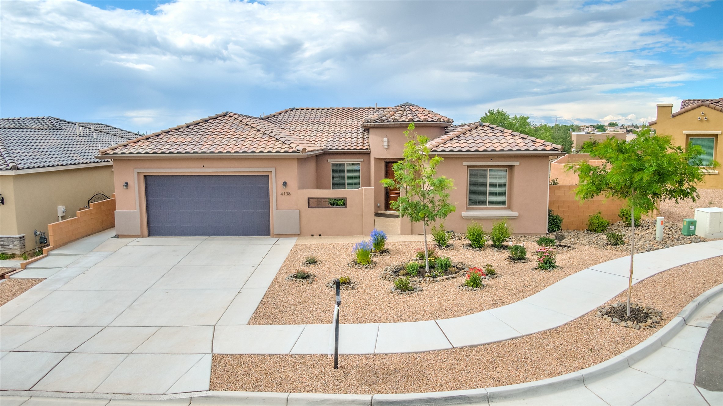 Welcome to your dream home in the highly sought-after Estancias de Las Soleras subdivision of Santa Fe. This immaculate, move-in-ready Pulte-built home is designed with Pulte's popular Serenity Floor Plan and sits on a premium lot with breathtaking mountain views. Every detail has been thoughtfully upgraded to offer the perfect blend of comfort and luxury. Conveniently situated near shopping centers, schools, dining options, and medical facilities, with quick access to the freeway, this home offers both convenience and tranquility. Enjoy the convenience of having a wide array of amenities just moments away. The chef-inspired kitchen is equipped with high-end KitchenAid appliances, stunning granite countertops, a beautiful backsplash, and a large island that invites creativity for culinary enthusiasts. The primary bedroom features bow windows that let in abundant natural light, offering panoramic views that make the space even more luxurious. The home also includes a versatile den with elegant French doors that could easily be transformed into a fourth bedroom, game room, art studio, or additional living space--endless possibilities. Throughout the home, you'll find upgraded cabinets, flooring, and a custom entry door with Nest locks, all contributing to a modern, sophisticated aesthetic. Outside, the beautifully landscaped front and back yards are highlighted by over 500 bulbs, perennial plants, trees, and shrubs. A wrap-around concrete walkway leads to a private courtyard with 6-foot walls, perfect for relaxation or entertaining guests. The home's exterior features a gas fireplace, a gas stub for BBQs, and an artificial turf entryway with a hydrangea tree. Additional features include comfort-height toilets, upgraded carpet and tile flooring, 2" faux wood blinds, and an epoxy-coated garage with a 4-foot extension, utility sink, and premium flooring. The Rinnai tankless water heater with a programmable timer ensures energy efficiency, while the home's thoughtful design and attention to detail provide comfort and style throughout. The backyard backs onto a vast open space, offering privacy and uninterrupted views--ideal for walks and enjoying Santa Fe's natural beauty. This stunning property offers the ideal blend of elegance, convenience, and luxury. Don't miss your chance to own this rare gem--schedule a private showing today and make 2025 the year you begin your next chapter in the home of your dreams. Some photos are virtually staged, while others were taken at different times to showcase the plants in bloom.