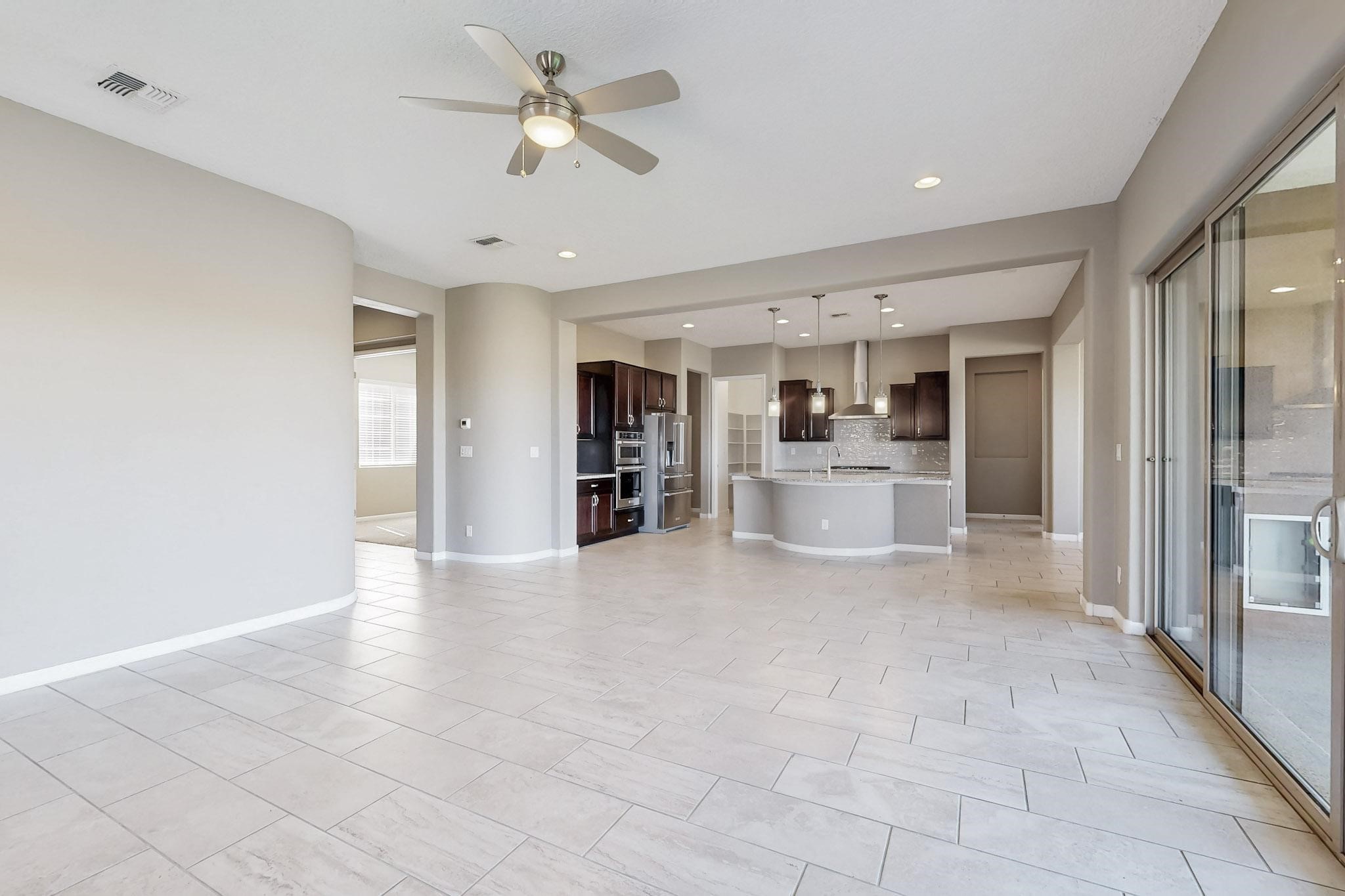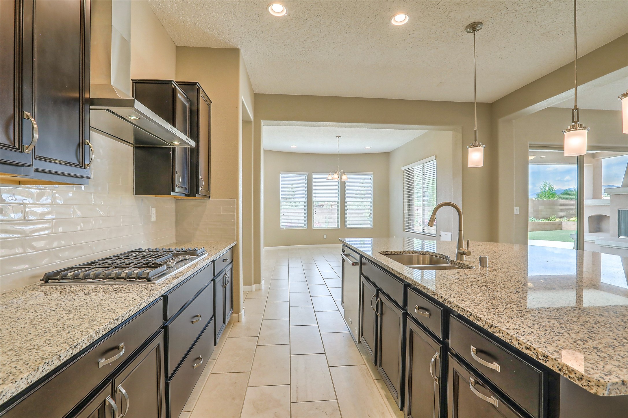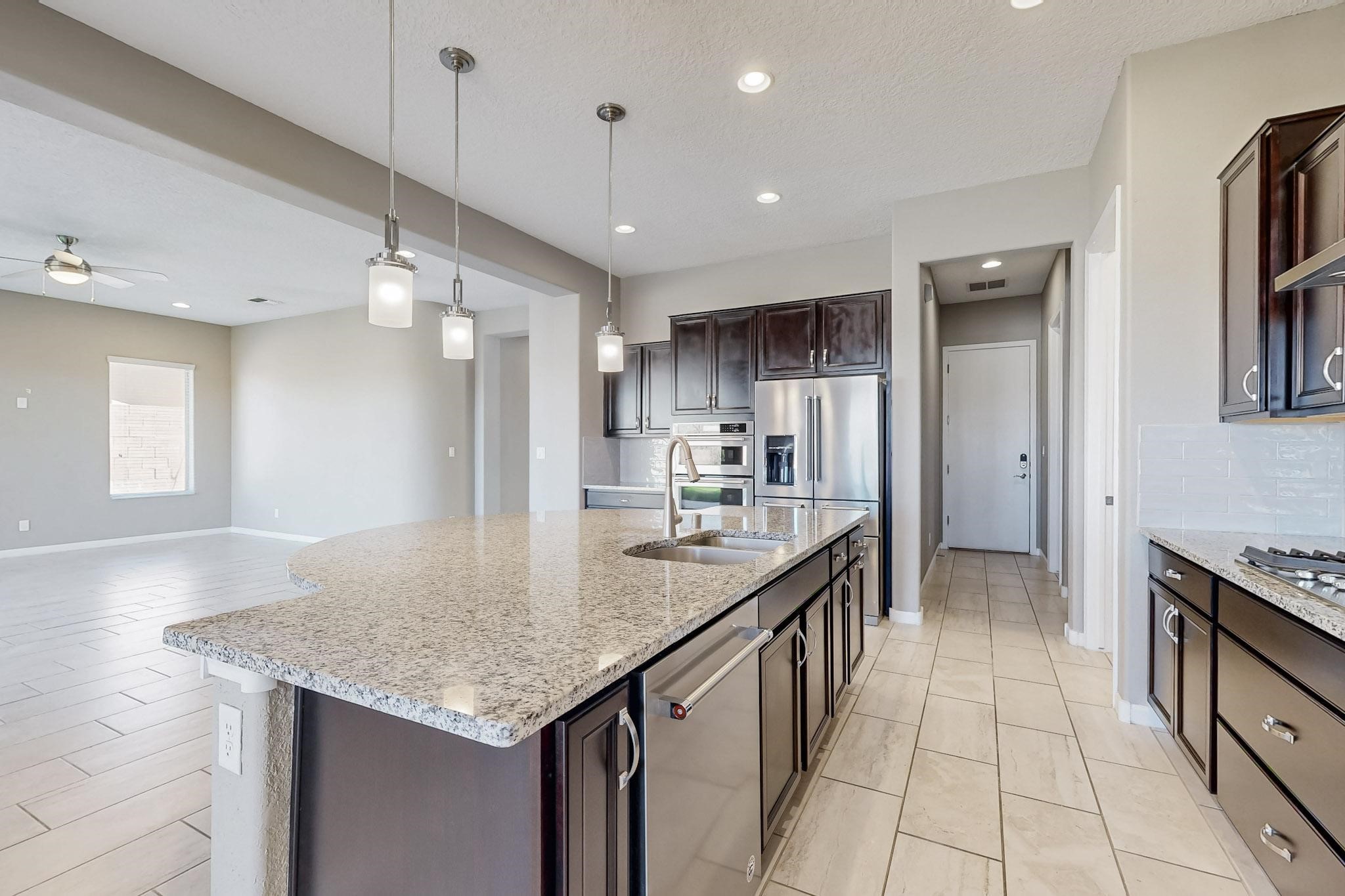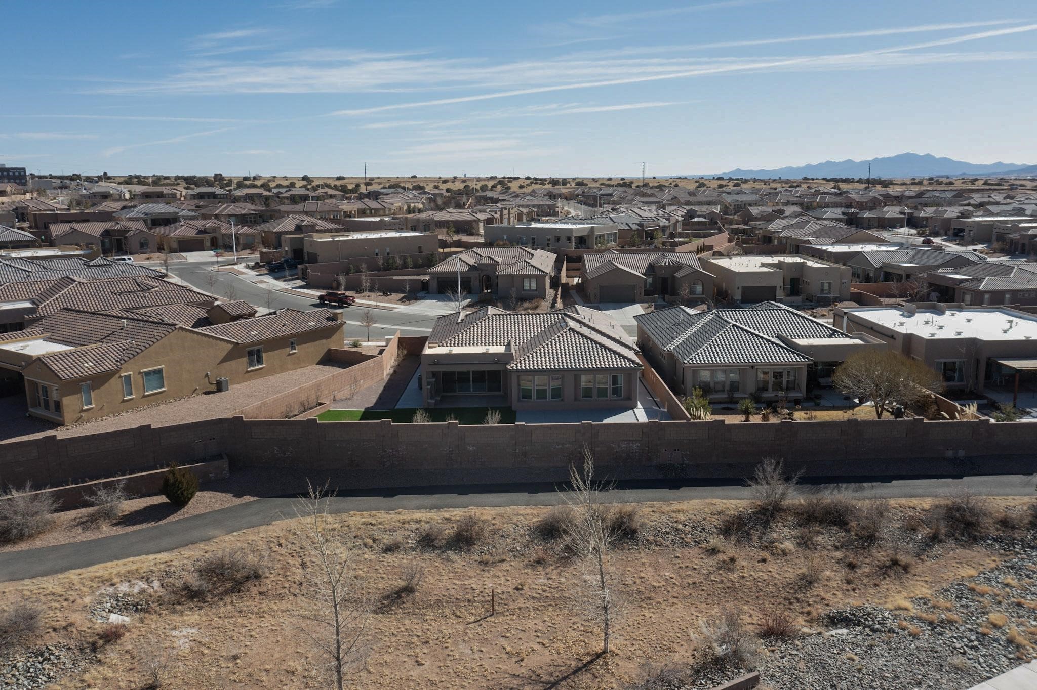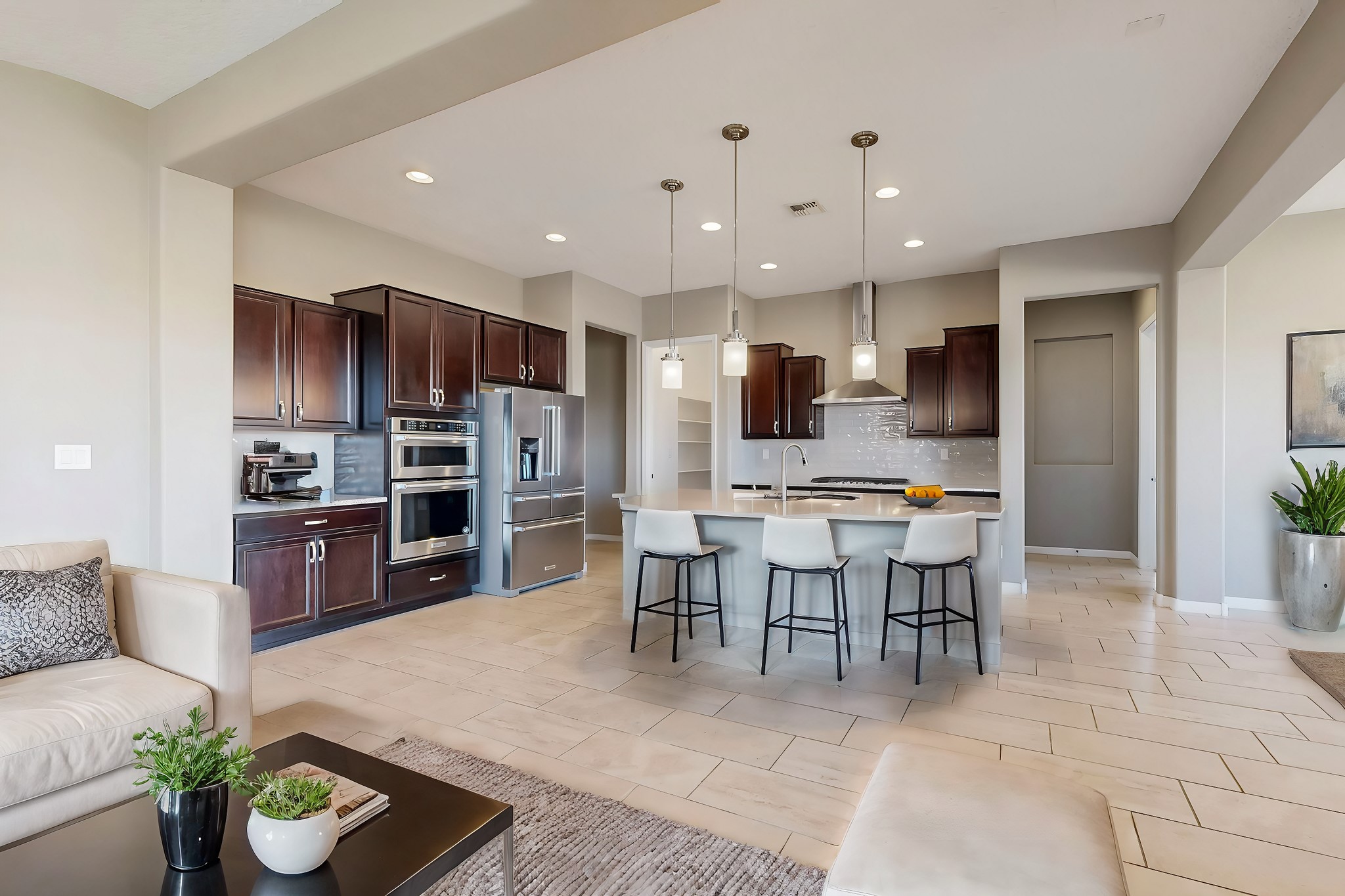 Welcome to your dream home in the highly sought-after Estancias de Las Soleras subdivision of Santa Fe. This immaculate, move-in-ready Pulte-built home is designed with Pulte's popular Serenity Floor Plan and sits on a premium lot with breathtaking mountain views. Every detail has been thoughtfully upgraded to offer the perfect blend of comfort and luxury. Conveniently situated near shopping centers, schools, dining options, and medical facilities, with quick access to the freeway, this home offers both convenience and tranquility. Enjoy the convenience of having a wide array of amenities just moments away. The chef-inspired kitchen is equipped with high-end KitchenAid appliances, stunning granite countertops, a beautiful backsplash, and a large island that invites creativity for culinary enthusiasts. The primary bedroom features bow windows that let in abundant natural light, offering panoramic views that make the space even more luxurious. The home also includes a versatile den with elegant French doors that could easily be transformed into a fourth bedroom, game room, art studio, or additional living space--endless possibilities. Throughout the home, you'll find upgraded cabinets, flooring, and a custom entry door with Nest locks, all contributing to a modern, sophisticated aesthetic. Outside, the beautifully landscaped front and back yards are highlighted by over 500 bulbs, perennial plants, trees, and shrubs. A wrap-around concrete walkway leads to a private courtyard with 6-foot walls, perfect for relaxation or entertaining guests. The home's exterior features a gas fireplace, a gas stub for BBQs, and an artificial turf entryway with a hydrangea tree. Additional features include comfort-height toilets, upgraded carpet and tile flooring, 2" faux wood blinds, and an epoxy-coated garage with a 4-foot extension, utility sink, and premium flooring. The Rinnai tankless water heater with a programmable timer ensures energy efficiency, while the home's thoughtful design and attention to detail provide comfort and style throughout. The backyard backs onto a vast open space, offering privacy and uninterrupted views--ideal for walks and enjoying Santa Fe's natural beauty. This stunning property offers the ideal blend of elegance, convenience, and luxury. Don't miss your chance to own this rare gem--schedule a private showing today and make 2025 the year you begin your next chapter in the home of your dreams. Some photos are virtually staged, while others were taken at different times to showcase the plants in bloom.