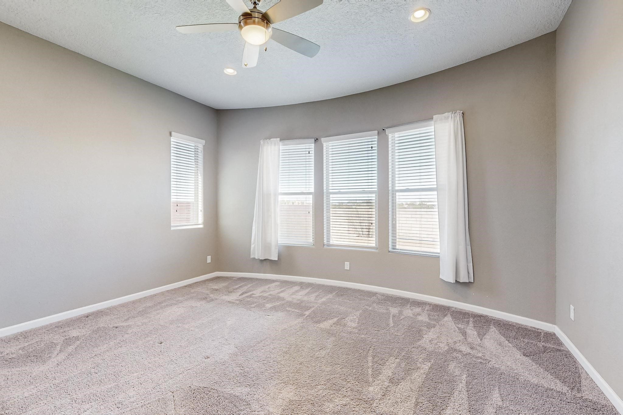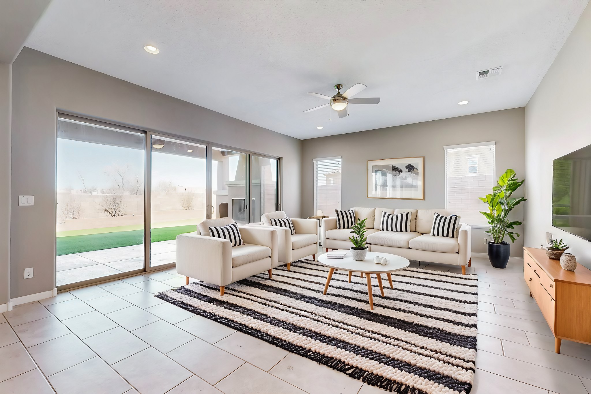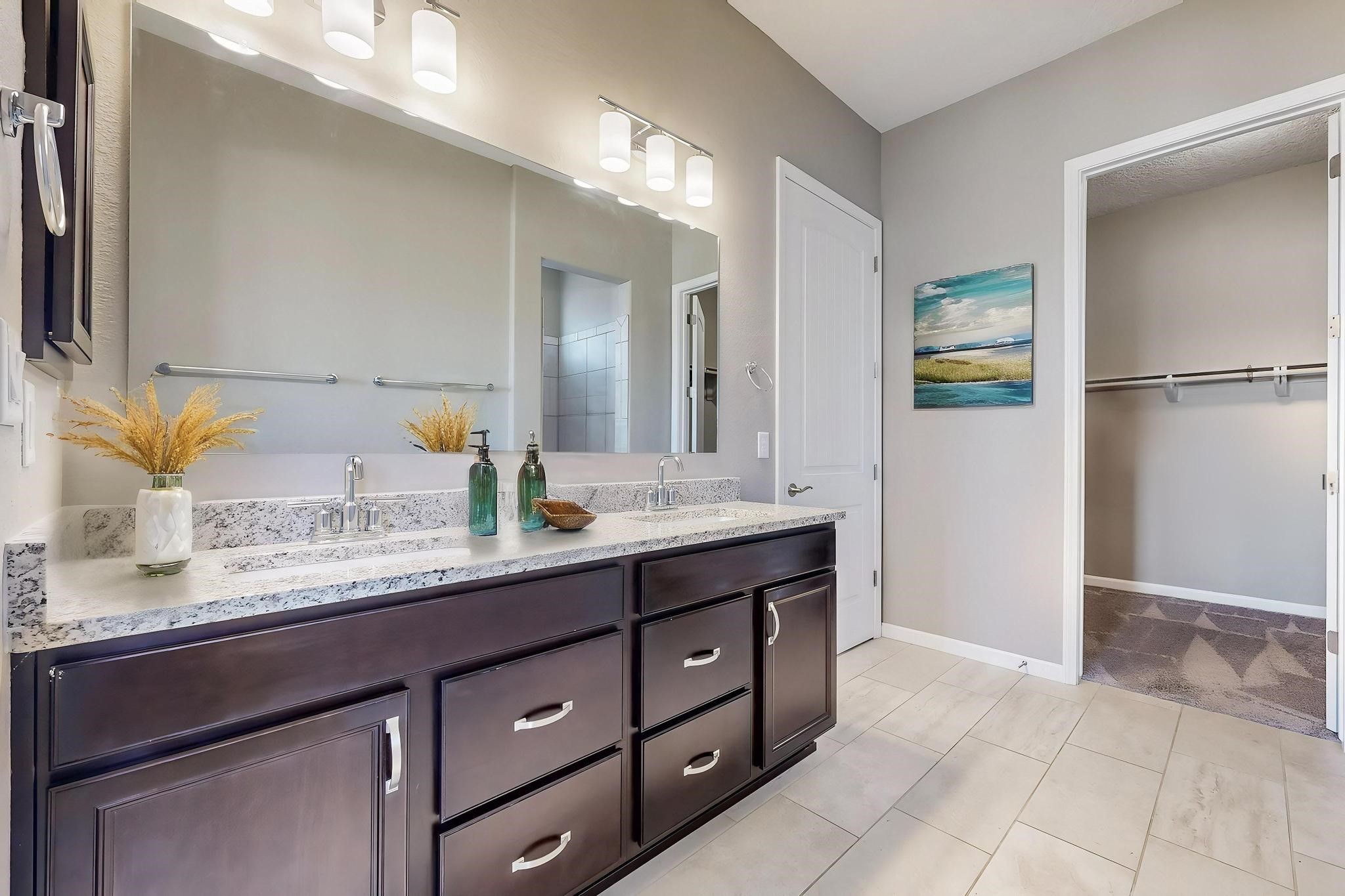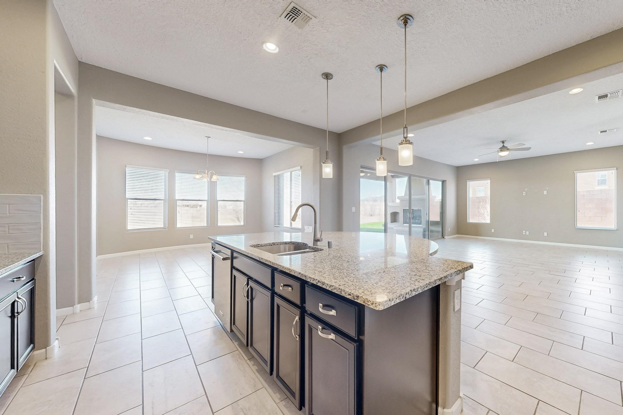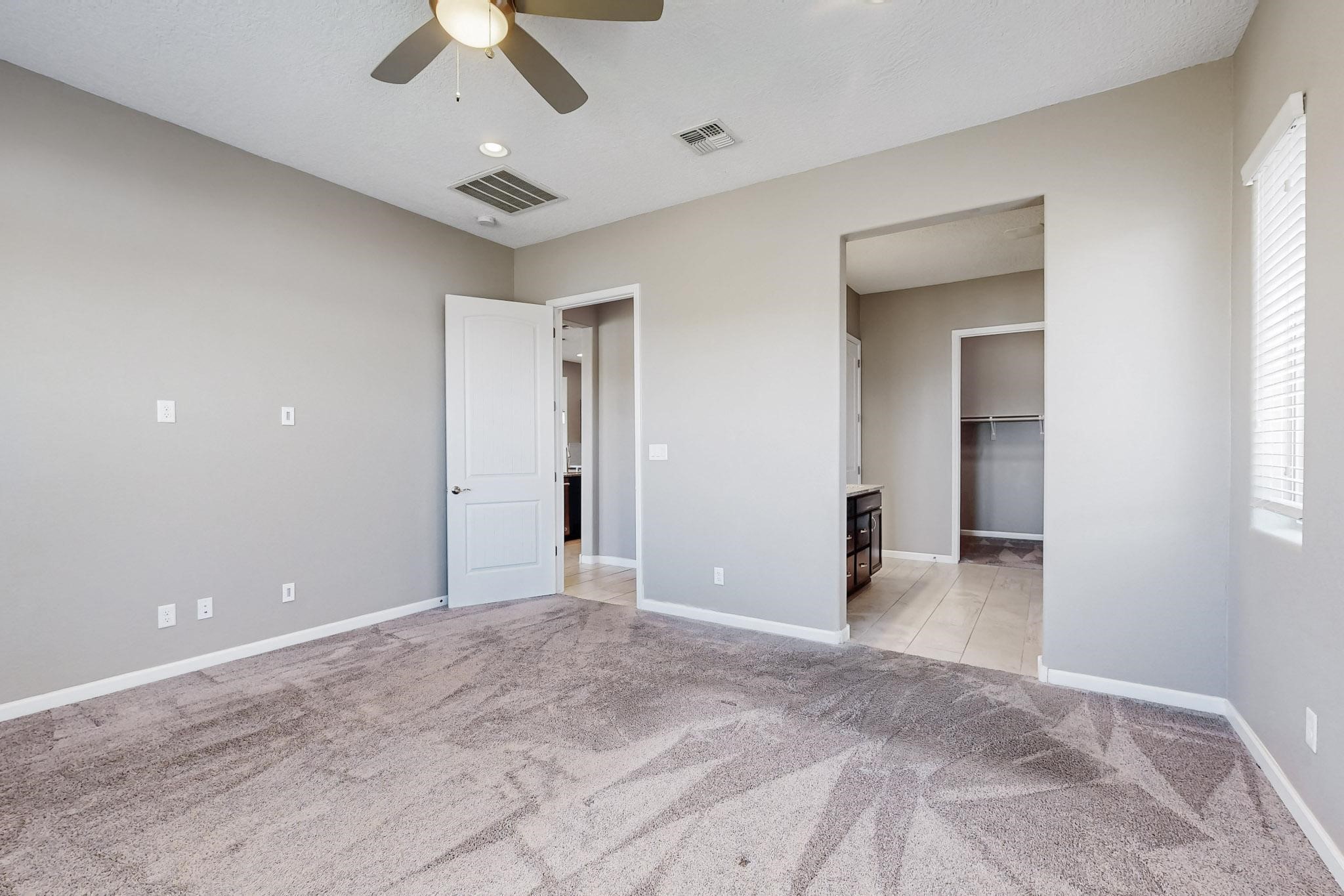 Welcome to your dream home in the highly sought-after Estancias de Las Soleras subdivision of Santa Fe. This immaculate, move-in-ready Pulte-built home is designed with Pulte's popular Serenity Floor Plan and sits on a premium lot with breathtaking mountain views. Every detail has been thoughtfully upgraded to offer the perfect blend of comfort and luxury. Conveniently situated near shopping centers, schools, dining options, and medical facilities, with quick access to the freeway, this home offers both convenience and tranquility. Enjoy the convenience of having a wide array of amenities just moments away. The chef-inspired kitchen is equipped with high-end KitchenAid appliances, stunning granite countertops, a beautiful backsplash, and a large island that invites creativity for culinary enthusiasts. The primary bedroom features bow windows that let in abundant natural light, offering panoramic views that make the space even more luxurious. The home also includes a versatile den with elegant French doors that could easily be transformed into a fourth bedroom, game room, art studio, or additional living space--endless possibilities. Throughout the home, you'll find upgraded cabinets, flooring, and a custom entry door with Nest locks, all contributing to a modern, sophisticated aesthetic. Outside, the beautifully landscaped front and back yards are highlighted by over 500 bulbs, perennial plants, trees, and shrubs. A wrap-around concrete walkway leads to a private courtyard with 6-foot walls, perfect for relaxation or entertaining guests. The home's exterior features a gas fireplace, a gas stub for BBQs, and an artificial turf entryway with a hydrangea tree. Additional features include comfort-height toilets, upgraded carpet and tile flooring, 2" faux wood blinds, and an epoxy-coated garage with a 4-foot extension, utility sink, and premium flooring. The Rinnai tankless water heater with a programmable timer ensures energy efficiency, while the home's thoughtful design and attention to detail provide comfort and style throughout. The backyard backs onto a vast open space, offering privacy and uninterrupted views--ideal for walks and enjoying Santa Fe's natural beauty. This stunning property offers the ideal blend of elegance, convenience, and luxury. Don't miss your chance to own this rare gem--schedule a private showing today and make 2025 the year you begin your next chapter in the home of your dreams. Some photos are virtually staged, while others were taken at different times to showcase the plants in bloom.