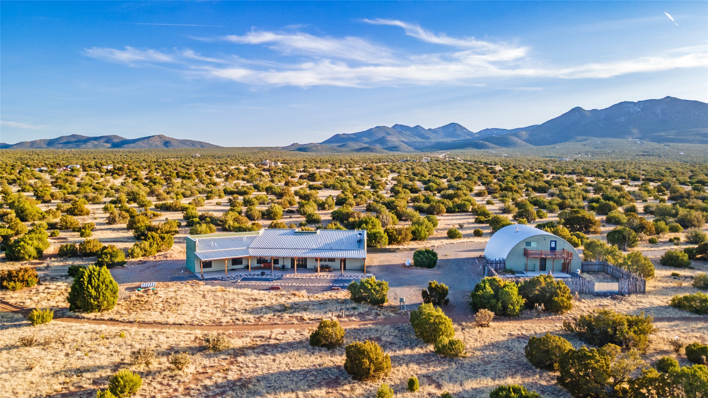 This stunning 3 bedroom, 4 bath sanctuary boasts 42 serene acres situated at the foot of the rugged Ortiz mountains with drop dead gorgeous views of the Sangre de Cristos. High ceilings and an open concept kitchen/living area accented with beam ceilings and Saltillo tiles provide the main dwelling with a cozy, yet spacious rustic elegance. High ceilings in the living and dining area flow beautifully to the expansive portal, making this an ideal home for entertaining.The tranquil primary bedroom boasts a large walk-in closet and an ensuite bathroom that features separate shower and tub. The split floor plan places the second and third bedrooms at the far end of the house creating nice separation between living areas.The quonset hut serves as two buildings in one. One portion is a guest suite, complete with bathroom, baseboard heating, wood burning stove, kitchenette, and a loft area great for rest or play (current owners found it ideal for rocking out on the drums and also hosting visitors). The other half is a massive garage, with high ceilings ideal for use as a shop or storage.Other features include a large laundry room, RV hookup, bocce court, and a mile-long walking loop around the grounds great for a leisurely stroll or an exciting dirt bike track!Your sanctuary awaits!! This stunning 3 bedroom, 4 bath property boasts 42 serene acres situated at the foot of the rugged Ortiz mountains with drop dead gorgeous views of the Sangre de Cristos. High ceilings and an open concept kitchen/living area accented with beam ceilings and Saltillo tiles provide the main dwelling with a cozy, yet spacious rustic elegance. High ceilings in the living and dining area flow beautifully to the expansive portal, making this an ideal home for entertaining.The tranquil primary bedroom boasts a large walk-in closet and an ensuite bathroom that features separate shower and tub. The split floor plan places the second and third bedrooms at the far end of the house creating nice separation between living areas.The quonset hut serves as two buildings in one. One portion is a guest suite, complete with bathroom, baseboard heating, wood burning stove, kitchenette, and a loft area great for rest or play (current owners found it ideal for rocking out on the drums and also hosting visitors). The other half is a massive garage, with high ceilings ideal for use as a shop or storage.Other features include a large laundry room, RV hookup, bocce court, and a mile-long walking loop around the grounds great for a leisurely stroll or an exciting dirt bike track!There is no well at the property. Property is priced to accommodate buyer installing a well if buyer desires.