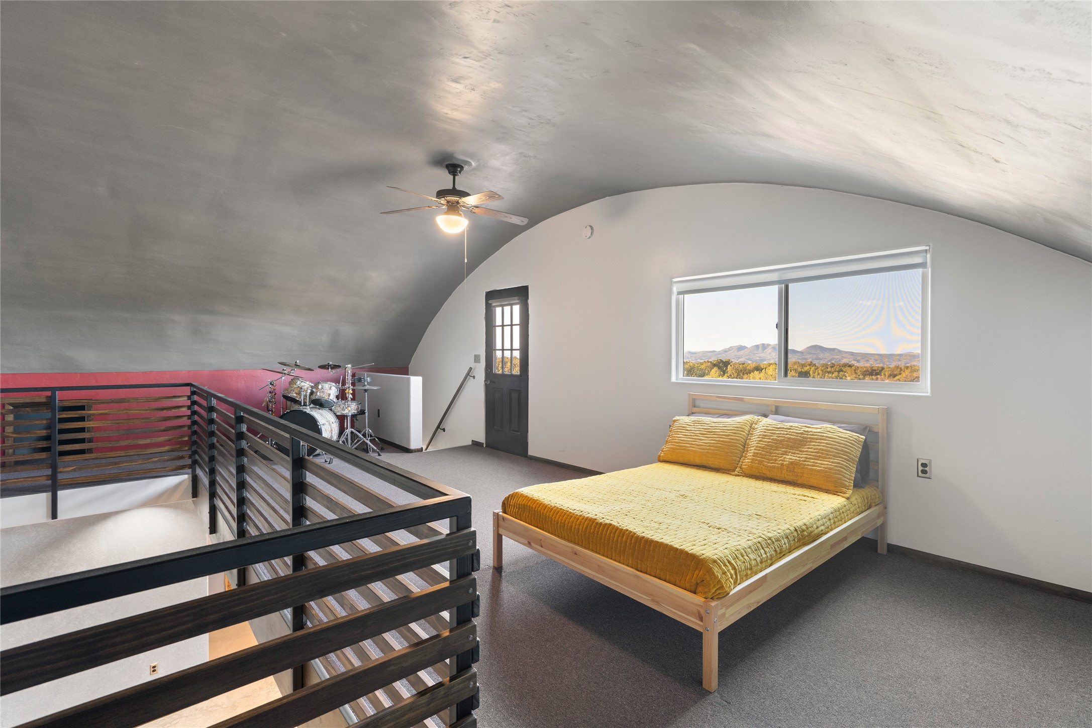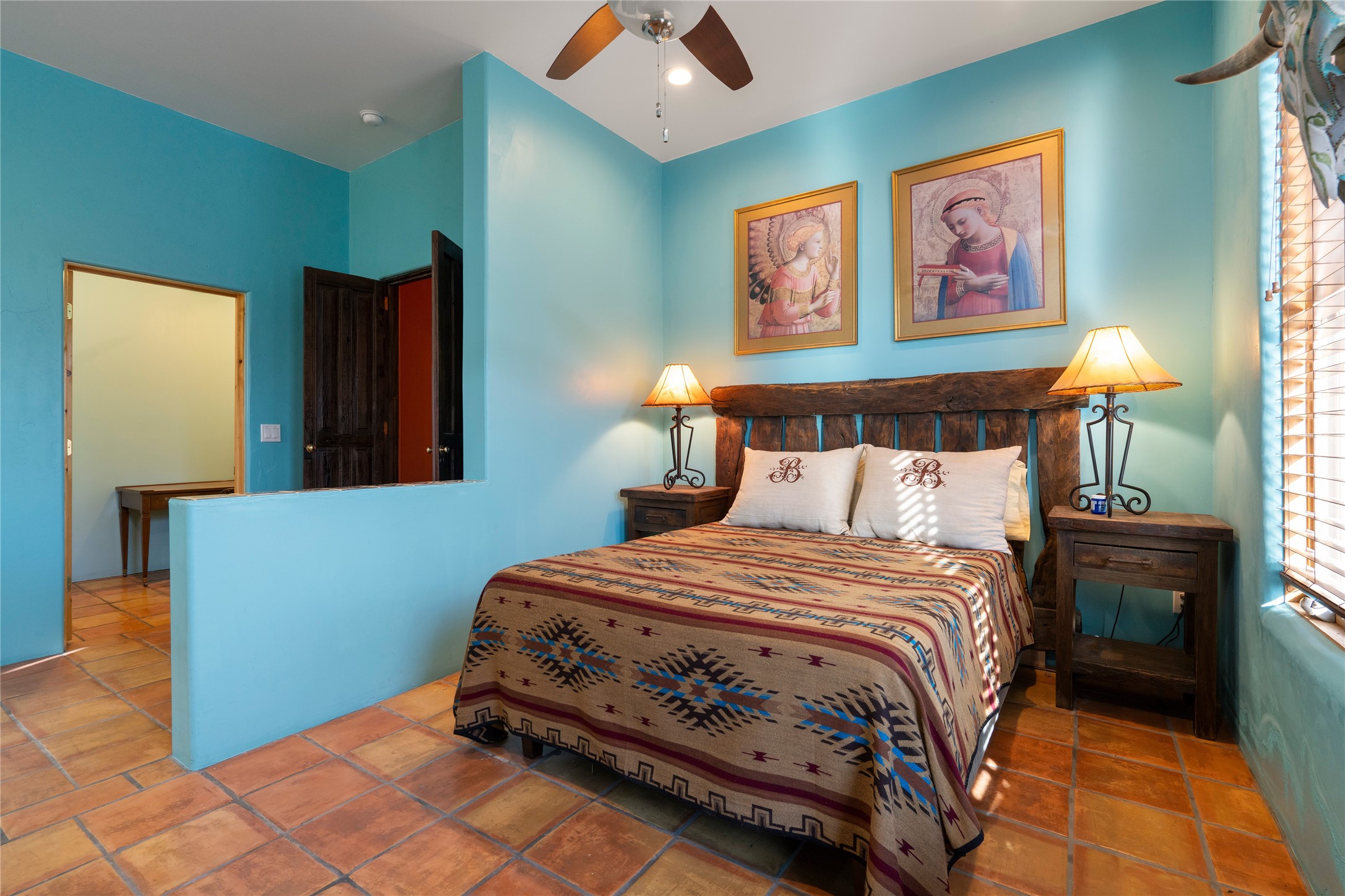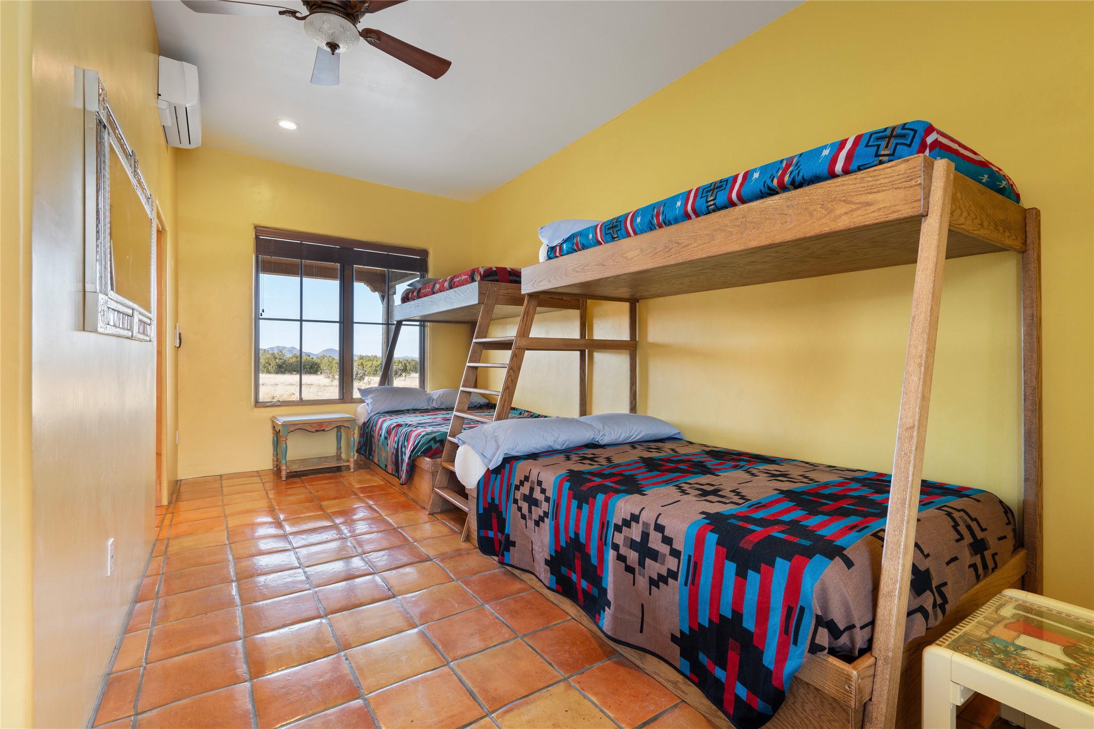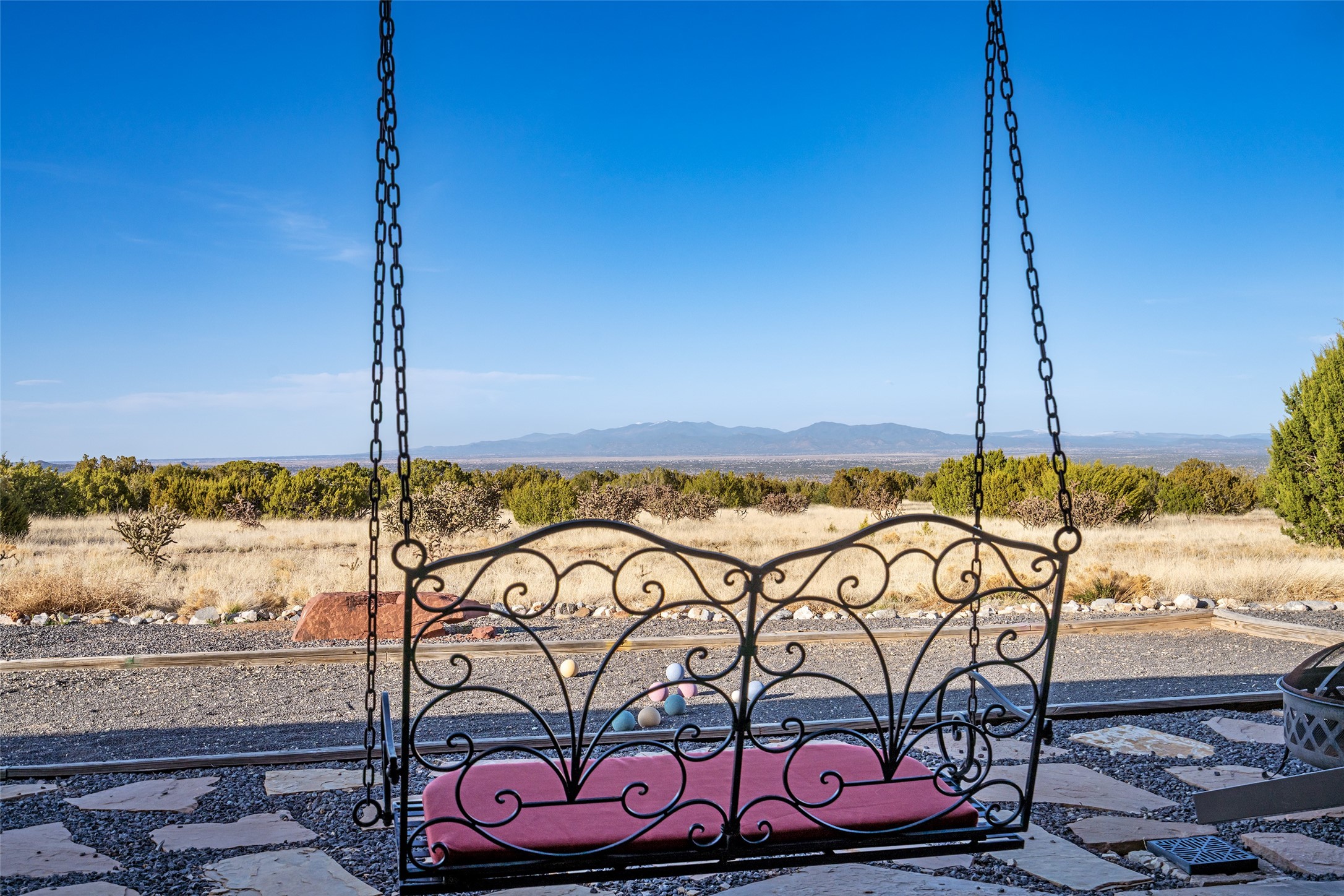 This stunning 3 bedroom, 4 bath sanctuary boasts 42 serene acres situated at the foot of the rugged Ortiz mountains with drop dead gorgeous views of the Sangre de Cristos. High ceilings and an open concept kitchen/living area accented with beam ceilings and Saltillo tiles provide the main dwelling with a cozy, yet spacious rustic elegance. High ceilings in the living and dining area flow beautifully to the expansive portal, making this an ideal home for entertaining.The tranquil primary bedroom boasts a large walk-in closet and an ensuite bathroom that features separate shower and tub. The split floor plan places the second and third bedrooms at the far end of the house creating nice separation between living areas.The quonset hut serves as two buildings in one. One portion is a guest suite, complete with bathroom, baseboard heating, wood burning stove, kitchenette, and a loft area great for rest or play (current owners found it ideal for rocking out on the drums and also hosting visitors). The other half is a massive garage, with high ceilings ideal for use as a shop or storage.Other features include a large laundry room, RV hookup, bocce court, and a mile-long walking loop around the grounds great for a leisurely stroll or an exciting dirt bike track!Your sanctuary awaits!! This stunning 3 bedroom, 4 bath property boasts 42 serene acres situated at the foot of the rugged Ortiz mountains with drop dead gorgeous views of the Sangre de Cristos. High ceilings and an open concept kitchen/living area accented with beam ceilings and Saltillo tiles provide the main dwelling with a cozy, yet spacious rustic elegance. High ceilings in the living and dining area flow beautifully to the expansive portal, making this an ideal home for entertaining.The tranquil primary bedroom boasts a large walk-in closet and an ensuite bathroom that features separate shower and tub. The split floor plan places the second and third bedrooms at the far end of the house creating nice separation between living areas.The quonset hut serves as two buildings in one. One portion is a guest suite, complete with bathroom, baseboard heating, wood burning stove, kitchenette, and a loft area great for rest or play (current owners found it ideal for rocking out on the drums and also hosting visitors). The other half is a massive garage, with high ceilings ideal for use as a shop or storage.Other features include a large laundry room, RV hookup, bocce court, and a mile-long walking loop around the grounds great for a leisurely stroll or an exciting dirt bike track!There is no well at the property. Property is priced to accommodate buyer installing a well if buyer desires.