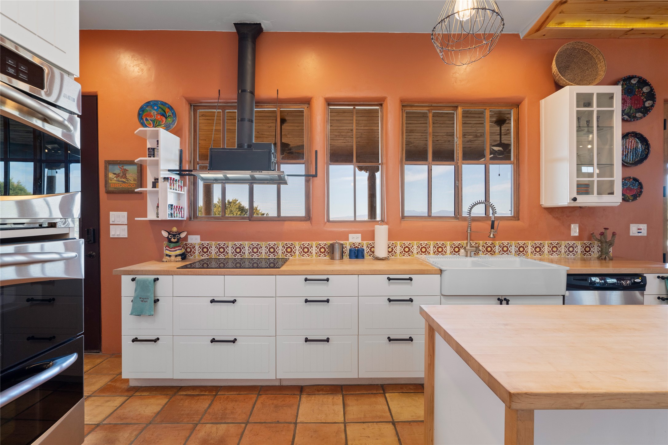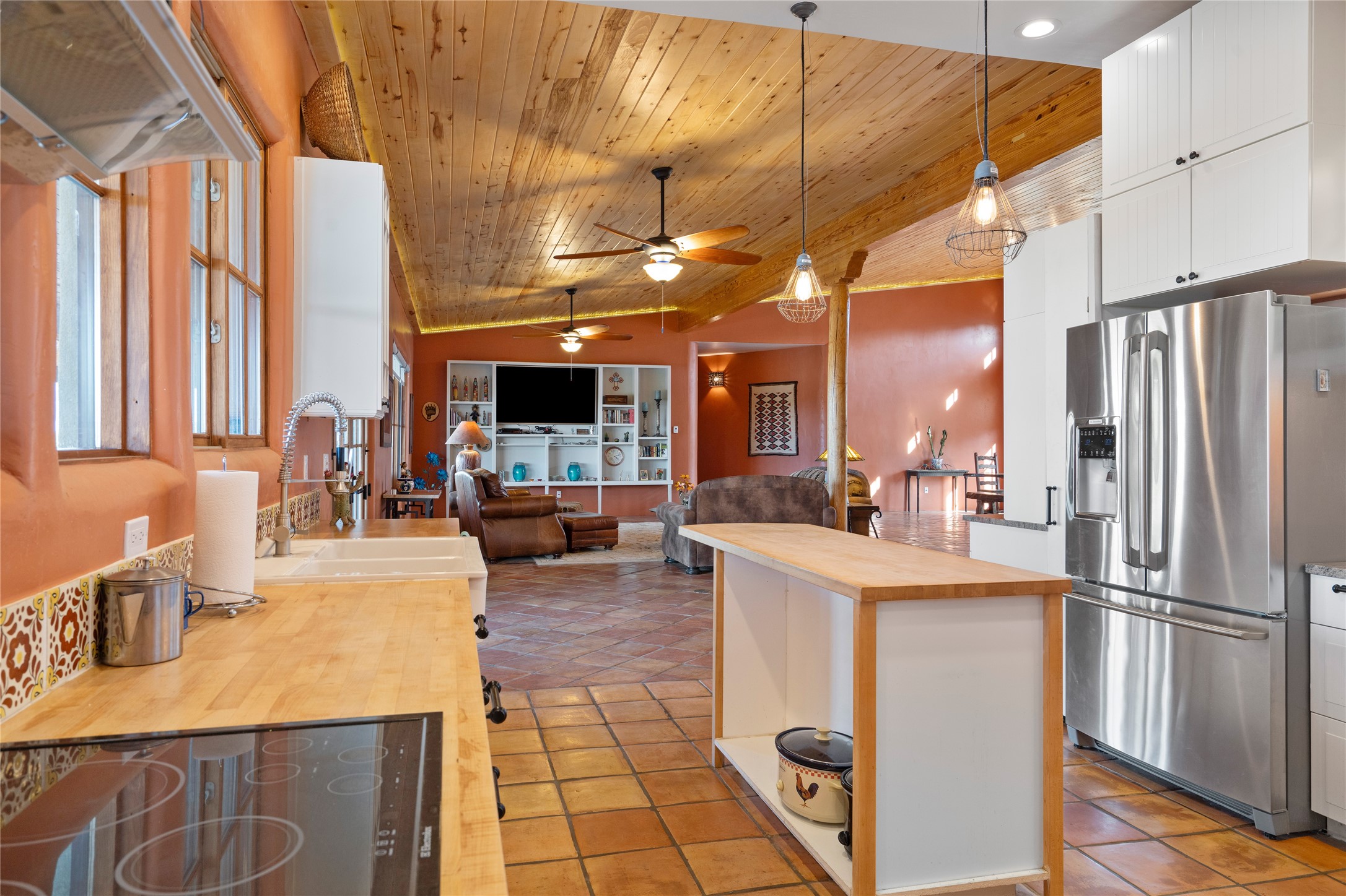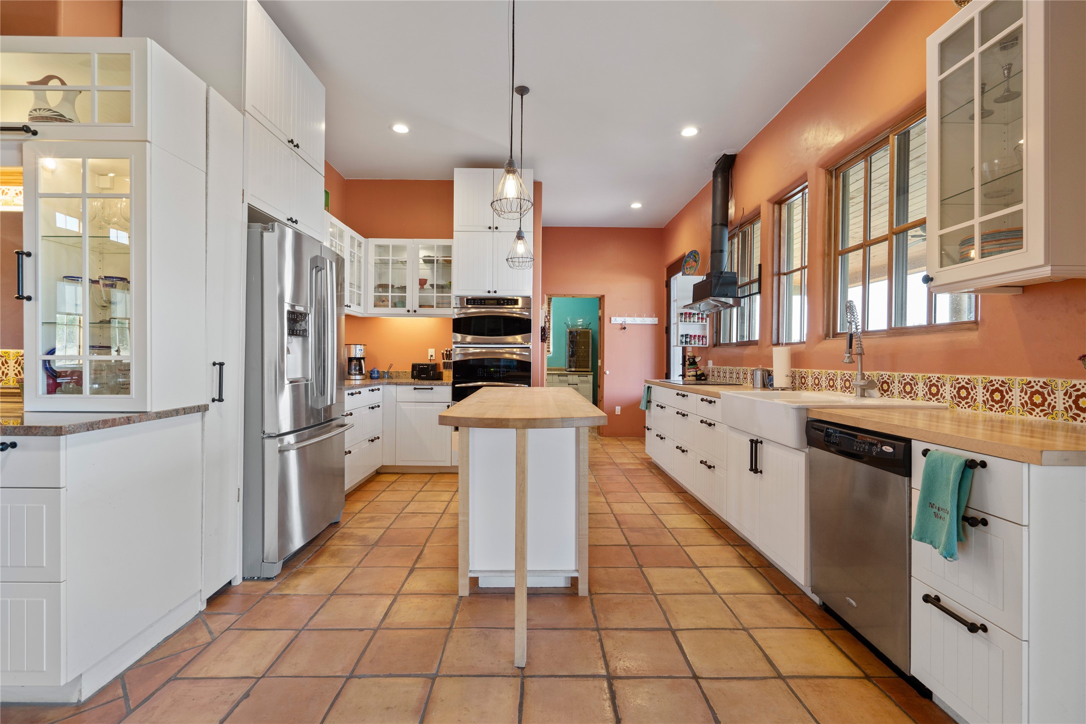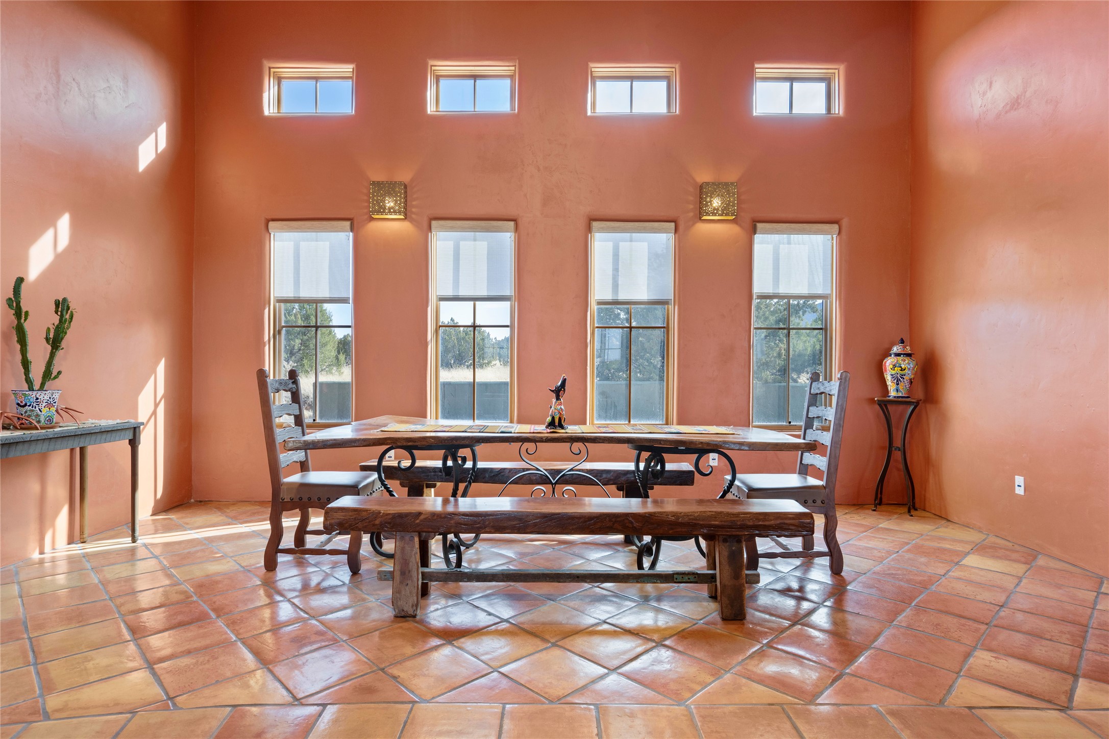 This stunning 3 bedroom, 4 bath sanctuary boasts 42 serene acres situated at the foot of the rugged Ortiz mountains with drop dead gorgeous views of the Sangre de Cristos. High ceilings and an open concept kitchen/living area accented with beam ceilings and Saltillo tiles provide the main dwelling with a cozy, yet spacious rustic elegance. High ceilings in the living and dining area flow beautifully to the expansive portal, making this an ideal home for entertaining.The tranquil primary bedroom boasts a large walk-in closet and an ensuite bathroom that features separate shower and tub. The split floor plan places the second and third bedrooms at the far end of the house creating nice separation between living areas.The quonset hut serves as two buildings in one. One portion is a guest suite, complete with bathroom, baseboard heating, wood burning stove, kitchenette, and a loft area great for rest or play (current owners found it ideal for rocking out on the drums and also hosting visitors). The other half is a massive garage, with high ceilings ideal for use as a shop or storage.Other features include a large laundry room, RV hookup, bocce court, and a mile-long walking loop around the grounds great for a leisurely stroll or an exciting dirt bike track!Your sanctuary awaits!! This stunning 3 bedroom, 4 bath property boasts 42 serene acres situated at the foot of the rugged Ortiz mountains with drop dead gorgeous views of the Sangre de Cristos. High ceilings and an open concept kitchen/living area accented with beam ceilings and Saltillo tiles provide the main dwelling with a cozy, yet spacious rustic elegance. High ceilings in the living and dining area flow beautifully to the expansive portal, making this an ideal home for entertaining.The tranquil primary bedroom boasts a large walk-in closet and an ensuite bathroom that features separate shower and tub. The split floor plan places the second and third bedrooms at the far end of the house creating nice separation between living areas.The quonset hut serves as two buildings in one. One portion is a guest suite, complete with bathroom, baseboard heating, wood burning stove, kitchenette, and a loft area great for rest or play (current owners found it ideal for rocking out on the drums and also hosting visitors). The other half is a massive garage, with high ceilings ideal for use as a shop or storage.Other features include a large laundry room, RV hookup, bocce court, and a mile-long walking loop around the grounds great for a leisurely stroll or an exciting dirt bike track!There is no well at the property. Property is priced to accommodate buyer installing a well if buyer desires.