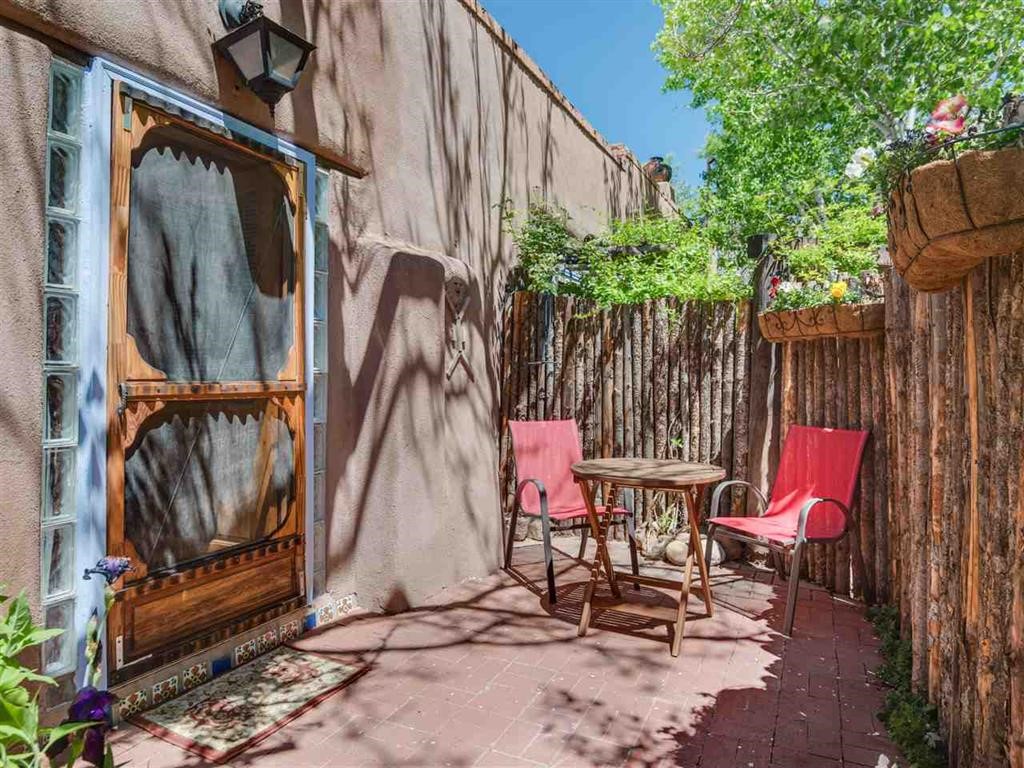 Back on the market - due to rental policy, not fault of sellers, this is your opportunity to own a charming fully furnished pied-a-terre in the gated Larribas Compound. This rare find is walking distance to the vibrant Railyard scene and the Historic Santa Fe Plaza. She packs a punch at just 352 sq feet but with a large basement that can be fashioned to your immediate needs. Other features include a private patio, hardwood floors, vibrant southwest colored walls and updated bath. Furnishings include a queen-sized sleeper sofa, twin overstuffed chair, and two-seater dining table. Unit T enjoys the lovely community features of Larribas Compound including the community garden, fountain, a dedicated parking space and private pedestrian gate and gated entrance. The COA covers community landscaping and roof maintenance. No short-term rentals allowed, dogs not permitted but cats are okay.