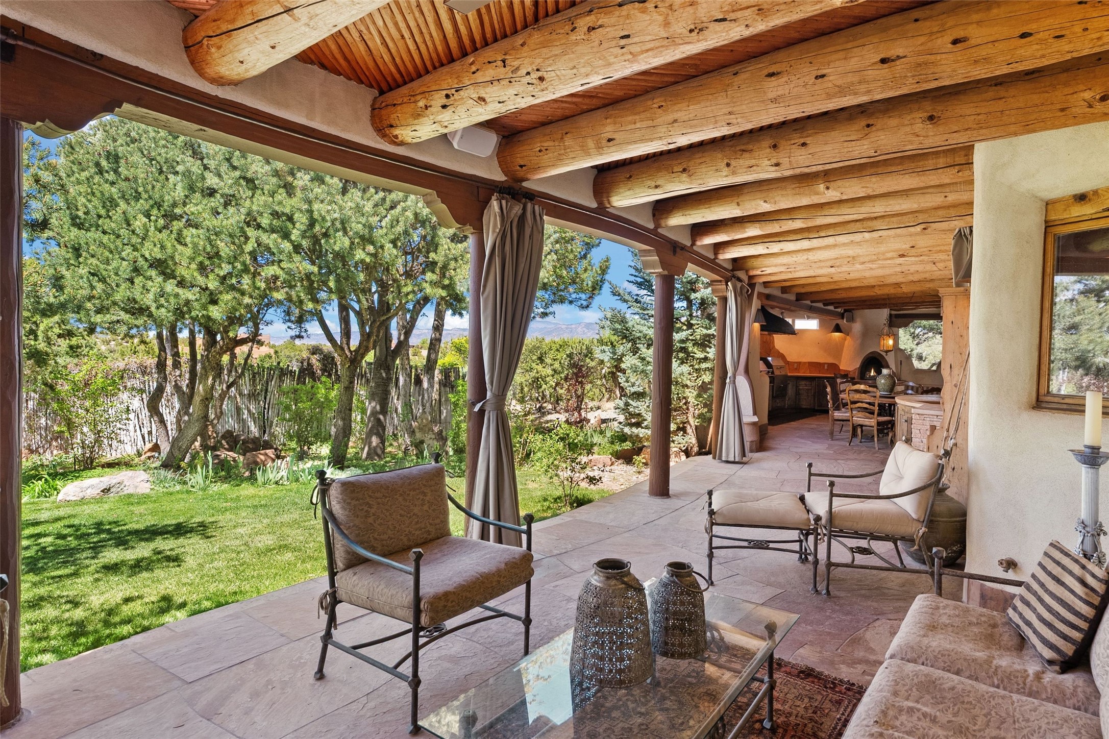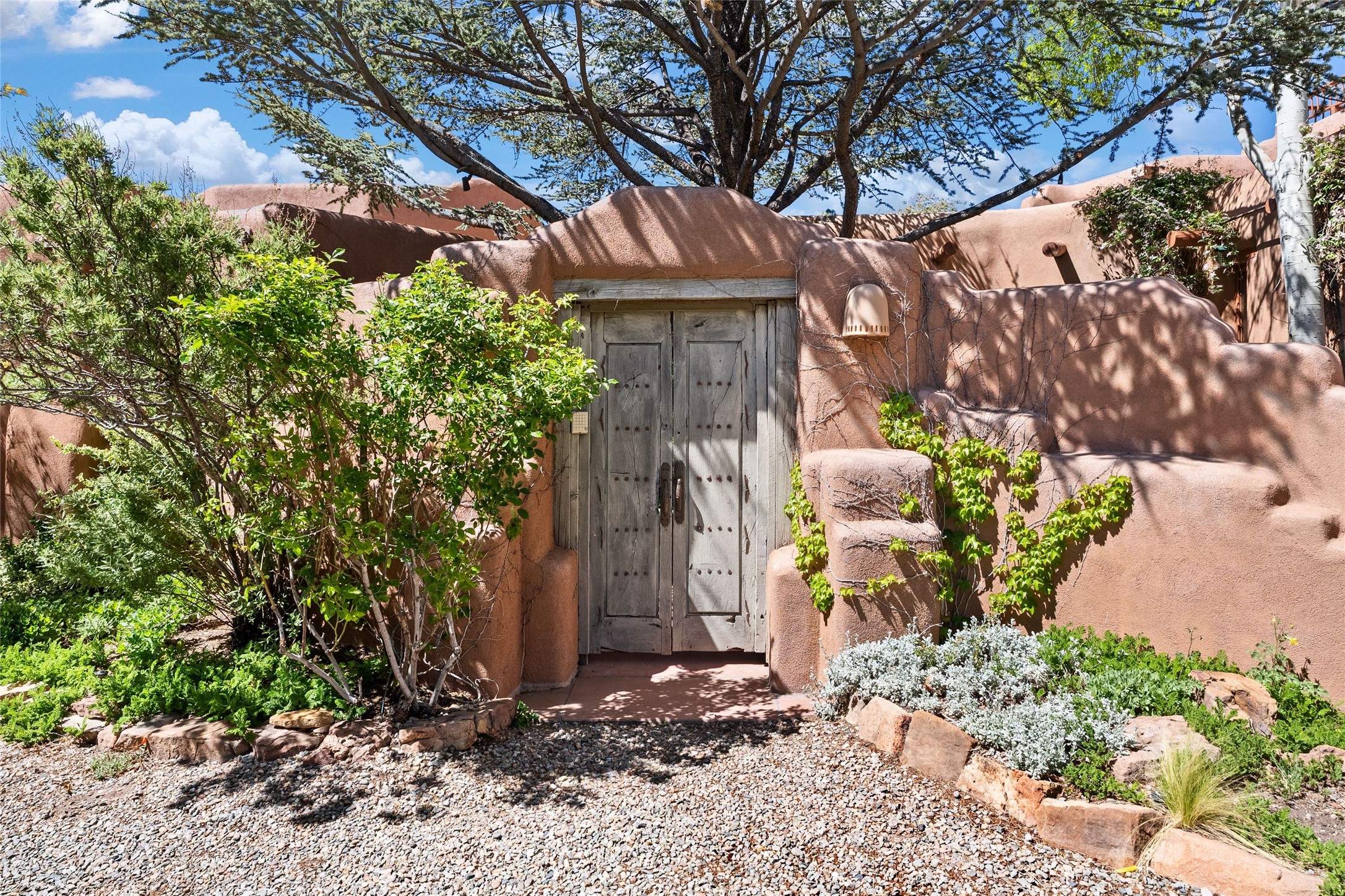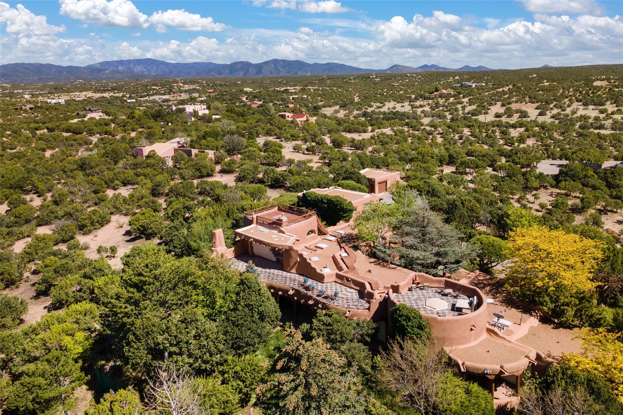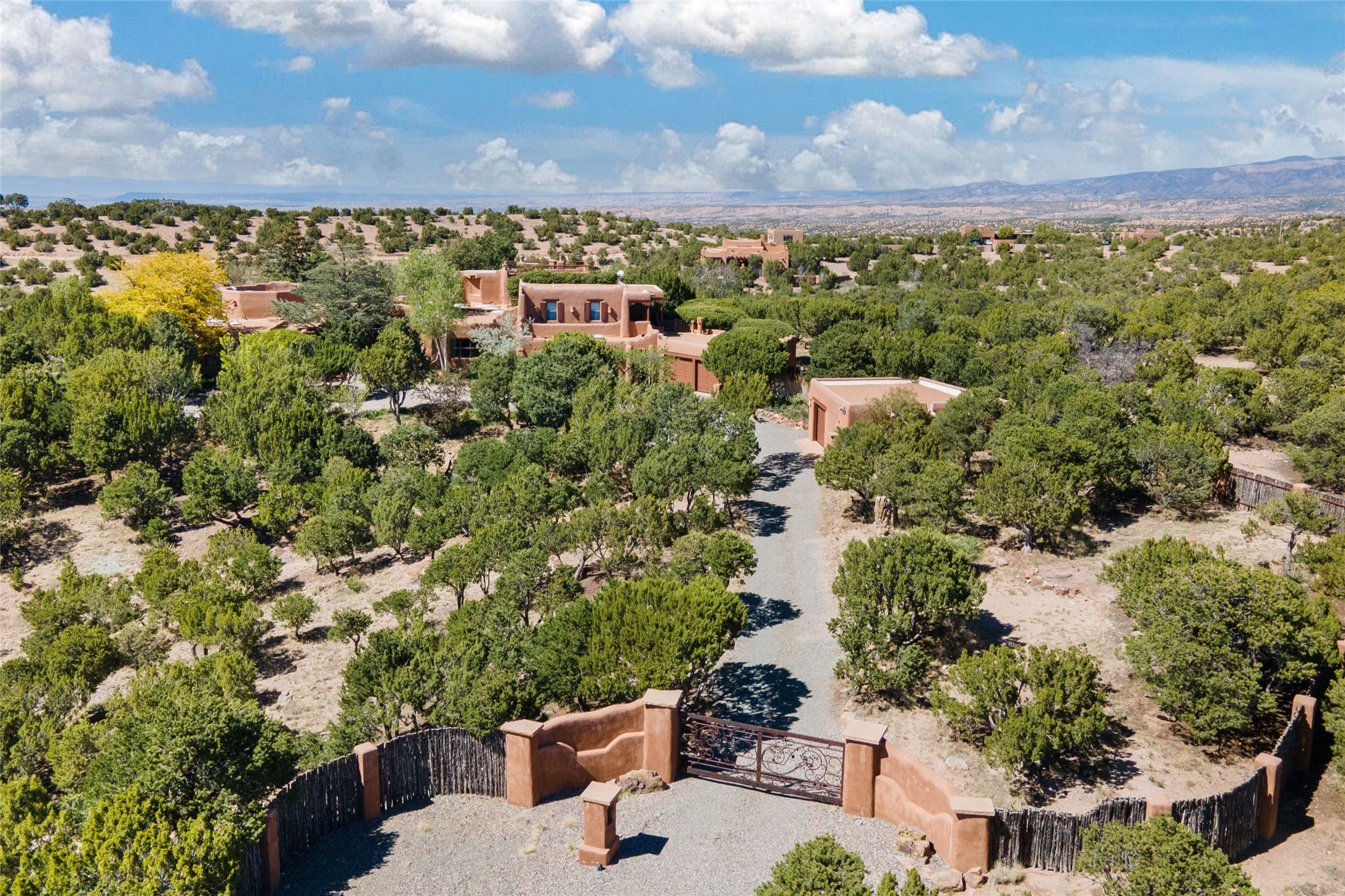 Perched in serene seclusion, this extraordinary estate embodies timeless New Mexico charm, offering breathtaking panoramic views from expansive rooftop decks and refined indoor-outdoor living. A lush courtyard leads into the heart of the home where artisan craftsmanship meets authentic Southwestern style. Curving adobe walls, Saltillo tile floors, carved wooden doors and kiva fireplaces echo throughout. The circular living room features a tiered beamed ceiling, kiva fireplace and intimate west-facing portal. The elegant dining room opens onto the courtyard creating harmony with nature. The kitchen flows to a covered portal with a built-in grill, cabinetry, dual sinks and ample seating--ideal for entertaining. A flagstone stairway leads to a luminous office with built-ins, powder room and rooftop deck. With stunning views of Sangre de Cristo sunrises and Jemez sunsets, this elevated open-air living space includes a kiva fireplace, bancos and a "crow's nest" retreat. The expansive primary suite offers a fireplace-side sitting area, access to a private garden with heated wading pool and outdoor shower and a spa bath with double vanity, soaking tub, steam shower and makeup station. Nearby flex rooms suit a gym, office or library. Two additional bedrooms--one with kiva fireplace and portal--share a beautifully appointed bath. A charming elevated casita includes a kitchen, full bath and mountain views. Meandering pathways wind through curated gardens, a koi pond, fenced garden with raised beds and potting shed, with many portals and patios. A 2-car garage with built-in storage and a separate third garage with a versatile studio and work sink round out the property. This exceptional estate is more than a home--it's a masterpiece of Southwestern living where art, nature and architecture converge in soulful, inspiring harmony.