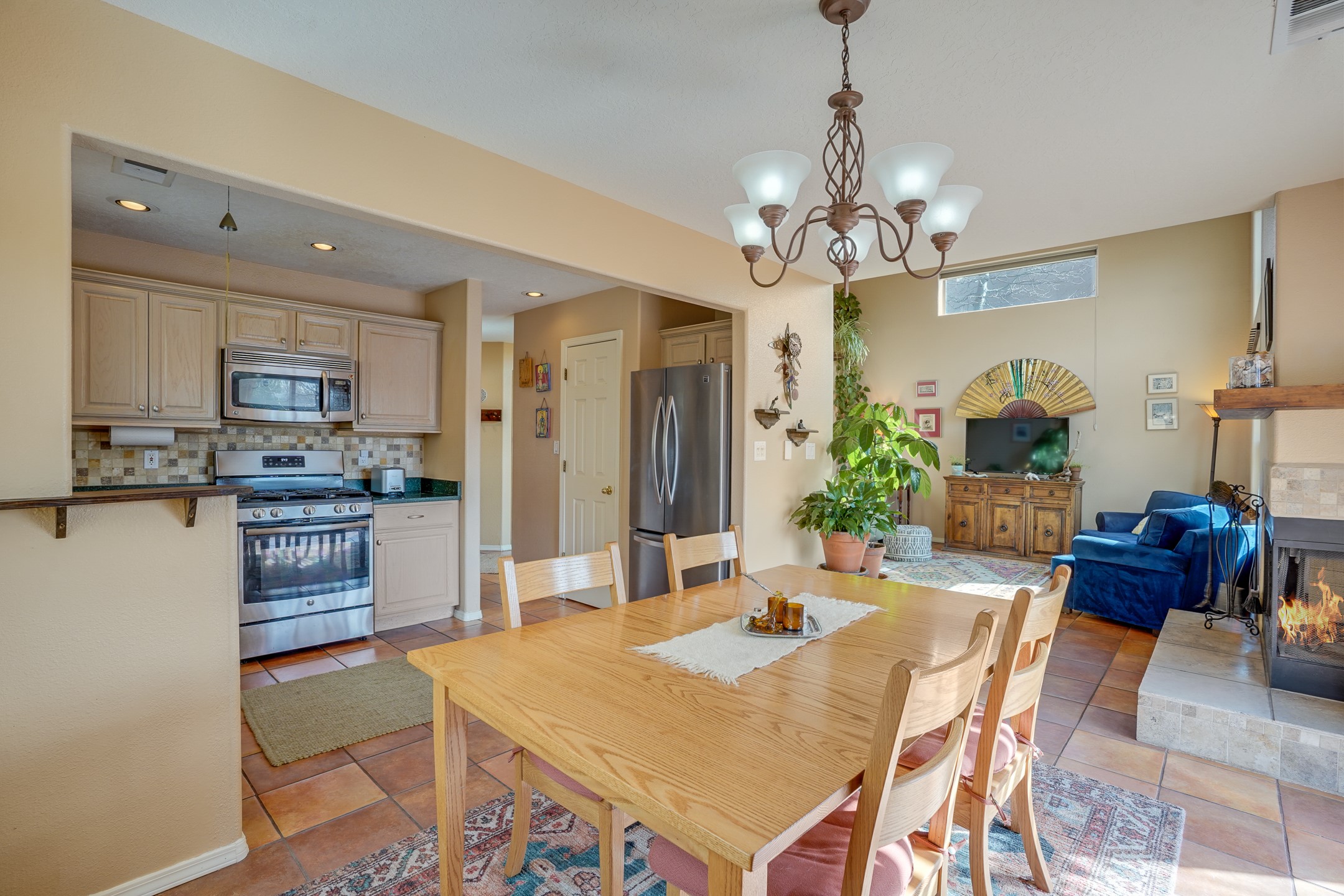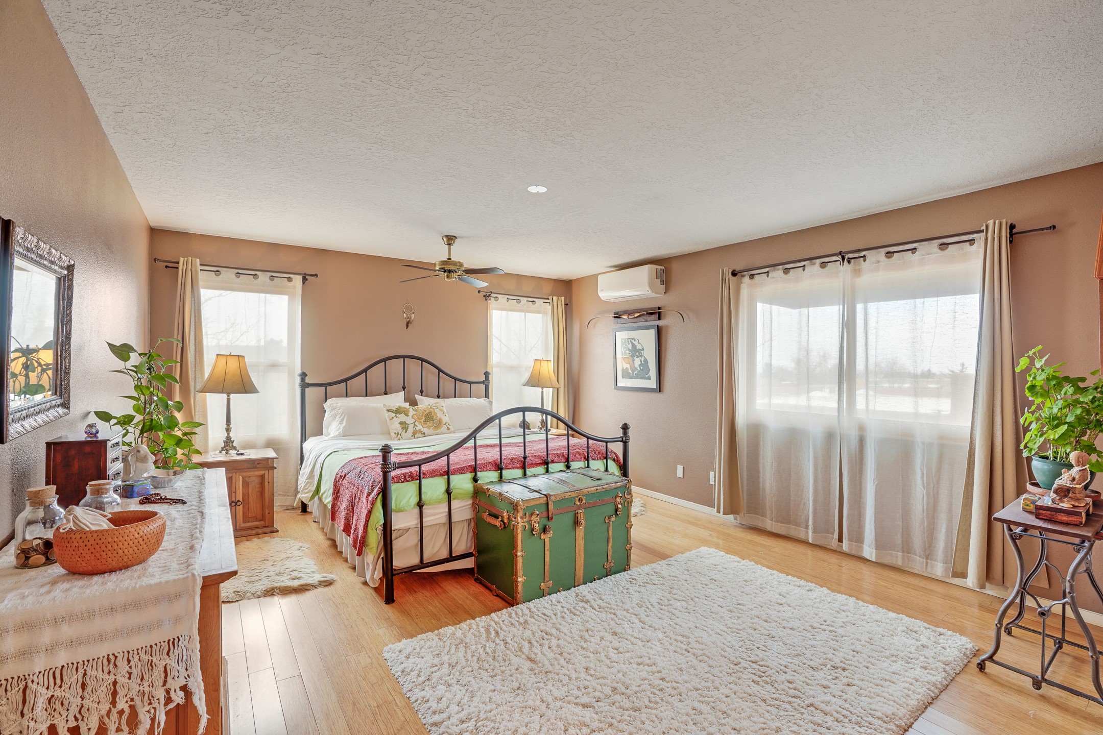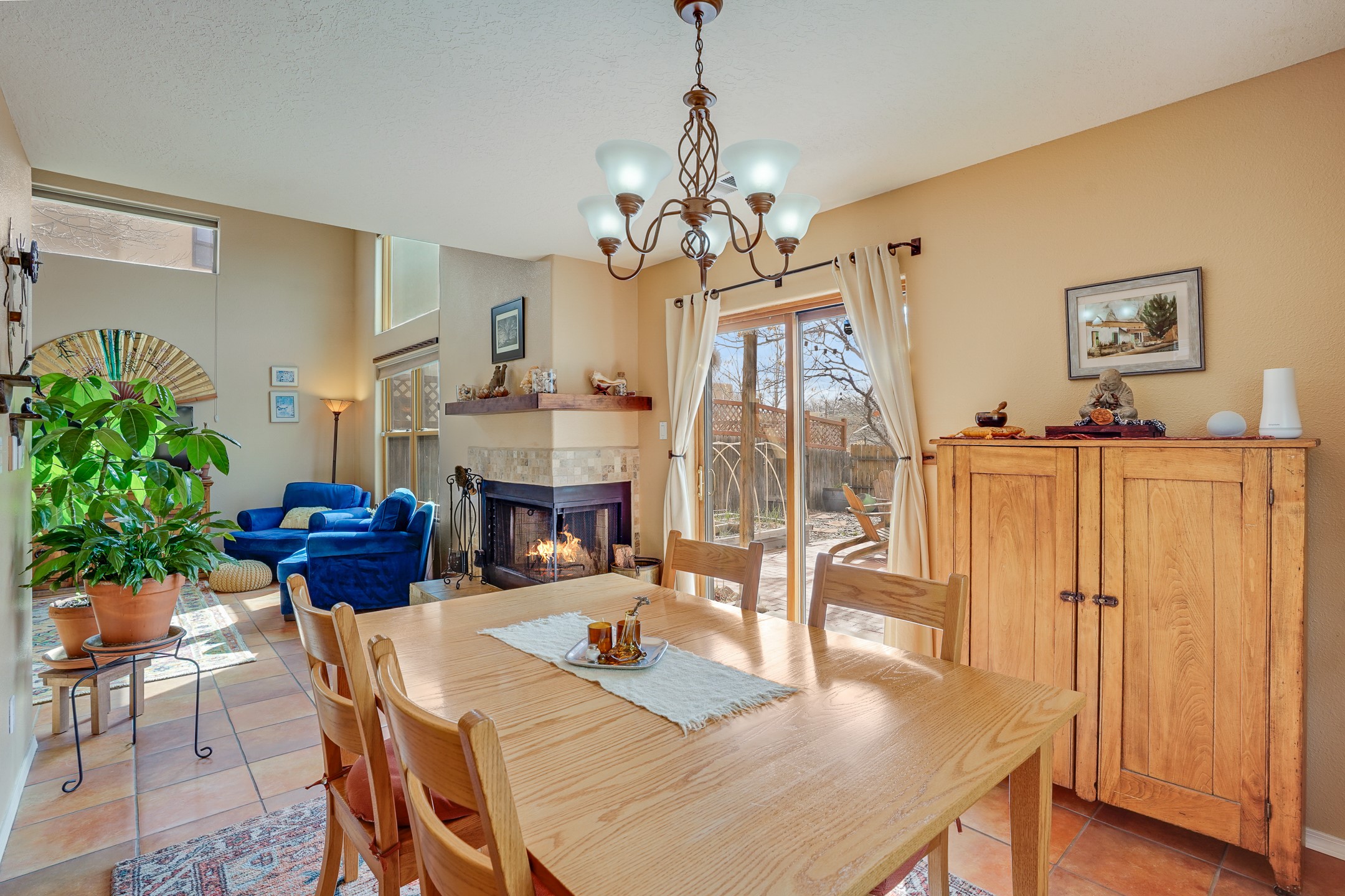 Natural light fills this wonderfully maintained three bed, two bath home in Midtown. The downstairs features a bright living room under a soaring, double-height wood ceiling with skylights, and an open dining/kitchen area. A beautiful wood-burning fireplace serves both the living and dining areas. The stairs and 2nd floor are clad with bamboo floors and both guest rooms open onto a second story deck. The generous primary suite has a full bath and walk in closet. Each bedroom has a separate mini-split for maximum comfort. The home also boasts double paned windows and a fully fenced in backyard great for gardening and entertaining.