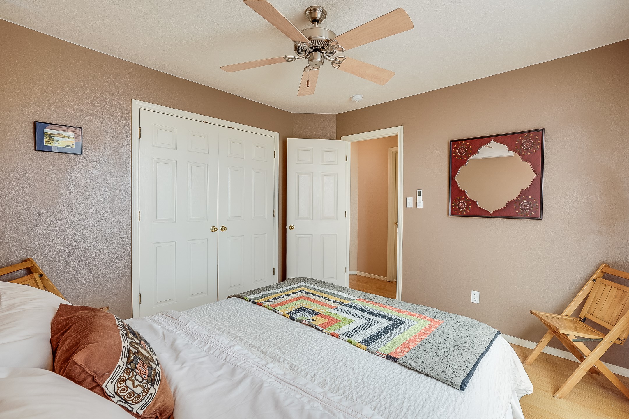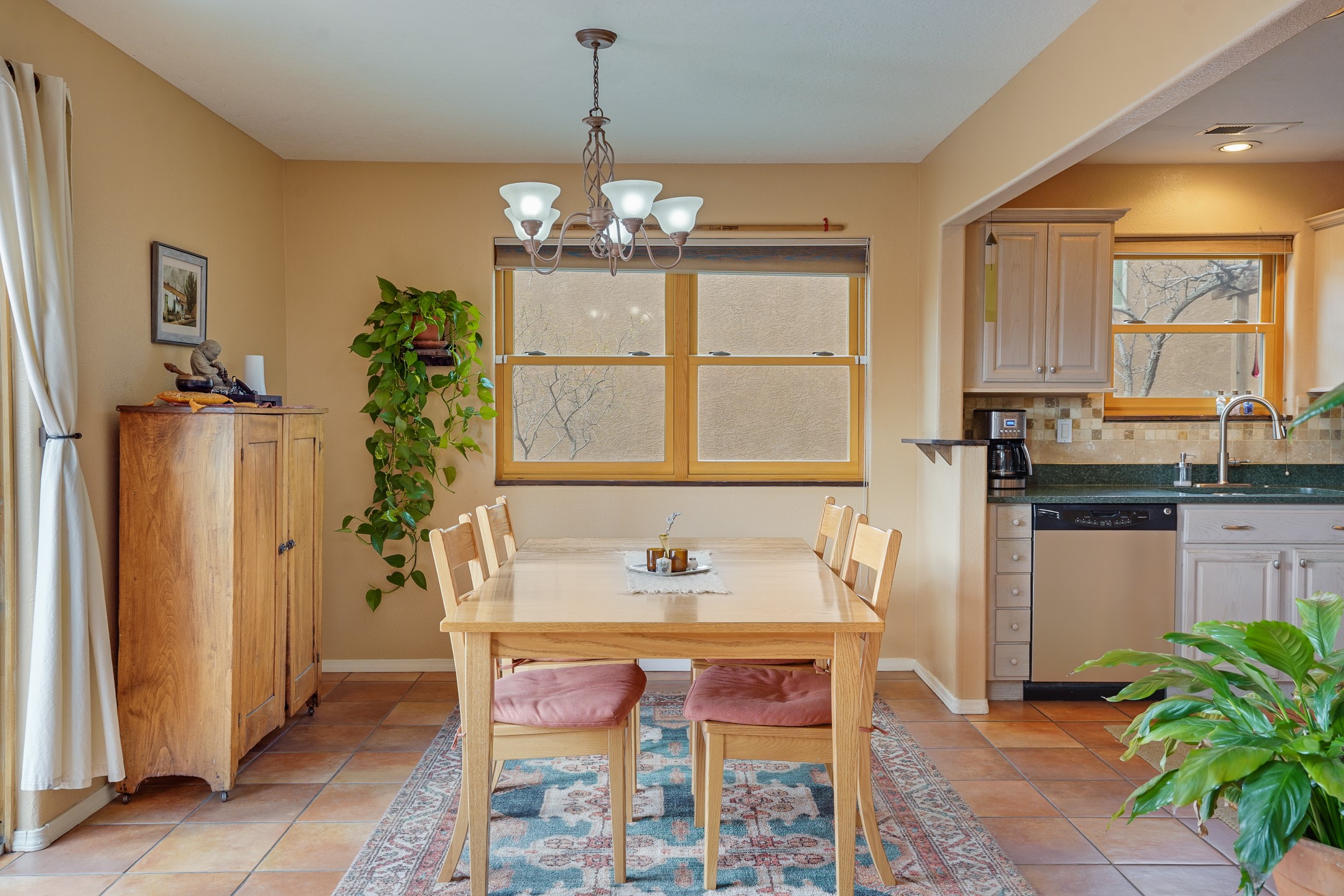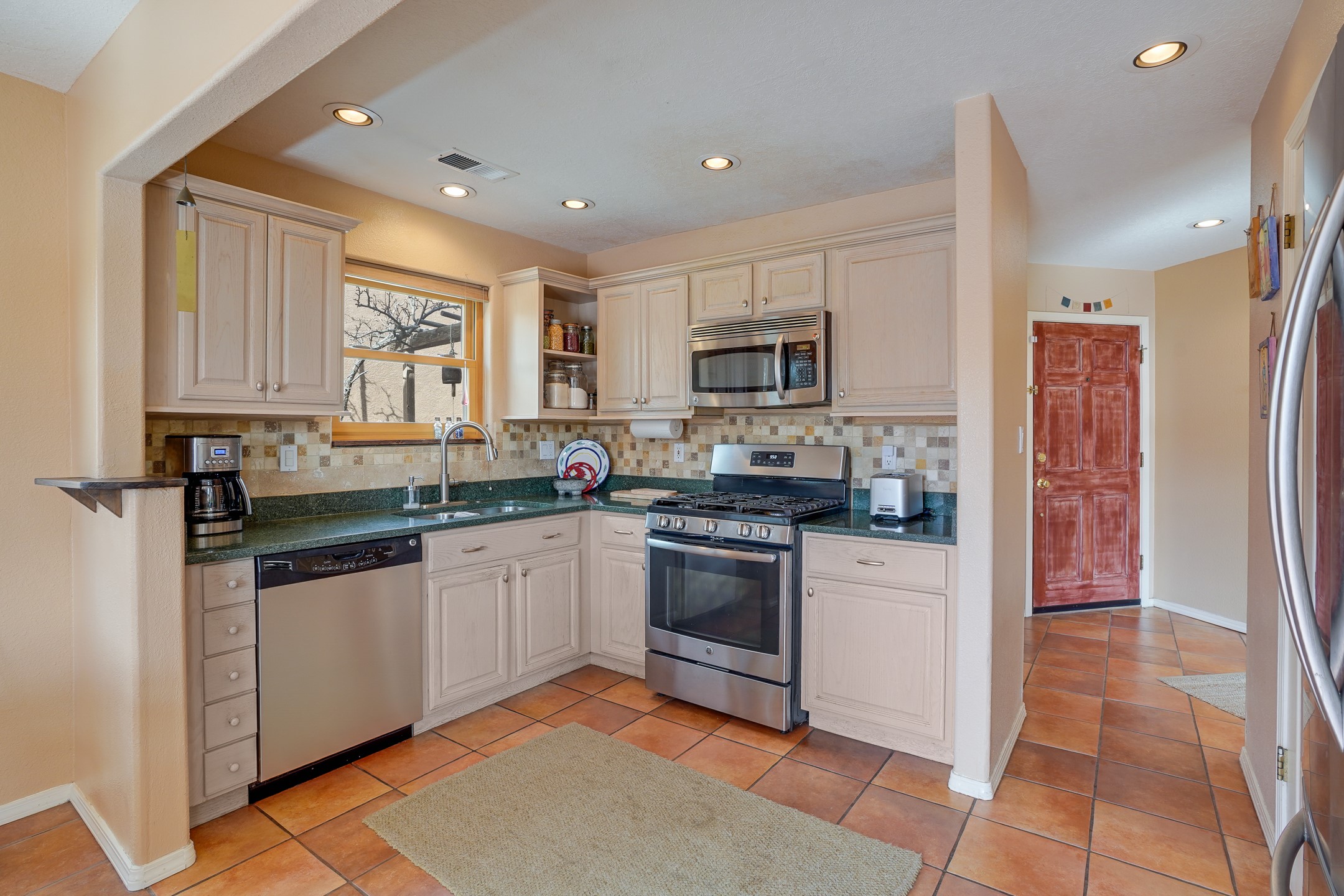 Natural light fills this wonderfully maintained three bed, two bath home in Midtown. The downstairs features a bright living room under a soaring, double-height wood ceiling with skylights, and an open dining/kitchen area. A beautiful wood-burning fireplace serves both the living and dining areas. The stairs and 2nd floor are clad with bamboo floors and both guest rooms open onto a second story deck. The generous primary suite has a full bath and walk in closet. Each bedroom has a separate mini-split for maximum comfort. The home also boasts double paned windows and a fully fenced in backyard great for gardening and entertaining.