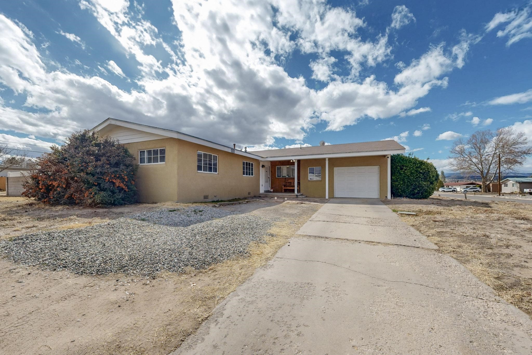 A three bedroom, two bath home and much more is now available to purchase. Entering the home through the front door, protected by a covered porch, one is welcomed by a hall leading to the 3 back bedrooms and two baths. The bedrooms are sizable, two bedrooms share one bath, but the primary bedroom is private and quite large, with a private full bath. Heading back to the front door, turning left, is a brightly lit living room /dining room area. If light does not suit you, close the drapes and enjoy a day of less light. The cozy brick fireplace is wood fired. Looking back, is the bright, well equipped kitchen, with stainless steel appliances and with adequate kitchen space to prepare all those scrumptious family meals. There is enough space for a small breakfast nook. Behind the kitchen is the laundry room, equipped with a washer and dryer. Then there is the one car garage with a garage door opener and side table for special projects..One would think this is definitely a lot of space, when considering the price of the home, but there is so much more. Walking back to the living room, down a step, is a large bonus, family room, with a brick gas fired fireplace, with bancos, (built in sitting space) on each side of the massive fireplace. This room opens up to a side covered flagstone porch/patio, with a wood fired, outside fire place, along with a quite large, enclosed back and side yard. There is still so much land that encompasses the home, that includes a side yard with a storage unit, and front driveway, from street to the garage. An amazing home that still has more to offer, like wood flooring, sets on a large, corner city lot, central refrigerated air unit, access to shopping and dining, and is minutes away from Los Alamos, Santa Fe, Taos, and Abiquiu. Don't miss out on this home, it is priced right, centrally located.