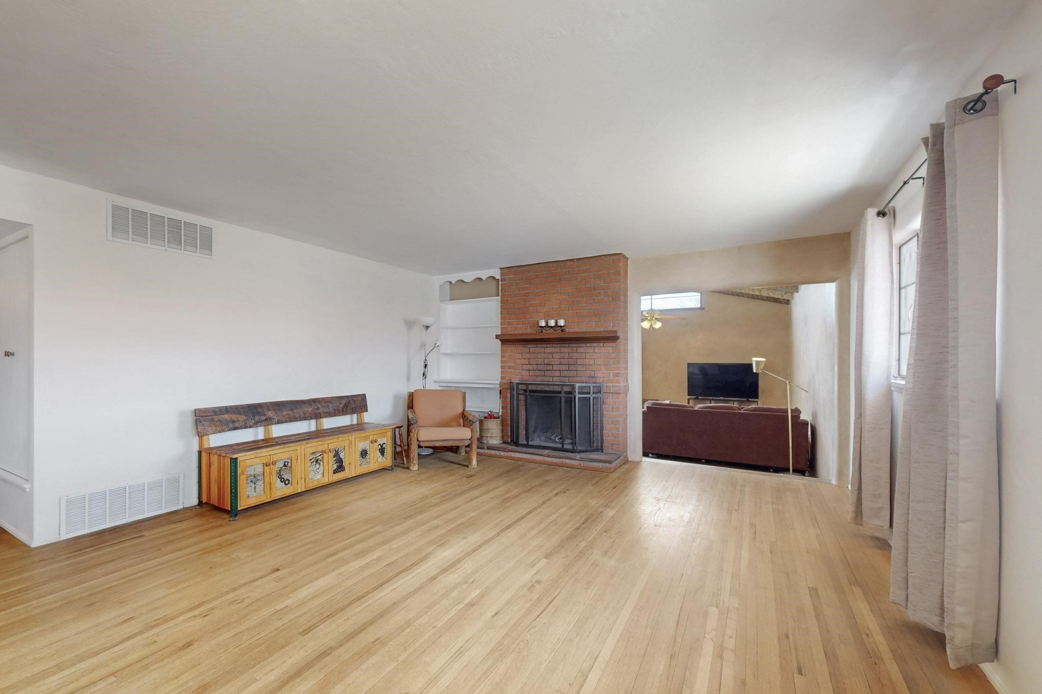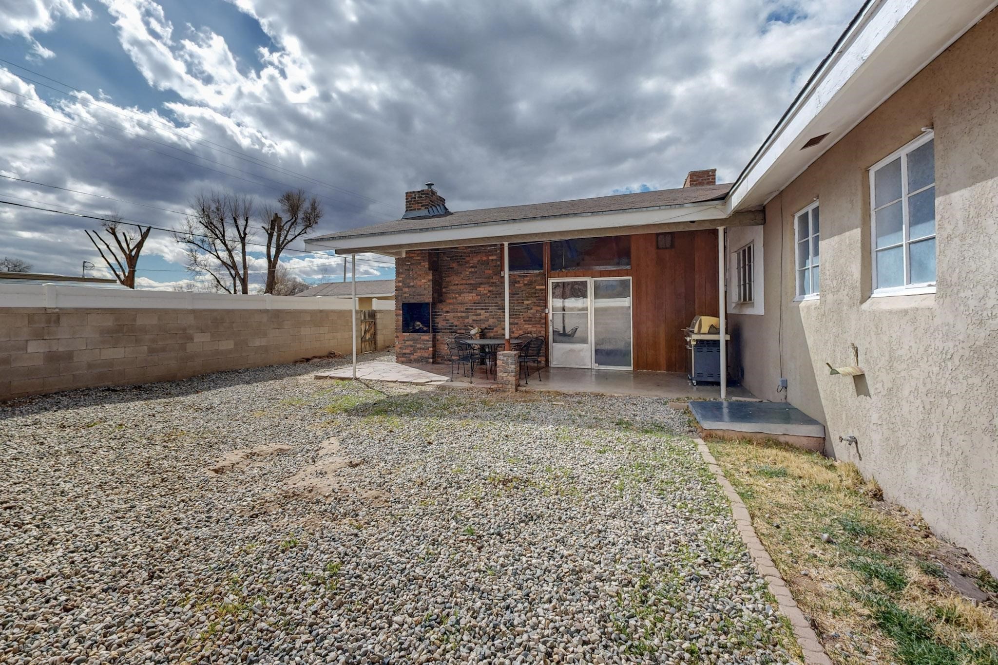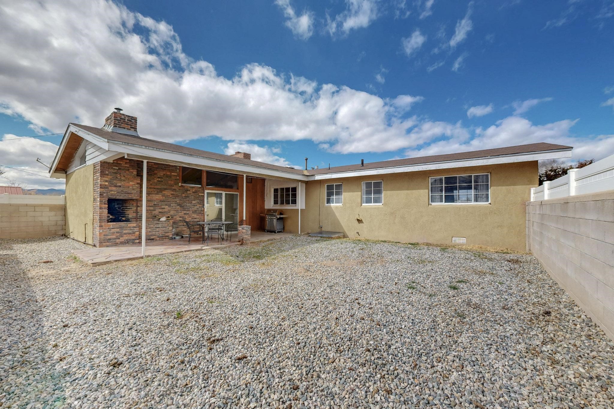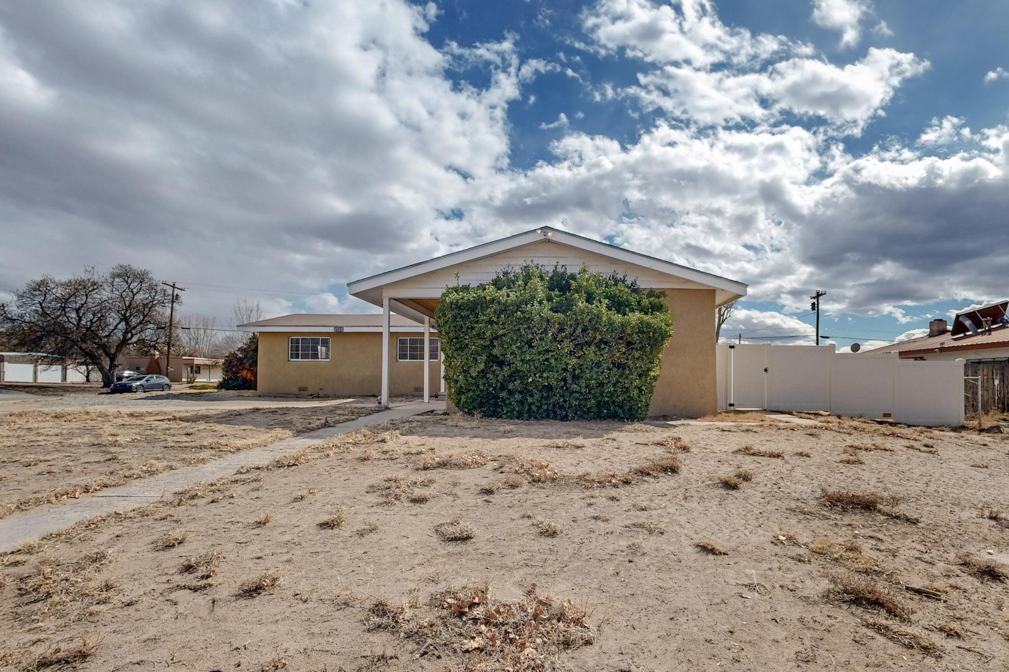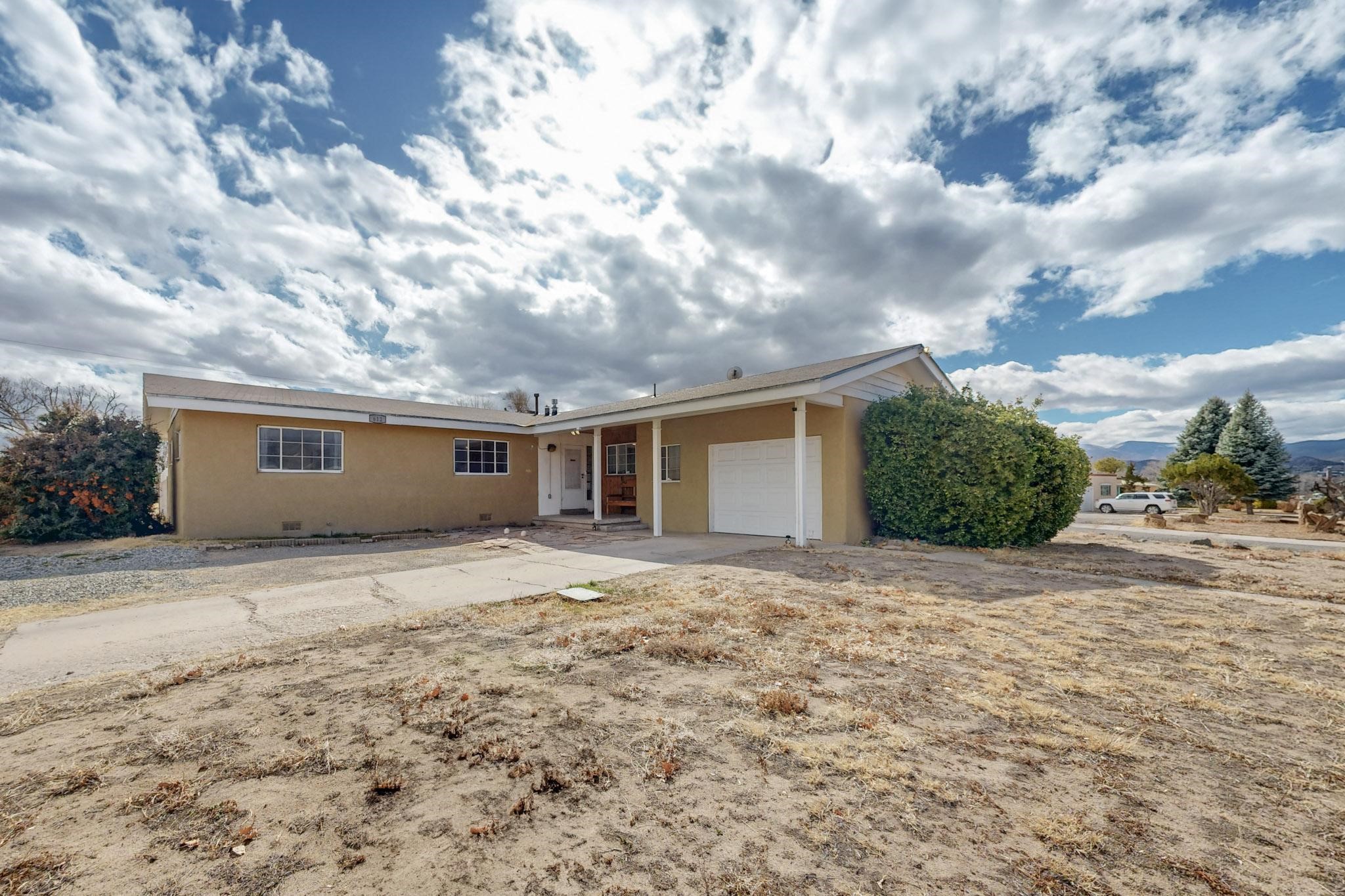 A three bedroom, two bath home and much more is now available to purchase. Entering the home through the front door, protected by a covered porch, one is welcomed by a hall leading to the 3 back bedrooms and two baths. The bedrooms are sizable, two bedrooms share one bath, but the primary bedroom is private and quite large, with a private full bath. Heading back to the front door, turning left, is a brightly lit living room /dining room area. If light does not suit you, close the drapes and enjoy a day of less light. The cozy brick fireplace is wood fired. Looking back, is the bright, well equipped kitchen, with stainless steel appliances and with adequate kitchen space to prepare all those scrumptious family meals. There is enough space for a small breakfast nook. Behind the kitchen is the laundry room, equipped with a washer and dryer. Then there is the one car garage with a garage door opener and side table for special projects..One would think this is definitely a lot of space, when considering the price of the home, but there is so much more. Walking back to the living room, down a step, is a large bonus, family room, with a brick gas fired fireplace, with bancos, (built in sitting space) on each side of the massive fireplace. This room opens up to a side covered flagstone porch/patio, with a wood fired, outside fire place, along with a quite large, enclosed back and side yard. There is still so much land that encompasses the home, that includes a side yard with a storage unit, and front driveway, from street to the garage. An amazing home that still has more to offer, like wood flooring, sets on a large, corner city lot, central refrigerated air unit, access to shopping and dining, and is minutes away from Los Alamos, Santa Fe, Taos, and Abiquiu. Don't miss out on this home, it is priced right, centrally located.