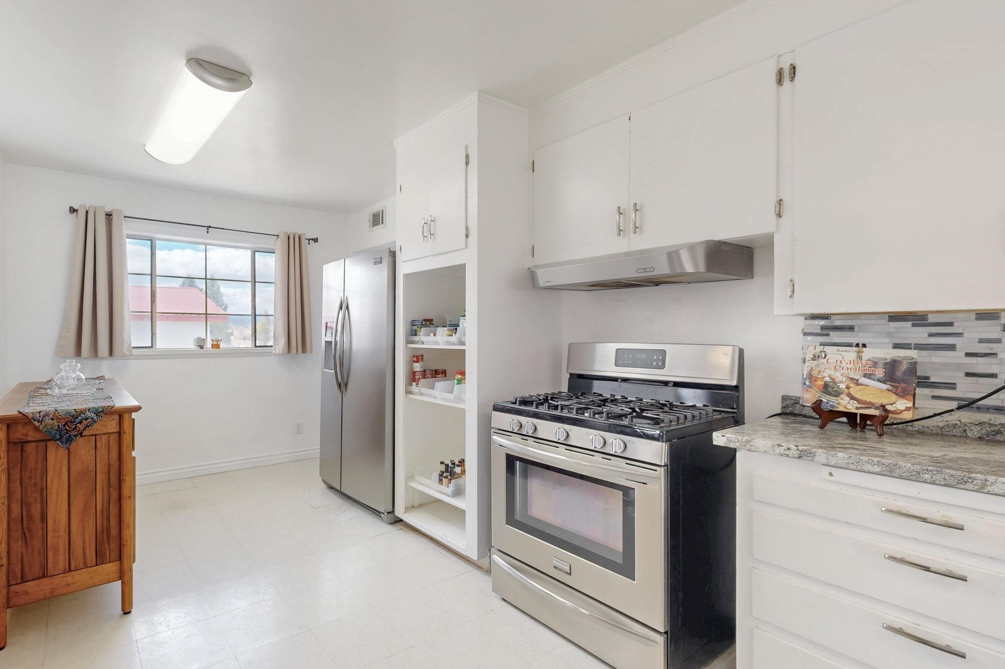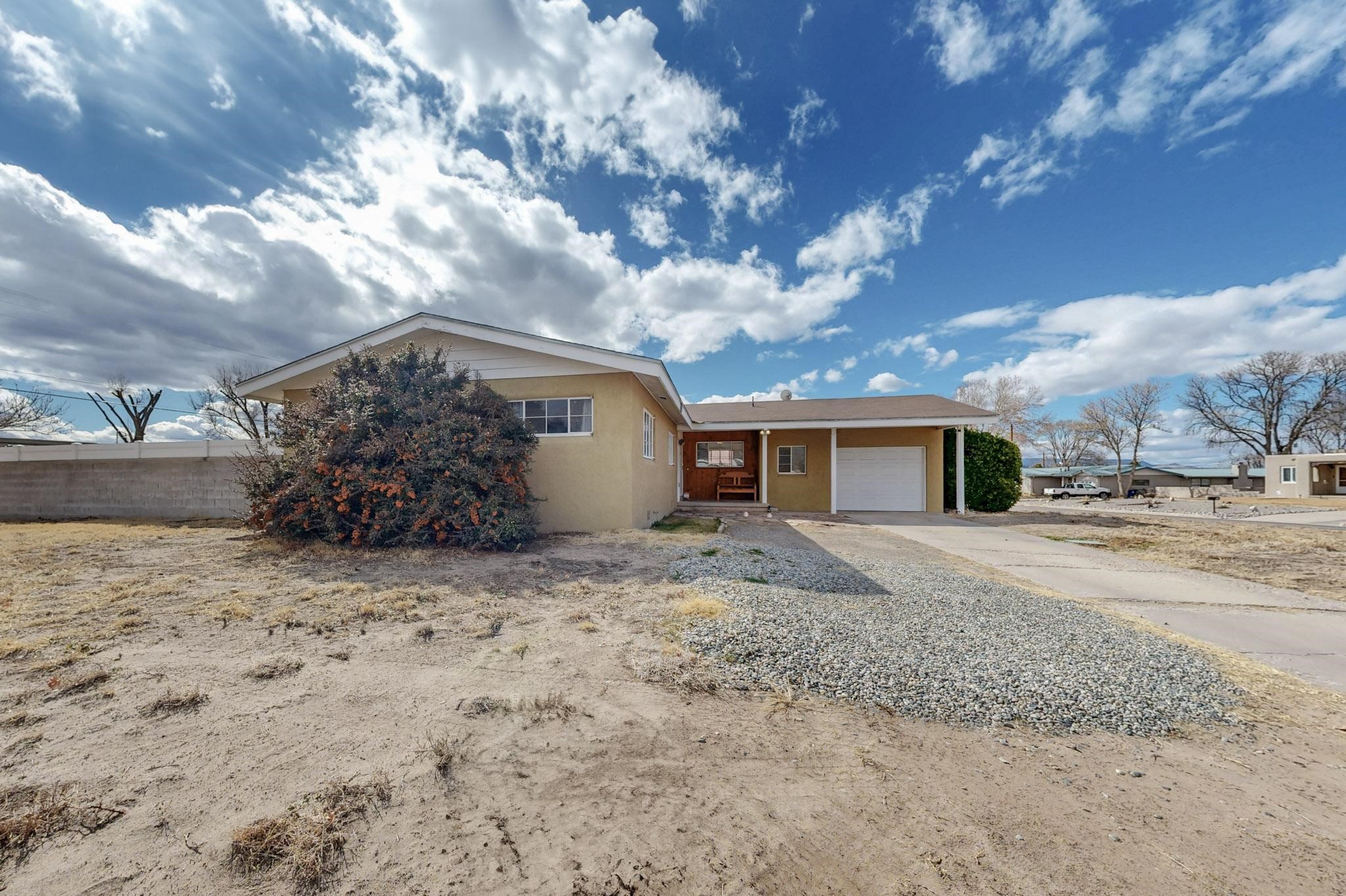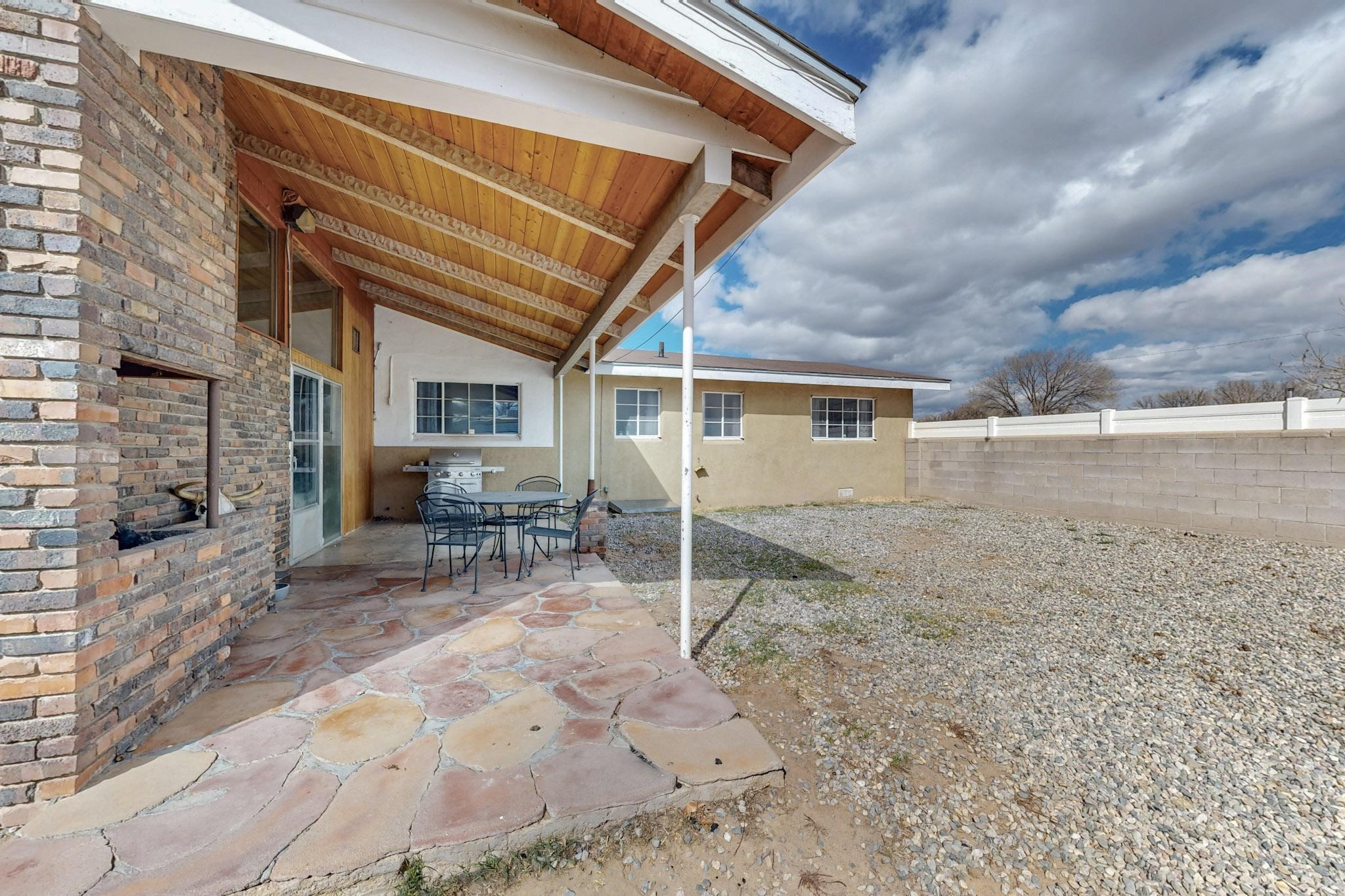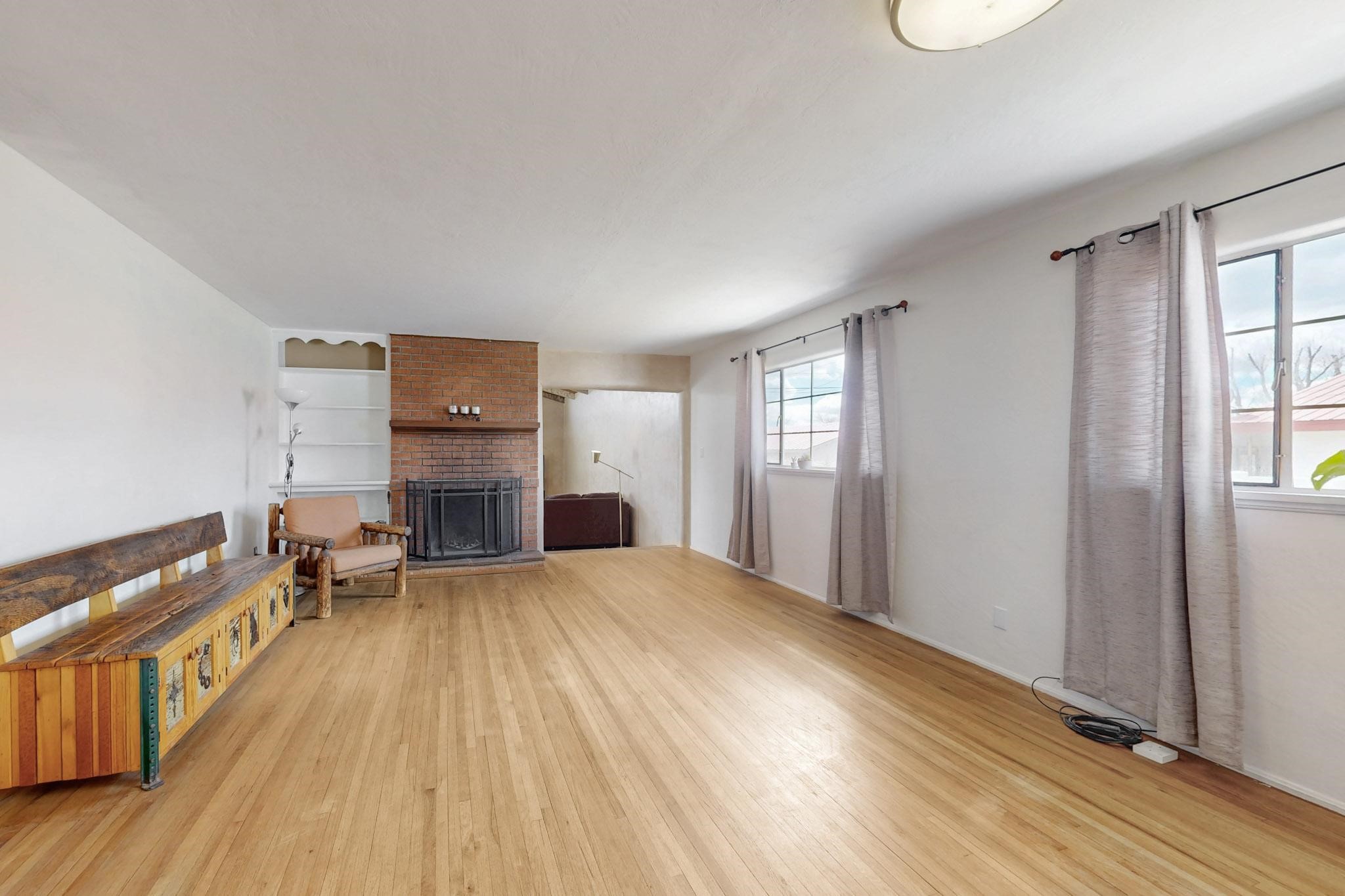 A three bedroom, two bath home and much more is now available to purchase. Entering the home through the front door, protected by a covered porch, one is welcomed by a hall leading to the 3 back bedrooms and two baths. The bedrooms are sizable, two bedrooms share one bath, but the primary bedroom is private and quite large, with a private full bath. Heading back to the front door, turning left, is a brightly lit living room /dining room area. If light does not suit you, close the drapes and enjoy a day of less light. The cozy brick fireplace is wood fired. Looking back, is the bright, well equipped kitchen, with stainless steel appliances and with adequate kitchen space to prepare all those scrumptious family meals. There is enough space for a small breakfast nook. Behind the kitchen is the laundry room, equipped with a washer and dryer. Then there is the one car garage with a garage door opener and side table for special projects..One would think this is definitely a lot of space, when considering the price of the home, but there is so much more. Walking back to the living room, down a step, is a large bonus, family room, with a brick gas fired fireplace, with bancos, (built in sitting space) on each side of the massive fireplace. This room opens up to a side covered flagstone porch/patio, with a wood fired, outside fire place, along with a quite large, enclosed back and side yard. There is still so much land that encompasses the home, that includes a side yard with a storage unit, and front driveway, from street to the garage. An amazing home that still has more to offer, like wood flooring, sets on a large, corner city lot, central refrigerated air unit, access to shopping and dining, and is minutes away from Los Alamos, Santa Fe, Taos, and Abiquiu. Don't miss out on this home, it is priced right, centrally located.