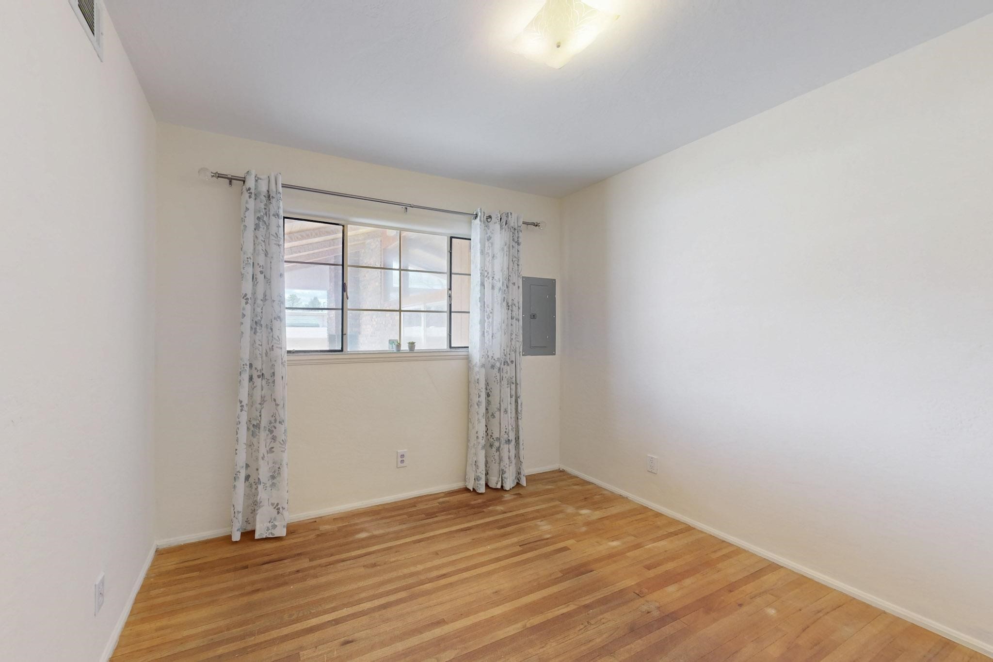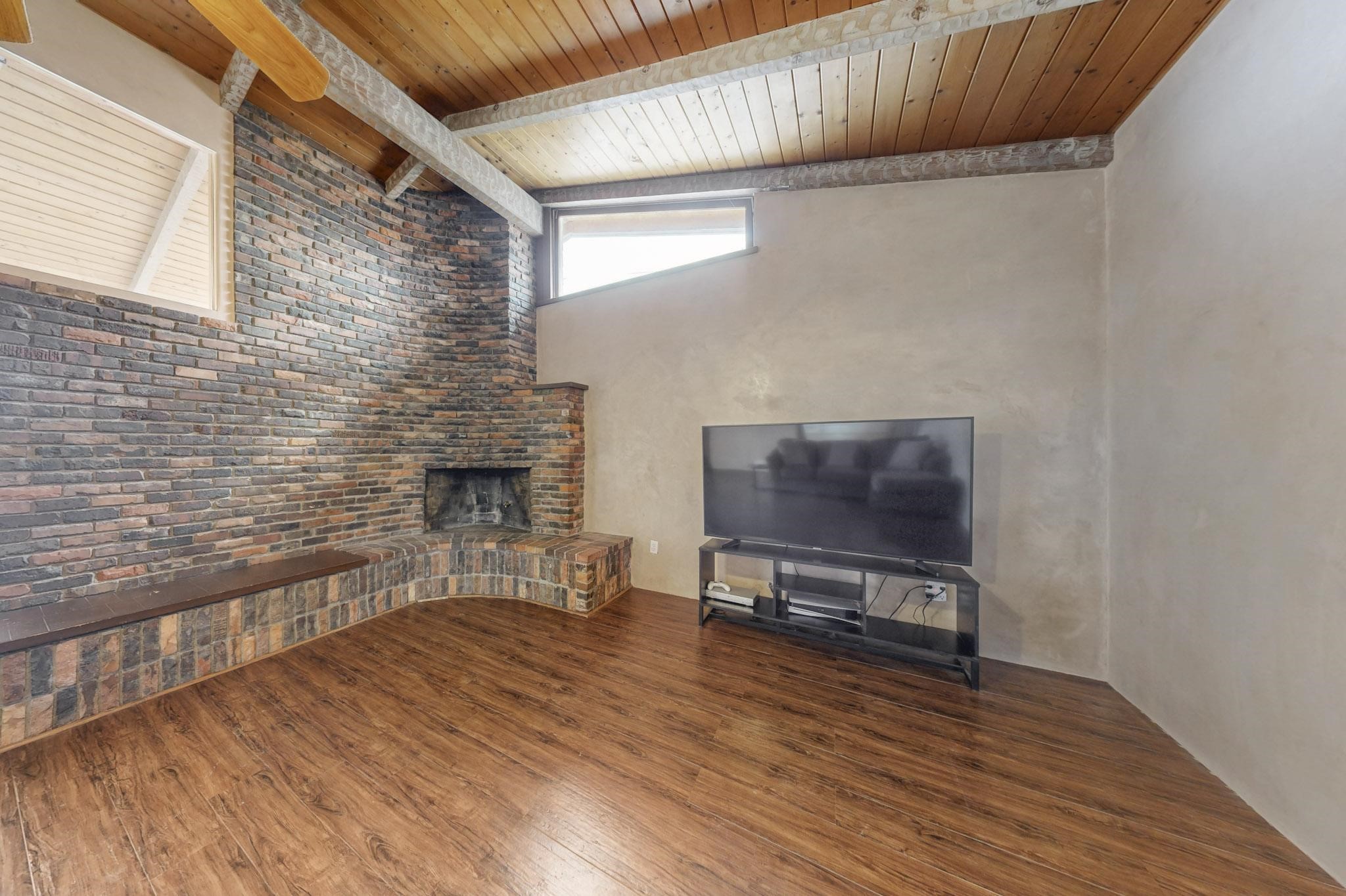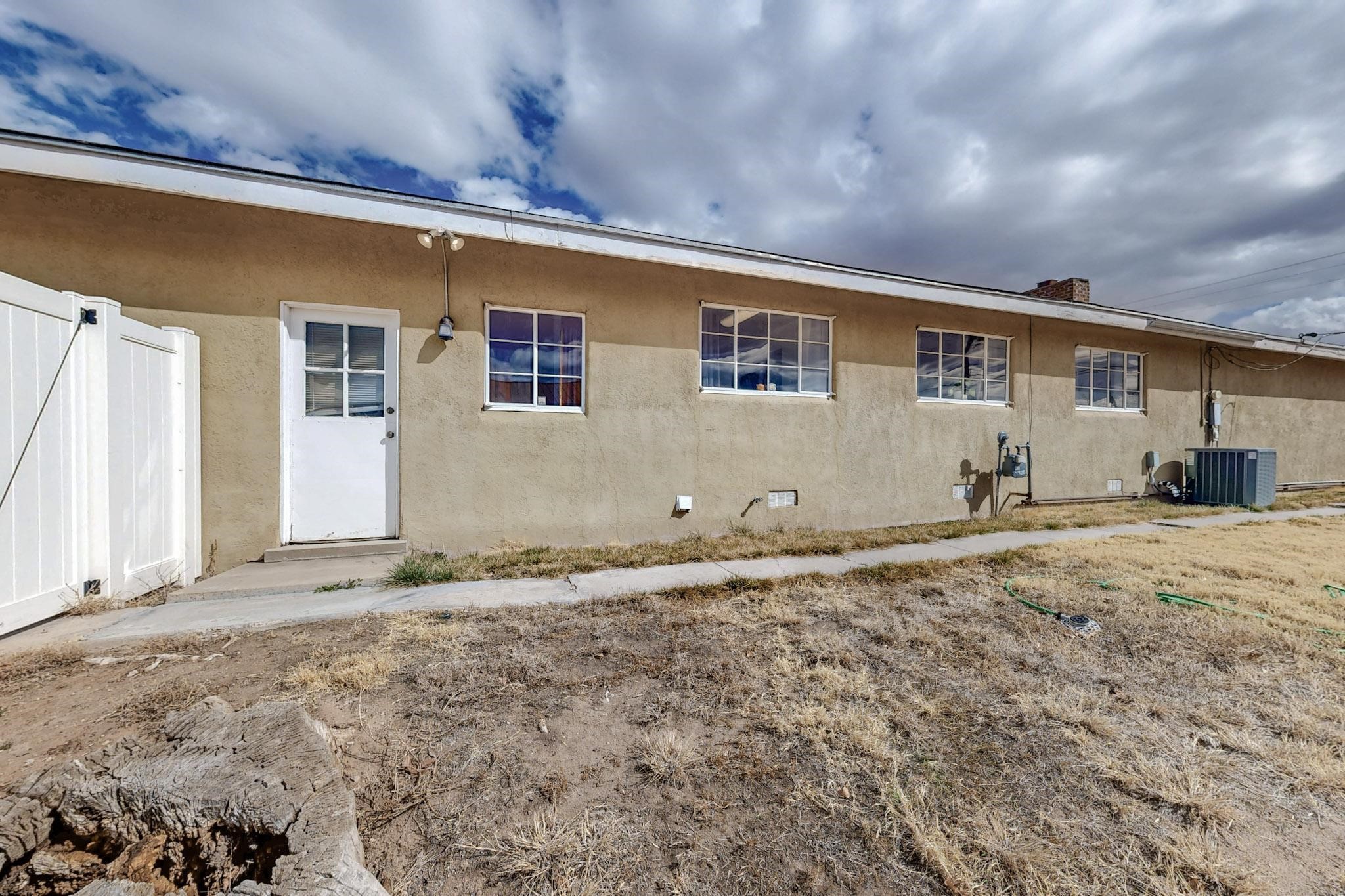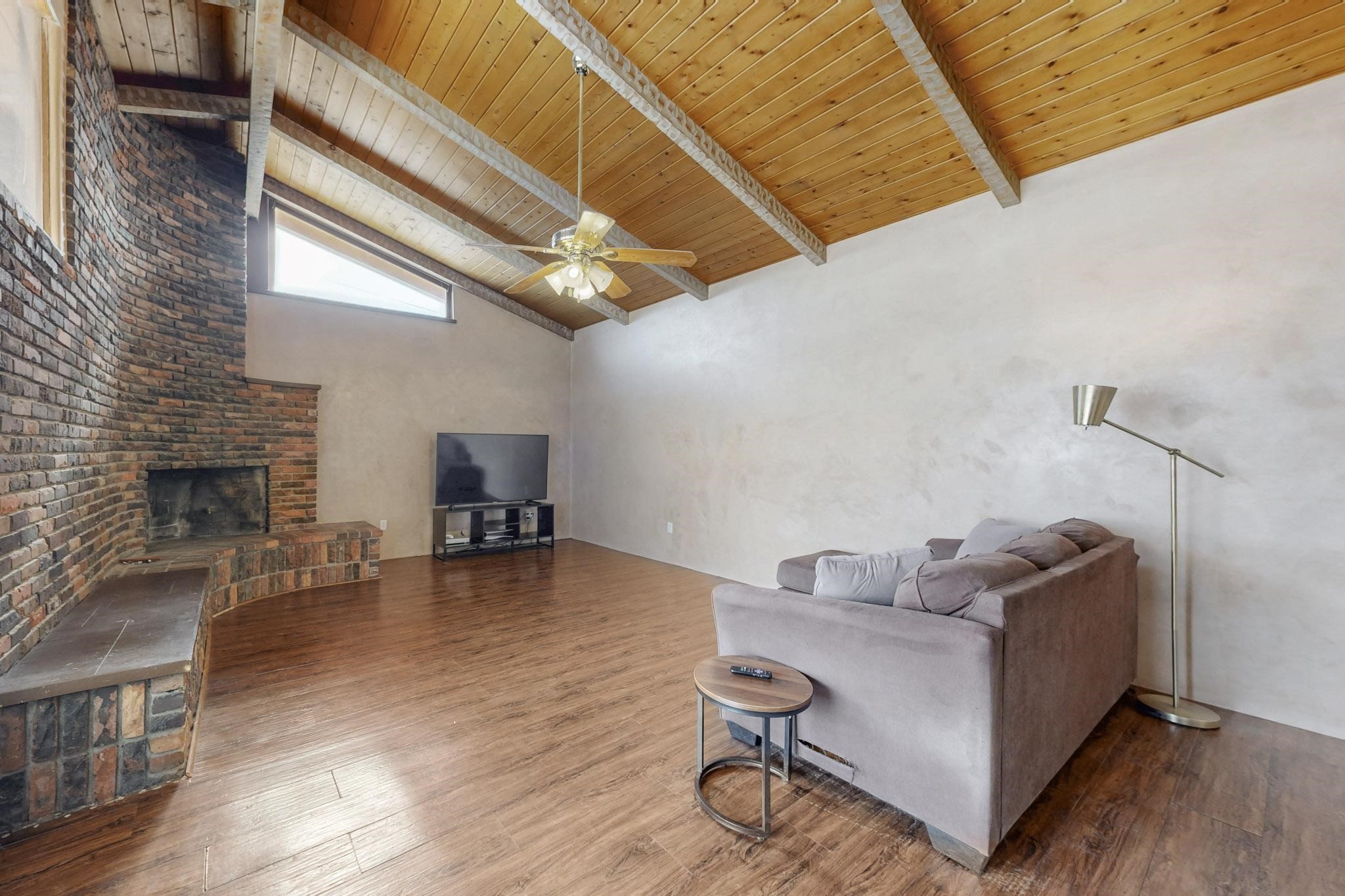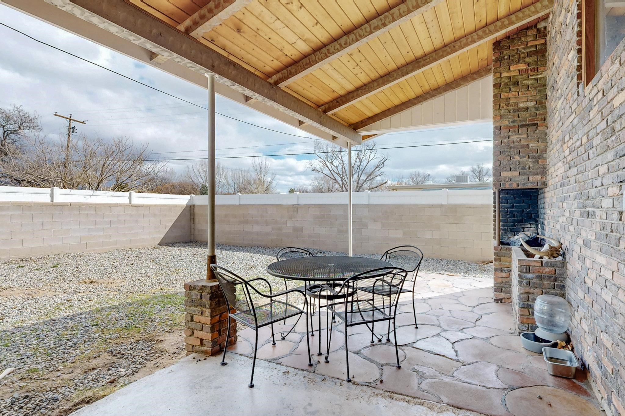 A three bedroom, two bath home and much more is now available to purchase. Entering the home through the front door, protected by a covered porch, one is welcomed by a hall leading to the 3 back bedrooms and two baths. The bedrooms are sizable, two bedrooms share one bath, but the primary bedroom is private and quite large, with a private full bath. Heading back to the front door, turning left, is a brightly lit living room /dining room area. If light does not suit you, close the drapes and enjoy a day of less light. The cozy brick fireplace is wood fired. Looking back, is the bright, well equipped kitchen, with stainless steel appliances and with adequate kitchen space to prepare all those scrumptious family meals. There is enough space for a small breakfast nook. Behind the kitchen is the laundry room, equipped with a washer and dryer. Then there is the one car garage with a garage door opener and side table for special projects..One would think this is definitely a lot of space, when considering the price of the home, but there is so much more. Walking back to the living room, down a step, is a large bonus, family room, with a brick gas fired fireplace, with bancos, (built in sitting space) on each side of the massive fireplace. This room opens up to a side covered flagstone porch/patio, with a wood fired, outside fire place, along with a quite large, enclosed back and side yard. There is still so much land that encompasses the home, that includes a side yard with a storage unit, and front driveway, from street to the garage. An amazing home that still has more to offer, like wood flooring, sets on a large, corner city lot, central refrigerated air unit, access to shopping and dining, and is minutes away from Los Alamos, Santa Fe, Taos, and Abiquiu. Don't miss out on this home, it is priced right, centrally located.