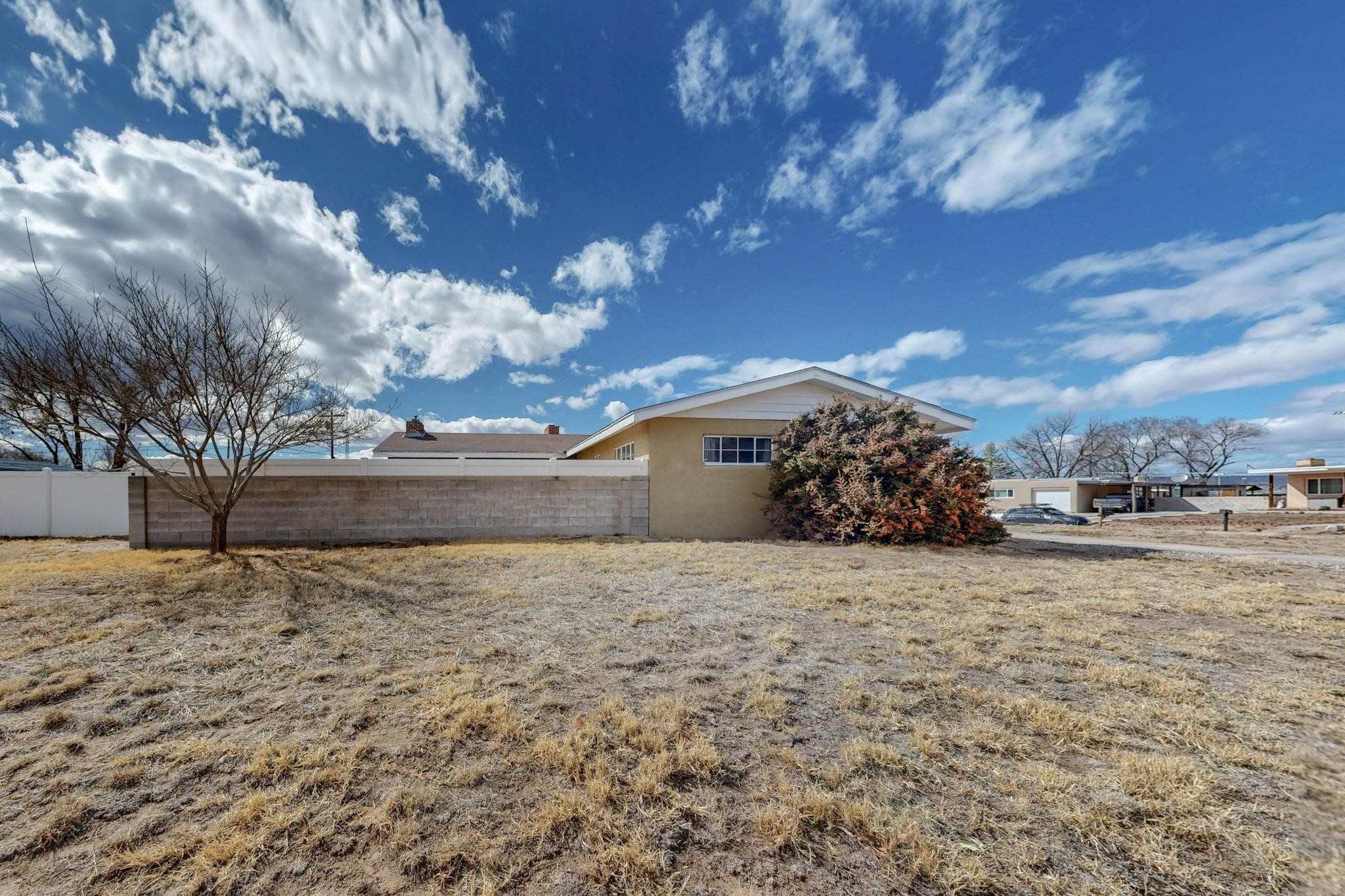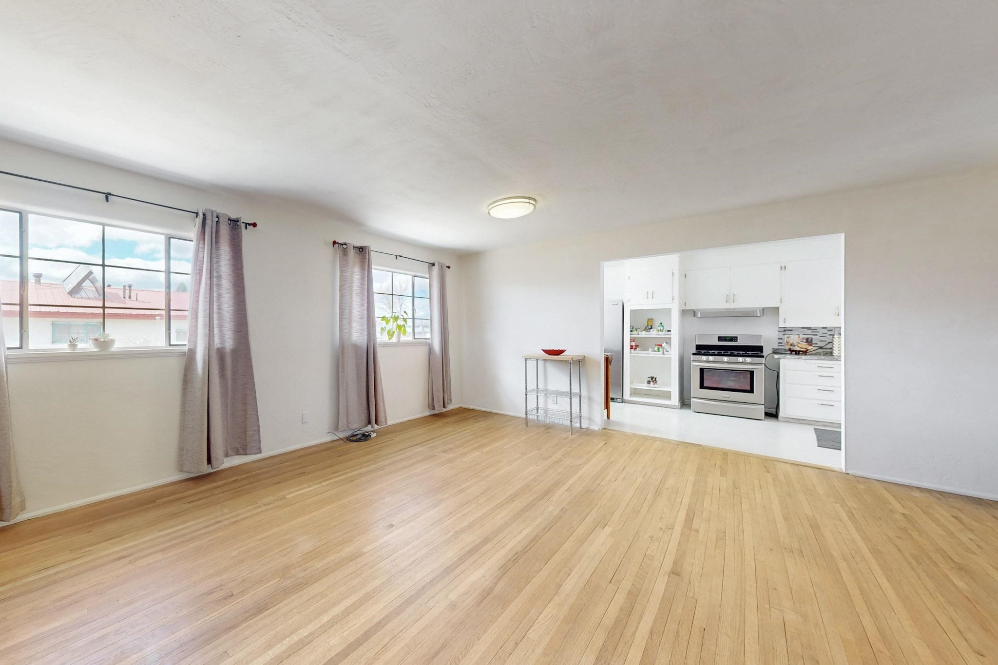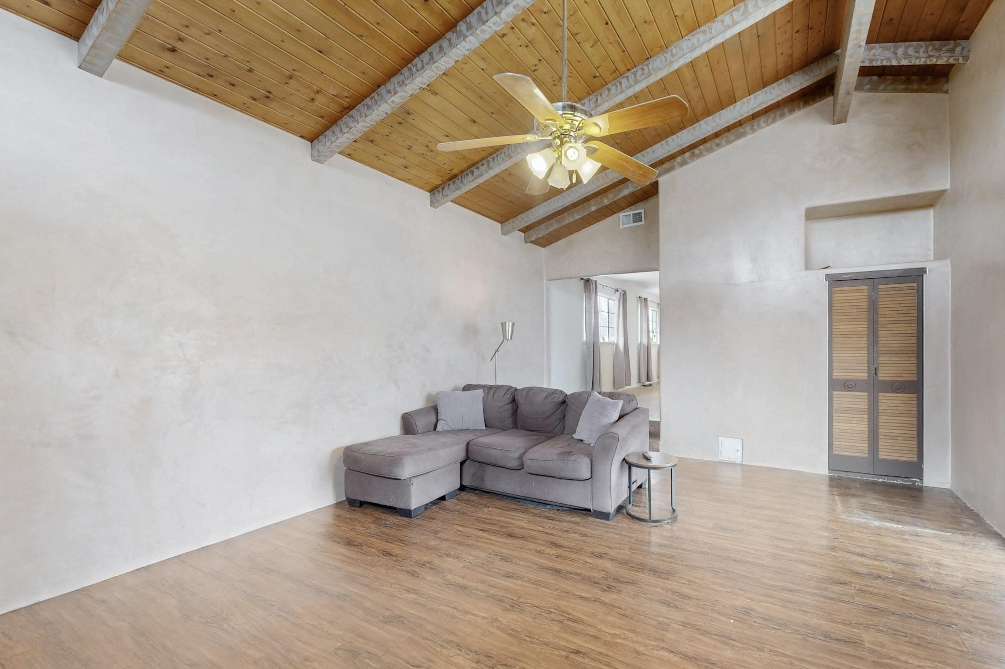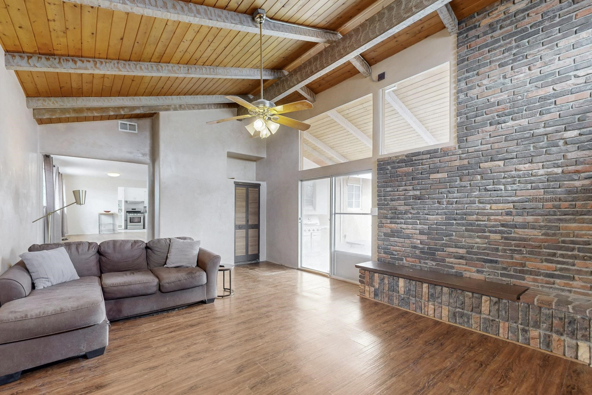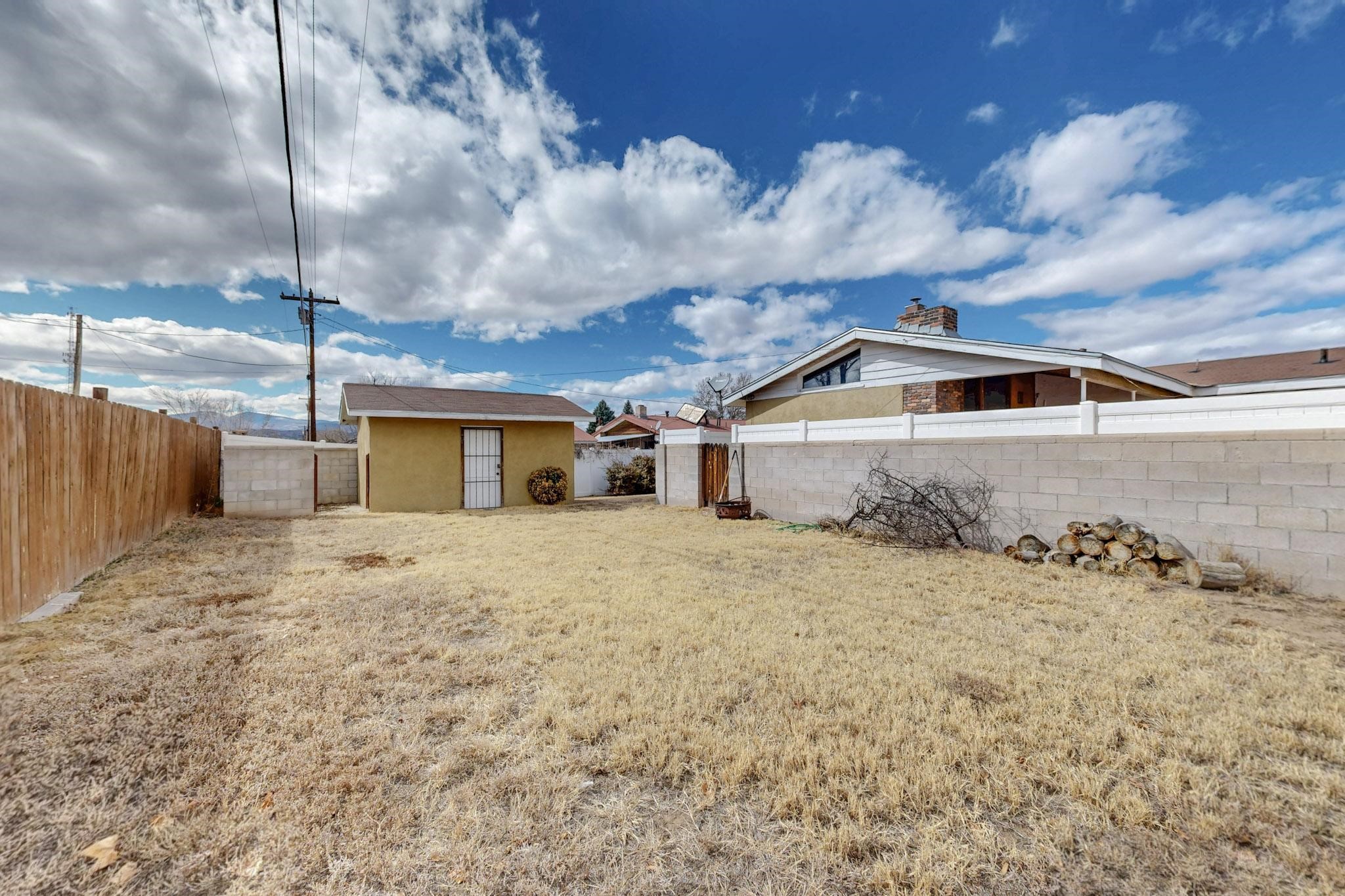 A three bedroom, two bath home and much more is now available to purchase. Entering the home through the front door, protected by a covered porch, one is welcomed by a hall leading to the 3 back bedrooms and two baths. The bedrooms are sizable, two bedrooms share one bath, but the primary bedroom is private and quite large, with a private full bath. Heading back to the front door, turning left, is a brightly lit living room /dining room area. If light does not suit you, close the drapes and enjoy a day of less light. The cozy brick fireplace is wood fired. Looking back, is the bright, well equipped kitchen, with stainless steel appliances and with adequate kitchen space to prepare all those scrumptious family meals. There is enough space for a small breakfast nook. Behind the kitchen is the laundry room, equipped with a washer and dryer. Then there is the one car garage with a garage door opener and side table for special projects..One would think this is definitely a lot of space, when considering the price of the home, but there is so much more. Walking back to the living room, down a step, is a large bonus, family room, with a brick gas fired fireplace, with bancos, (built in sitting space) on each side of the massive fireplace. This room opens up to a side covered flagstone porch/patio, with a wood fired, outside fire place, along with a quite large, enclosed back and side yard. There is still so much land that encompasses the home, that includes a side yard with a storage unit, and front driveway, from street to the garage. An amazing home that still has more to offer, like wood flooring, sets on a large, corner city lot, central refrigerated air unit, access to shopping and dining, and is minutes away from Los Alamos, Santa Fe, Taos, and Abiquiu. Don't miss out on this home, it is priced right, centrally located.
