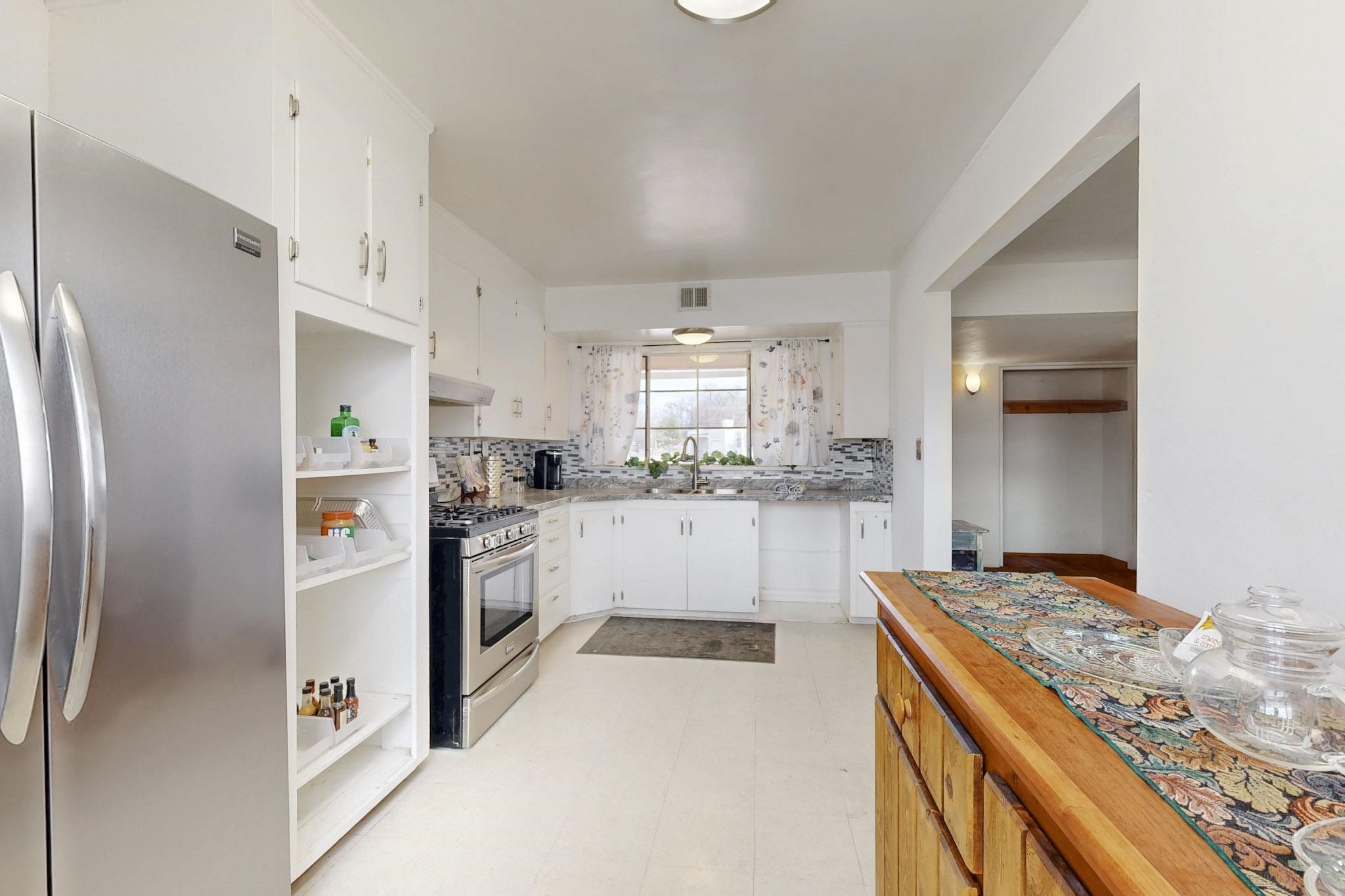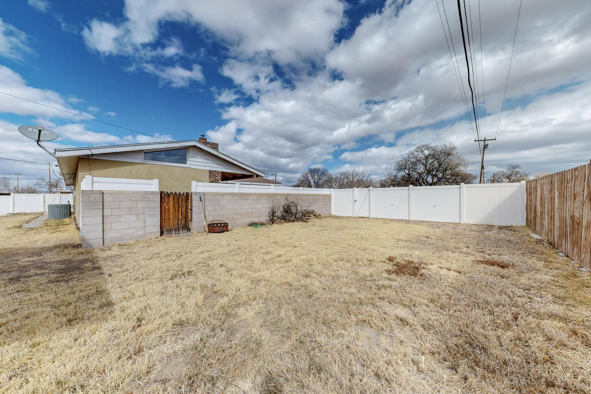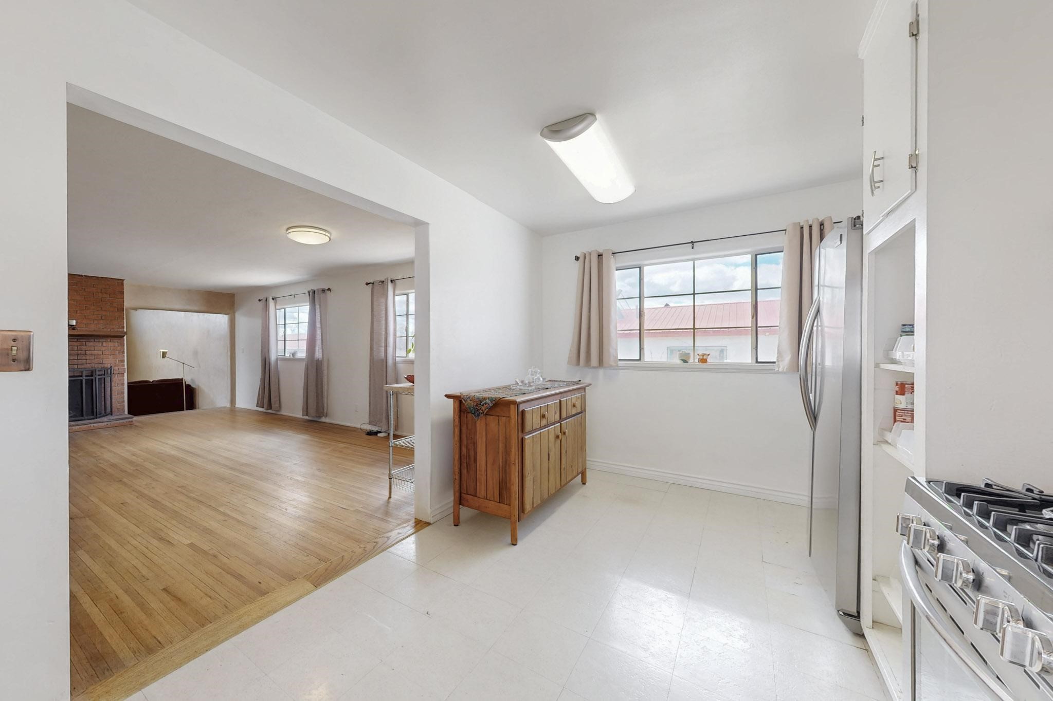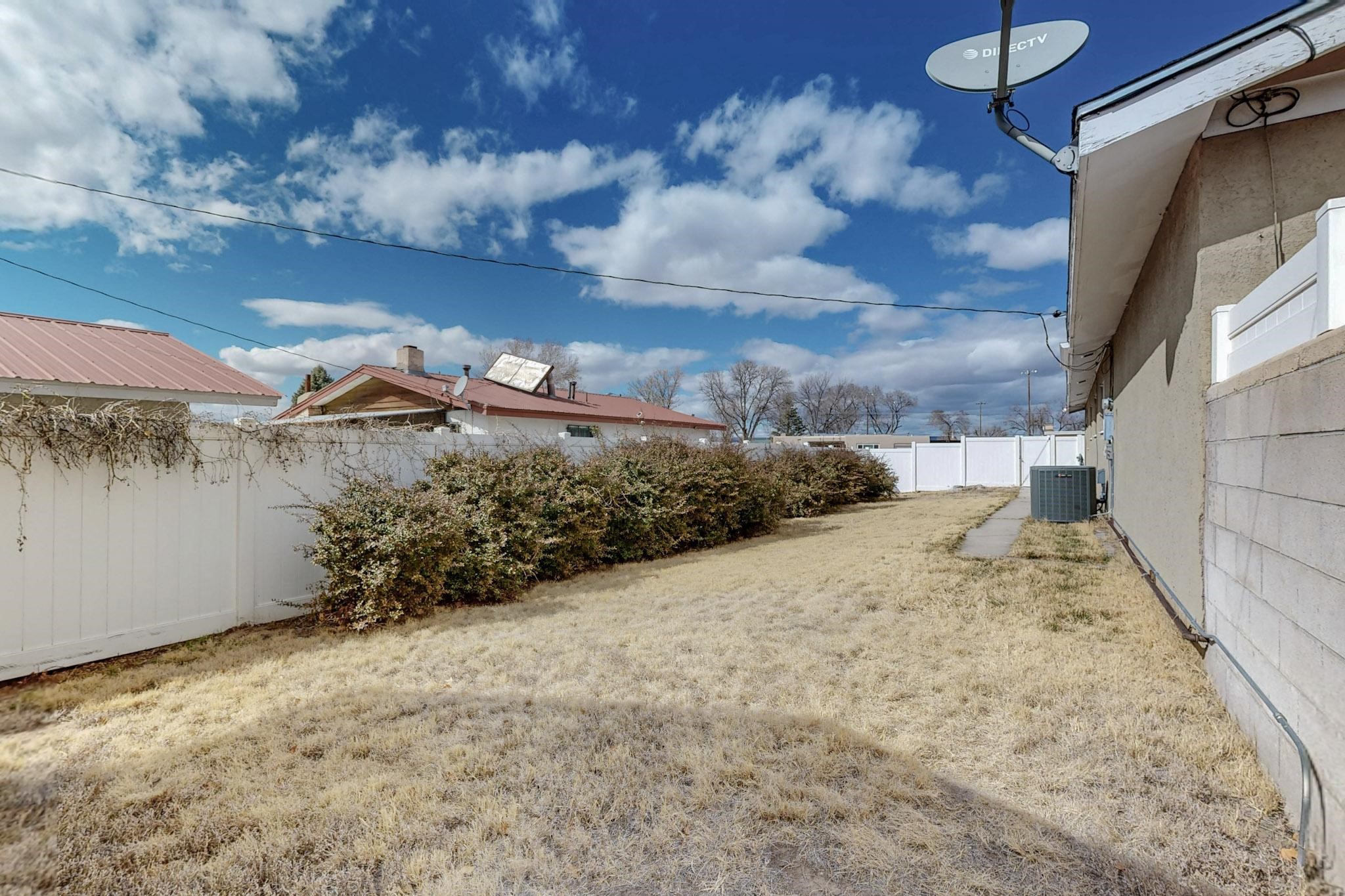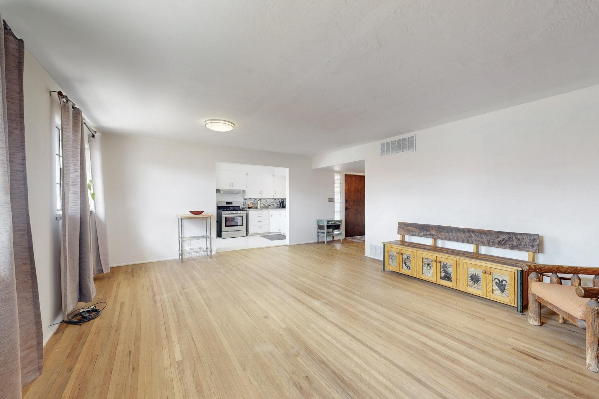 A three bedroom, two bath home and much more is now available to purchase. Entering the home through the front door, protected by a covered porch, one is welcomed by a hall leading to the 3 back bedrooms and two baths. The bedrooms are sizable, two bedrooms share one bath, but the primary bedroom is private and quite large, with a private full bath. Heading back to the front door, turning left, is a brightly lit living room /dining room area. If light does not suit you, close the drapes and enjoy a day of less light. The cozy brick fireplace is wood fired. Looking back, is the bright, well equipped kitchen, with stainless steel appliances and with adequate kitchen space to prepare all those scrumptious family meals. There is enough space for a small breakfast nook. Behind the kitchen is the laundry room, equipped with a washer and dryer. Then there is the one car garage with a garage door opener and side table for special projects..One would think this is definitely a lot of space, when considering the price of the home, but there is so much more. Walking back to the living room, down a step, is a large bonus, family room, with a brick gas fired fireplace, with bancos, (built in sitting space) on each side of the massive fireplace. This room opens up to a side covered flagstone porch/patio, with a wood fired, outside fire place, along with a quite large, enclosed back and side yard. There is still so much land that encompasses the home, that includes a side yard with a storage unit, and front driveway, from street to the garage. An amazing home that still has more to offer, like wood flooring, sets on a large, corner city lot, central refrigerated air unit, access to shopping and dining, and is minutes away from Los Alamos, Santa Fe, Taos, and Abiquiu. Don't miss out on this home, it is priced right, centrally located.