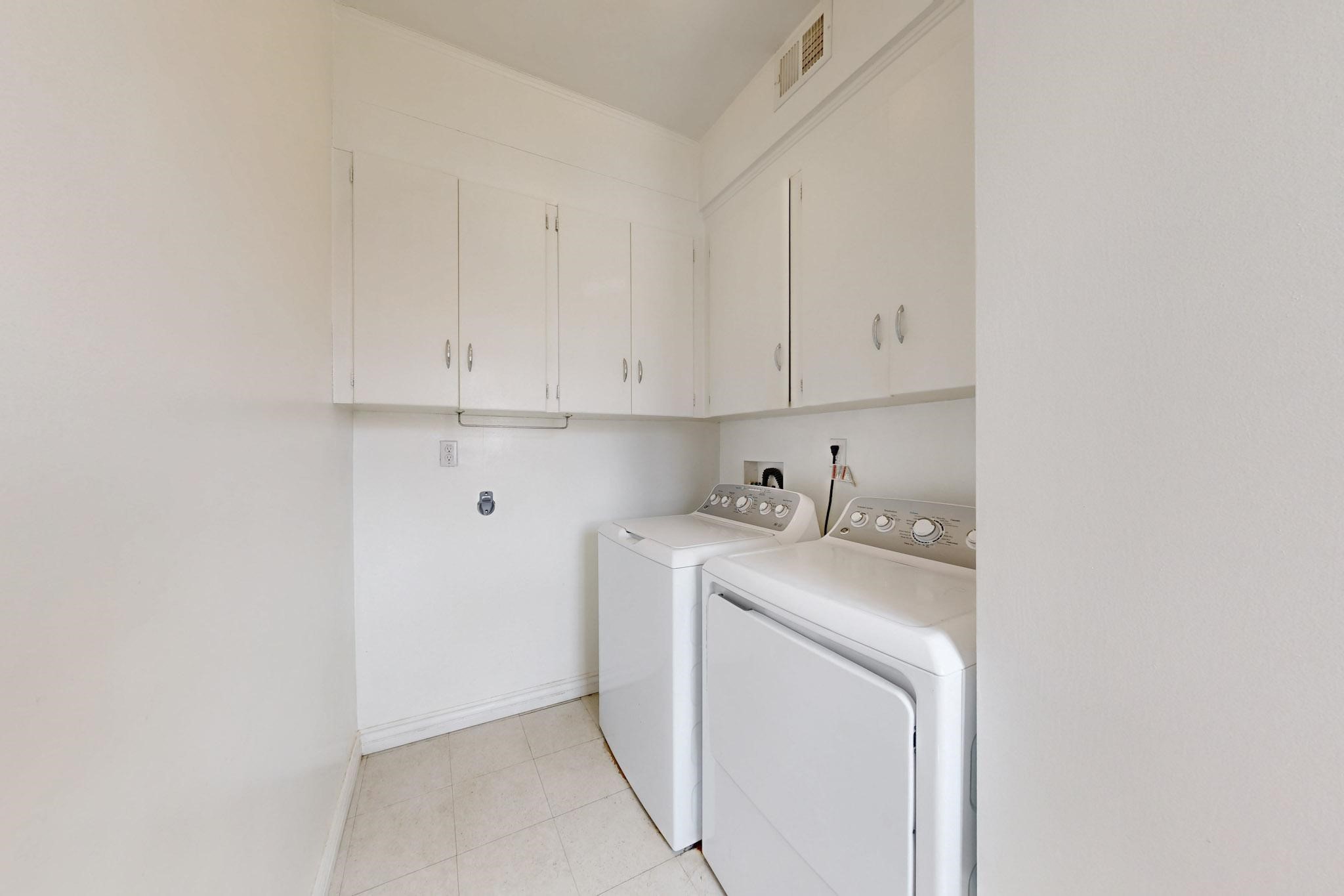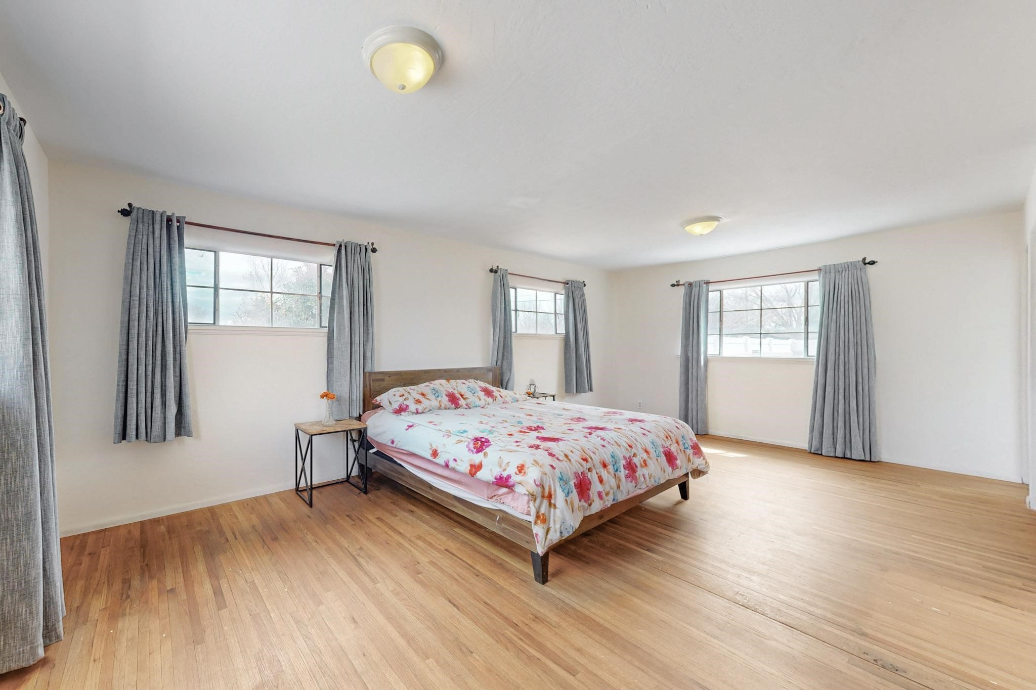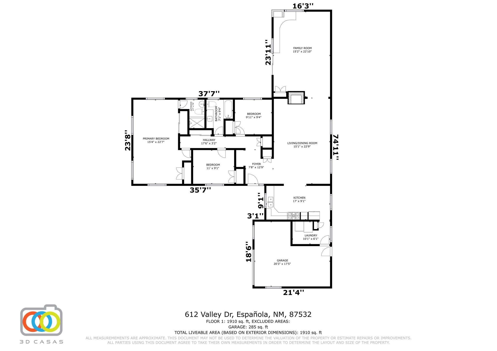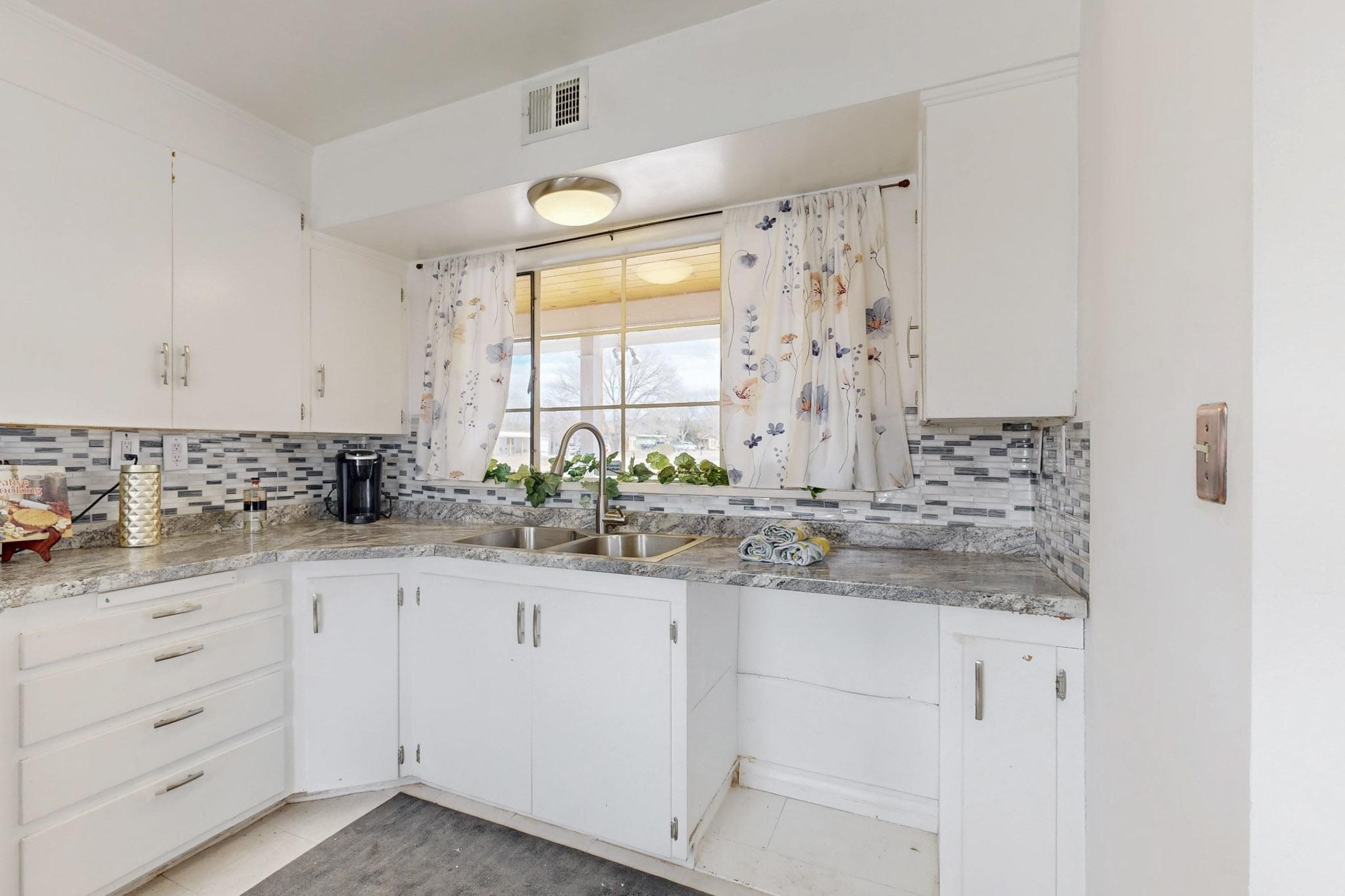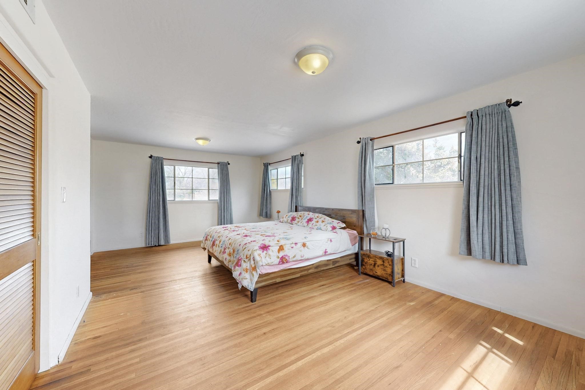 A three bedroom, two bath home and much more is now available to purchase. Entering the home through the front door, protected by a covered porch, one is welcomed by a hall leading to the 3 back bedrooms and two baths. The bedrooms are sizable, two bedrooms share one bath, but the primary bedroom is private and quite large, with a private full bath. Heading back to the front door, turning left, is a brightly lit living room /dining room area. If light does not suit you, close the drapes and enjoy a day of less light. The cozy brick fireplace is wood fired. Looking back, is the bright, well equipped kitchen, with stainless steel appliances and with adequate kitchen space to prepare all those scrumptious family meals. There is enough space for a small breakfast nook. Behind the kitchen is the laundry room, equipped with a washer and dryer. Then there is the one car garage with a garage door opener and side table for special projects..One would think this is definitely a lot of space, when considering the price of the home, but there is so much more. Walking back to the living room, down a step, is a large bonus, family room, with a brick gas fired fireplace, with bancos, (built in sitting space) on each side of the massive fireplace. This room opens up to a side covered flagstone porch/patio, with a wood fired, outside fire place, along with a quite large, enclosed back and side yard. There is still so much land that encompasses the home, that includes a side yard with a storage unit, and front driveway, from street to the garage. An amazing home that still has more to offer, like wood flooring, sets on a large, corner city lot, central refrigerated air unit, access to shopping and dining, and is minutes away from Los Alamos, Santa Fe, Taos, and Abiquiu. Don't miss out on this home, it is priced right, centrally located.