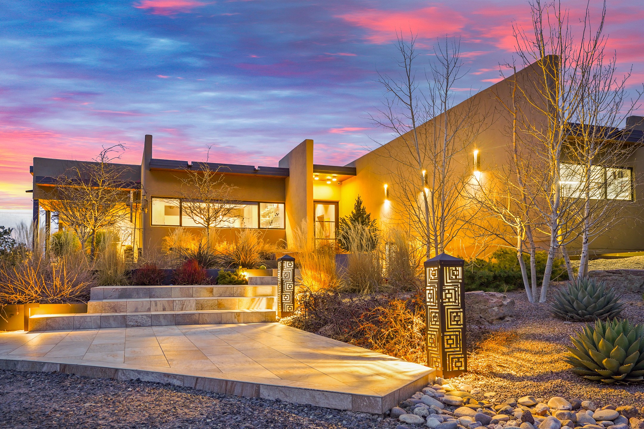 Step into this supremely livable and private, award-winning masterpiece filled with extraordinary features and amazing views just minutes from Las Campanas and town. Modern elegance & comfort await you as you enter this single-level home. Wood, glass & steel blend flawlessly to create an interior space with clean lines & abundant natural light. Amenities of the generous gourmet kitchen include an induction cooktop, dual Fisher & Paykel ovens & refrigerators, 2 dishwashers & 2 sinks, as well as a wine fridge & Scotsman Brilliance nugget ice machine. Remote controlled blinds, Lutron Caseta light switches, a Sonos wired sound system throughout, a Nest temperature system & cameras operated by smartphone or computer enhance further the comfort & livability of this age-in-place home. At the end of the day, enjoy the view as you linger in the luxurious BainUltra soaking tub with air-jet technology. An easily accessible three-car garage with geothermal heating & epoxy floor also houses a woodworking/craft area. Perfectly situated on 2.5 elevated acres with sweeping views of four mountain ranges, the home boasts a gorgeous portal designed for gracious outdoor living & entertaining. Additional charming outdoor areas allow you to relax as you take in the breathtaking vistas & savor the award-winning landscaping that includes two fountains. Winner of the 2021 Parade of Homes Ted Swisher Green Building Award, this stunning home also swept the awards for Best Overall Design, Best Craftsmanship & Best Kitchen. That says it all. Arriving at the magnificent entryway atop the circular drive confirms that this is a smartly designed, luxurious, sophisticated home not to be missed.
