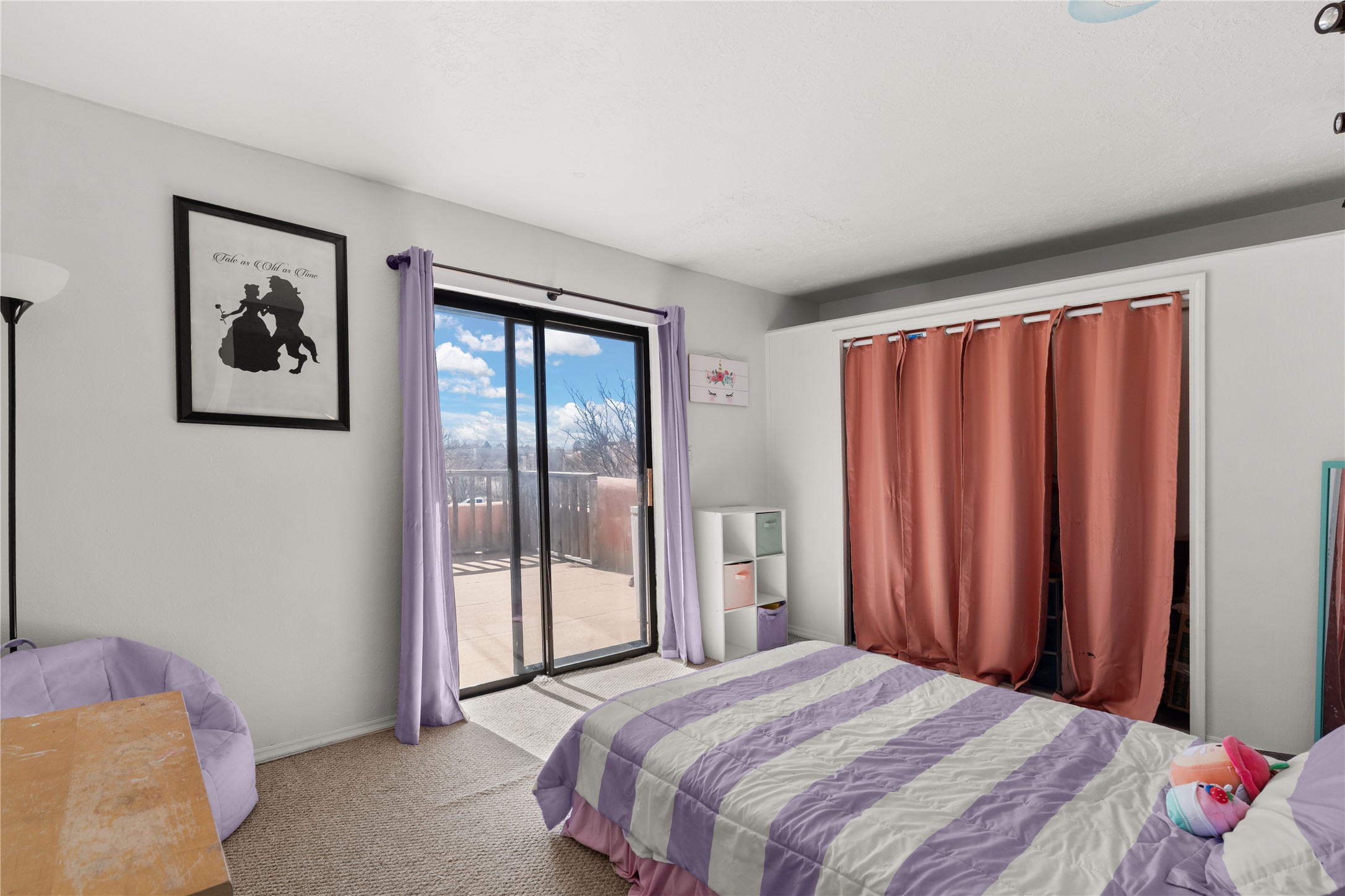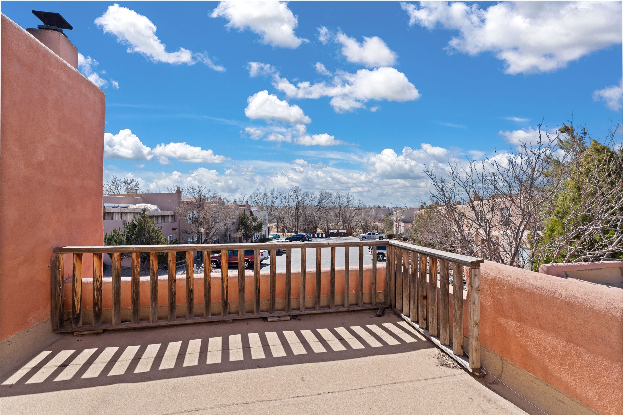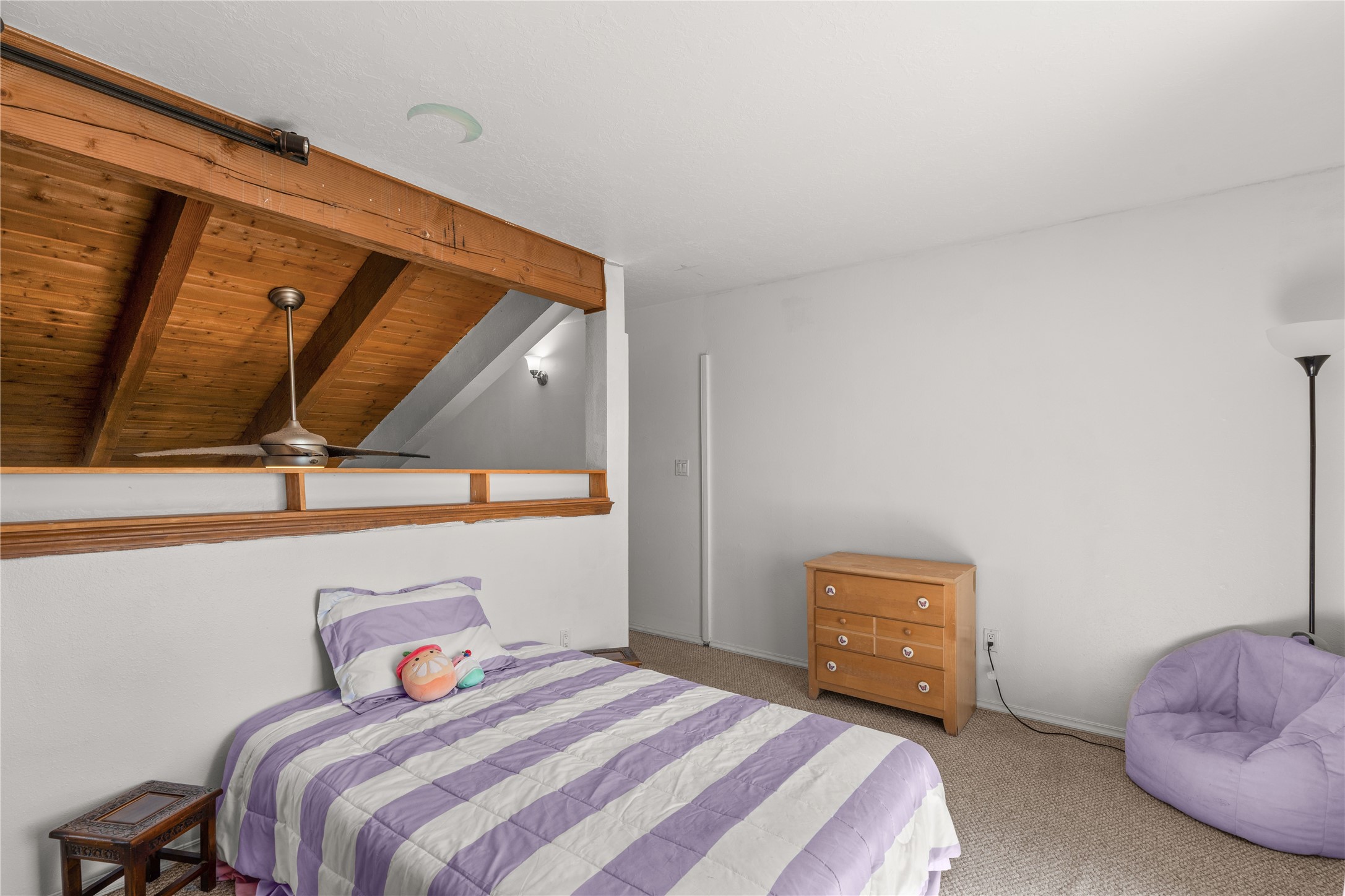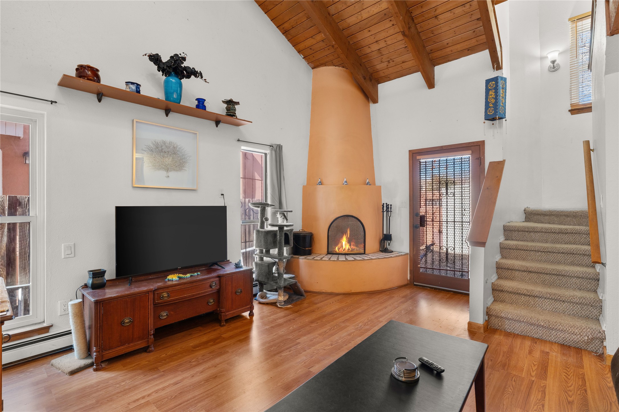 The Las Americas development is a quiet, cul-de-sac community tucked away beneath mature trees, walking trails, and convenient to shopping / amenities. This unit is two-story, with one bedroom and full bath downstairs and a bedroom loft with a south facing deck upstairs. The living room offers an inviting kiva fireplace, laminate "wood" floors and access to the back yard complete with a raised vegetable bed and storage shed. All units come with dedicated parking (two for this unit). All appliances stay with the unit including washer and dryer. A great value in what is currently the lowest priced unit in the development.