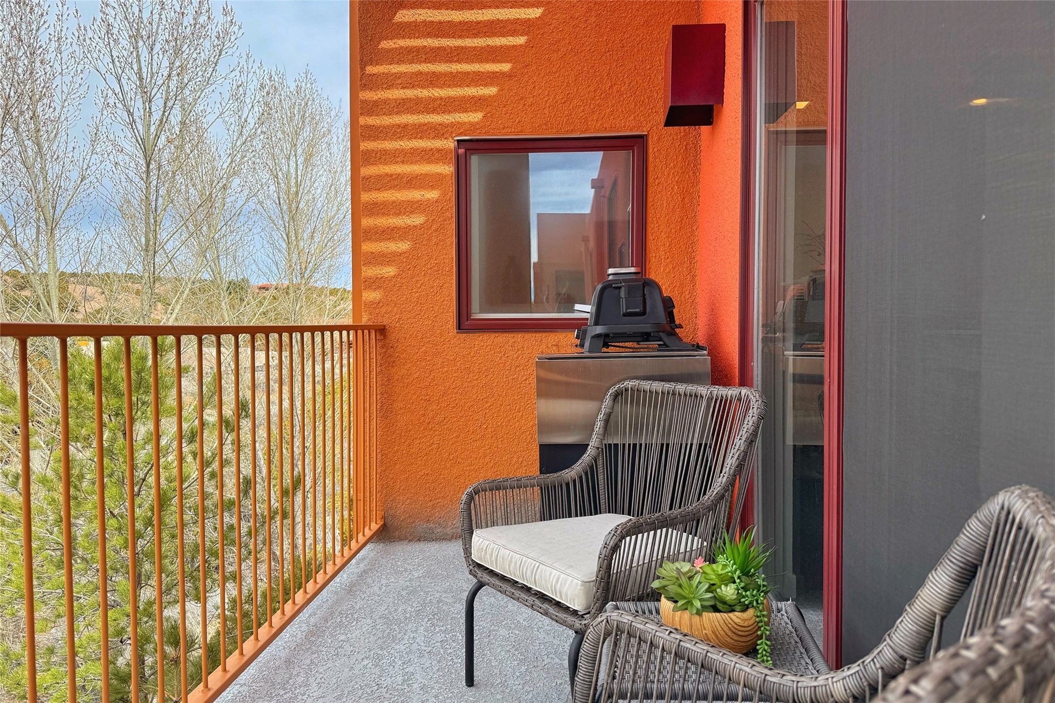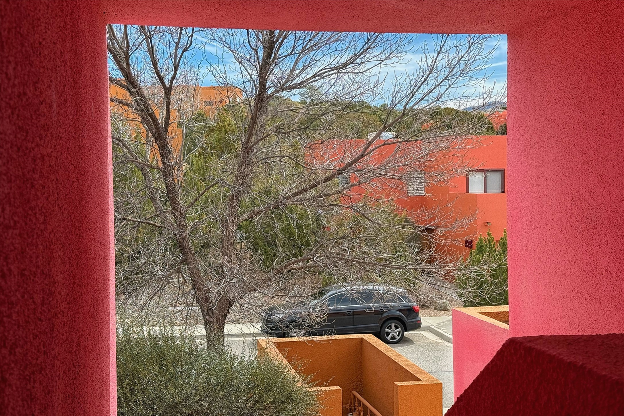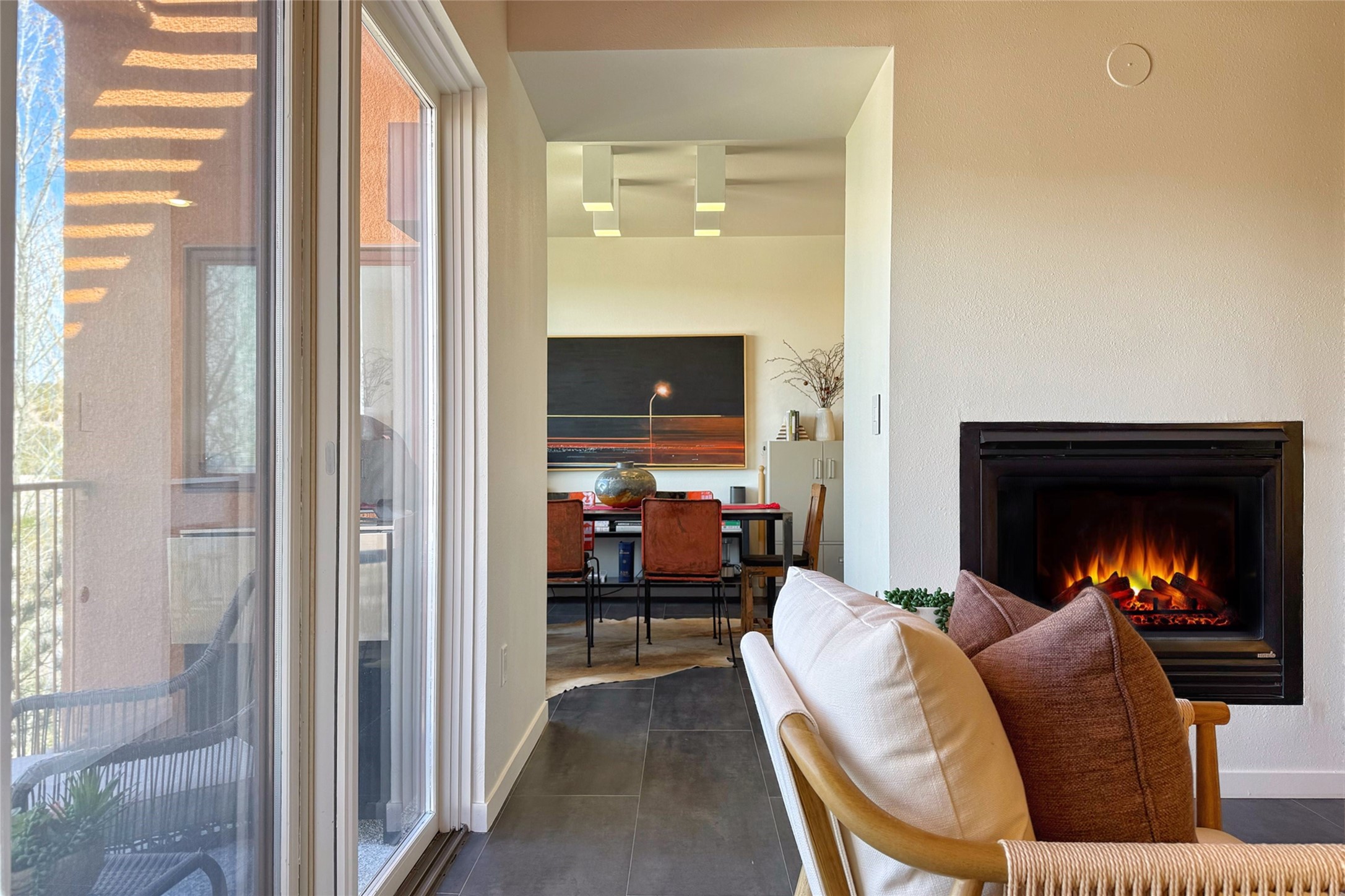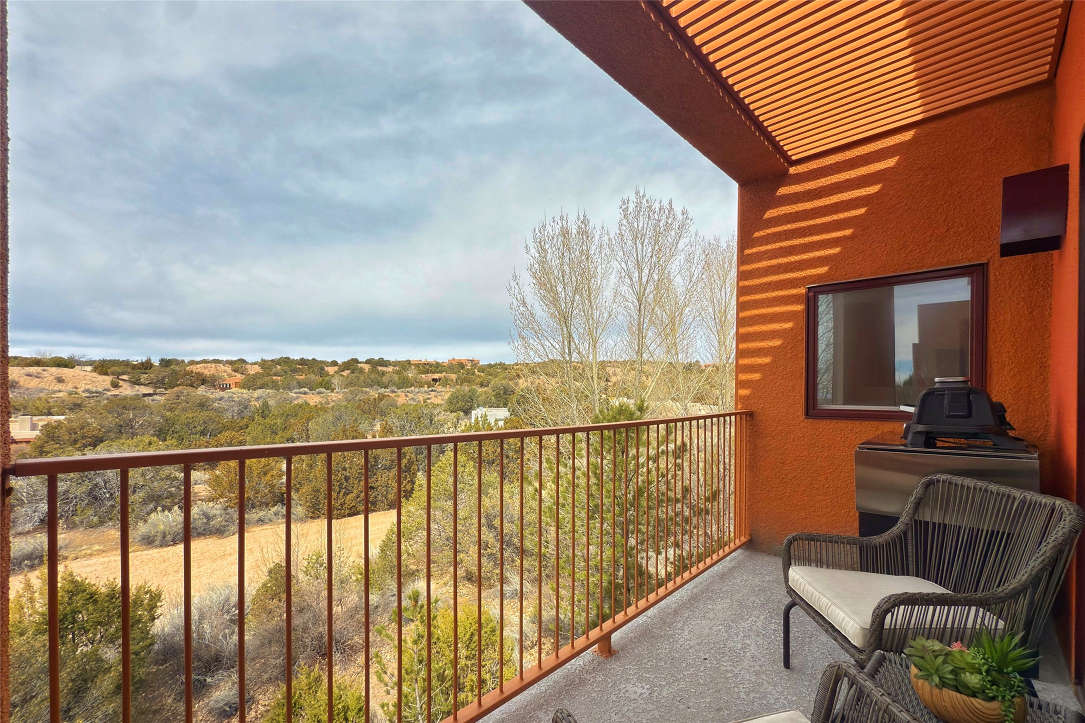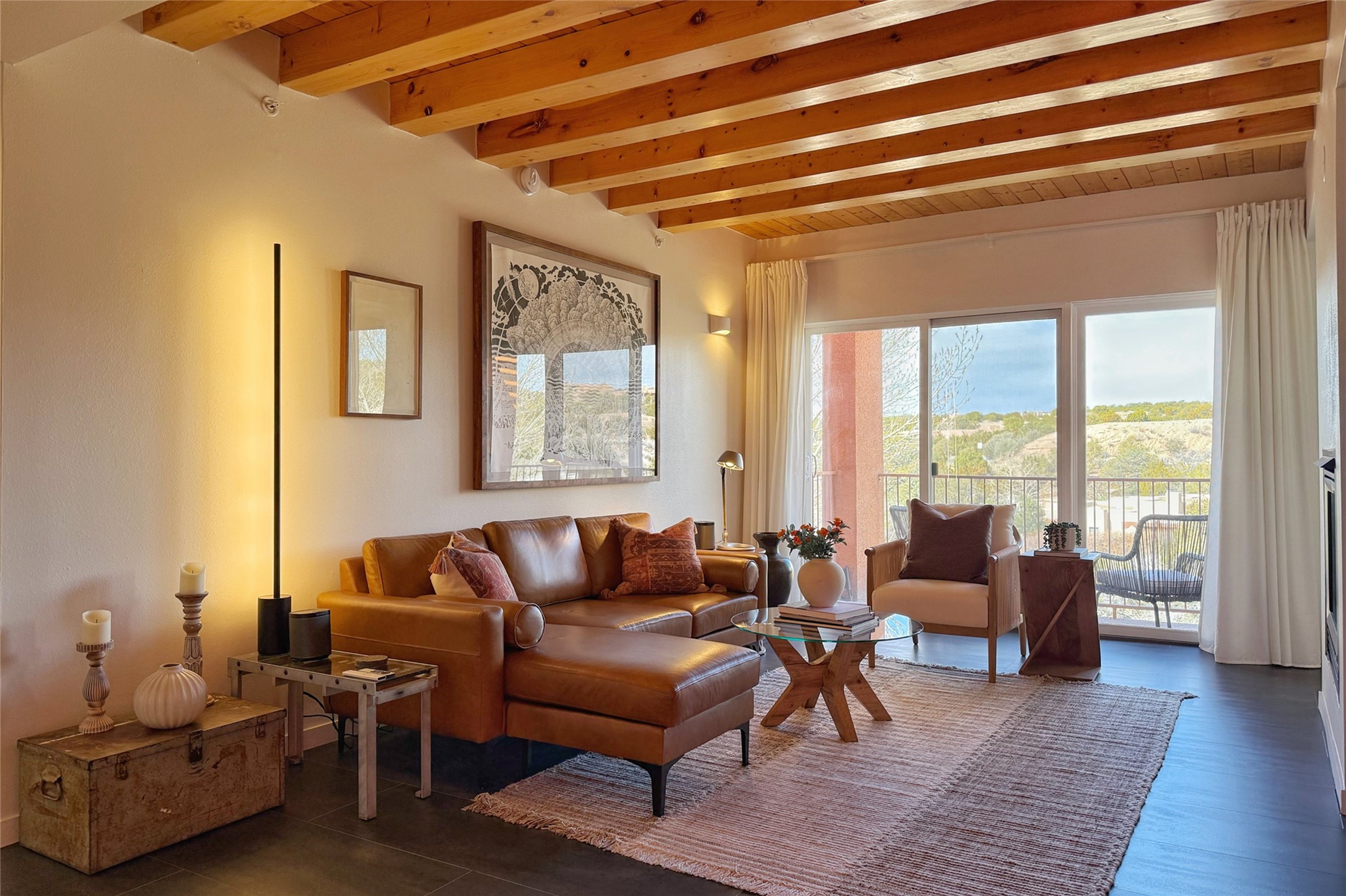The nicest unit in Zocalo, spectacular views, superior patios, tastefully updated contemporary three bedroom, two bath condominium in Zocalo designed by award-winning architect Ricardo Legorreta. Light-filled, second-level home offers massive western views overlooking the natural arroyo and hillsides and eastern views that include Atalaya peak in the distance. New, giant picture windows do indeed make pictures of the surrounding classic Santa Fe colored landscape and skies so close you can almost touch! Updates include new insulated windows, remote controlled shades, new flooring and paint throughout, new stainless steel appliances and washer and dryer, updated kitchen with chef's appliances and bathrooms with solid surface counters, programmable lighting, Legrand switch and outlet covers, on-demand tankless hot water heater, new deck and refinished balcony. Community amenities include two fitness facilities, pool, hot tub, and clubhouse. Newly completed trail for walking and biking connects to the city trail system. Large garage with EV charger. Close to town yet far from the hustle and bustle, quiet and serene yet vibrant and alive! Check out the video and take the virtual tour!
