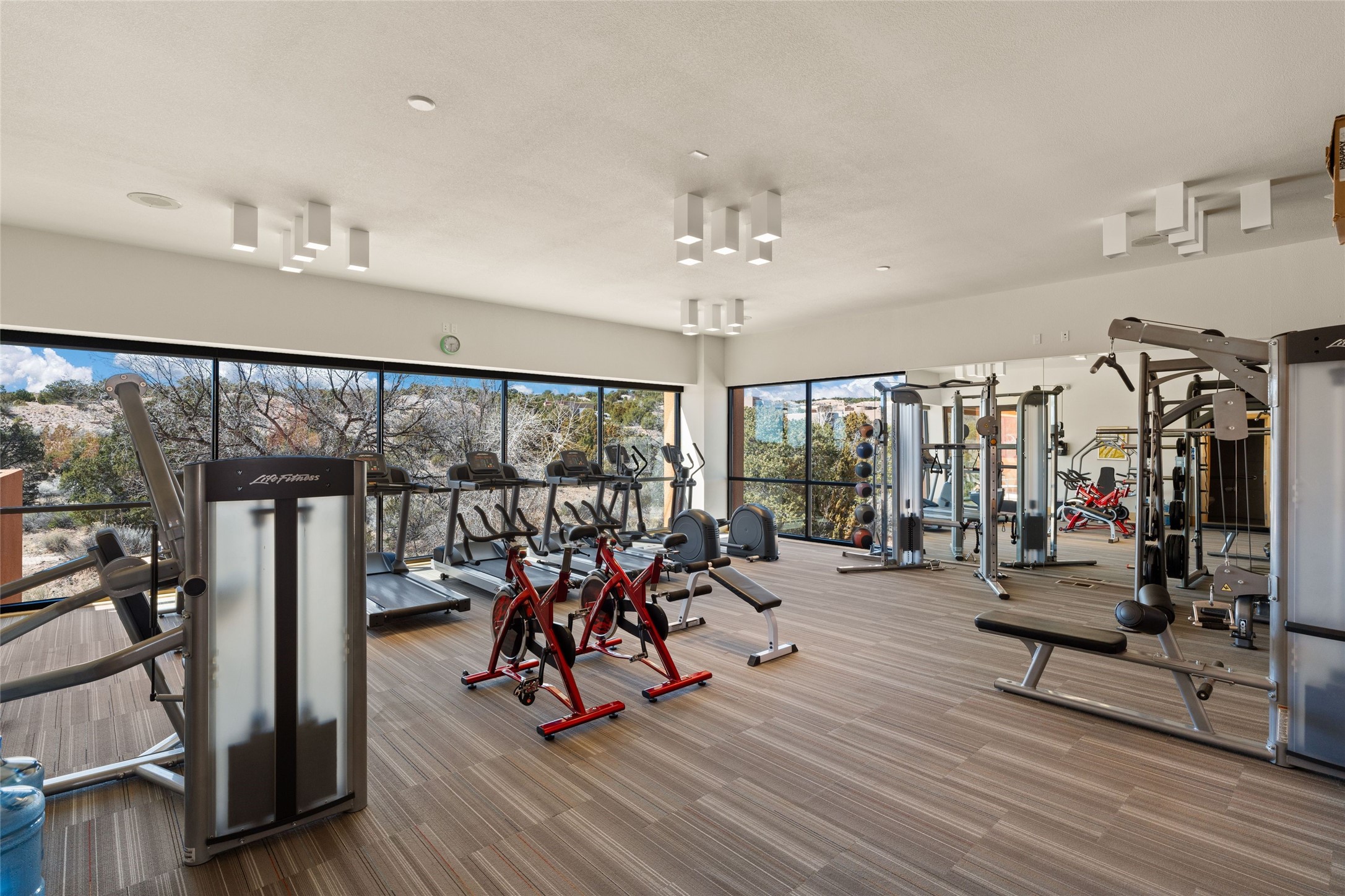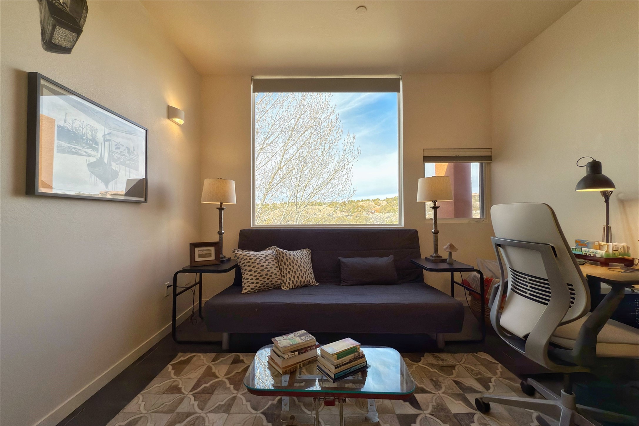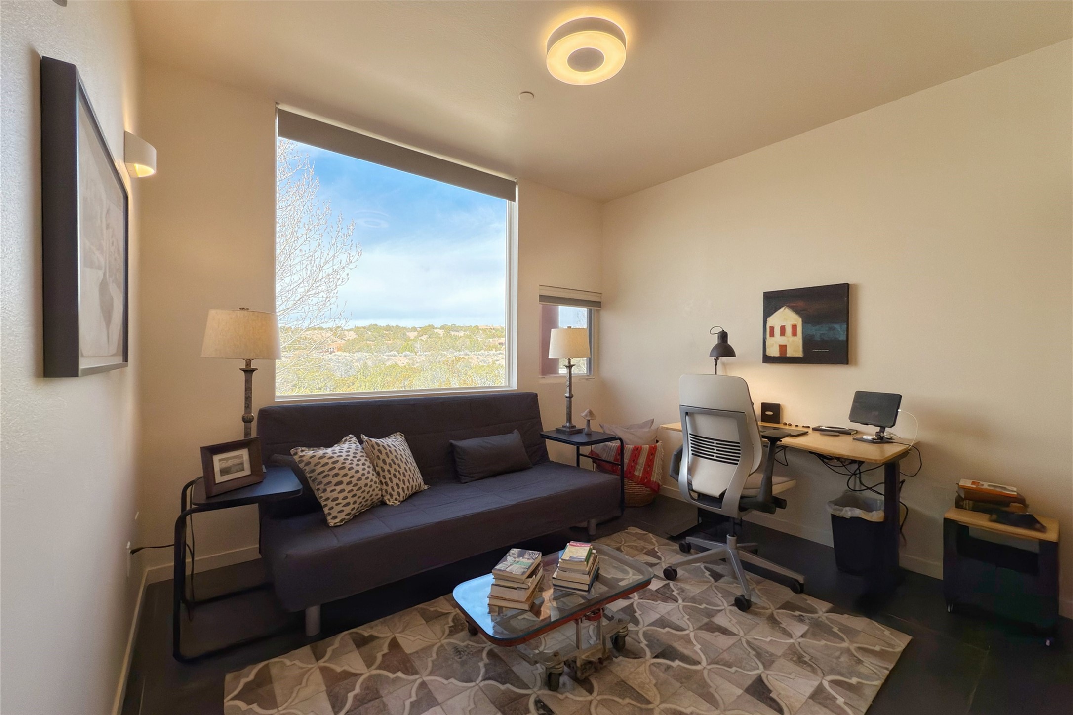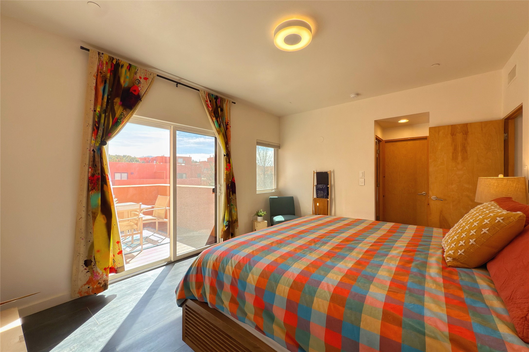 The nicest unit in Zocalo, spectacular views, superior patios, tastefully updated contemporary three bedroom, two bath condominium in Zocalo designed by award-winning architect Ricardo Legorreta. Light-filled, second-level home offers massive western views overlooking the natural arroyo and hillsides and eastern views that include Atalaya peak in the distance. New, giant picture windows do indeed make pictures of the surrounding classic Santa Fe colored landscape and skies so close you can almost touch! Updates include new insulated windows, remote controlled shades, new flooring and paint throughout, new stainless steel appliances and washer and dryer, updated kitchen with chef's appliances and bathrooms with solid surface counters, programmable lighting, Legrand switch and outlet covers, on-demand tankless hot water heater, new deck and refinished balcony. Community amenities include two fitness facilities, pool, hot tub, and clubhouse. Newly completed trail for walking and biking connects to the city trail system. Large garage with EV charger. Close to town yet far from the hustle and bustle, quiet and serene yet vibrant and alive! Check out the video and take the virtual tour!