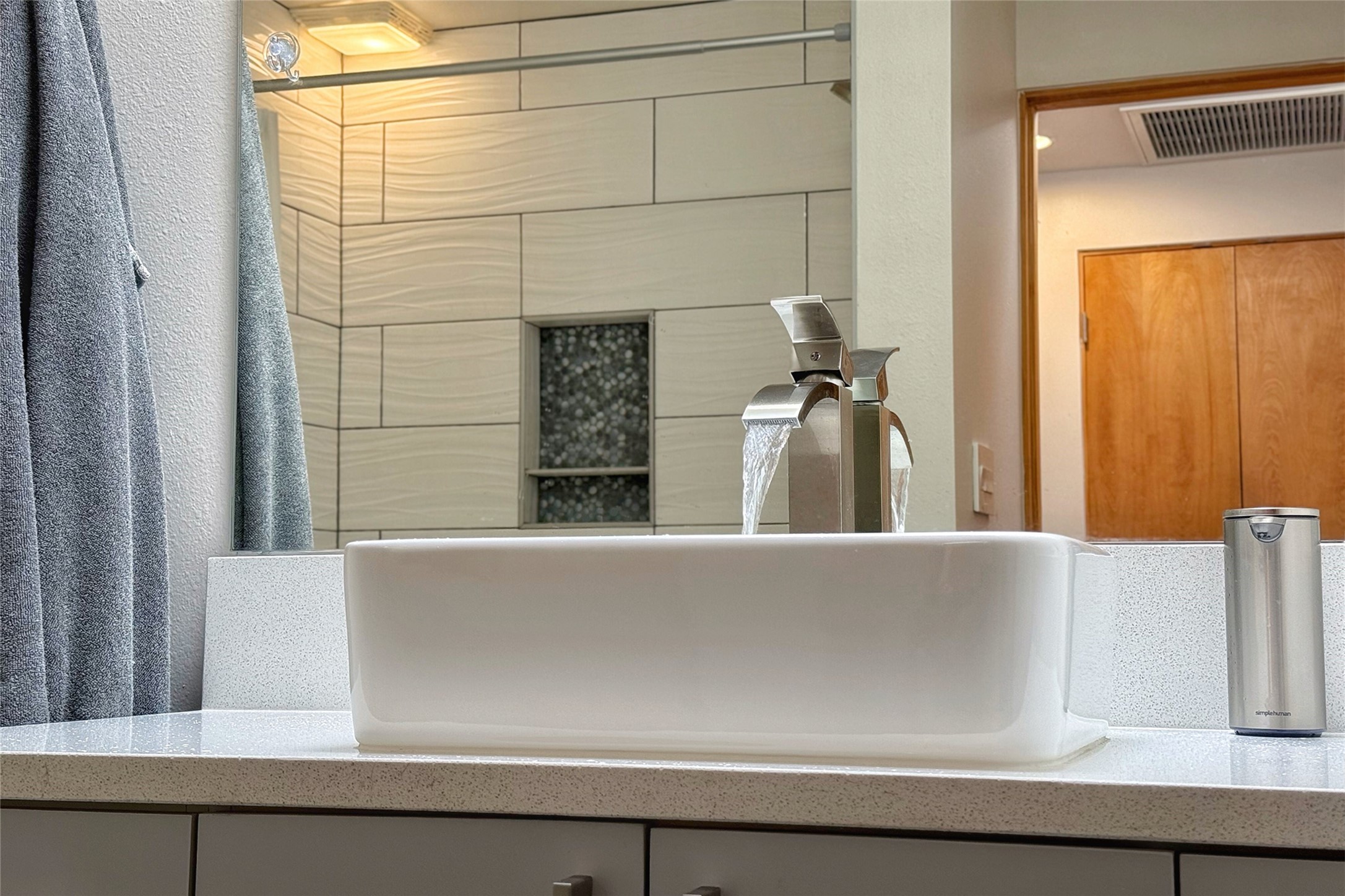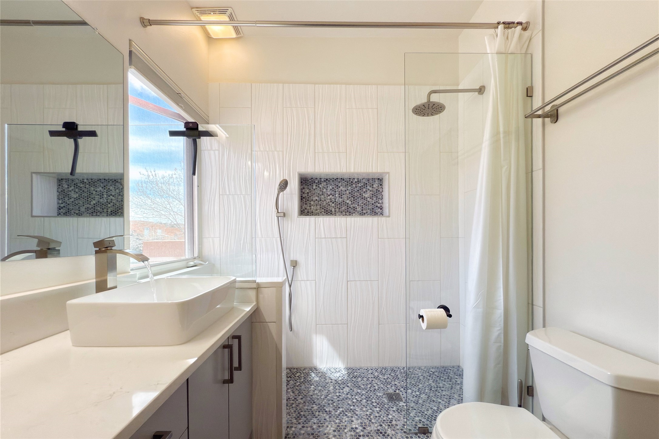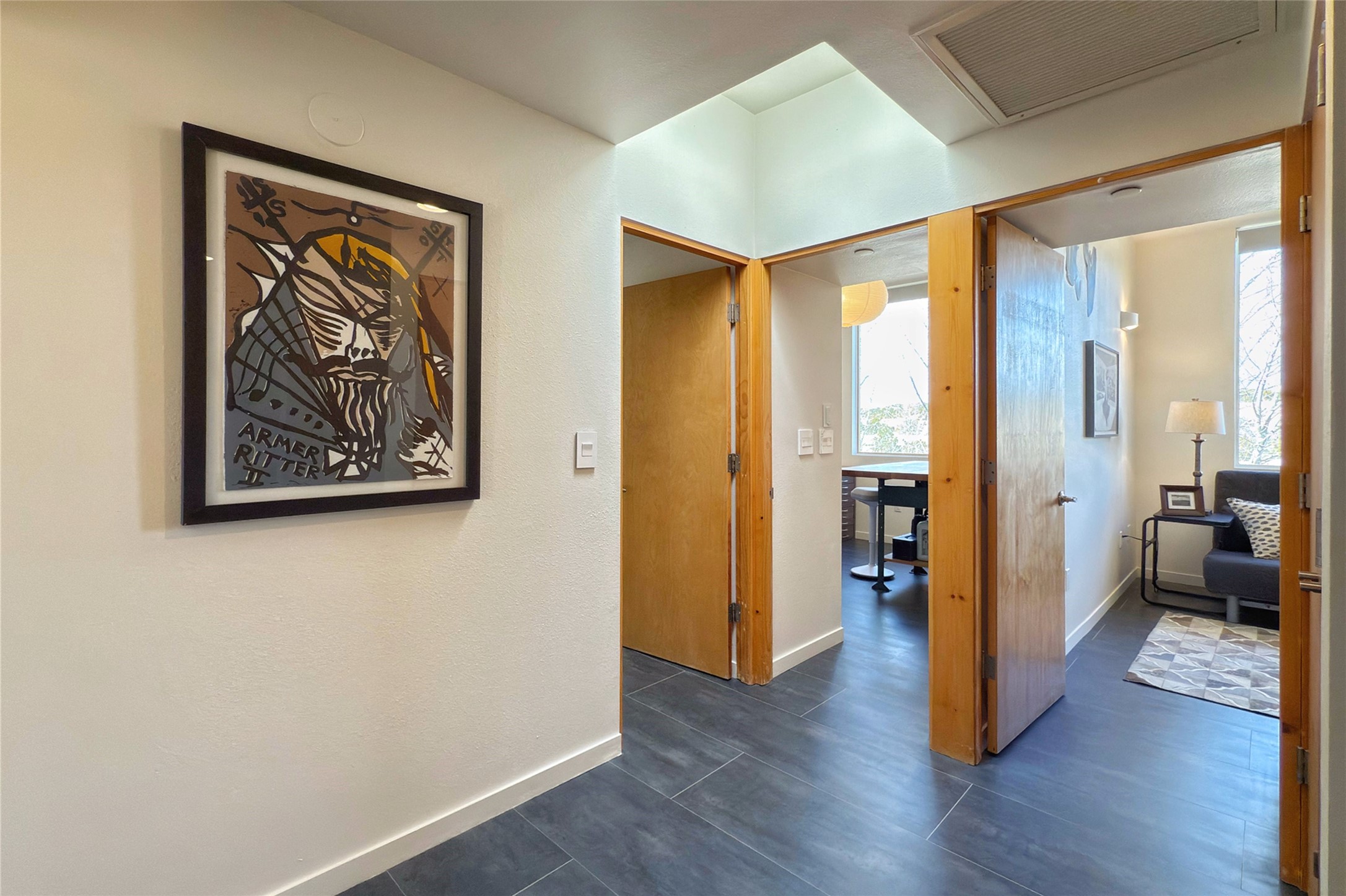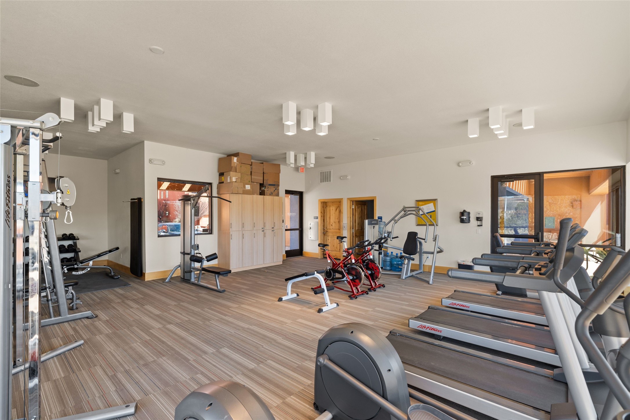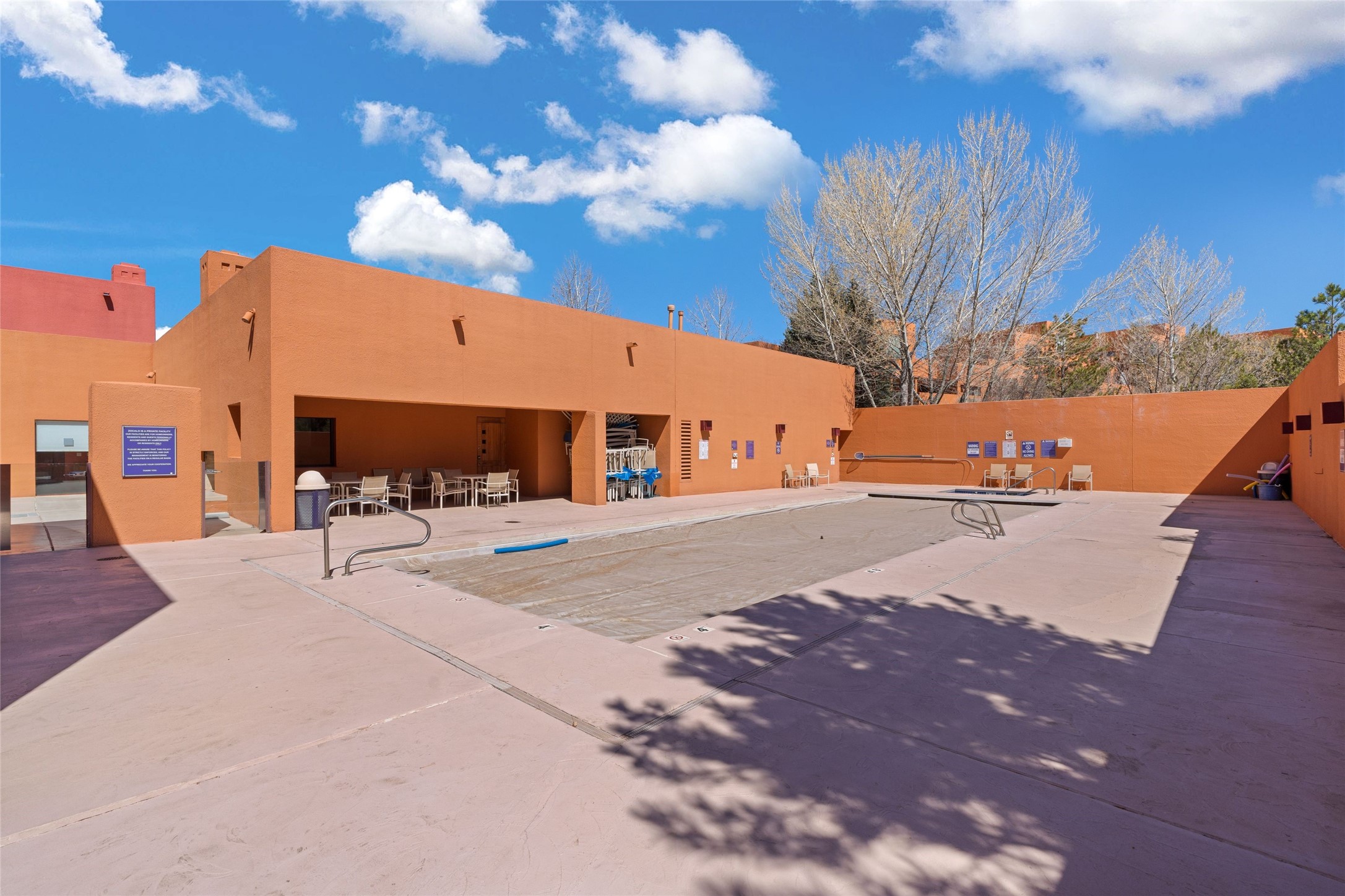 The nicest unit in Zocalo, spectacular views, superior patios, tastefully updated contemporary three bedroom, two bath condominium in Zocalo designed by award-winning architect Ricardo Legorreta. Light-filled, second-level home offers massive western views overlooking the natural arroyo and hillsides and eastern views that include Atalaya peak in the distance. New, giant picture windows do indeed make pictures of the surrounding classic Santa Fe colored landscape and skies so close you can almost touch! Updates include new insulated windows, remote controlled shades, new flooring and paint throughout, new stainless steel appliances and washer and dryer, updated kitchen with chef's appliances and bathrooms with solid surface counters, programmable lighting, Legrand switch and outlet covers, on-demand tankless hot water heater, new deck and refinished balcony. Community amenities include two fitness facilities, pool, hot tub, and clubhouse. Newly completed trail for walking and biking connects to the city trail system. Large garage with EV charger. Close to town yet far from the hustle and bustle, quiet and serene yet vibrant and alive! Check out the video and take the virtual tour!