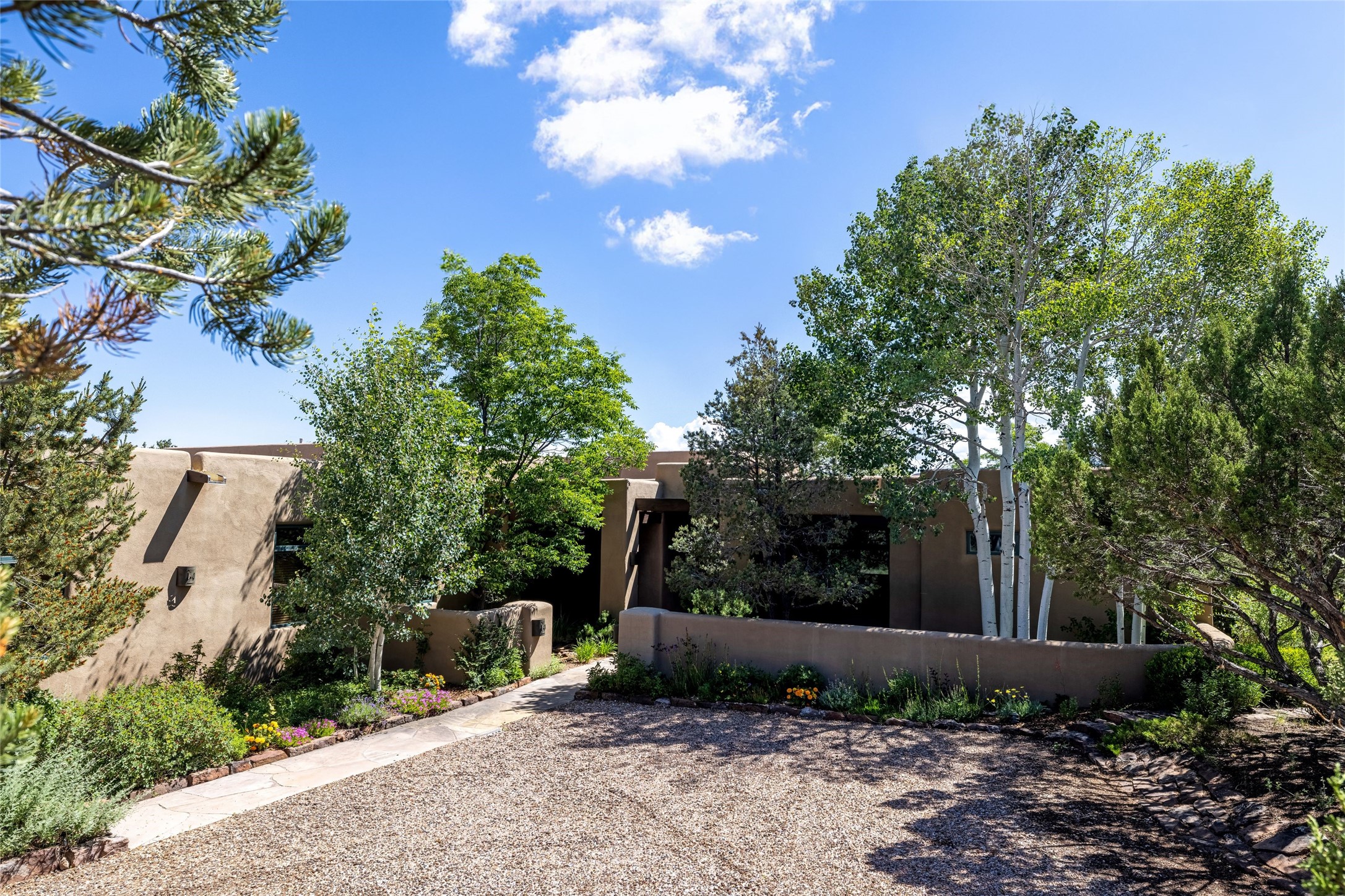 Welcome to 5 Estates Drive, an exciting home with stunning Sangre De Cristo Mountain views and a rare, flexible floor plan, featuring 4 bedrooms plus an attached studio and a heated 3-car garage. Located within the famed community of Las Campanas and sited for maximum privacy and serenity, on a 2-acre view lot, this exceptional single level home impresses with captivating design features and quality craftsmanship. Located within close proximity to the iconic Santa Fe Plaza and The Club at Las Campanas, this extraordinary home offers the ultimate blend of modern design, with the inherent warmth of an iconic Santa Fe home. Design highlights include a welcoming formal living room directly off the front entrance, with framed mountain views and an expansive casual living room with soaring ceilings, rich beams, view windows, a grand fireplace and custom built-in shelving. Ideal for entertaining, the beautifully appointed chef's kitchen with a wraparound breakfast bar, opens to the casual living room and breakfast dining area, with direct access to the outdoor dining area, built-in Viking BBQ and vast outdoor entertainment areas and gardens. The owner's suite delights with views, fireplace, backyard access and a spacious bath with a soaking tub, walk-in shower and a large walk-in closet. Adjacent to the owner's suite is an ideal office or guest bedroom, with an adjacent bath complete with a steam shower. Separate from the main living areas are 2 additional, guest bedrooms which share bath. The attached heated studio is accessed through the garage, complete with a utility sink and built-in shelving. The outdoor living experience is one of the finest, ideal for large gatherings, gardening or simply to just enjoy the vibrant gardens, fountains, surround aspens and pure tranquility. The owner's Equity Social Membership to The Club at Las Campanas is available for purchase on a separate bill of sale. This one is not to be missed and is move-in ready, just in time for summer!