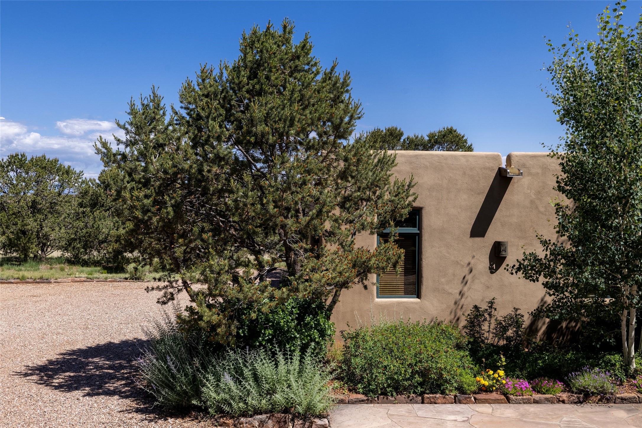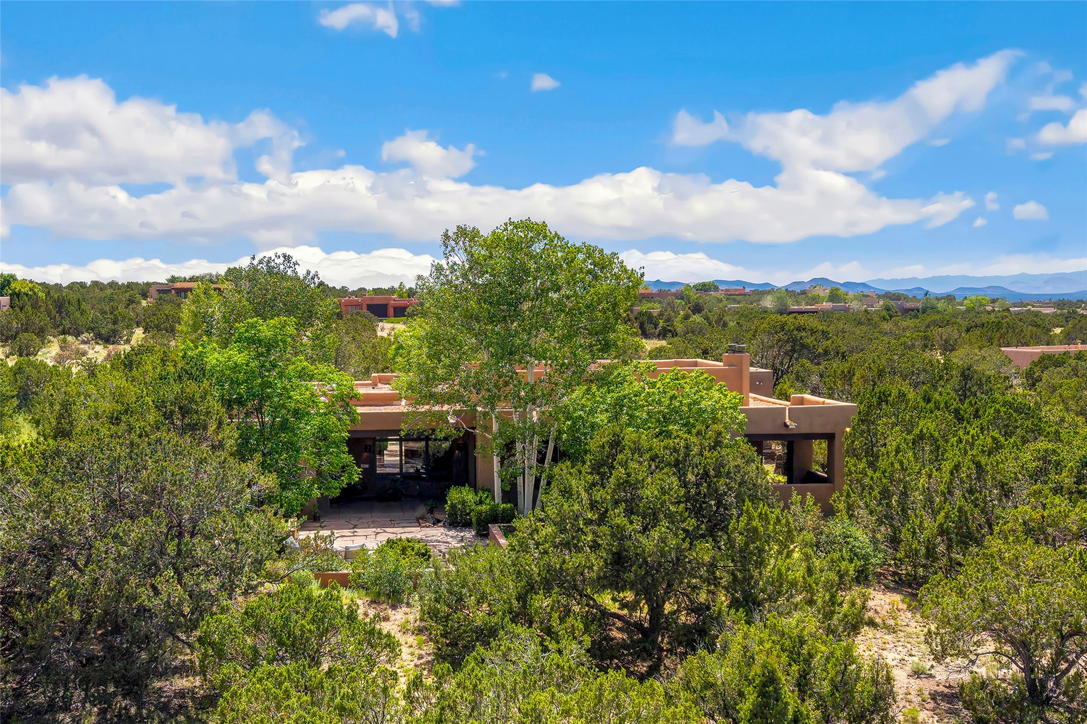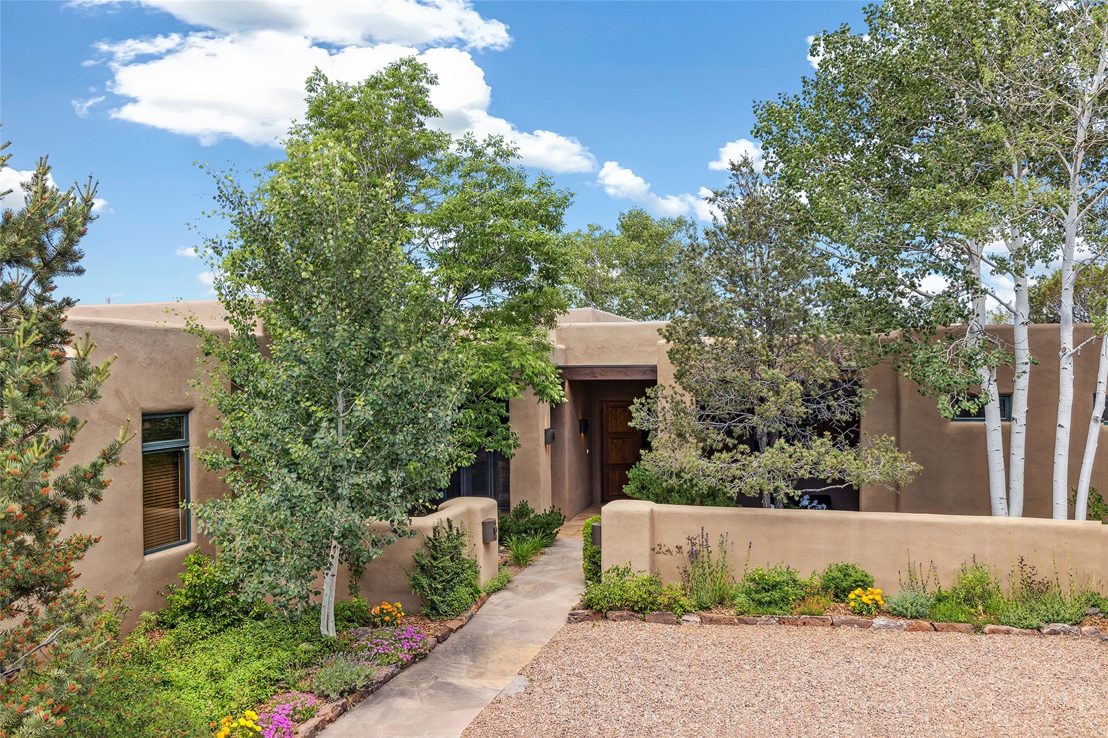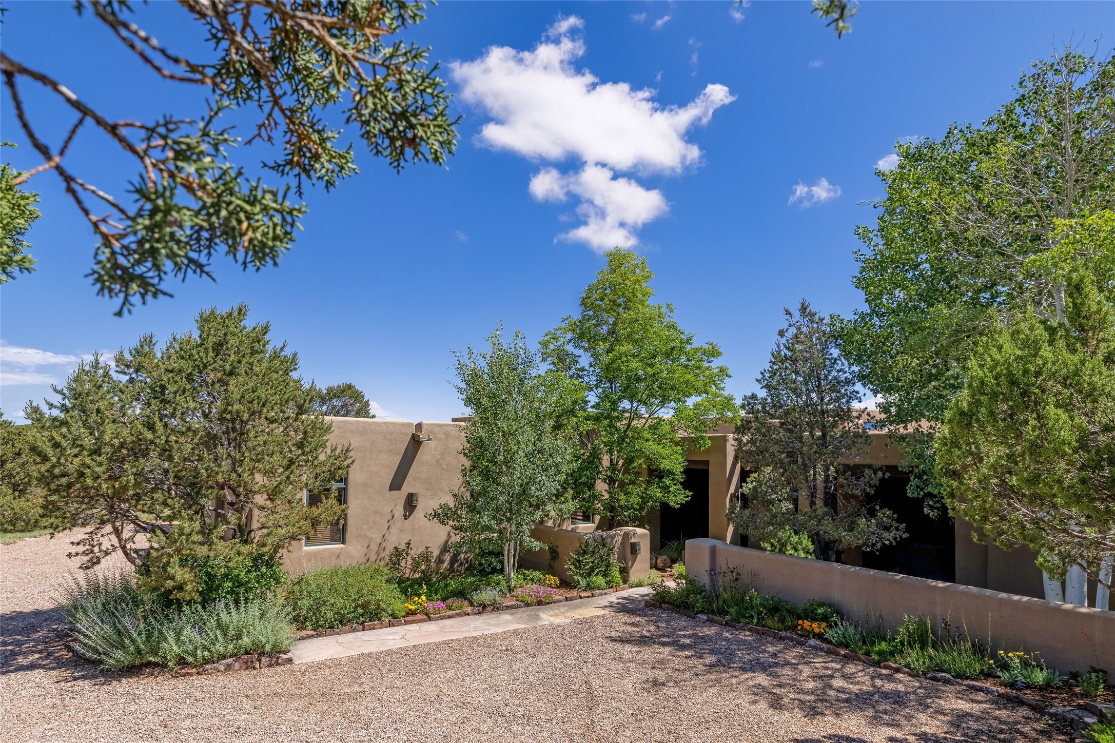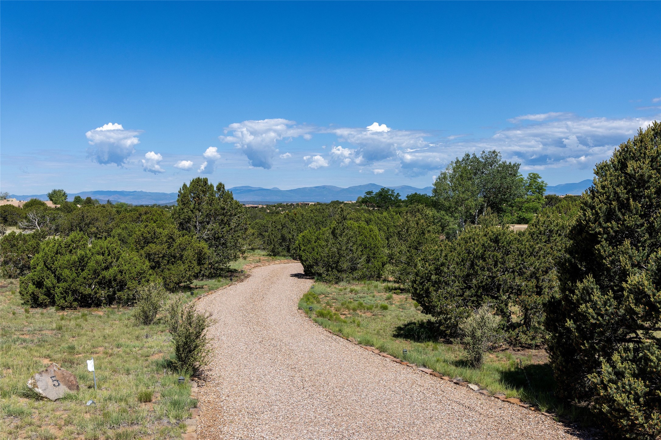 Welcome to 5 Estates Drive, an exciting home with stunning Sangre De Cristo Mountain views and a rare, flexible floor plan, featuring 4 bedrooms plus an attached studio and a heated 3-car garage. Located within the famed community of Las Campanas and sited for maximum privacy and serenity, on a 2-acre view lot, this exceptional single level home impresses with captivating design features and quality craftsmanship. Located within close proximity to the iconic Santa Fe Plaza and The Club at Las Campanas, this extraordinary home offers the ultimate blend of modern design, with the inherent warmth of an iconic Santa Fe home. Design highlights include a welcoming formal living room directly off the front entrance, with framed mountain views and an expansive casual living room with soaring ceilings, rich beams, view windows, a grand fireplace and custom built-in shelving. Ideal for entertaining, the beautifully appointed chef's kitchen with a wraparound breakfast bar, opens to the casual living room and breakfast dining area, with direct access to the outdoor dining area, built-in Viking BBQ and vast outdoor entertainment areas and gardens. The owner's suite delights with views, fireplace, backyard access and a spacious bath with a soaking tub, walk-in shower and a large walk-in closet. Adjacent to the owner's suite is an ideal office or guest bedroom, with an adjacent bath complete with a steam shower. Separate from the main living areas are 2 additional, guest bedrooms which share bath. The attached heated studio is accessed through the garage, complete with a utility sink and built-in shelving. The outdoor living experience is one of the finest, ideal for large gatherings, gardening or simply to just enjoy the vibrant gardens, fountains, surround aspens and pure tranquility. The owner's Equity Social Membership to The Club at Las Campanas is available for purchase on a separate bill of sale. This one is not to be missed and is move-in ready, just in time for summer!