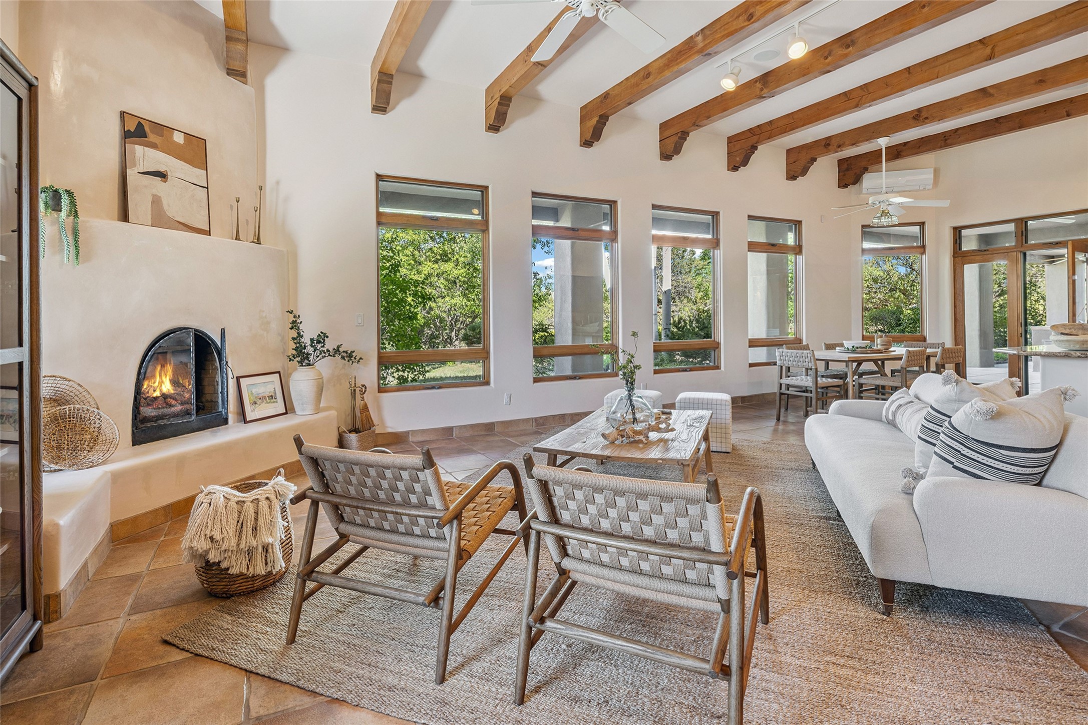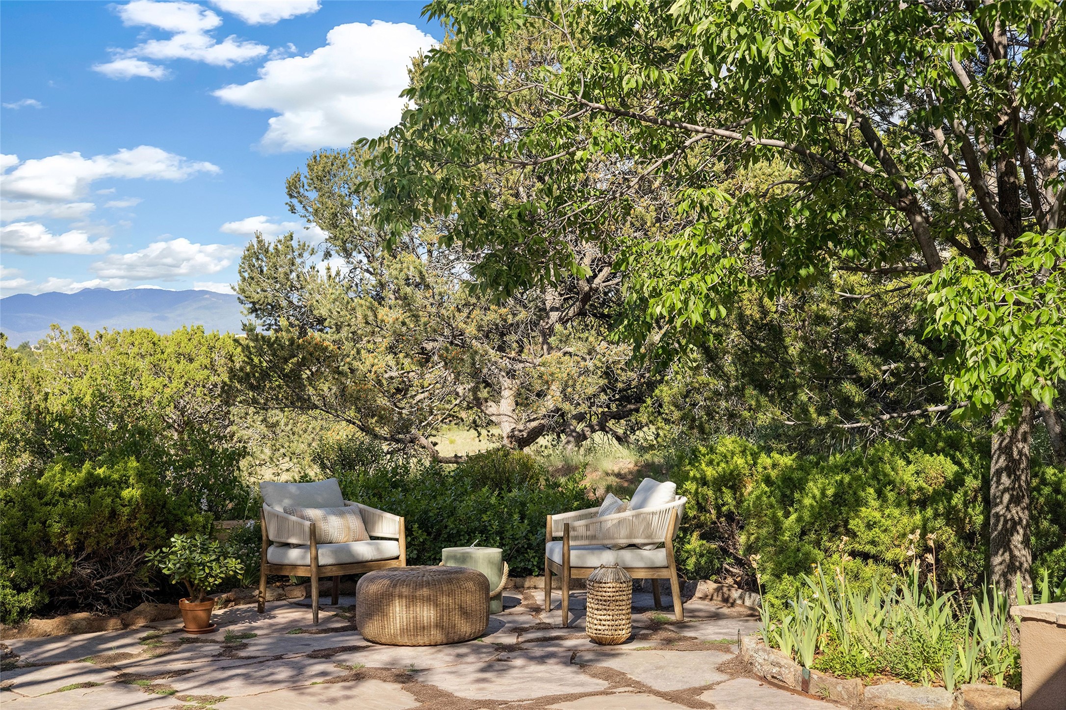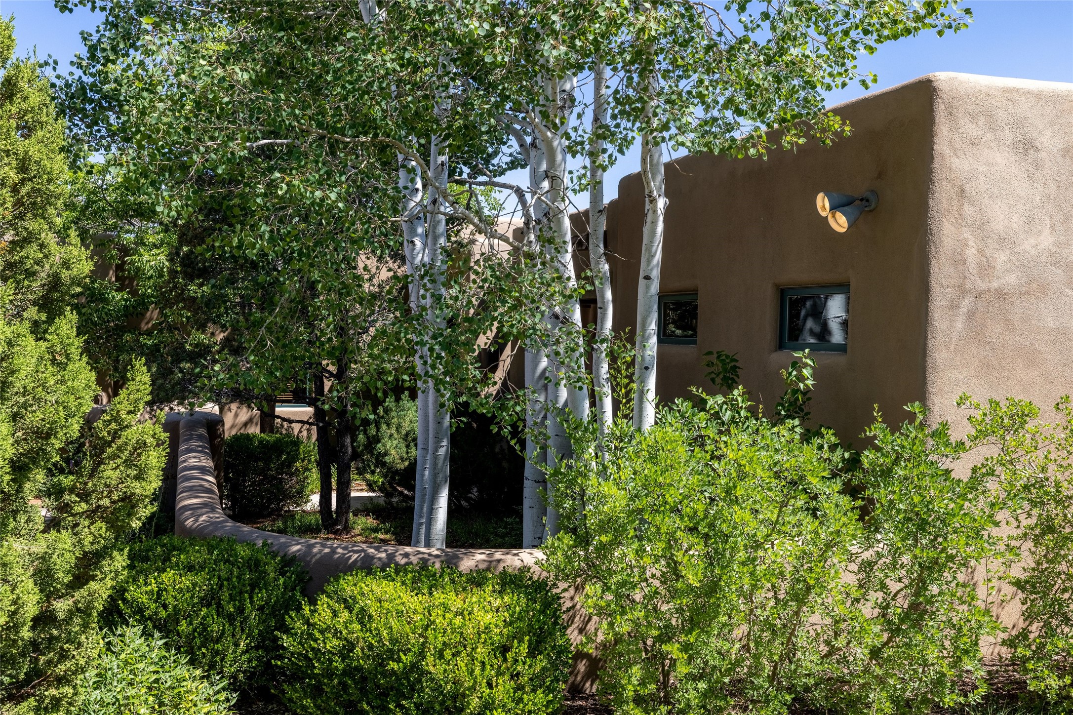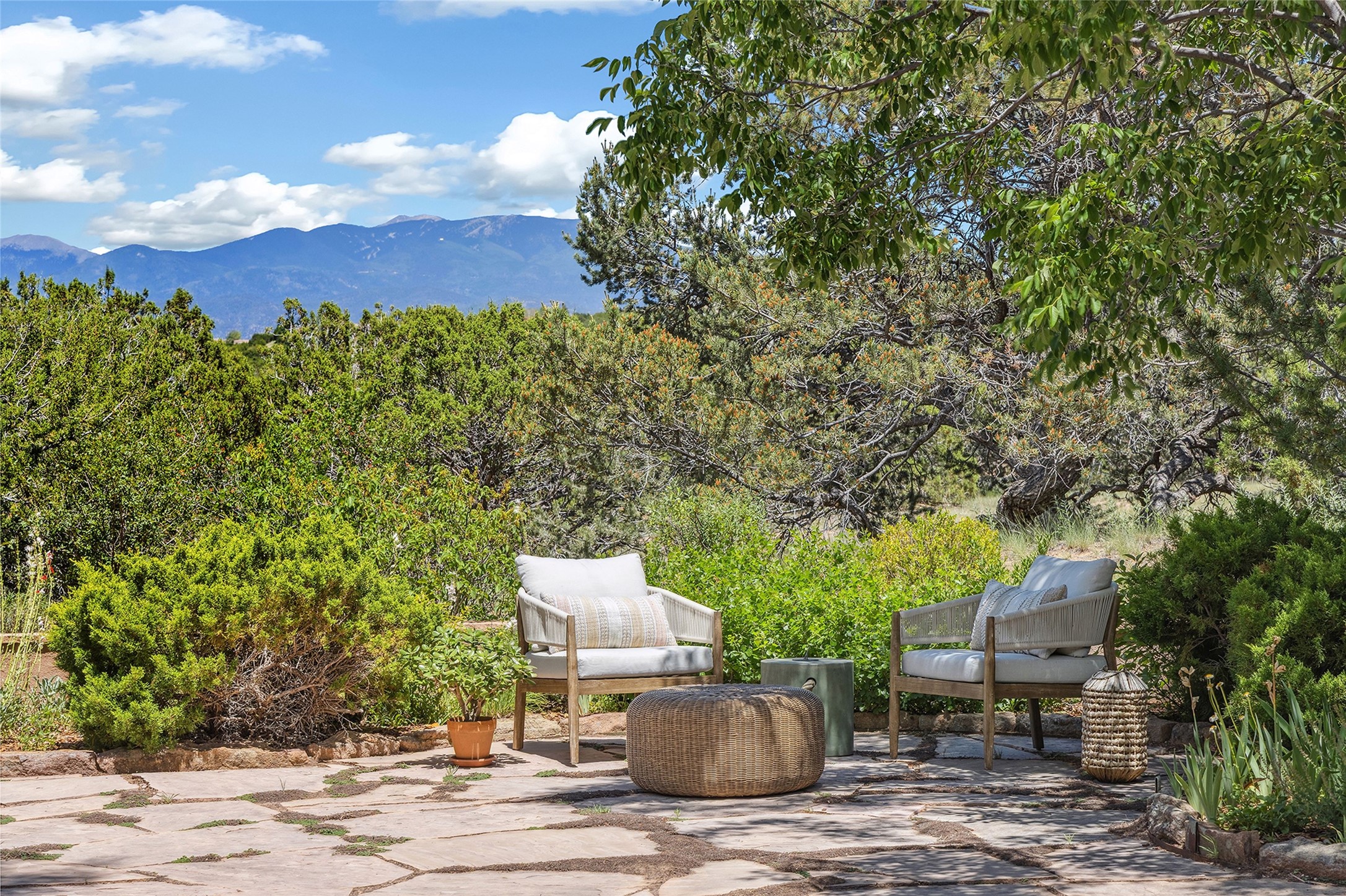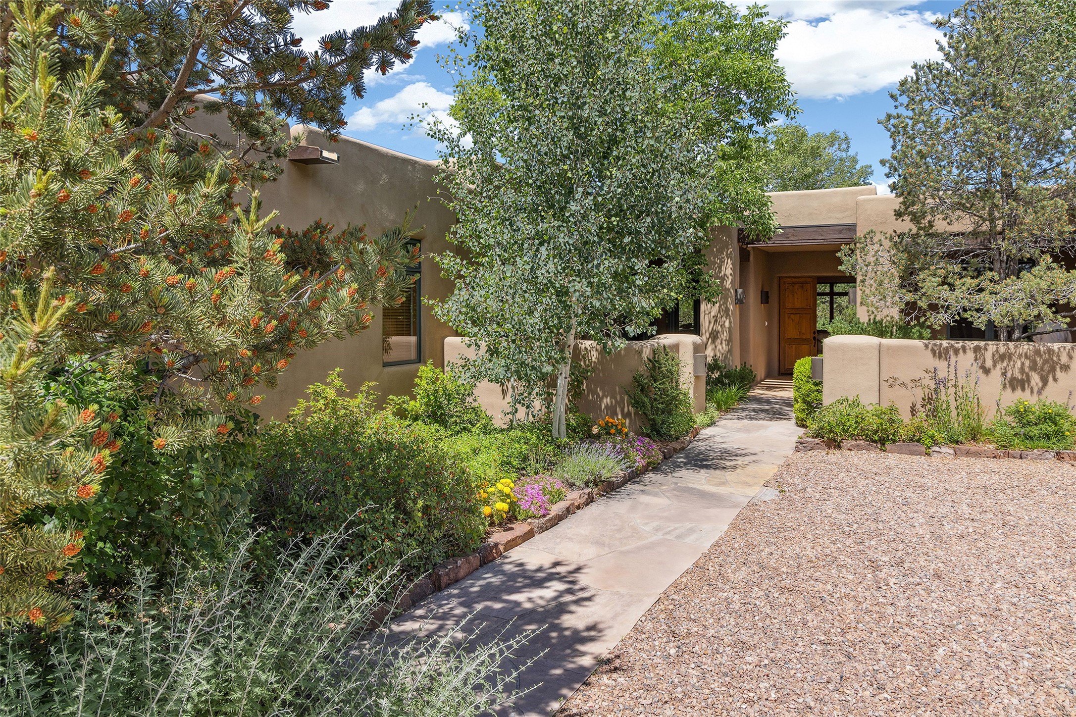 Welcome to 5 Estates Drive, an exciting home with stunning Sangre De Cristo Mountain views and a rare, flexible floor plan, featuring 4 bedrooms plus an attached studio and a heated 3-car garage. Located within the famed community of Las Campanas and sited for maximum privacy and serenity, on a 2-acre view lot, this exceptional single level home impresses with captivating design features and quality craftsmanship. Located within close proximity to the iconic Santa Fe Plaza and The Club at Las Campanas, this extraordinary home offers the ultimate blend of modern design, with the inherent warmth of an iconic Santa Fe home. Design highlights include a welcoming formal living room directly off the front entrance, with framed mountain views and an expansive casual living room with soaring ceilings, rich beams, view windows, a grand fireplace and custom built-in shelving. Ideal for entertaining, the beautifully appointed chef's kitchen with a wraparound breakfast bar, opens to the casual living room and breakfast dining area, with direct access to the outdoor dining area, built-in Viking BBQ and vast outdoor entertainment areas and gardens. The owner's suite delights with views, fireplace, backyard access and a spacious bath with a soaking tub, walk-in shower and a large walk-in closet. Adjacent to the owner's suite is an ideal office or guest bedroom, with an adjacent bath complete with a steam shower. Separate from the main living areas are 2 additional, guest bedrooms which share bath. The attached heated studio is accessed through the garage, complete with a utility sink and built-in shelving. The outdoor living experience is one of the finest, ideal for large gatherings, gardening or simply to just enjoy the vibrant gardens, fountains, surround aspens and pure tranquility. The owner's Equity Social Membership to The Club at Las Campanas is available for purchase on a separate bill of sale. This one is not to be missed and is move-in ready, just in time for summer!