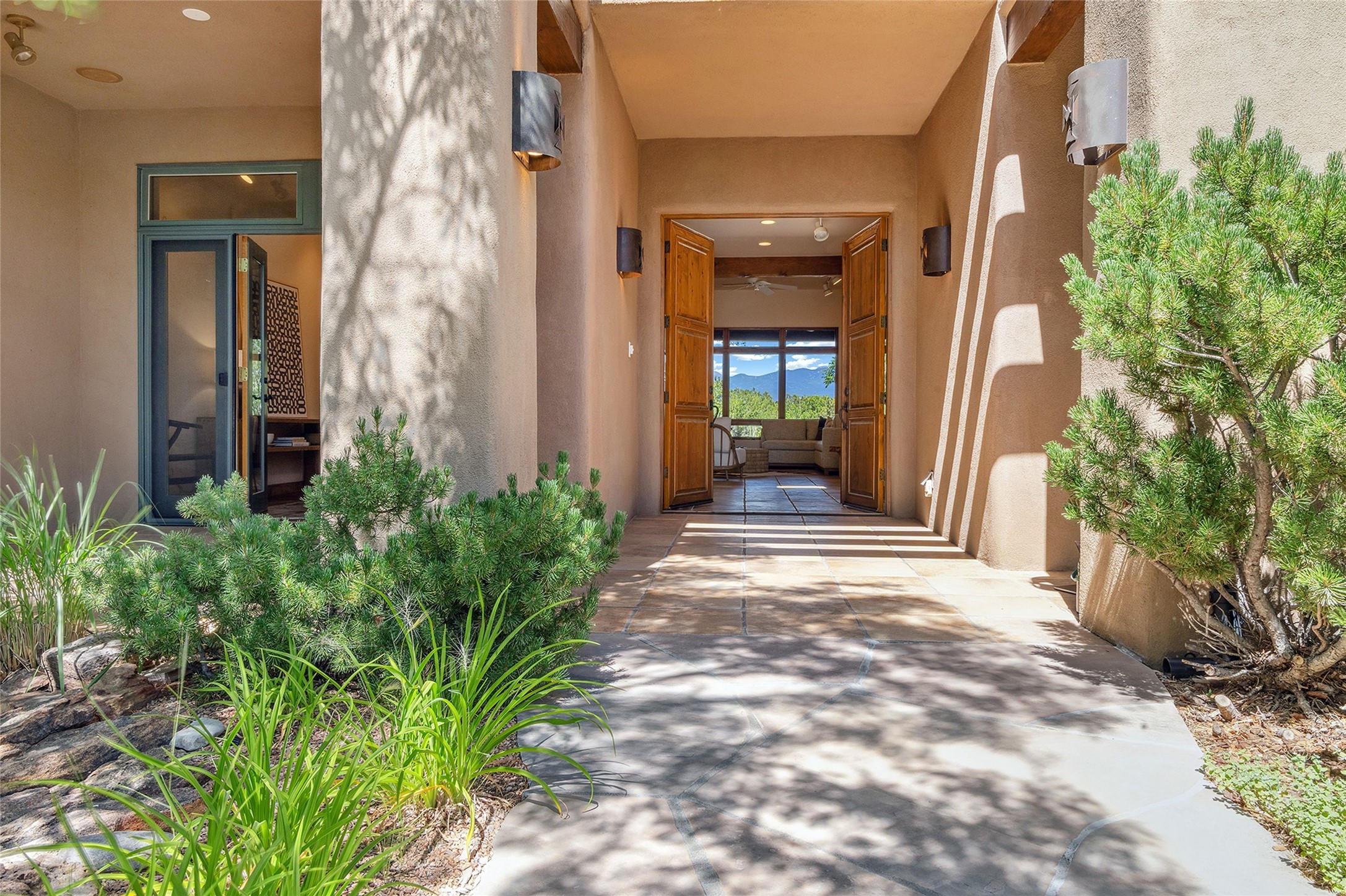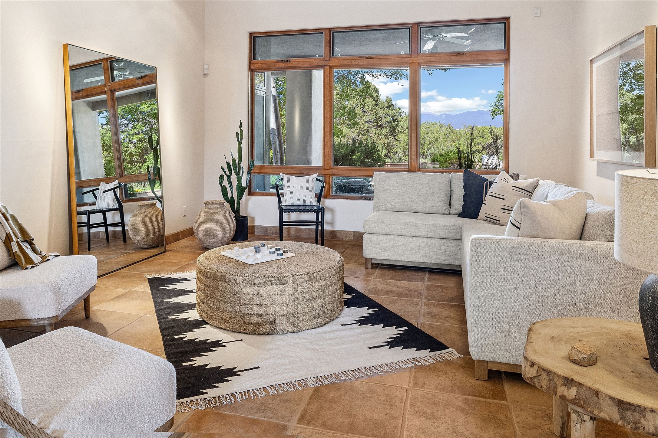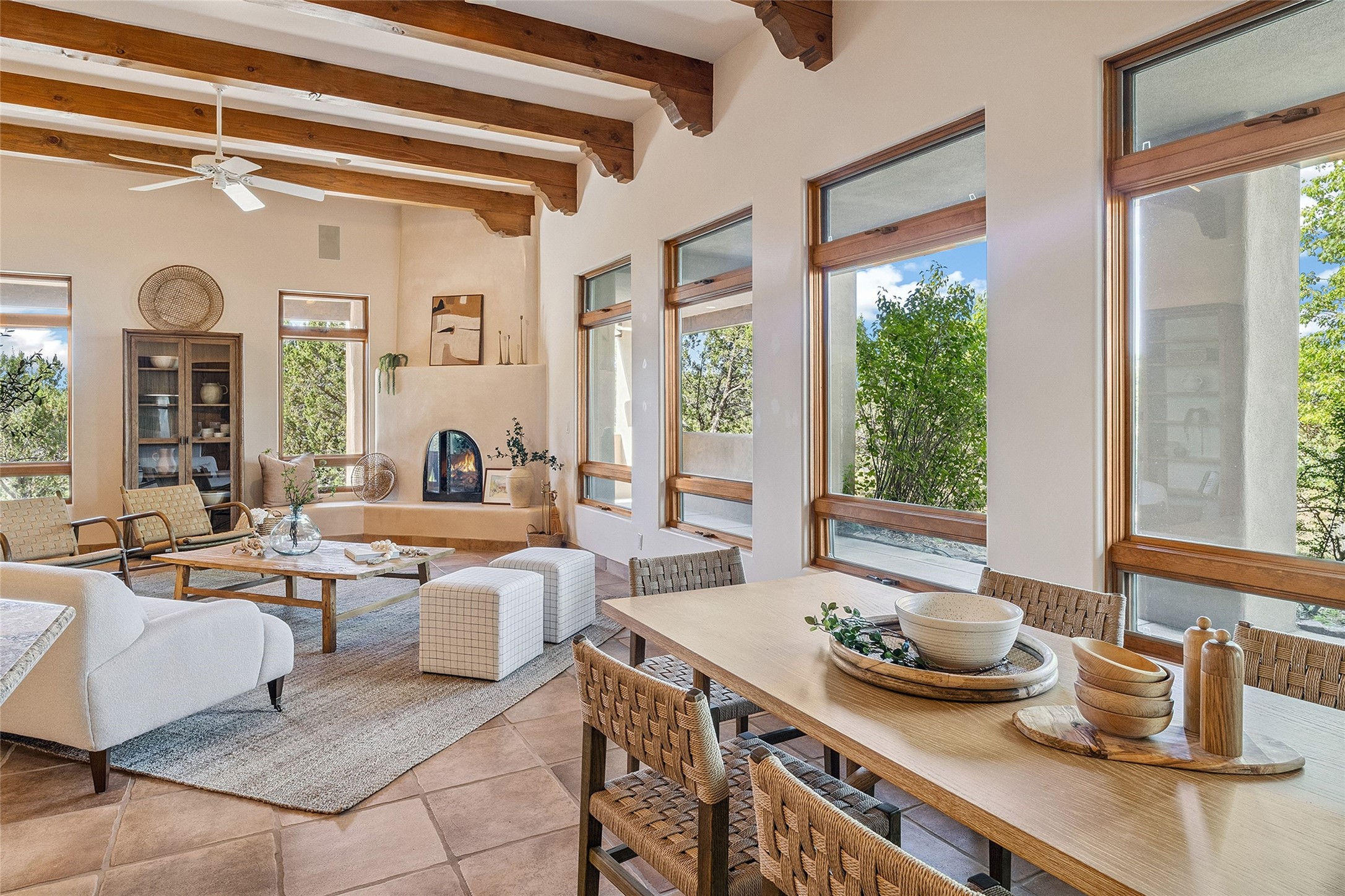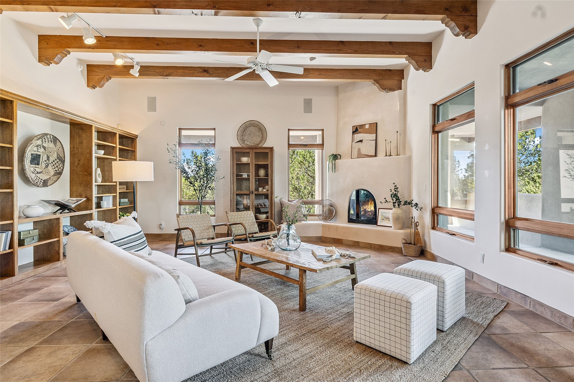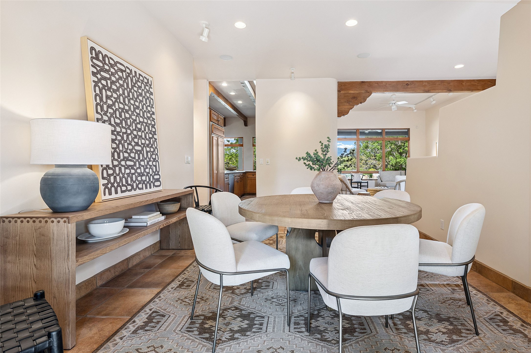 Welcome to 5 Estates Drive, an exciting home with stunning Sangre De Cristo Mountain views and a rare, flexible floor plan, featuring 4 bedrooms plus an attached studio and a heated 3-car garage. Located within the famed community of Las Campanas and sited for maximum privacy and serenity, on a 2-acre view lot, this exceptional single level home impresses with captivating design features and quality craftsmanship. Located within close proximity to the iconic Santa Fe Plaza and The Club at Las Campanas, this extraordinary home offers the ultimate blend of modern design, with the inherent warmth of an iconic Santa Fe home. Design highlights include a welcoming formal living room directly off the front entrance, with framed mountain views and an expansive casual living room with soaring ceilings, rich beams, view windows, a grand fireplace and custom built-in shelving. Ideal for entertaining, the beautifully appointed chef's kitchen with a wraparound breakfast bar, opens to the casual living room and breakfast dining area, with direct access to the outdoor dining area, built-in Viking BBQ and vast outdoor entertainment areas and gardens. The owner's suite delights with views, fireplace, backyard access and a spacious bath with a soaking tub, walk-in shower and a large walk-in closet. Adjacent to the owner's suite is an ideal office or guest bedroom, with an adjacent bath complete with a steam shower. Separate from the main living areas are 2 additional, guest bedrooms which share bath. The attached heated studio is accessed through the garage, complete with a utility sink and built-in shelving. The outdoor living experience is one of the finest, ideal for large gatherings, gardening or simply to just enjoy the vibrant gardens, fountains, surround aspens and pure tranquility. The owner's Equity Social Membership to The Club at Las Campanas is available for purchase on a separate bill of sale. This one is not to be missed and is move-in ready, just in time for summer!