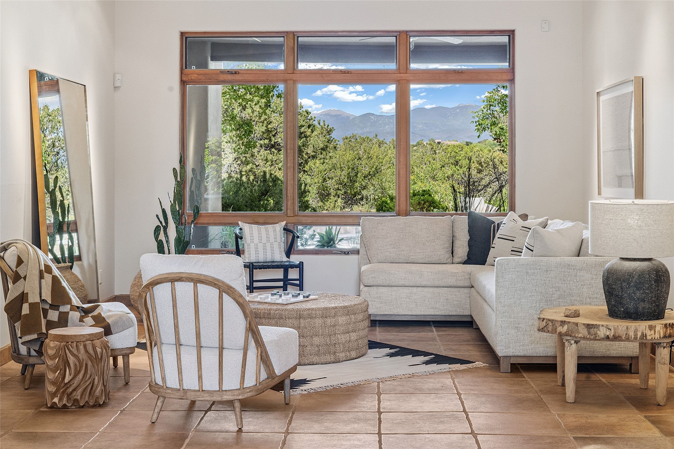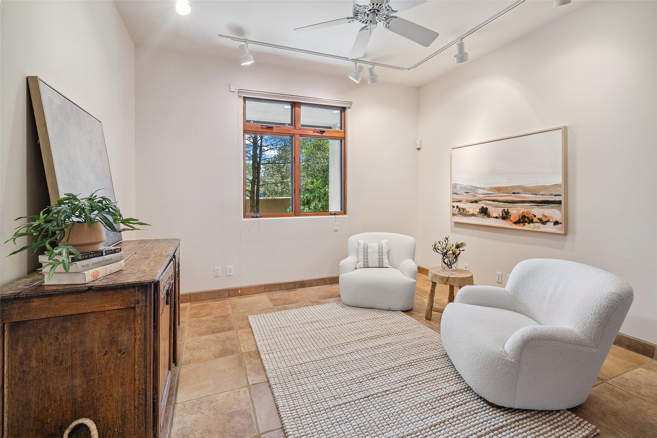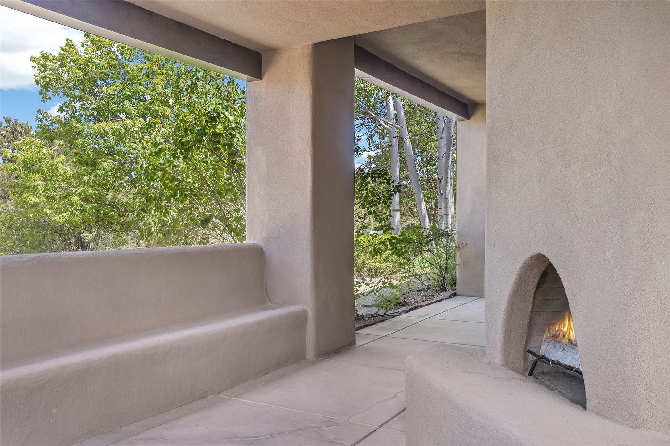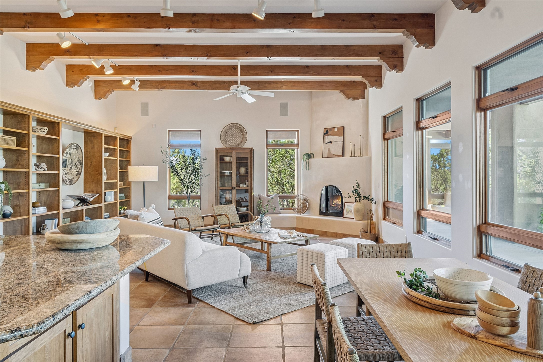 Welcome to 5 Estates Drive, an exciting home with stunning Sangre De Cristo Mountain views and a rare, flexible floor plan, featuring 4 bedrooms plus an attached studio and a heated 3-car garage. Located within the famed community of Las Campanas and sited for maximum privacy and serenity, on a 2-acre view lot, this exceptional single level home impresses with captivating design features and quality craftsmanship. Located within close proximity to the iconic Santa Fe Plaza and The Club at Las Campanas, this extraordinary home offers the ultimate blend of modern design, with the inherent warmth of an iconic Santa Fe home. Design highlights include a welcoming formal living room directly off the front entrance, with framed mountain views and an expansive casual living room with soaring ceilings, rich beams, view windows, a grand fireplace and custom built-in shelving. Ideal for entertaining, the beautifully appointed chef's kitchen with a wraparound breakfast bar, opens to the casual living room and breakfast dining area, with direct access to the outdoor dining area, built-in Viking BBQ and vast outdoor entertainment areas and gardens. The owner's suite delights with views, fireplace, backyard access and a spacious bath with a soaking tub, walk-in shower and a large walk-in closet. Adjacent to the owner's suite is an ideal office or guest bedroom, with an adjacent bath complete with a steam shower. Separate from the main living areas are 2 additional, guest bedrooms which share bath. The attached heated studio is accessed through the garage, complete with a utility sink and built-in shelving. The outdoor living experience is one of the finest, ideal for large gatherings, gardening or simply to just enjoy the vibrant gardens, fountains, surround aspens and pure tranquility. The owner's Equity Social Membership to The Club at Las Campanas is available for purchase on a separate bill of sale. This one is not to be missed and is move-in ready, just in time for summer!