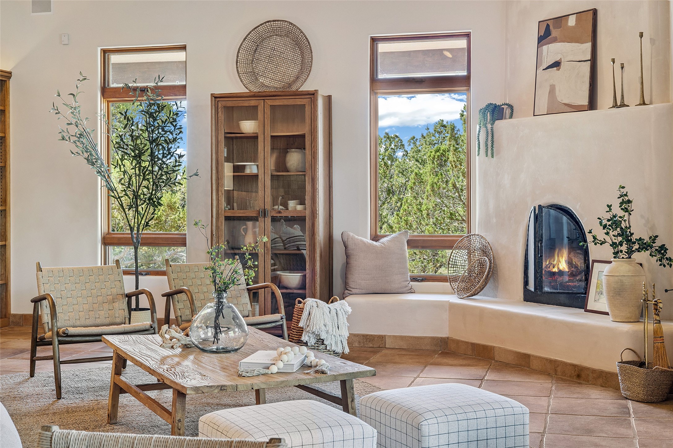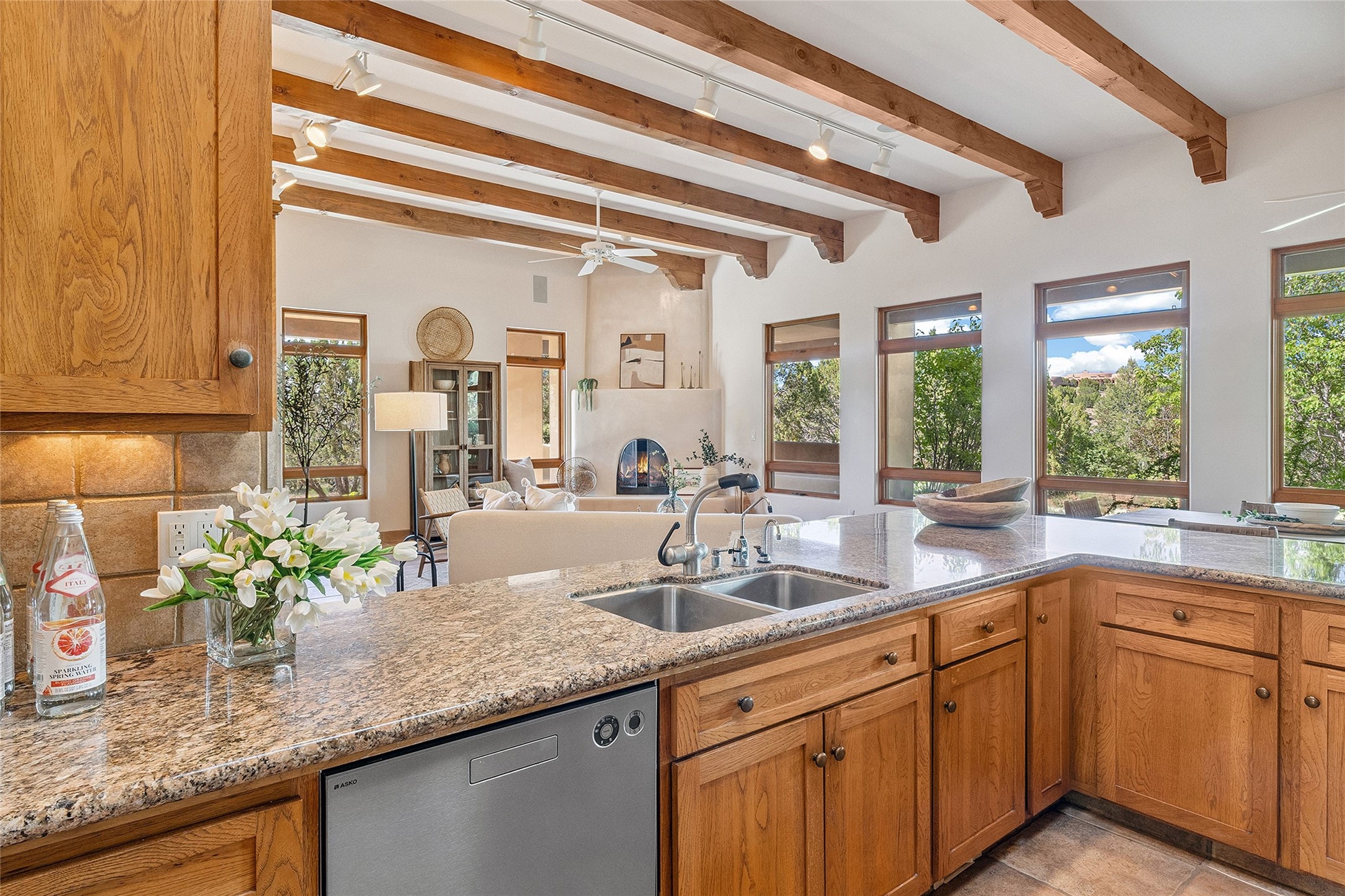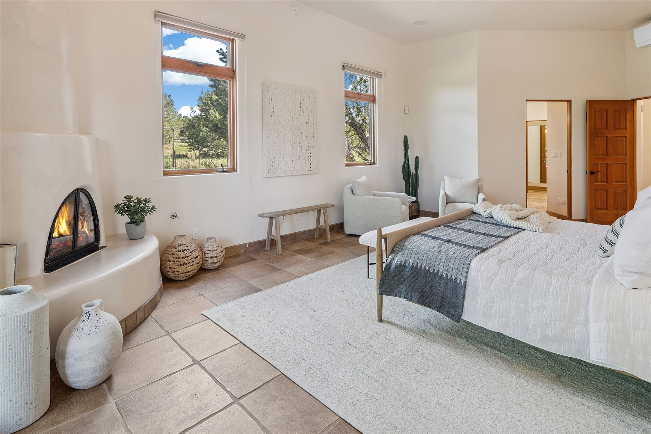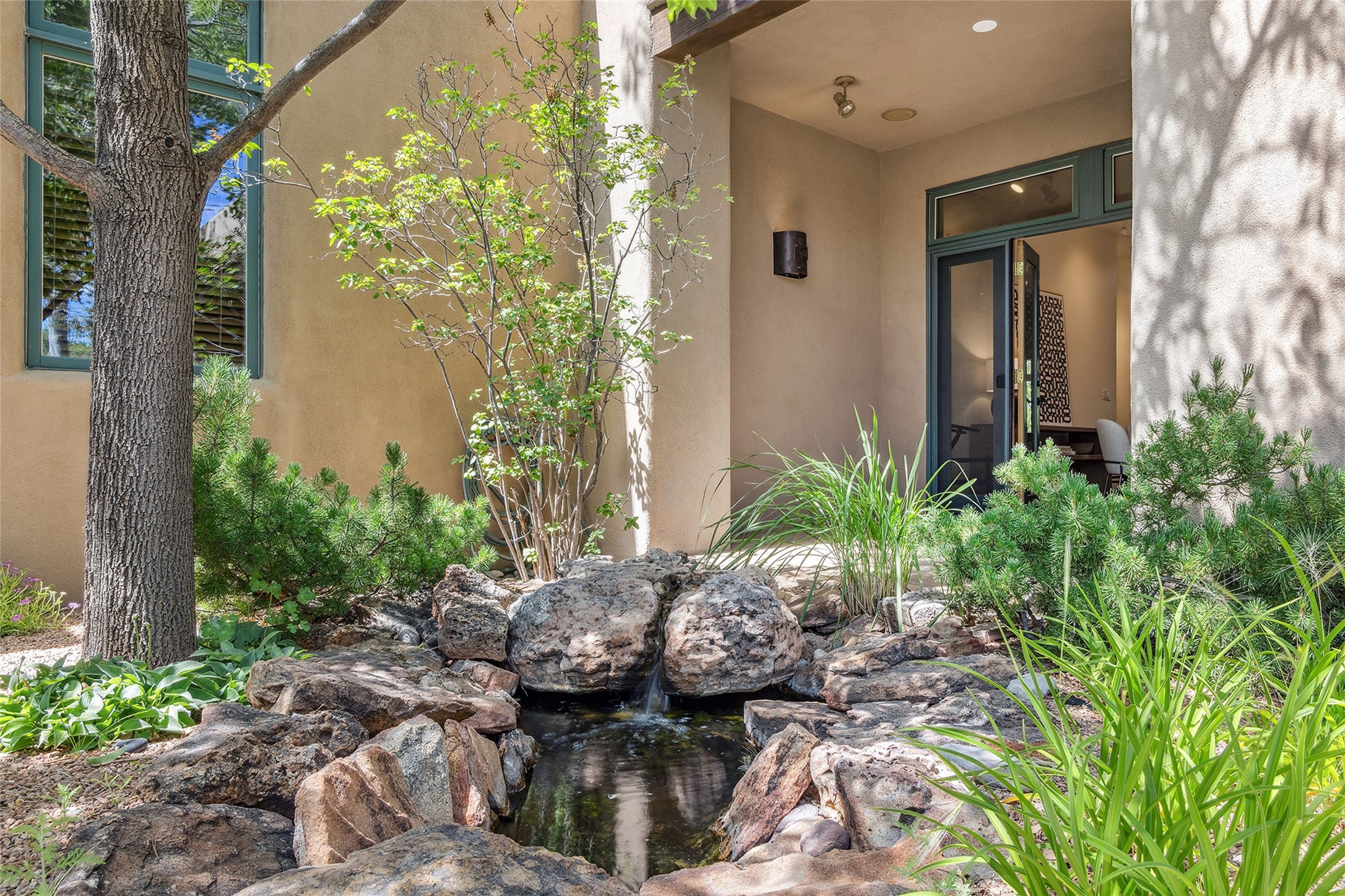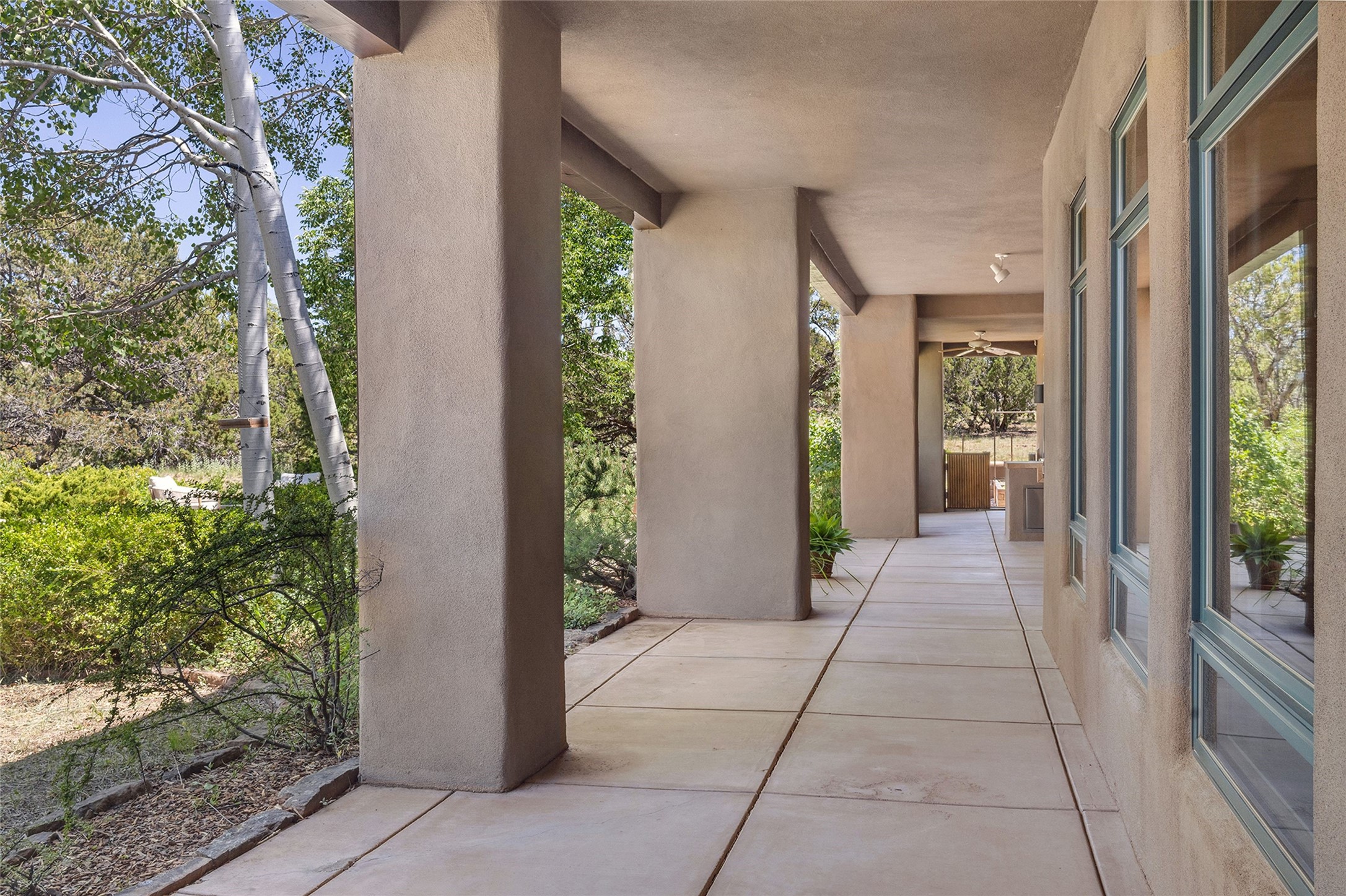 Welcome to 5 Estates Drive, an exciting home with stunning Sangre De Cristo Mountain views and a rare, flexible floor plan, featuring 4 bedrooms plus an attached studio and a heated 3-car garage. Located within the famed community of Las Campanas and sited for maximum privacy and serenity, on a 2-acre view lot, this exceptional single level home impresses with captivating design features and quality craftsmanship. Located within close proximity to the iconic Santa Fe Plaza and The Club at Las Campanas, this extraordinary home offers the ultimate blend of modern design, with the inherent warmth of an iconic Santa Fe home. Design highlights include a welcoming formal living room directly off the front entrance, with framed mountain views and an expansive casual living room with soaring ceilings, rich beams, view windows, a grand fireplace and custom built-in shelving. Ideal for entertaining, the beautifully appointed chef's kitchen with a wraparound breakfast bar, opens to the casual living room and breakfast dining area, with direct access to the outdoor dining area, built-in Viking BBQ and vast outdoor entertainment areas and gardens. The owner's suite delights with views, fireplace, backyard access and a spacious bath with a soaking tub, walk-in shower and a large walk-in closet. Adjacent to the owner's suite is an ideal office or guest bedroom, with an adjacent bath complete with a steam shower. Separate from the main living areas are 2 additional, guest bedrooms which share bath. The attached heated studio is accessed through the garage, complete with a utility sink and built-in shelving. The outdoor living experience is one of the finest, ideal for large gatherings, gardening or simply to just enjoy the vibrant gardens, fountains, surround aspens and pure tranquility. The owner's Equity Social Membership to The Club at Las Campanas is available for purchase on a separate bill of sale. This one is not to be missed and is move-in ready, just in time for summer!