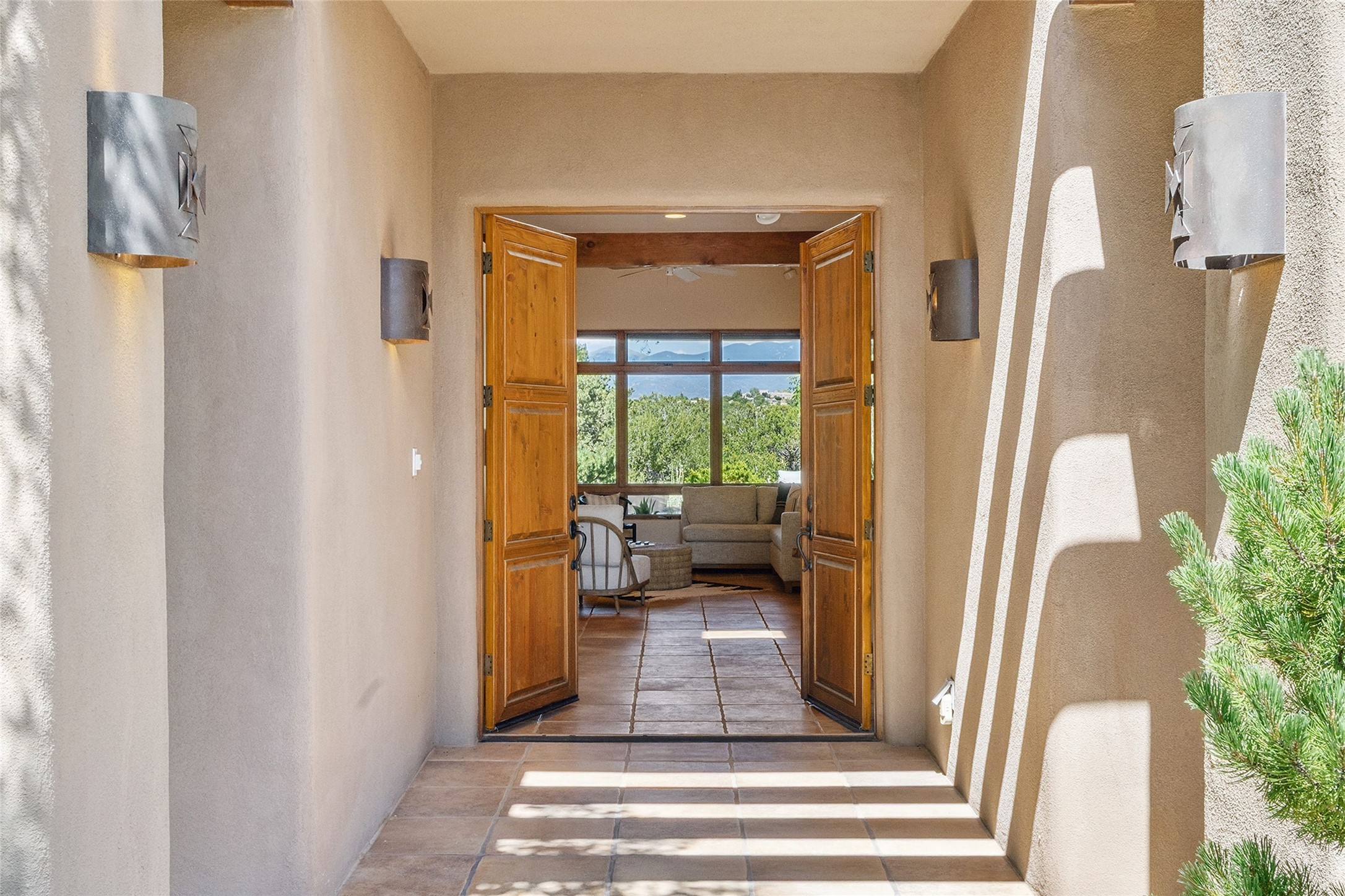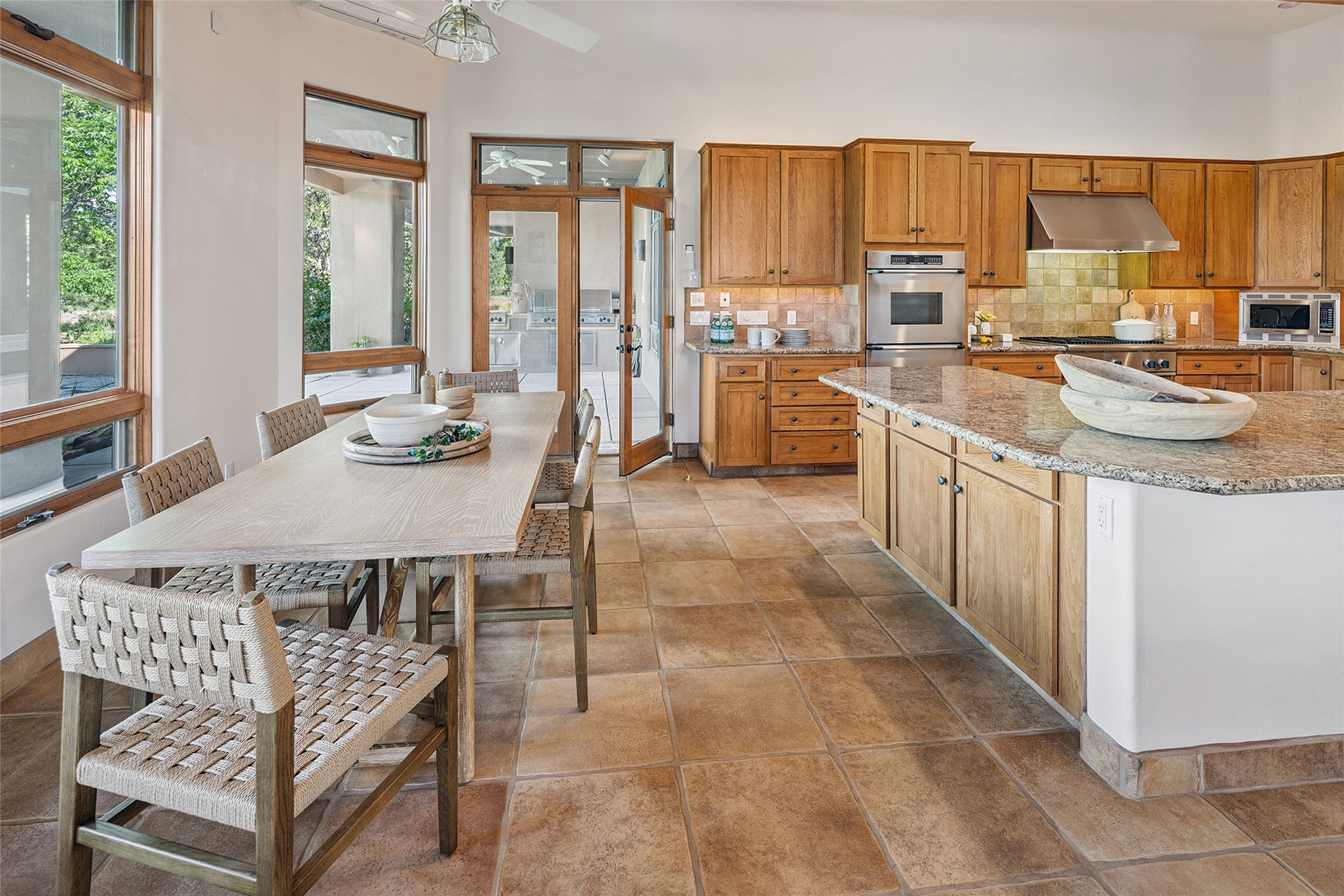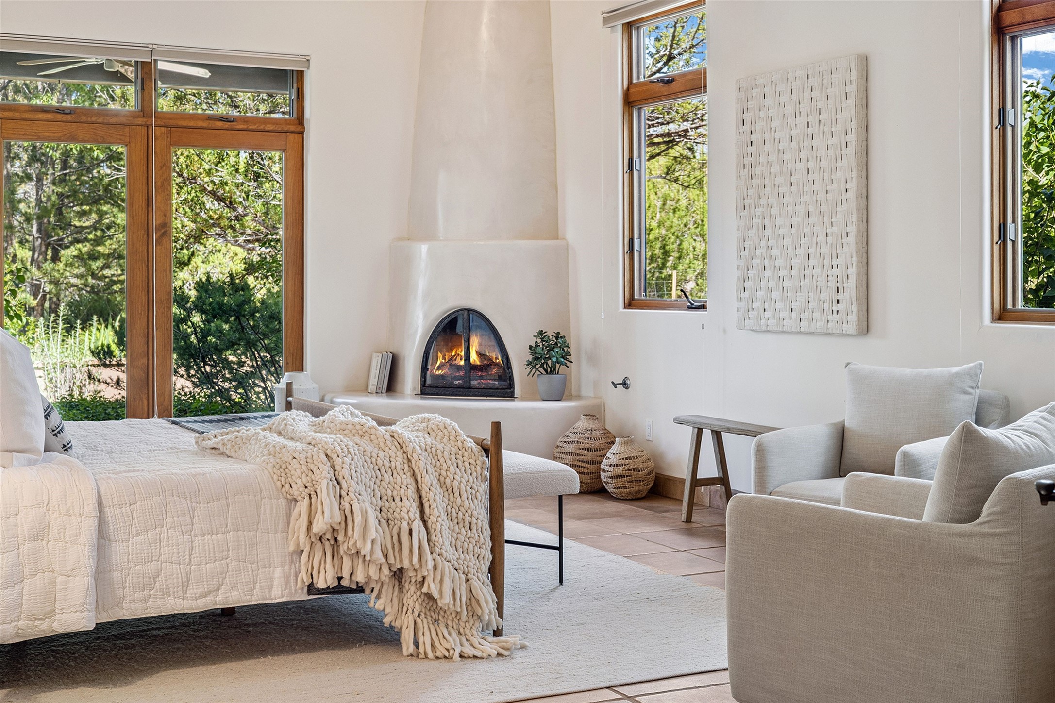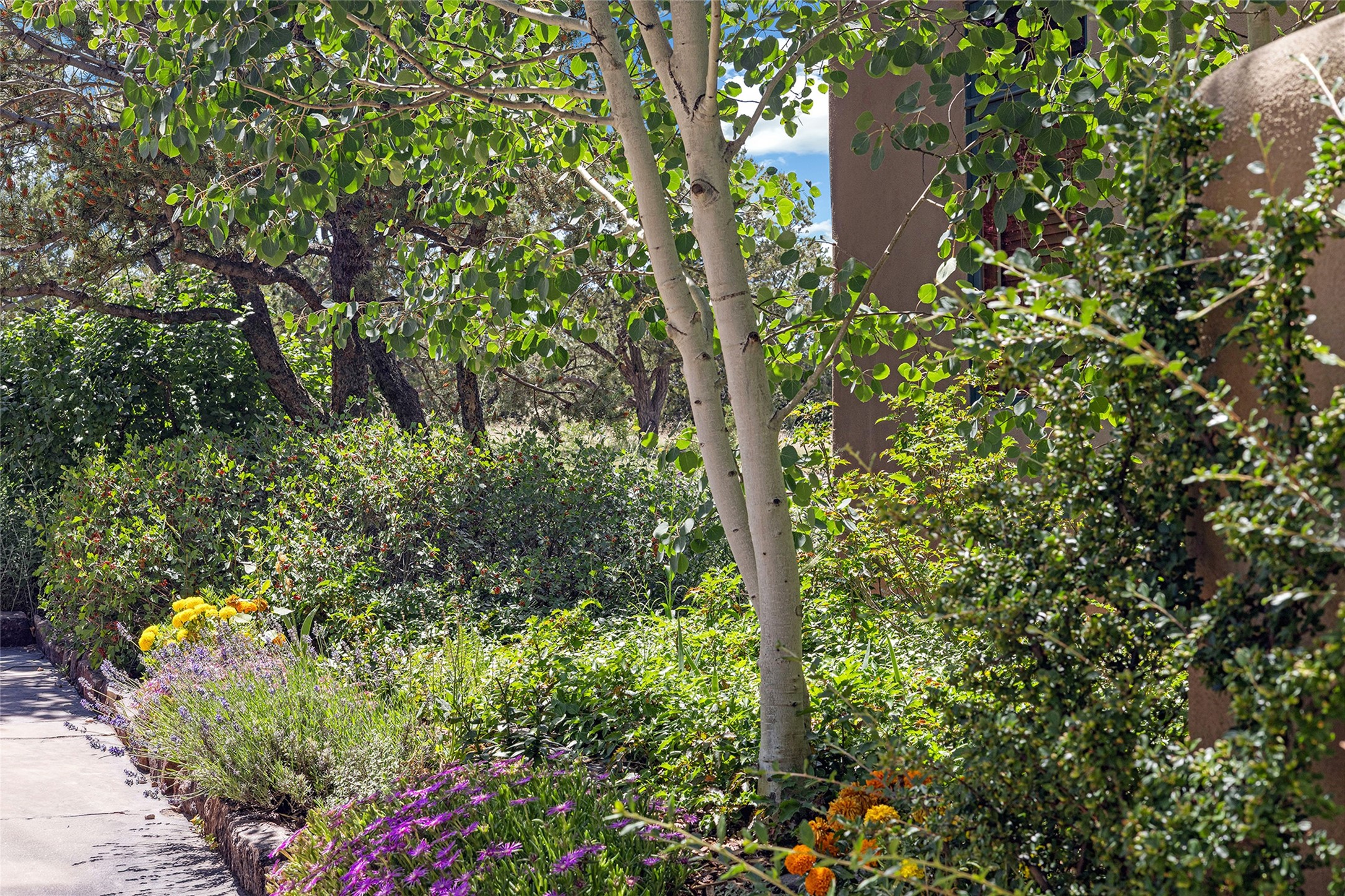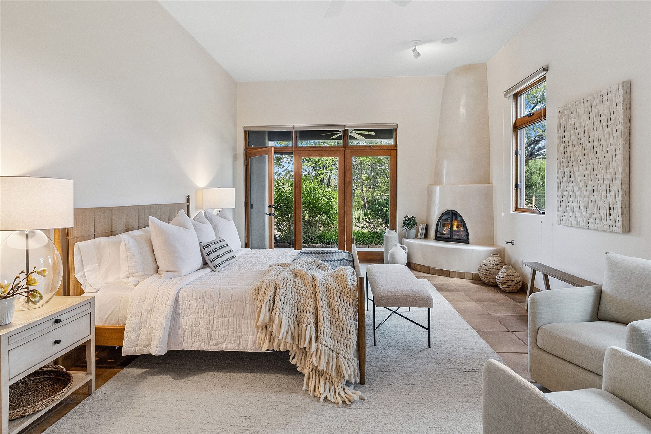 Welcome to 5 Estates Drive, an exciting home with stunning Sangre De Cristo Mountain views and a rare, flexible floor plan, featuring 4 bedrooms plus an attached studio and a heated 3-car garage. Located within the famed community of Las Campanas and sited for maximum privacy and serenity, on a 2-acre view lot, this exceptional single level home impresses with captivating design features and quality craftsmanship. Located within close proximity to the iconic Santa Fe Plaza and The Club at Las Campanas, this extraordinary home offers the ultimate blend of modern design, with the inherent warmth of an iconic Santa Fe home. Design highlights include a welcoming formal living room directly off the front entrance, with framed mountain views and an expansive casual living room with soaring ceilings, rich beams, view windows, a grand fireplace and custom built-in shelving. Ideal for entertaining, the beautifully appointed chef's kitchen with a wraparound breakfast bar, opens to the casual living room and breakfast dining area, with direct access to the outdoor dining area, built-in Viking BBQ and vast outdoor entertainment areas and gardens. The owner's suite delights with views, fireplace, backyard access and a spacious bath with a soaking tub, walk-in shower and a large walk-in closet. Adjacent to the owner's suite is an ideal office or guest bedroom, with an adjacent bath complete with a steam shower. Separate from the main living areas are 2 additional, guest bedrooms which share bath. The attached heated studio is accessed through the garage, complete with a utility sink and built-in shelving. The outdoor living experience is one of the finest, ideal for large gatherings, gardening or simply to just enjoy the vibrant gardens, fountains, surround aspens and pure tranquility. The owner's Equity Social Membership to The Club at Las Campanas is available for purchase on a separate bill of sale. This one is not to be missed and is move-in ready, just in time for summer!