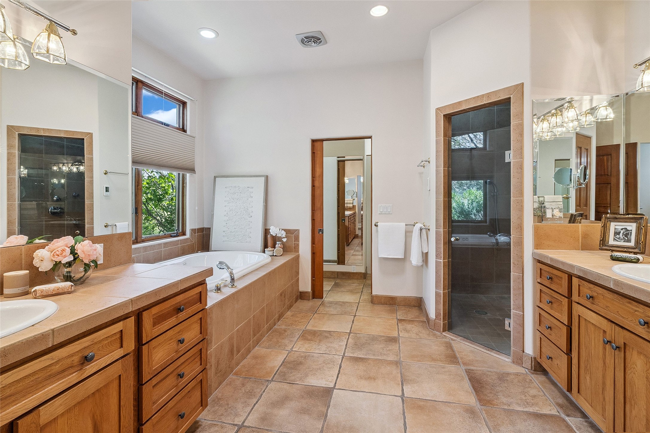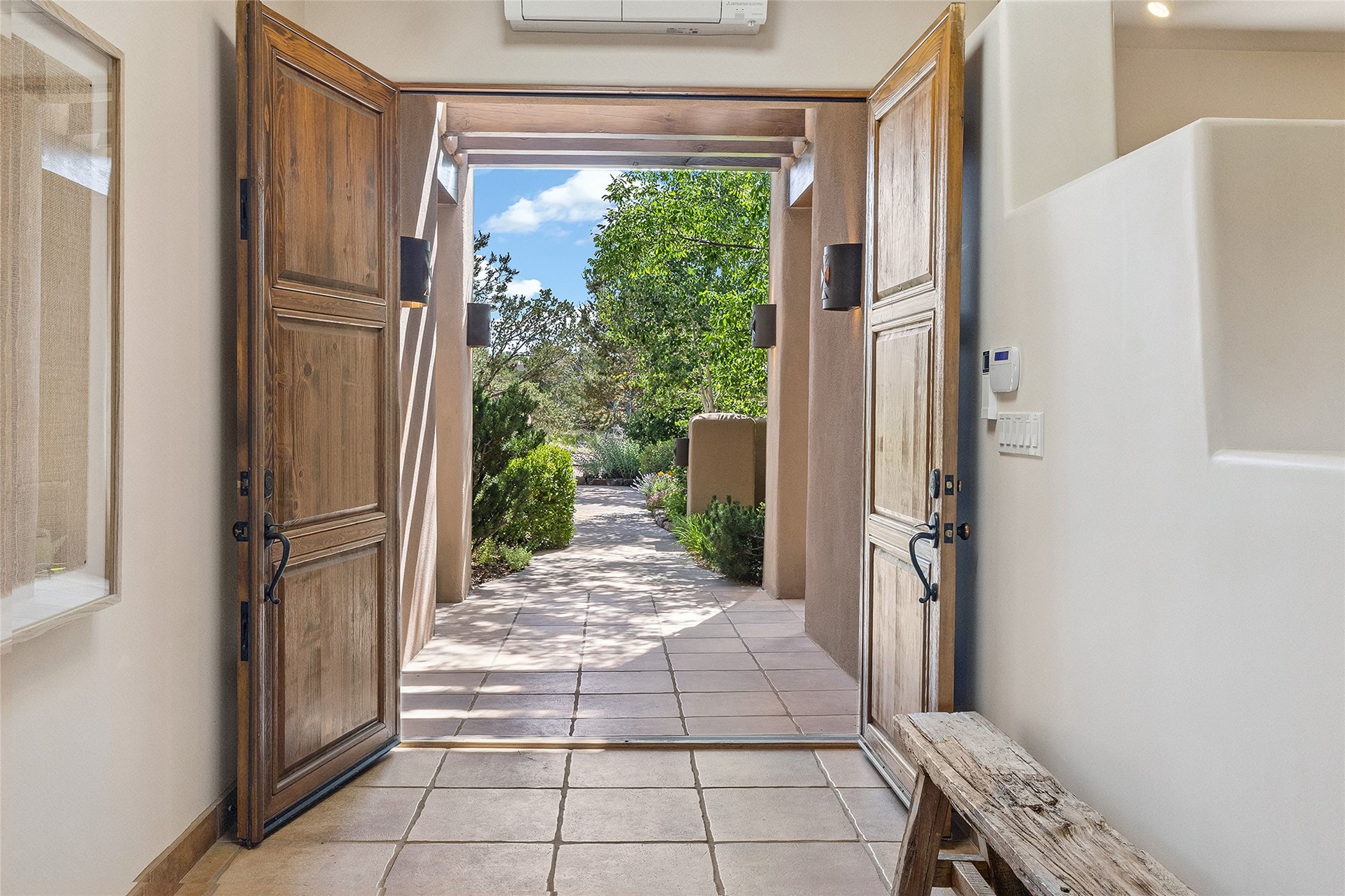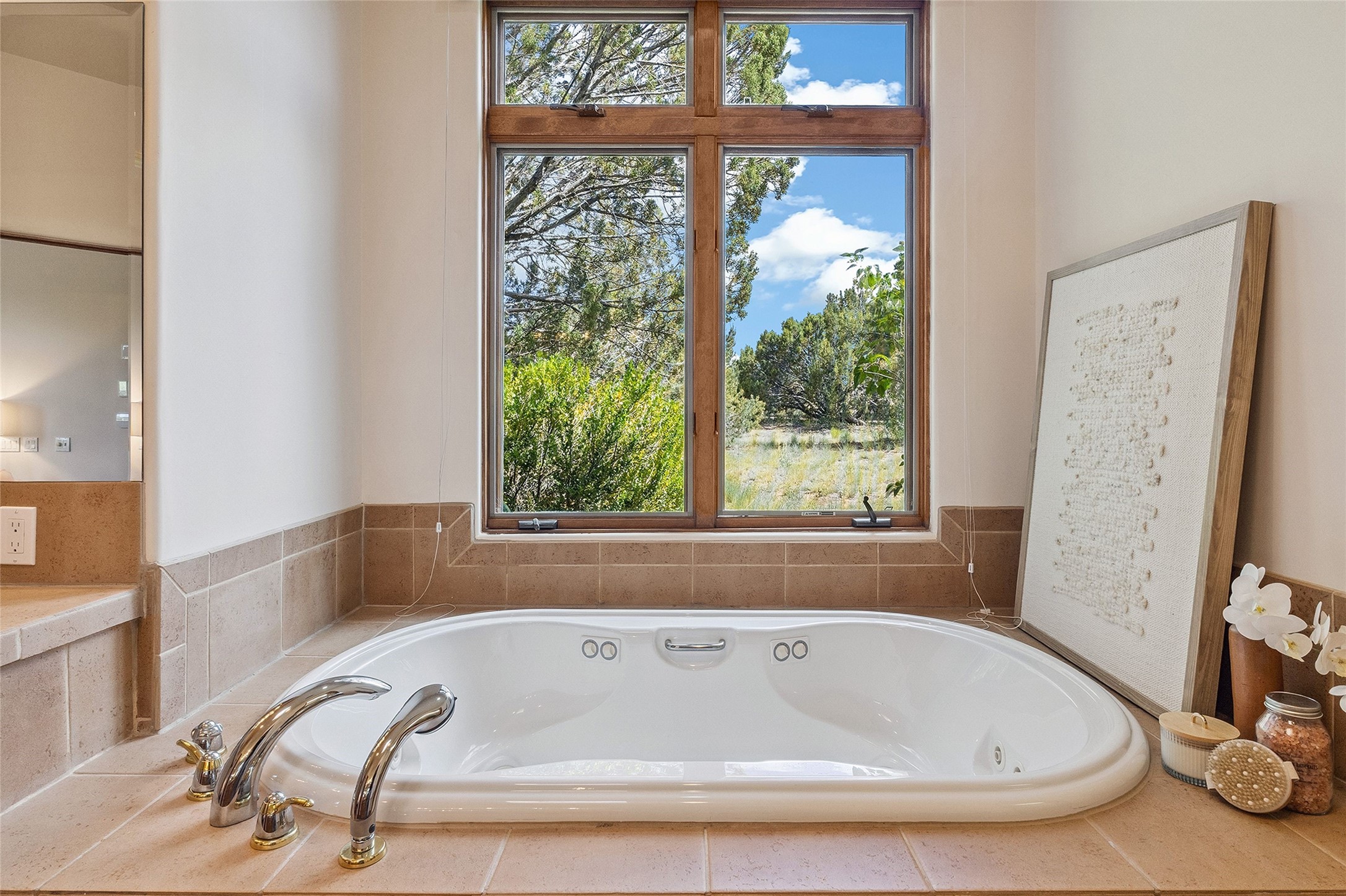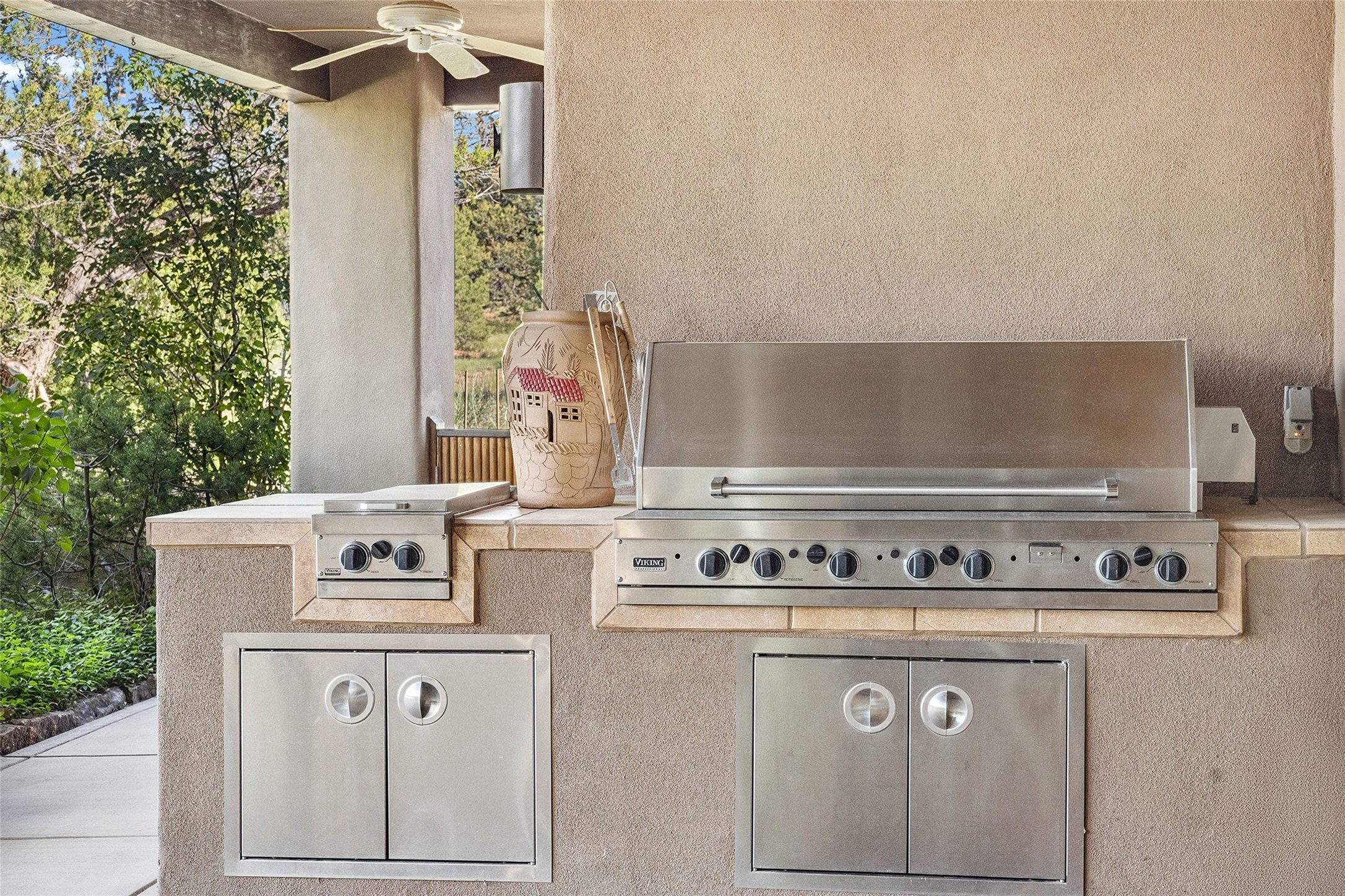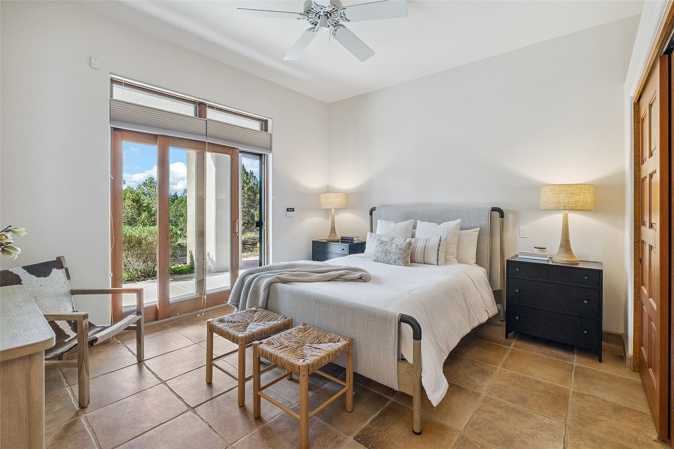 Welcome to 5 Estates Drive, an exciting home with stunning Sangre De Cristo Mountain views and a rare, flexible floor plan, featuring 4 bedrooms plus an attached studio and a heated 3-car garage. Located within the famed community of Las Campanas and sited for maximum privacy and serenity, on a 2-acre view lot, this exceptional single level home impresses with captivating design features and quality craftsmanship. Located within close proximity to the iconic Santa Fe Plaza and The Club at Las Campanas, this extraordinary home offers the ultimate blend of modern design, with the inherent warmth of an iconic Santa Fe home. Design highlights include a welcoming formal living room directly off the front entrance, with framed mountain views and an expansive casual living room with soaring ceilings, rich beams, view windows, a grand fireplace and custom built-in shelving. Ideal for entertaining, the beautifully appointed chef's kitchen with a wraparound breakfast bar, opens to the casual living room and breakfast dining area, with direct access to the outdoor dining area, built-in Viking BBQ and vast outdoor entertainment areas and gardens. The owner's suite delights with views, fireplace, backyard access and a spacious bath with a soaking tub, walk-in shower and a large walk-in closet. Adjacent to the owner's suite is an ideal office or guest bedroom, with an adjacent bath complete with a steam shower. Separate from the main living areas are 2 additional, guest bedrooms which share bath. The attached heated studio is accessed through the garage, complete with a utility sink and built-in shelving. The outdoor living experience is one of the finest, ideal for large gatherings, gardening or simply to just enjoy the vibrant gardens, fountains, surround aspens and pure tranquility. The owner's Equity Social Membership to The Club at Las Campanas is available for purchase on a separate bill of sale. This one is not to be missed and is move-in ready, just in time for summer!