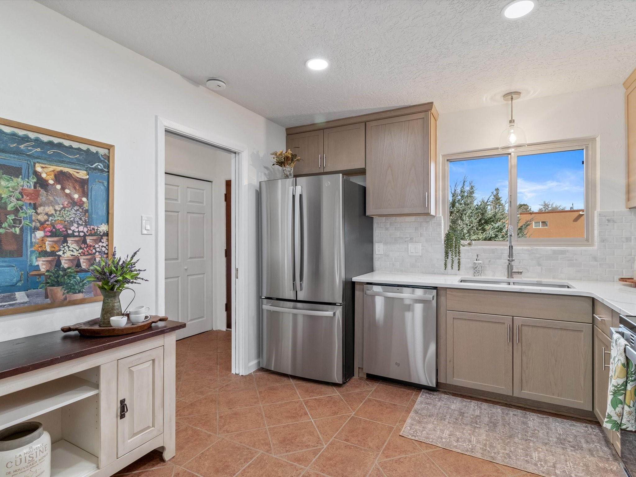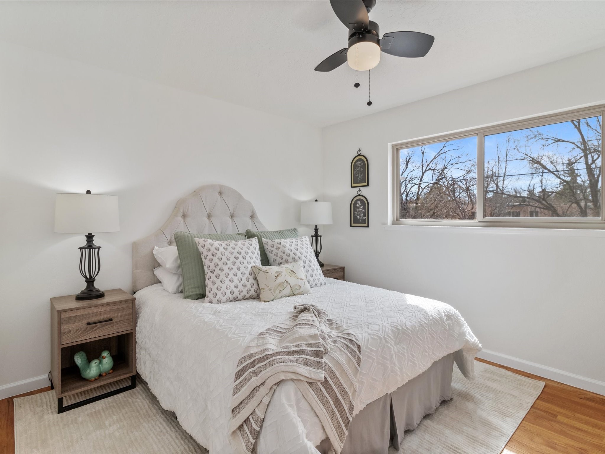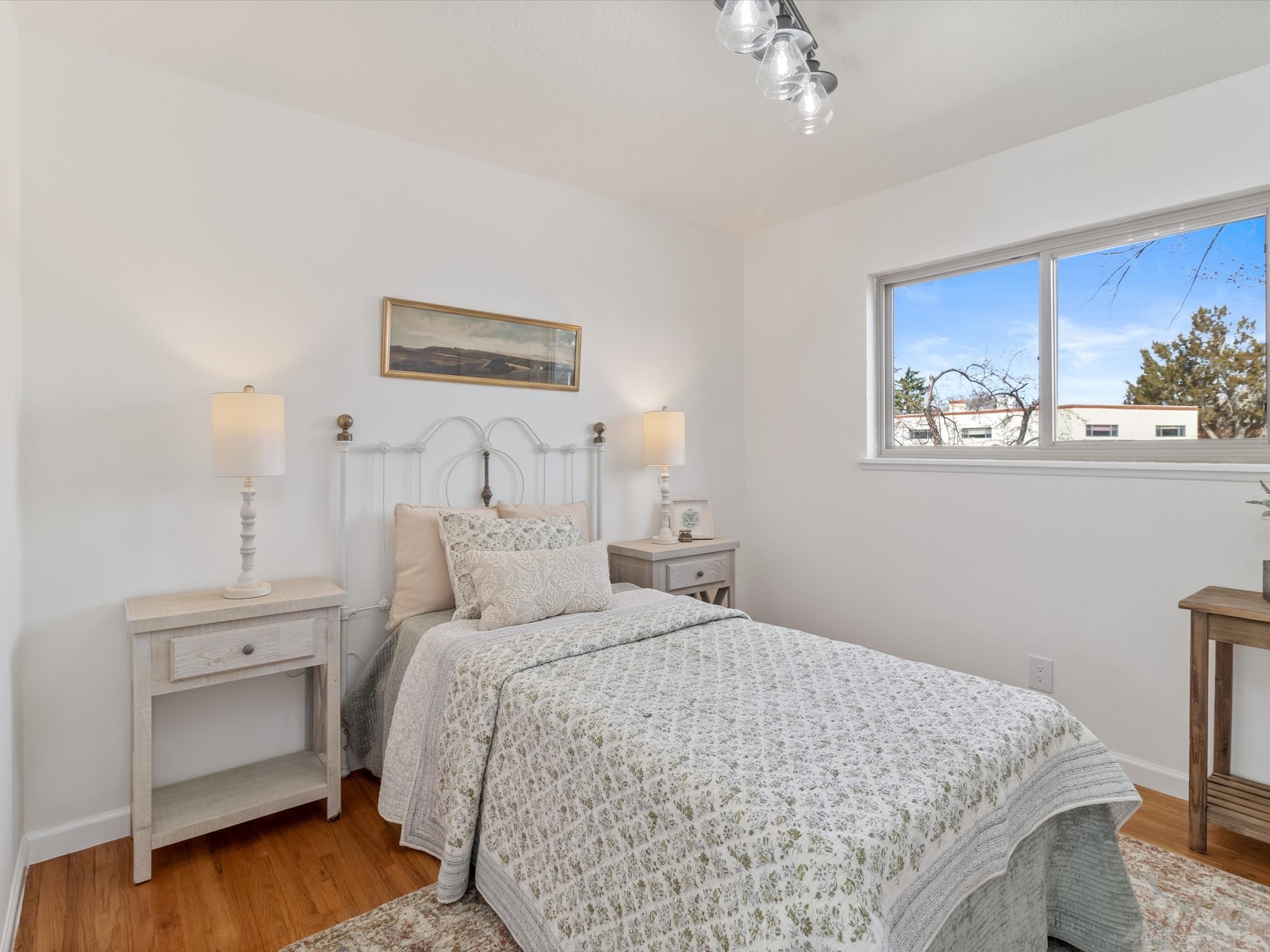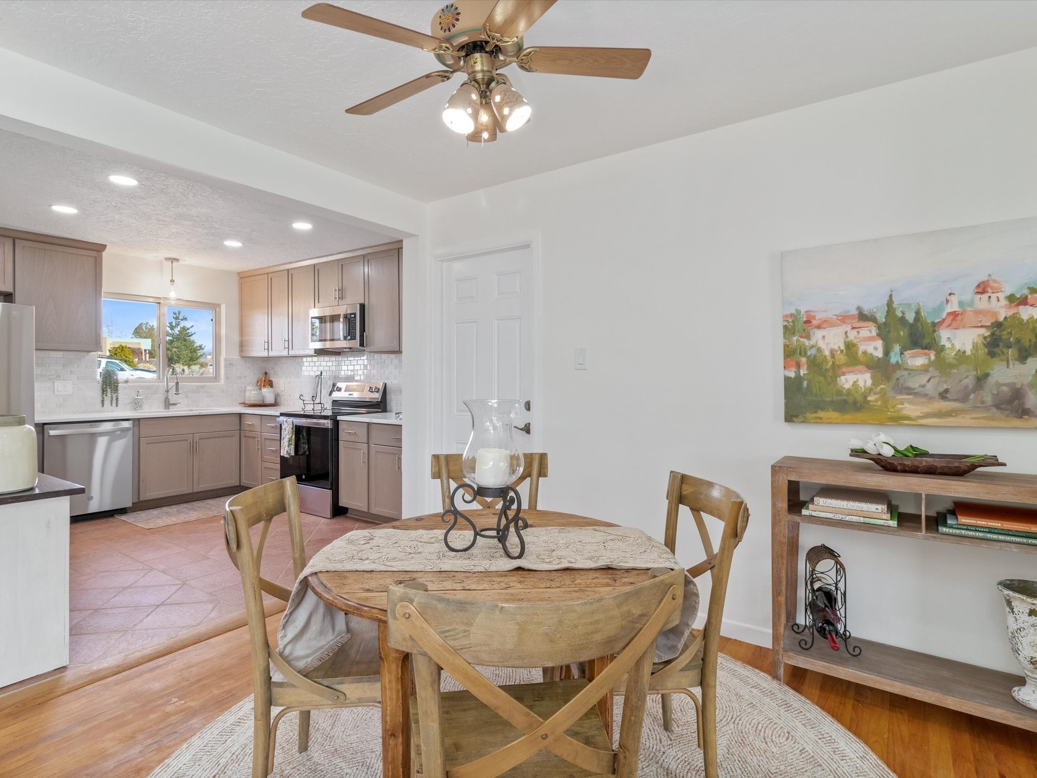 Welcome to this meticulously maintained, one-owner Pueblo-style home just minutes from the vibrant Midtown Development. With four spacious bedrooms, two full bathrooms, and over 2,000 square feet of living space, this property showcases true pride of ownership and offers the perfect blend of classic Santa Fe charm and thoughtful modern updates. Step inside to discover stunning, refinished original hardwood floors, fresh interior paint, and newly updated kitchen and bathrooms. The warm and inviting gathering area off the dining room features a cozy wood burning fireplace and opens directly to the private backyard--ideal for entertaining or unwinding under the New Mexico sky. Additional updates include new windows and stucco, a roof under warranty, and an attached garage with two additional parking spaces. The home features a mix of hardwood, tile, and laminate flooring, and offers a functional two-story layout full of character and flow. Conveniently located near the Zia Rail Station, Arroyo Chamisa Trail, local parks, and schools, this property offers a unique balance of serenity and accessibility in the heart of Midtown Santa Fe. Whether you're looking for a comfortable family residence or a smart investment in a growing area, this move-in ready home is full of potential. Don't miss this opportunity! Imagine the possibilities and schedule your showing today.