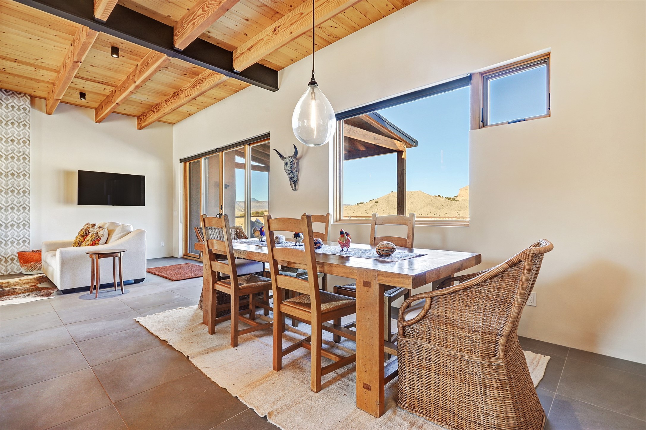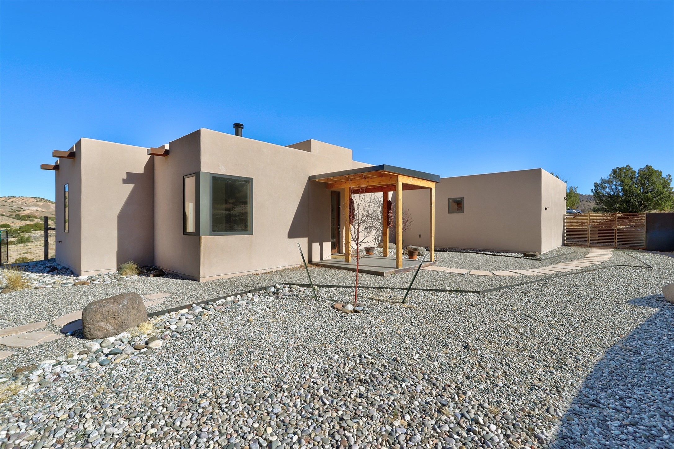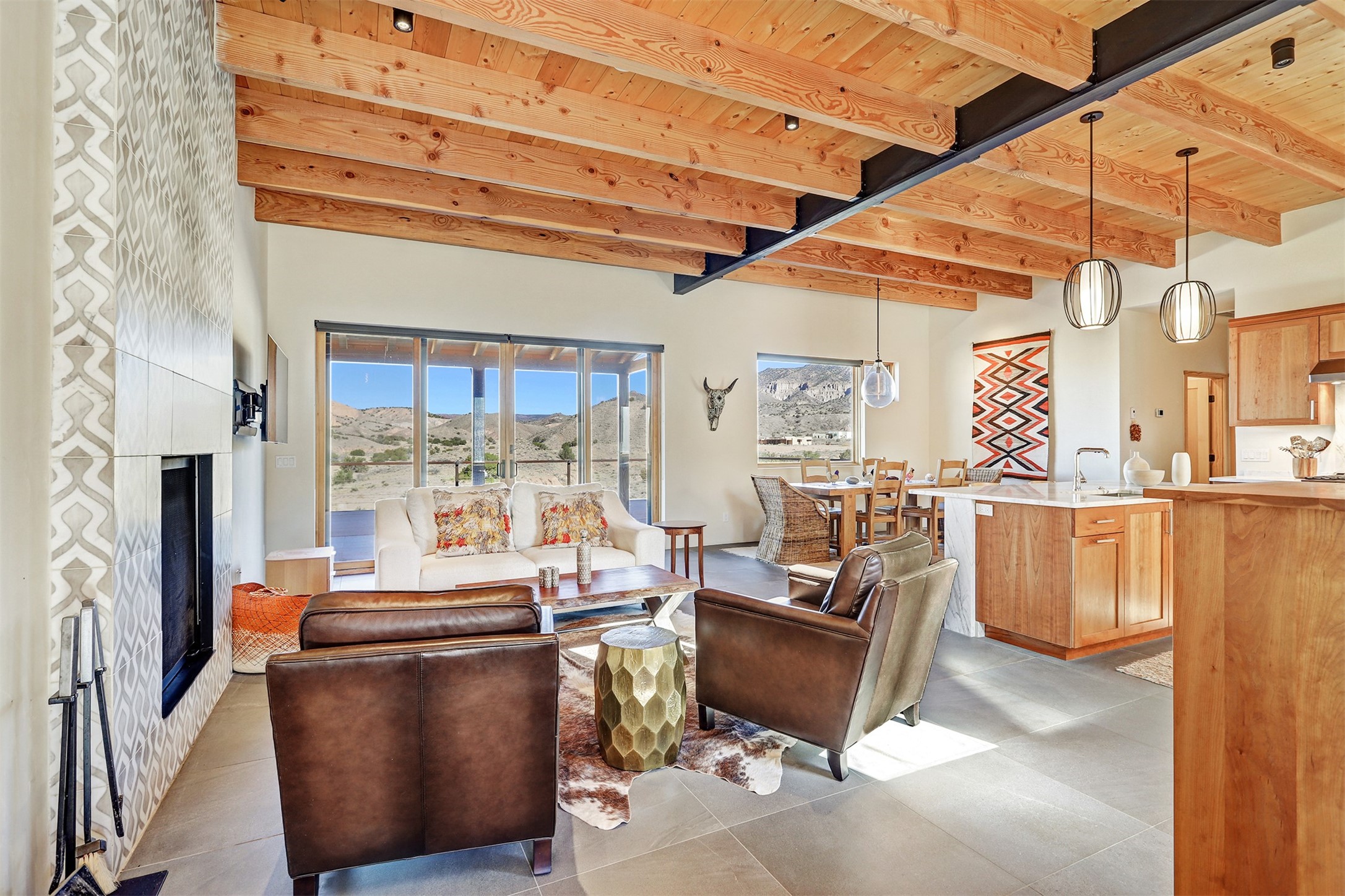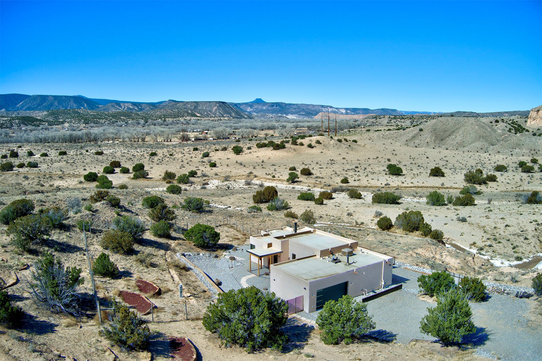 Rare new construction on nearly 8 acres with endless views and luxury finishes in a private Abiquiu community. This 1,620 sq. ft. home offers two bedrooms, two bathrooms and separate office, as well as chef's kitchen and generous great room. The Great Room is accented by a marble tiled high-efficiency wood burning fireplace. Luxury finishes and features throughout include marble kitchen counters, custom tile, designer lighting/flooring, high-end appliances. Architectural landscape design is sophisticated with near-zero maintenance. A 700 sq. ft. elevated deck provides ample entertainment space and unimpeded sunset, mountain, and valley views --including Pedernal!The property's location in gated la Canada de Abiquiu offers convenient distances to Santa Fe (45 min.), Ghost Ranch (20 min.),Bodes/Abiquiu Inn (7 min.), as well as gate security and a well-maintained community. High quality construction includes high efficiency wall/ceiling insulation, Low-E windows, high efficiency water heater, in-floor radiant heat, high efficiency evaporative cooler, a full-house reverse osmosis water system and full-size insulated two car garage.Adjacent 7.3 acre lot with electric transformer and water is available under separate contract. The additional lot would provide an additional building opportunity or privacy and unobstructed mountain views.
