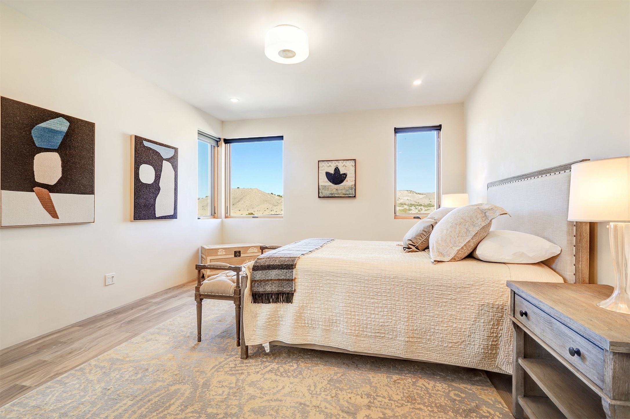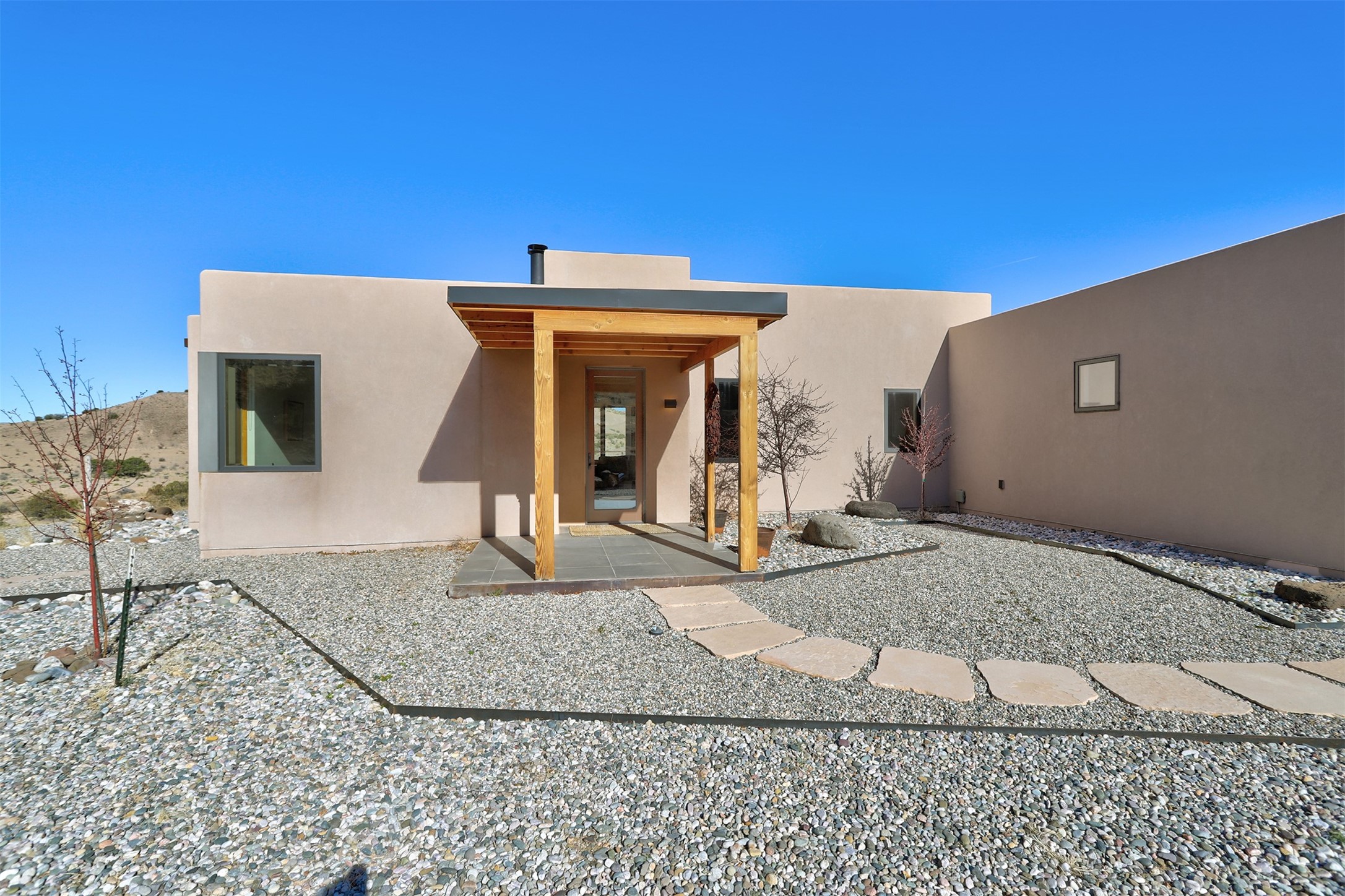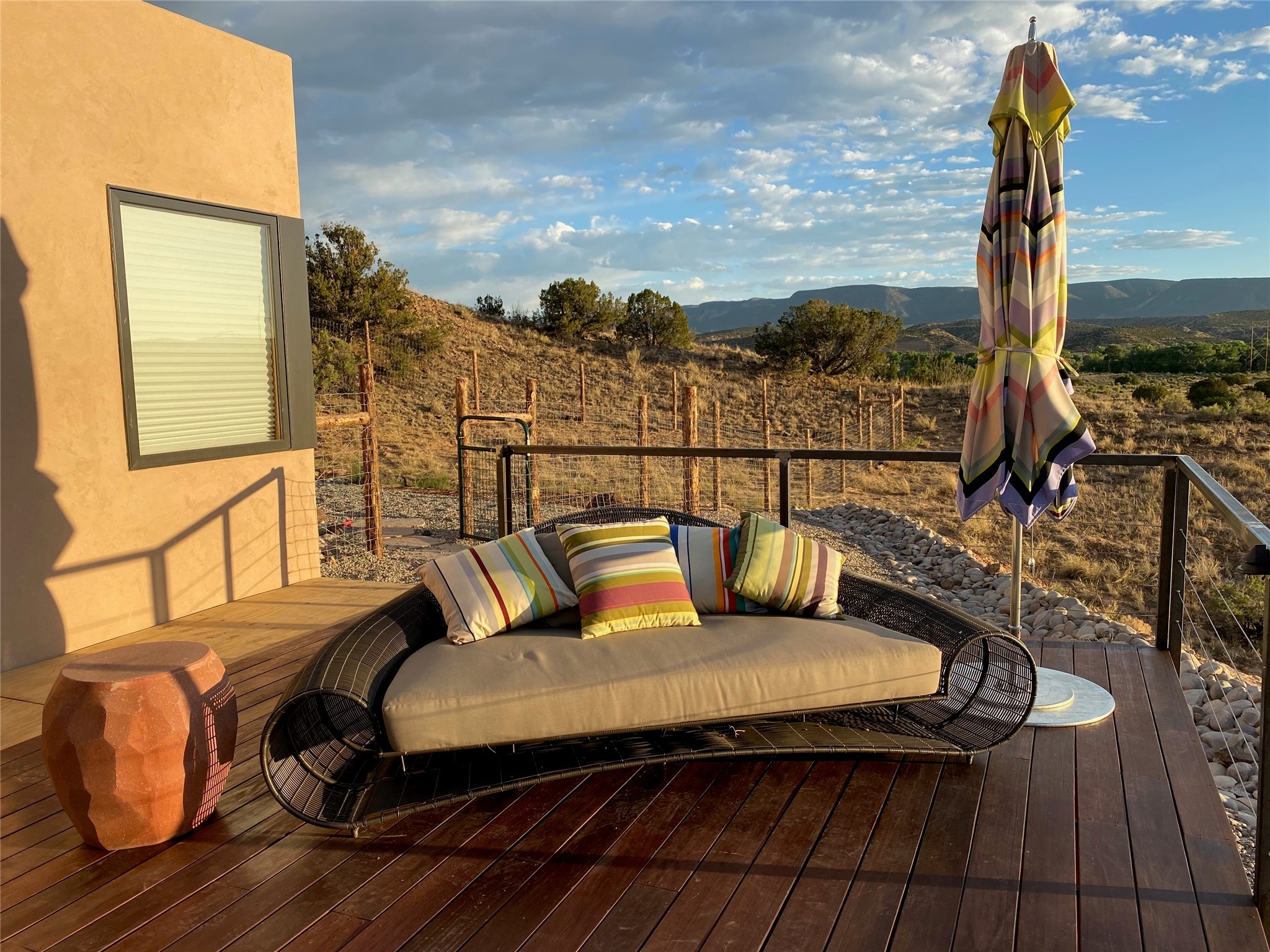 Rare new construction on nearly 8 acres with endless views and luxury finishes in a private Abiquiu community. This 1,620 sq. ft. home offers two bedrooms, two bathrooms and separate office, as well as chef's kitchen and generous great room. The Great Room is accented by a marble tiled high-efficiency wood burning fireplace. Luxury finishes and features throughout include marble kitchen counters, custom tile, designer lighting/flooring, high-end appliances. Architectural landscape design is sophisticated with near-zero maintenance. A 700 sq. ft. elevated deck provides ample entertainment space and unimpeded sunset, mountain, and valley views --including Pedernal!The property's location in gated la Canada de Abiquiu offers convenient distances to Santa Fe (45 min.), Ghost Ranch (20 min.),Bodes/Abiquiu Inn (7 min.), as well as gate security and a well-maintained community. High quality construction includes high efficiency wall/ceiling insulation, Low-E windows, high efficiency water heater, in-floor radiant heat, high efficiency evaporative cooler, a full-house reverse osmosis water system and full-size insulated two car garage.Adjacent 7.3 acre lot with electric transformer and water is available under separate contract. The additional lot would provide an additional building opportunity or privacy and unobstructed mountain views.