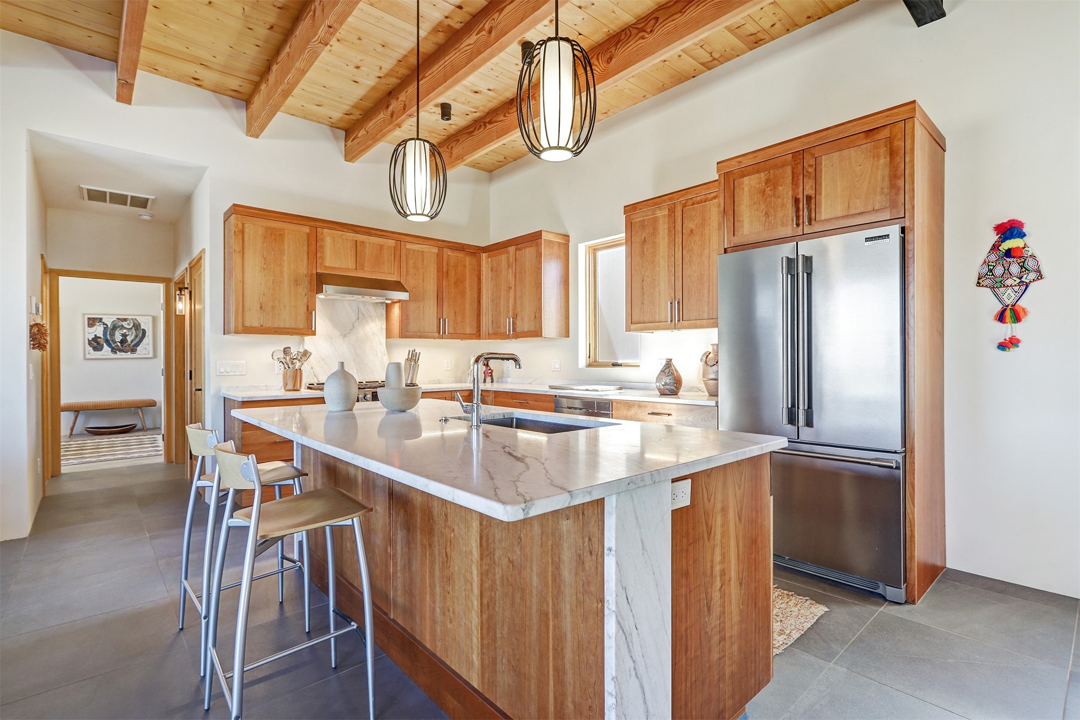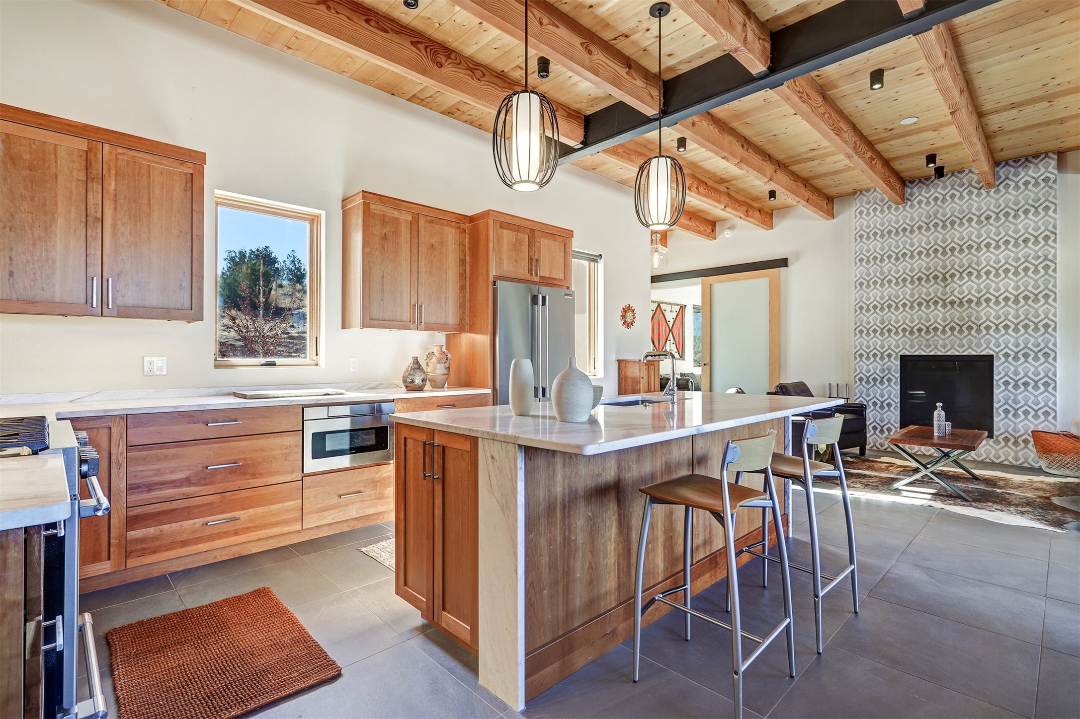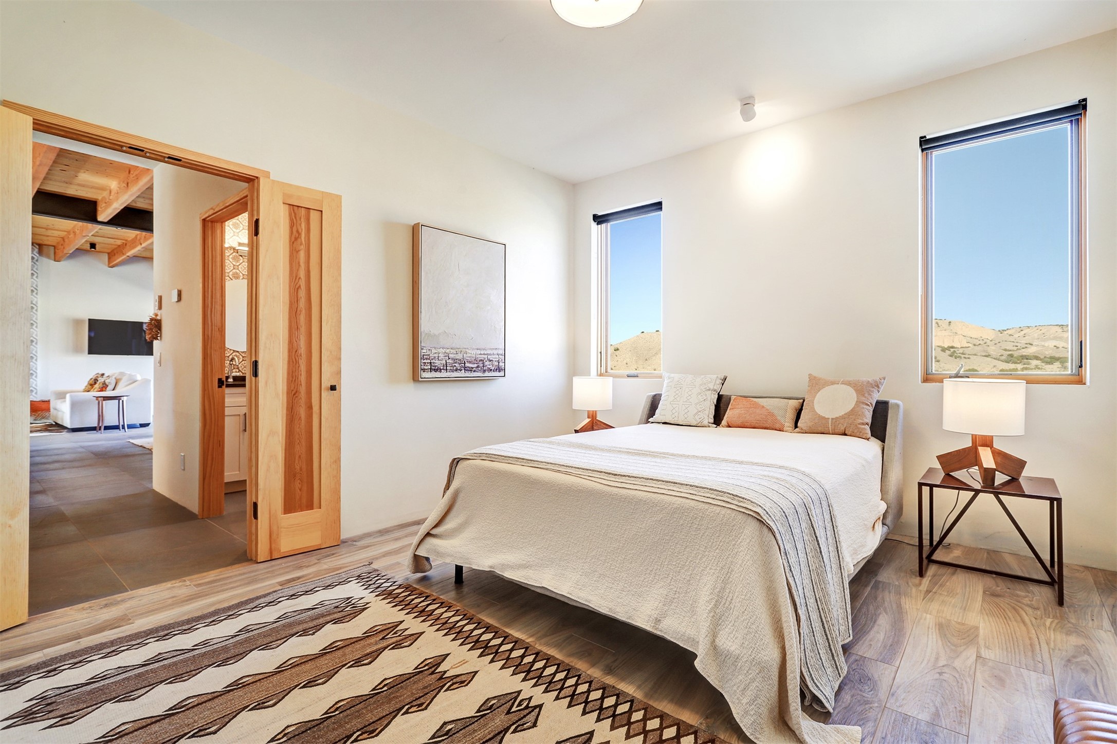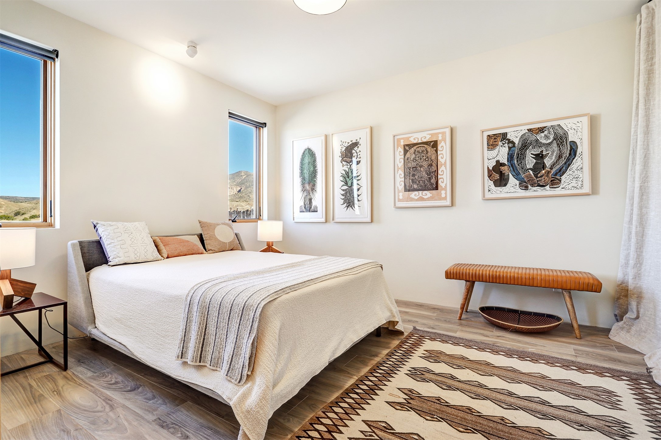 Rare new construction on nearly 8 acres with endless views and luxury finishes in a private Abiquiu community. This 1,620 sq. ft. home offers two bedrooms, two bathrooms and separate office, as well as chef's kitchen and generous great room. The Great Room is accented by a marble tiled high-efficiency wood burning fireplace. Luxury finishes and features throughout include marble kitchen counters, custom tile, designer lighting/flooring, high-end appliances. Architectural landscape design is sophisticated with near-zero maintenance. A 700 sq. ft. elevated deck provides ample entertainment space and unimpeded sunset, mountain, and valley views --including Pedernal!The property's location in gated la Canada de Abiquiu offers convenient distances to Santa Fe (45 min.), Ghost Ranch (20 min.),Bodes/Abiquiu Inn (7 min.), as well as gate security and a well-maintained community. High quality construction includes high efficiency wall/ceiling insulation, Low-E windows, high efficiency water heater, in-floor radiant heat, high efficiency evaporative cooler, a full-house reverse osmosis water system and full-size insulated two car garage.Adjacent 7.3 acre lot with electric transformer and water is available under separate contract. The additional lot would provide an additional building opportunity or privacy and unobstructed mountain views.