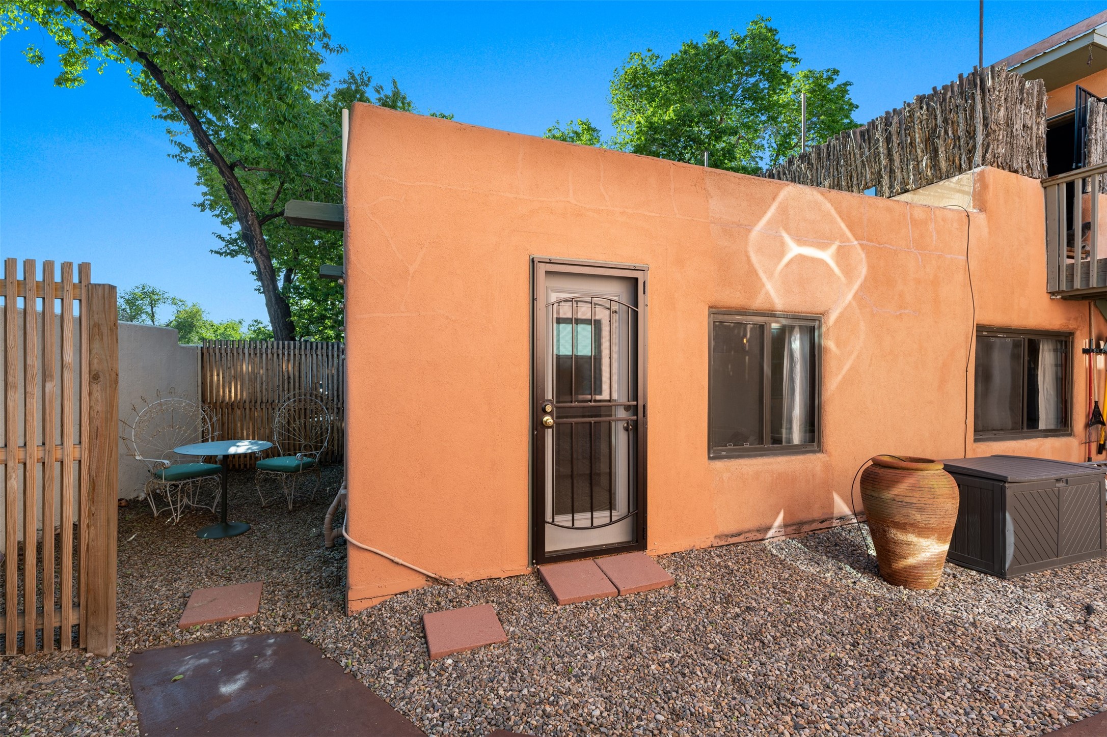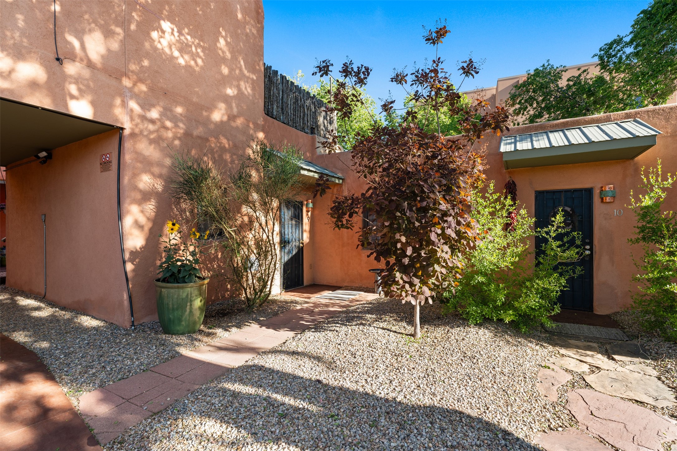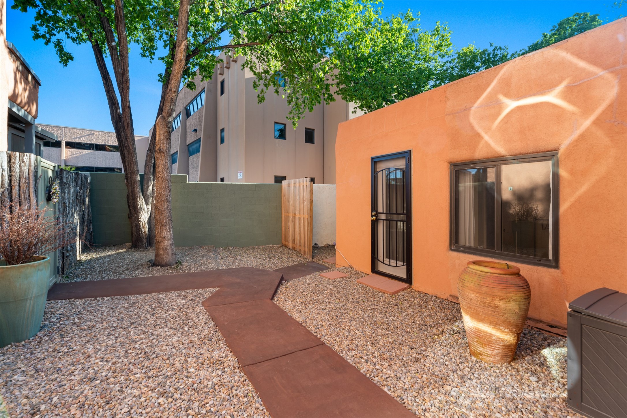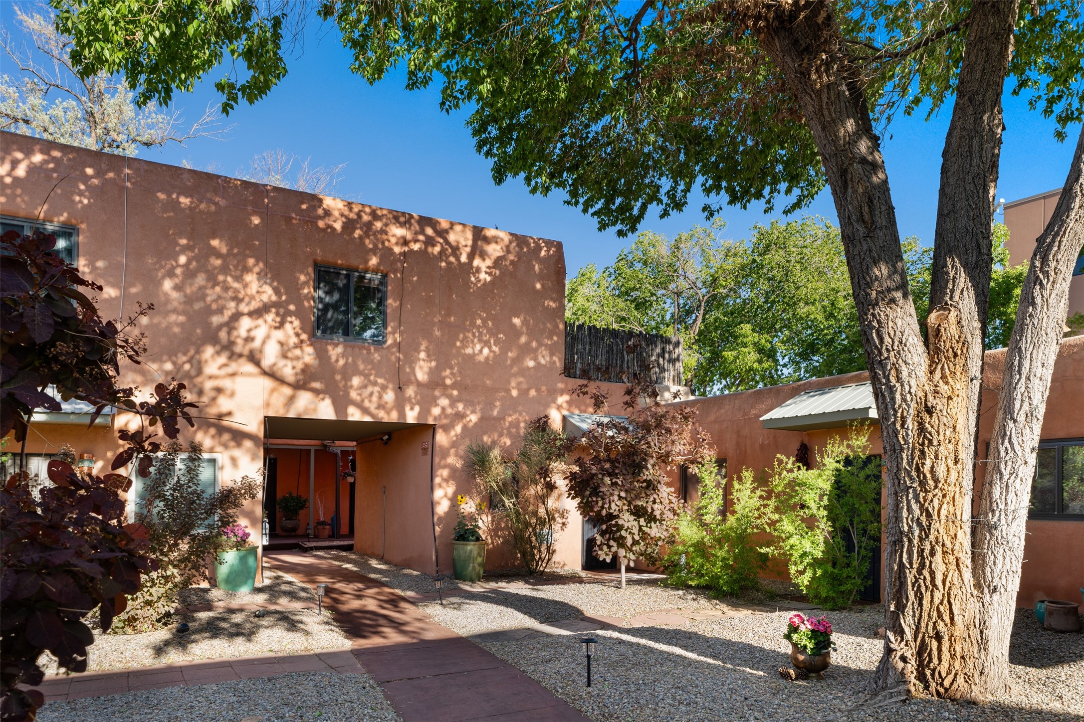 Welcoming, modern style condo in a peaceful garden setting tucked away on a side street in the desirable Santa Fe triangle. This central location has close proximity to the Santa Fe Rail Trail, parks, shopping (including Trader Joe's), and major thoroughfares with easy access to downtown. Enjoy the best of all worlds amidst stunning Santa Fe scenery - convenient living and urban sophistication.Enter through a landscaped courtyard into an open concept living and dining area with a cozy kitchen. The bright bedroom features sleek barn doors, built-in shelving, a laundry area and separate entry. Savor your morning coffee and dinners al fresco in your own back courtyard that can be gated for privacy. This move-in ready condo is a fantastic opportunity for those seeking a vibrant lifestyle near everything Santa Fe has to offer. Schedule a showing today!