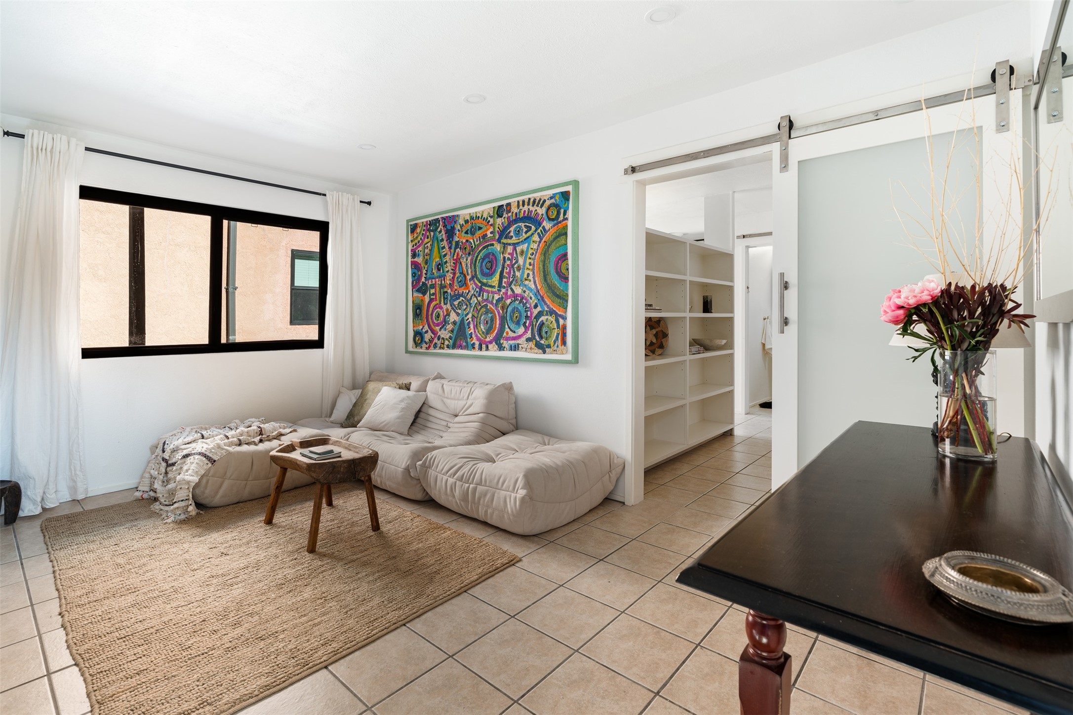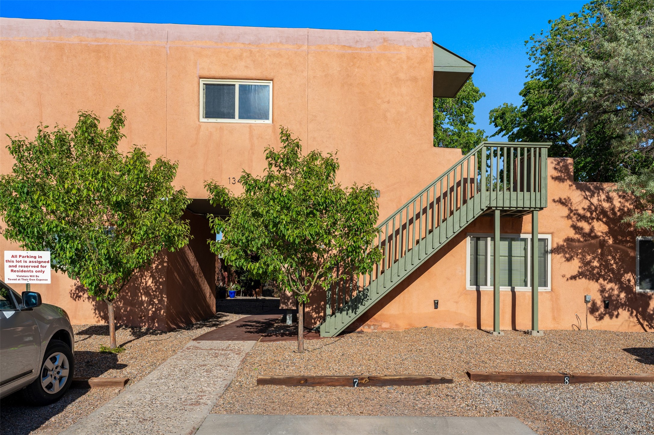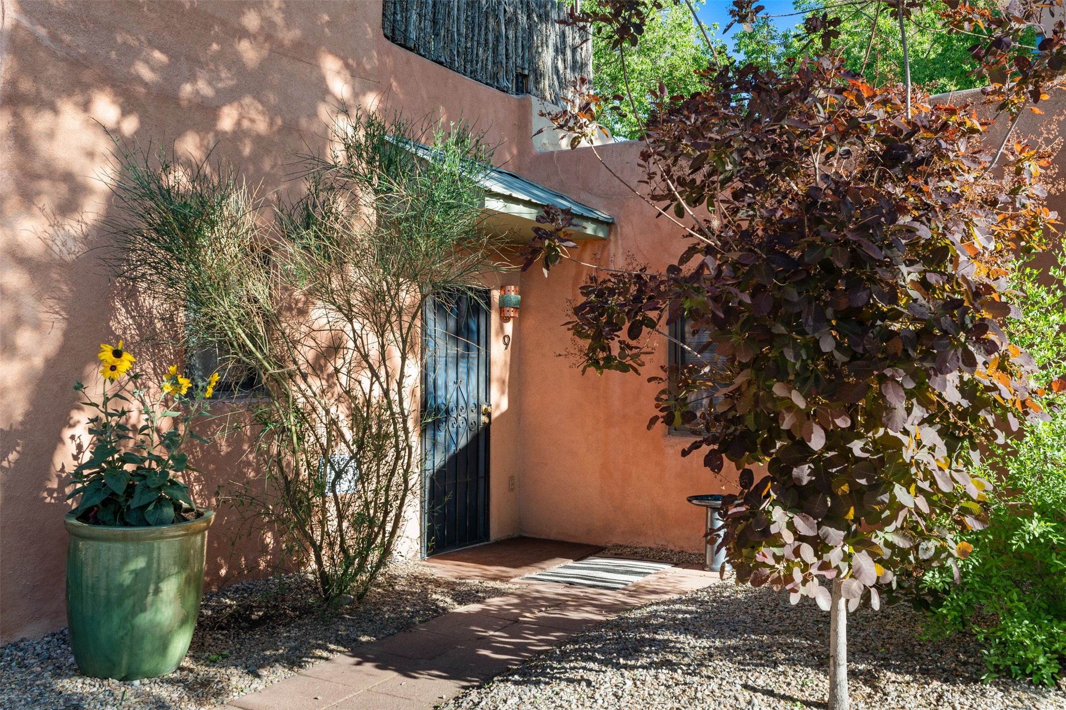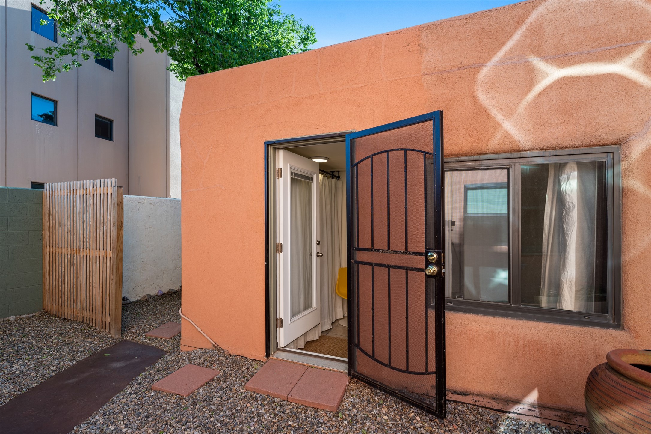 Welcoming, modern style condo in a peaceful garden setting tucked away on a side street in the desirable Santa Fe triangle. This central location has close proximity to the Santa Fe Rail Trail, parks, shopping (including Trader Joe's), and major thoroughfares with easy access to downtown. Enjoy the best of all worlds amidst stunning Santa Fe scenery - convenient living and urban sophistication.Enter through a landscaped courtyard into an open concept living and dining area with a cozy kitchen. The bright bedroom features sleek barn doors, built-in shelving, a laundry area and separate entry. Savor your morning coffee and dinners al fresco in your own back courtyard that can be gated for privacy. This move-in ready condo is a fantastic opportunity for those seeking a vibrant lifestyle near everything Santa Fe has to offer. Schedule a showing today!